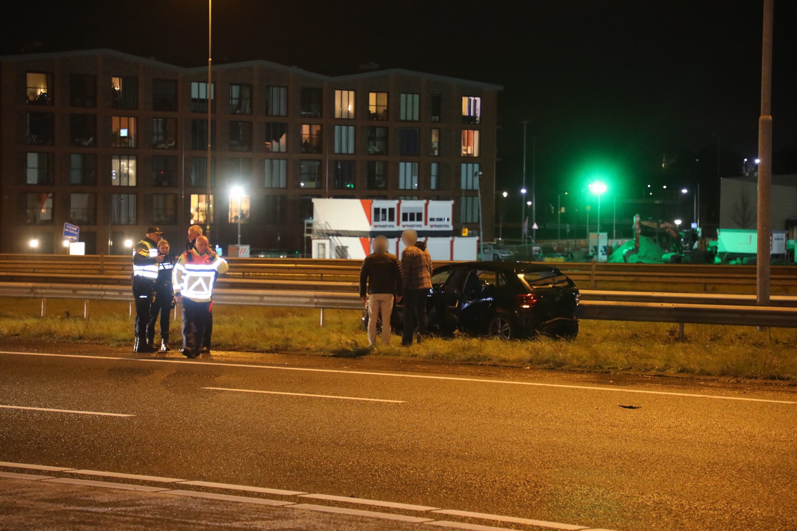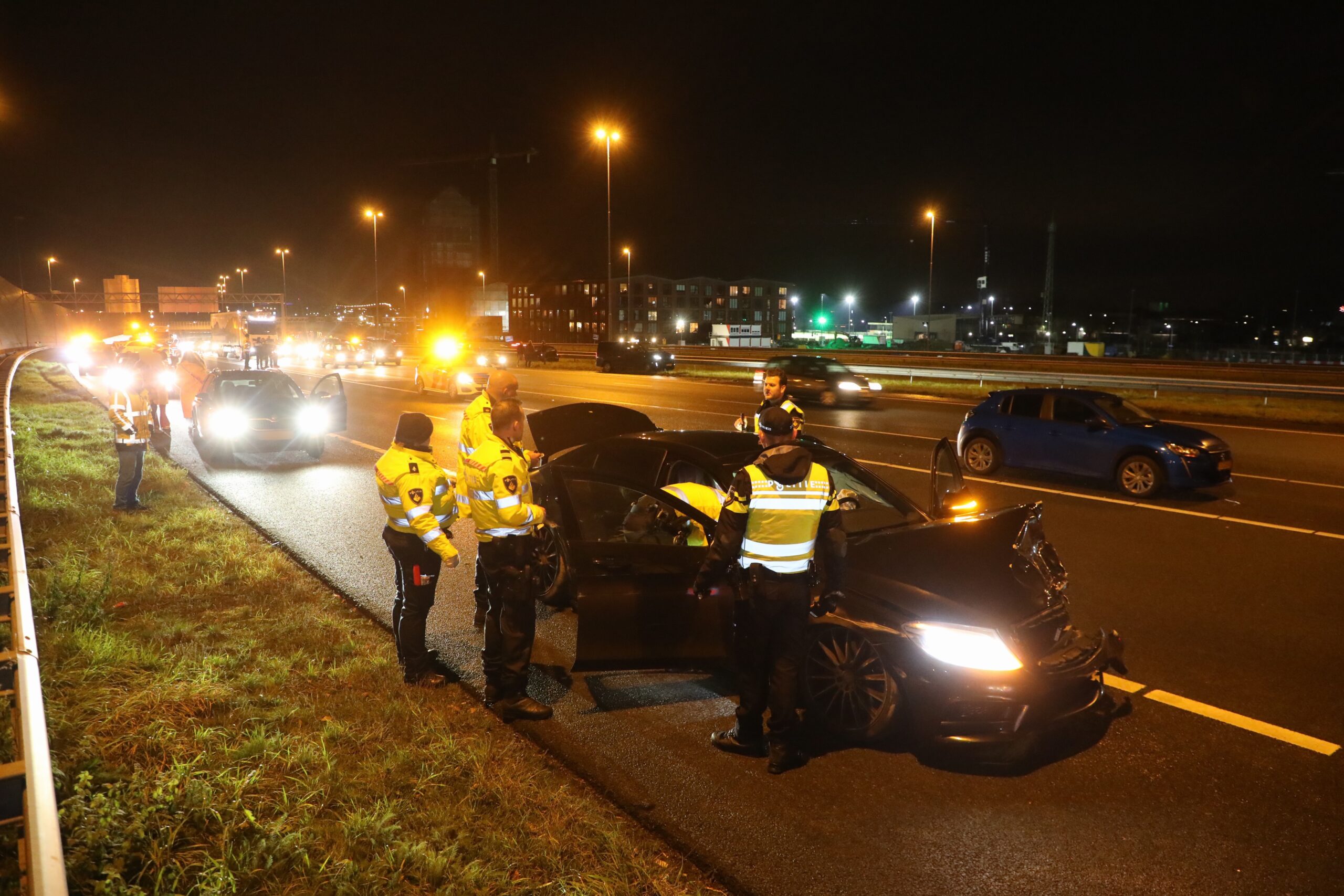 Op de A4 bij Leiden zijn maandagavond twee auto’s op elkaar gebotst. Eén van de voertuigen, een Volkswagen Polo, is tegen de vangrail aan de meest linkerkant van de weg tot stilstand gekomen. De andere auto, een Mercedes met Belgisch kenteken, eindigde aan de andere kant van de weg op de vluchtstrook.