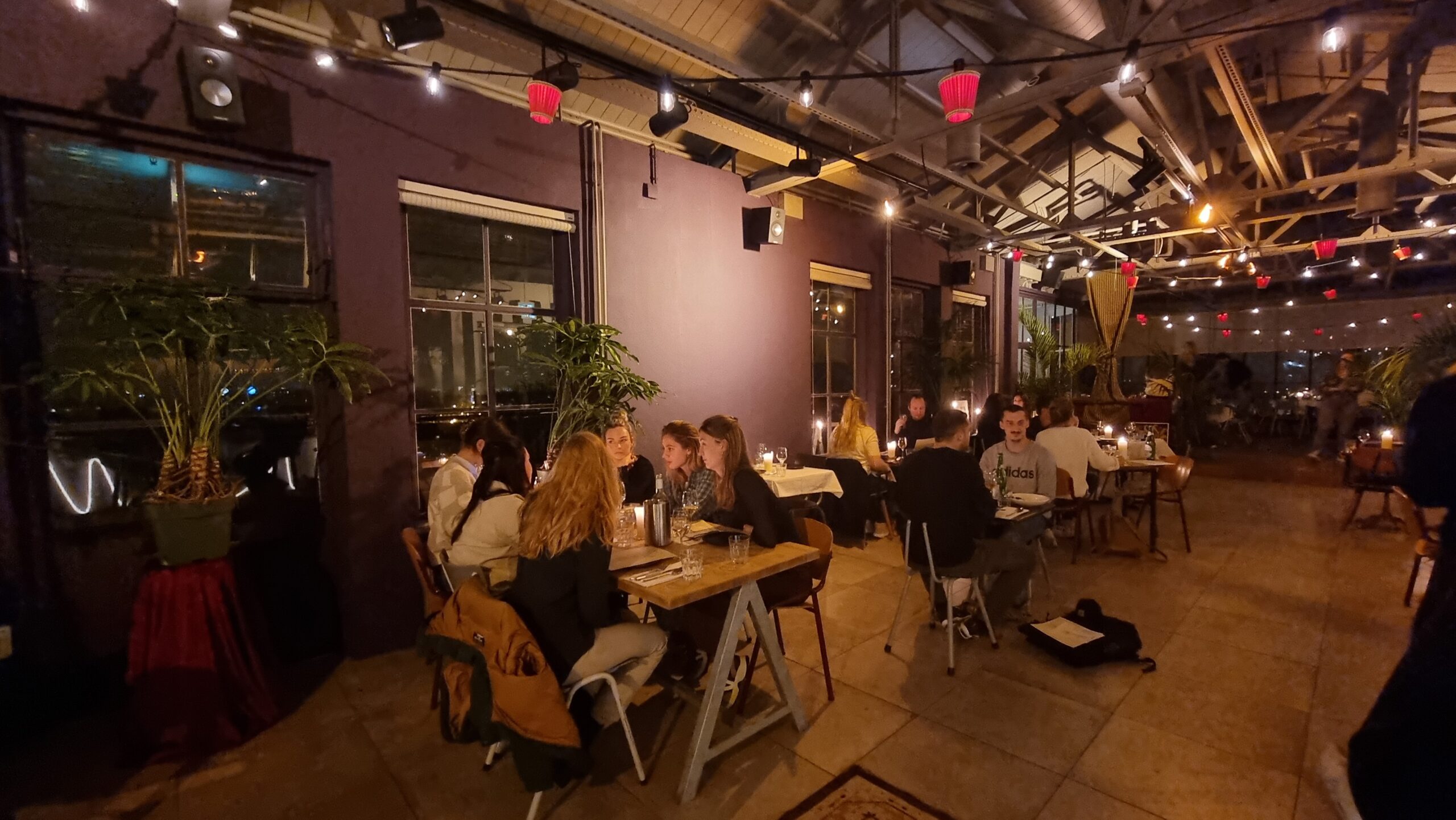 De ingang is inderdaad niet zomaar gevonden. Die zit verstopt achter een vrij anonieme deur in de Maarsmansteeg. Alleen enkele posters verraden de toegang tot het trappenhuis dat naar het restaurant leidt. Briefjes met follow the red stairs op elke tussenetage maken duidelijk dat de bezoeker nog niet op de goede verdieping is. “Maar als je dan boven bent, wordt je ook wel echt beloond”, zegt Van Wijnen terwijl hij een korte rondleiding door het restaurant geeft. Wie niet in staat is om via de trap boven te komen, moet even van tevoren bellen om naar de lift gebracht te worden.