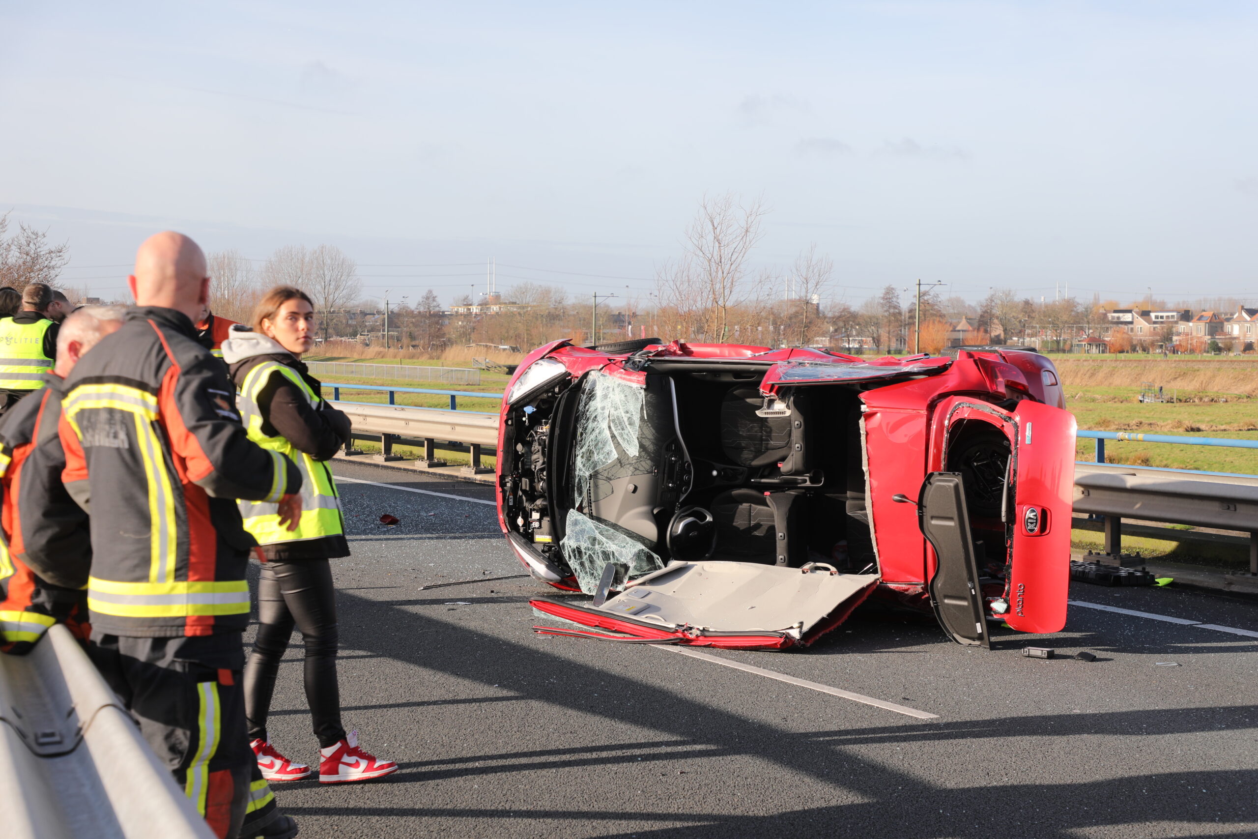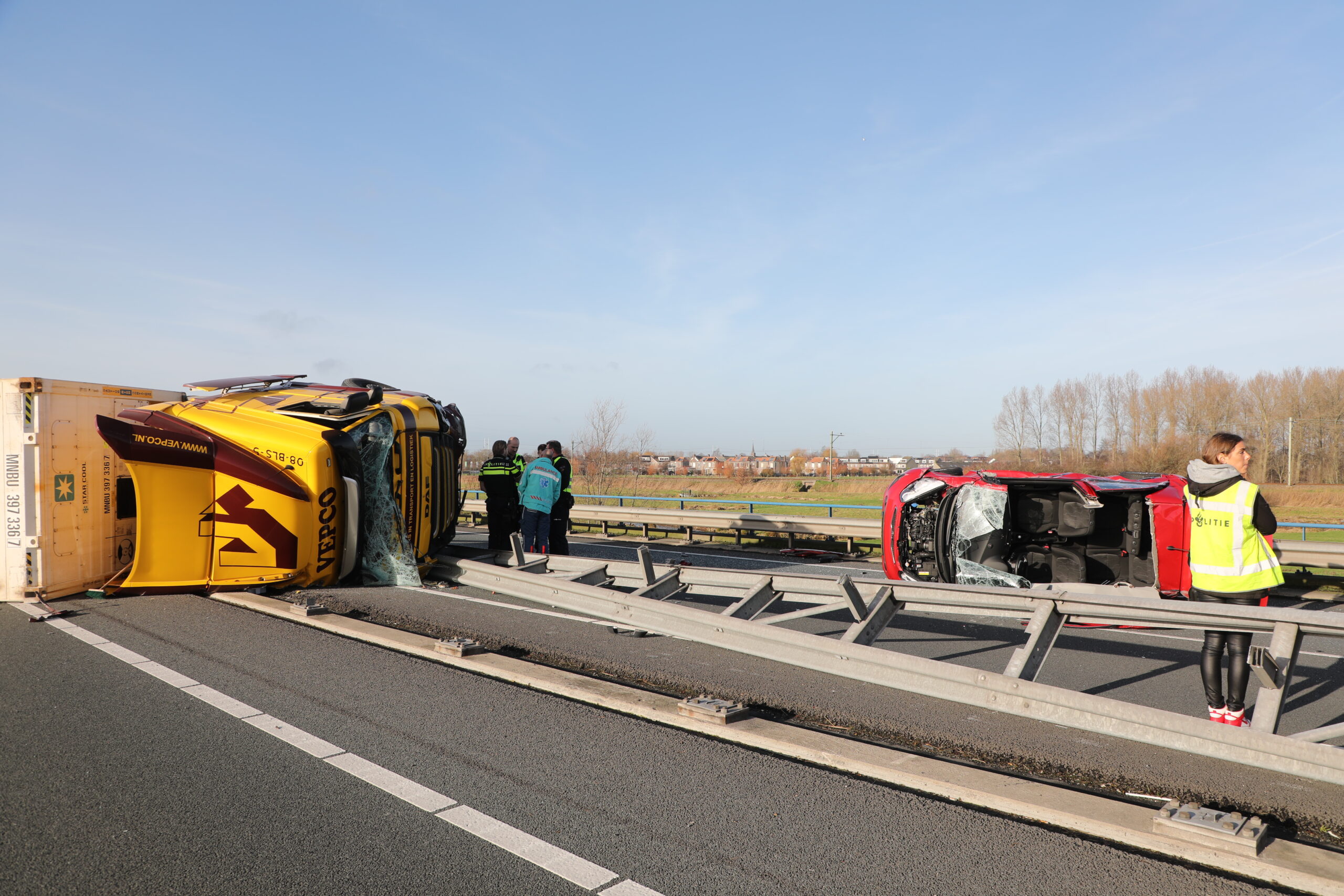 Beide voertuigen liggen op hun kant en blokkeren de N11 in beide richtingen. De bestuurder van de personenauto raakte door het ongeval bekneld en is door de brandweer uit de auto gehaald.