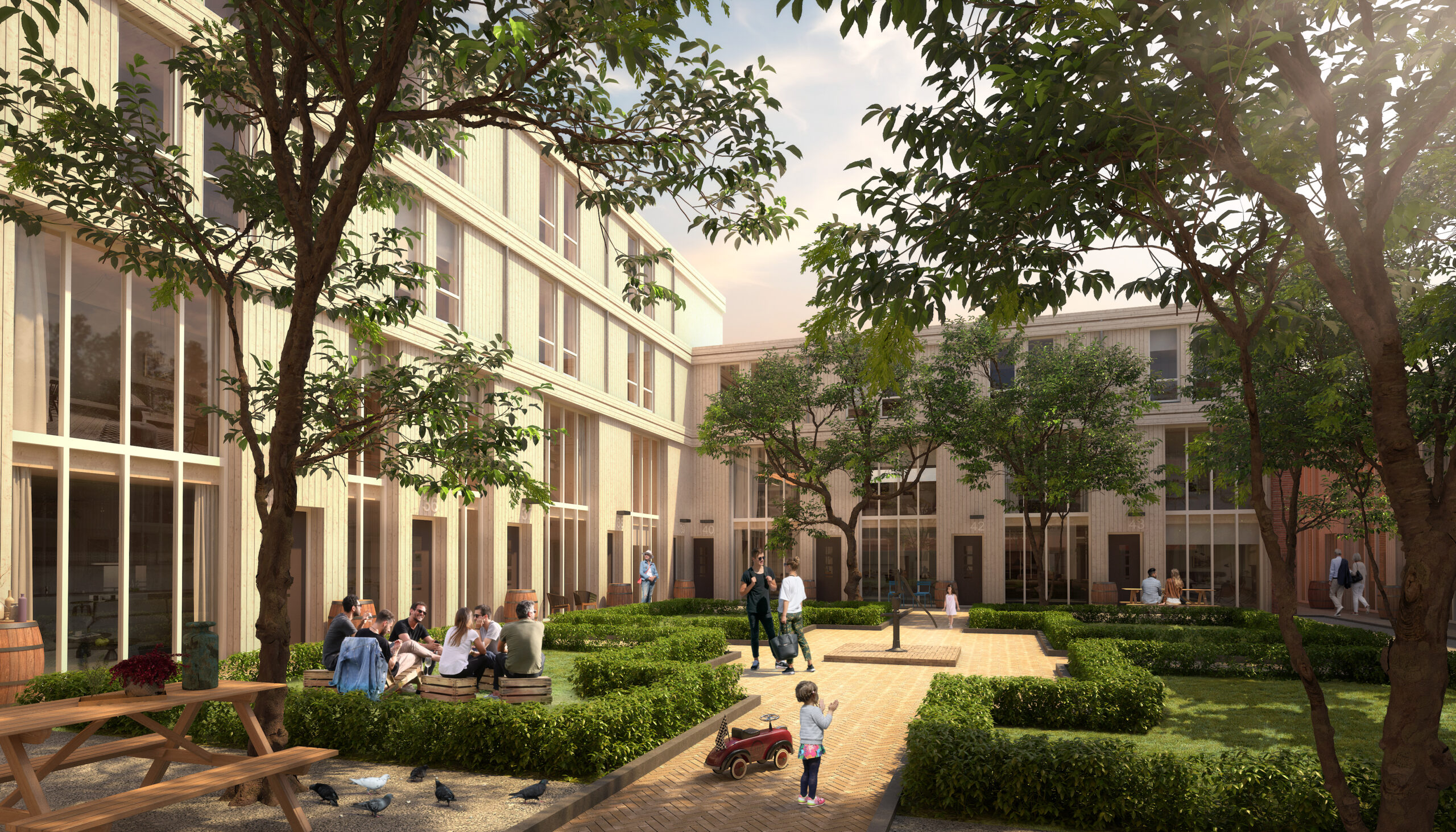 Achter het benzinestation van Shell aan de Hoge Rijndijk staat nu nog een enorm bouwwerk waar in het verleden auto’s stonden van respectievelijk garagebedrijven en een autoverhuurder. De auto’s zijn weg en hetzelfde geldt binnenkort voor de bedrijfsloods. Die maakt plaats voor 38 woningen rond twee nieuwe hofjes. De groene binnentuinen worden met een voetpad ontsloten aan de P.J. Blokstraat, zodat ook de buurt er gebruik van kan maken. In elk geval overdag.