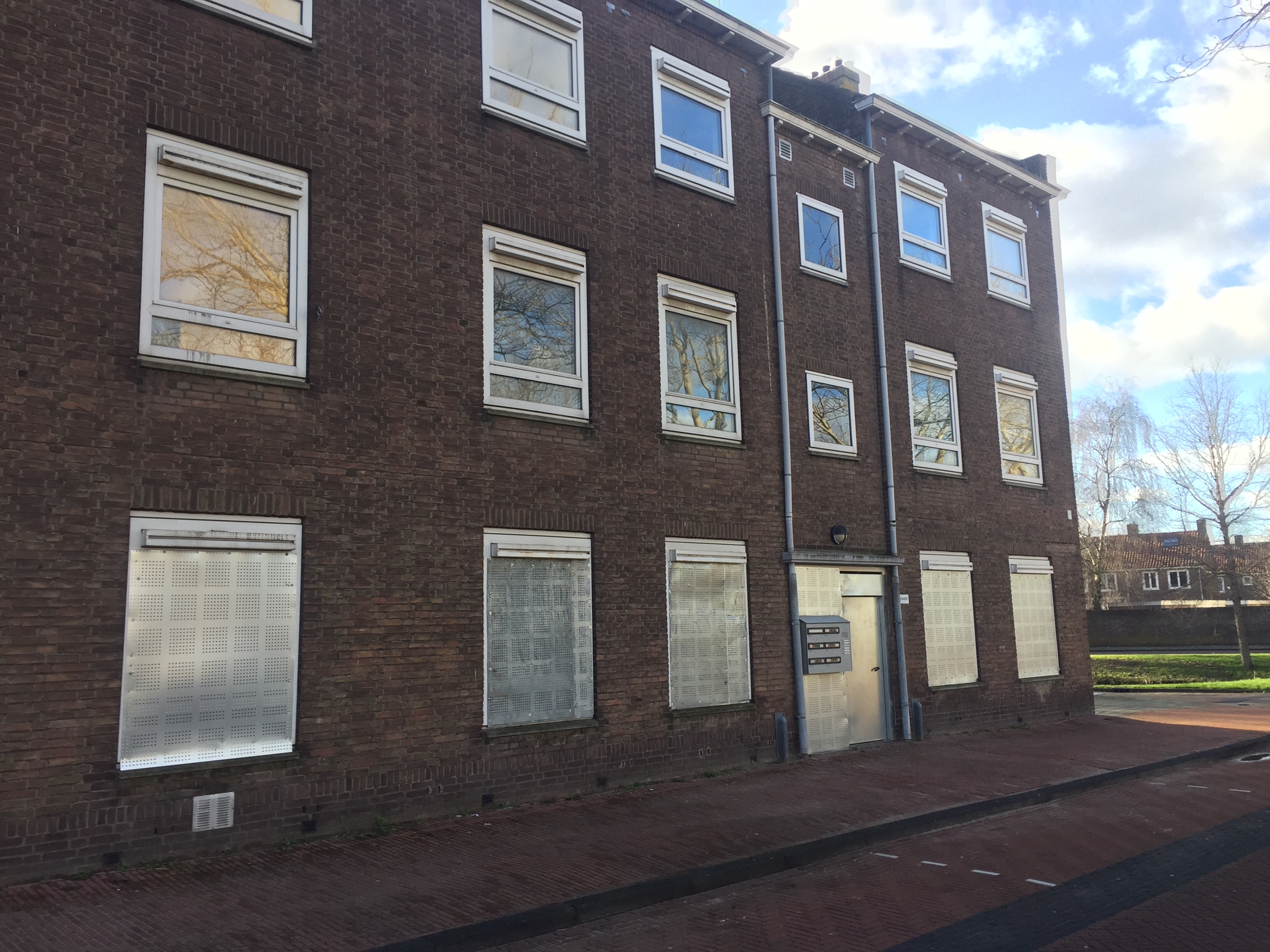 De sloop van de dichtgetimmerde flats begint waarschijnlijk in maart van dit jaar. De laatste tijdelijke bewoners zijn inmiddels vertrokken. (Foto’s: Louis Smit).