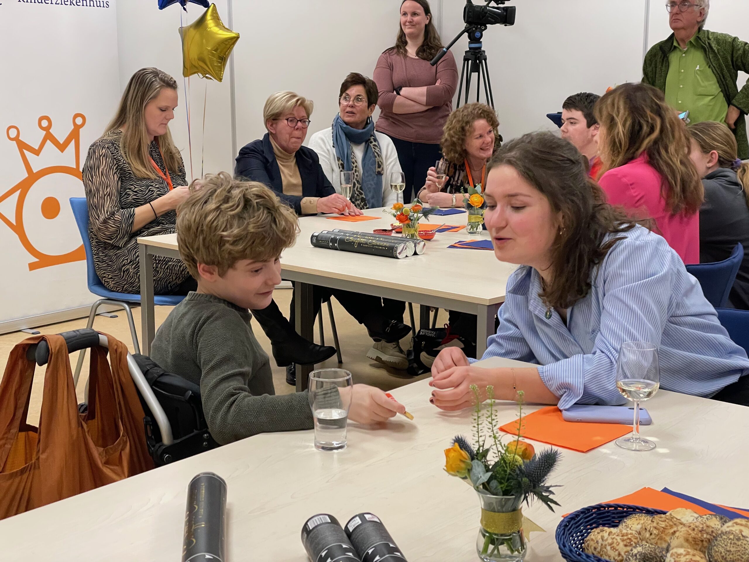 De vijftienjarige Kevin heeft sinds kort een hulphond. “Hij kan dingen voor me oppakken en we zijn hem aan het leren om ook de deuren voor me te openen. Hij heet Bilan en is anderhalf jaar.” Bilan laat zich door de knallende confettikanonnen waarmee het Kinderspiercentrum open wordt verklaard, niet van de wijs brengen. Dat heeft hij al geleerd. Voor Kevin is Bilan naast een hulpje ook een maatje. “Ik moet vroeg op om hem uit te laten en ook ’s avonds. Zo kom ik buiten en dat is ook goed voor mij. Hij gaat overal met me mee naar toe. Naar school en ook hier naar het ziekenhuis. Ik ben nu nooit meer alleen.”