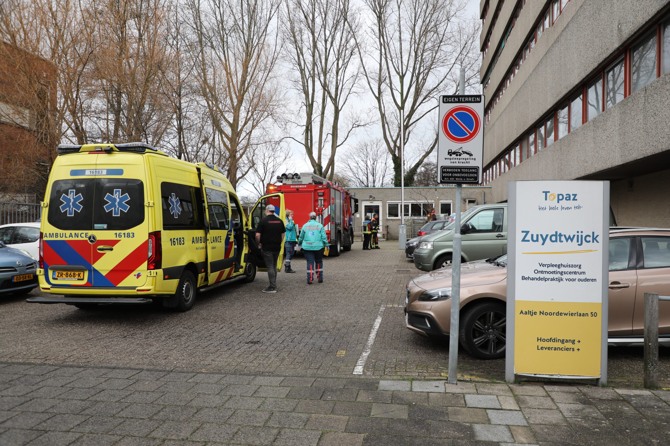 Bij werkzaamheden aan de koelinstallatie in de keuken van verpleeghuis Topaz Zuydtwijck aan de Aaltje Noorderwierlaan is een leiding gesprongen. Daarbij kwam een nog onbekende stof vrij die voor een vreemde lucht zorgde.