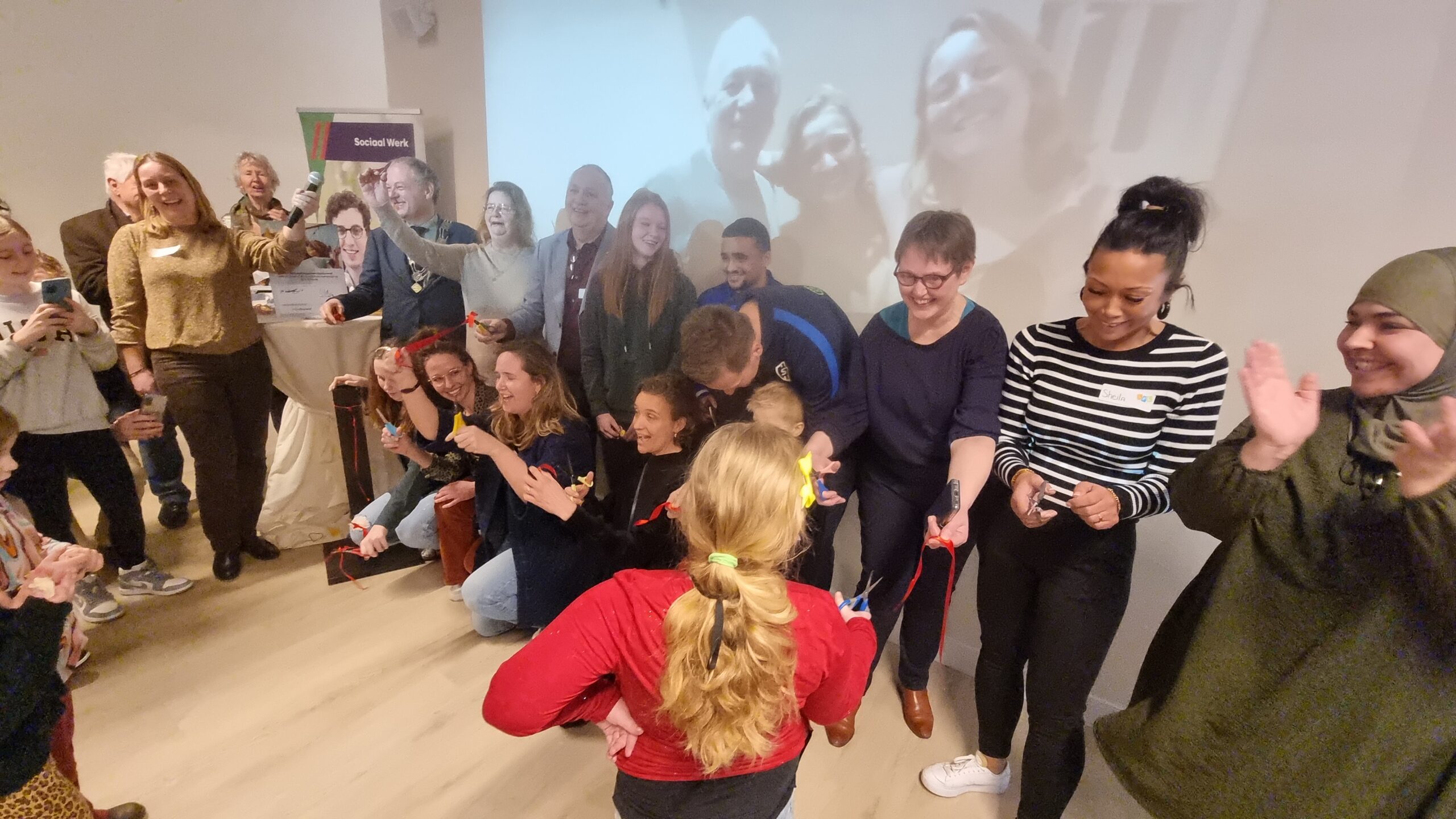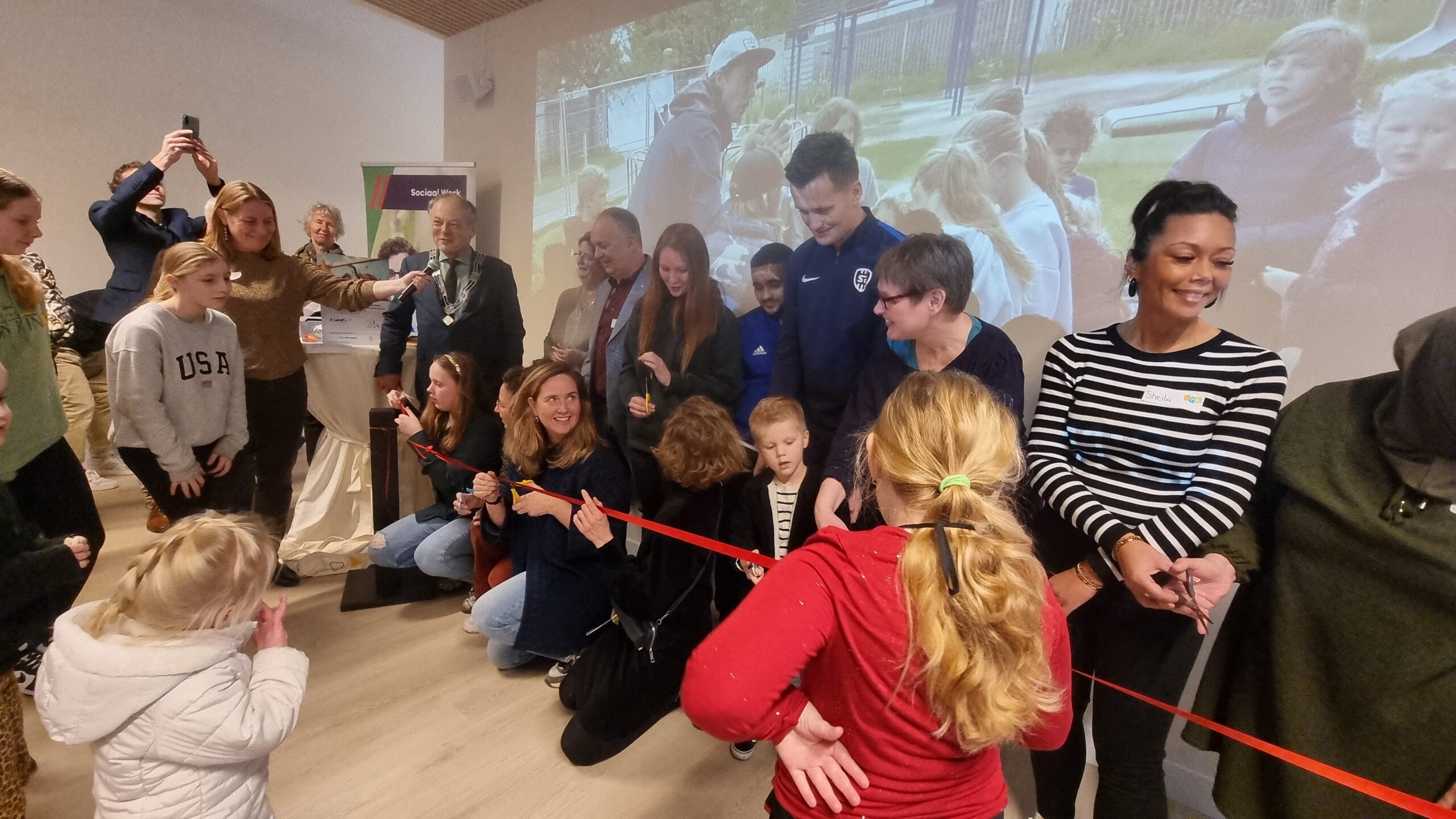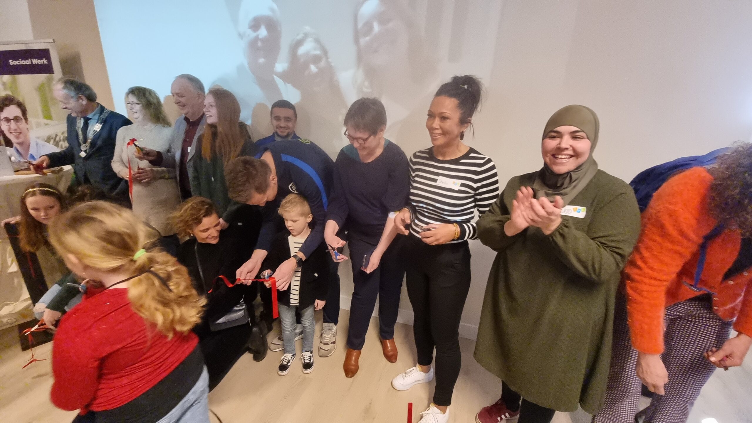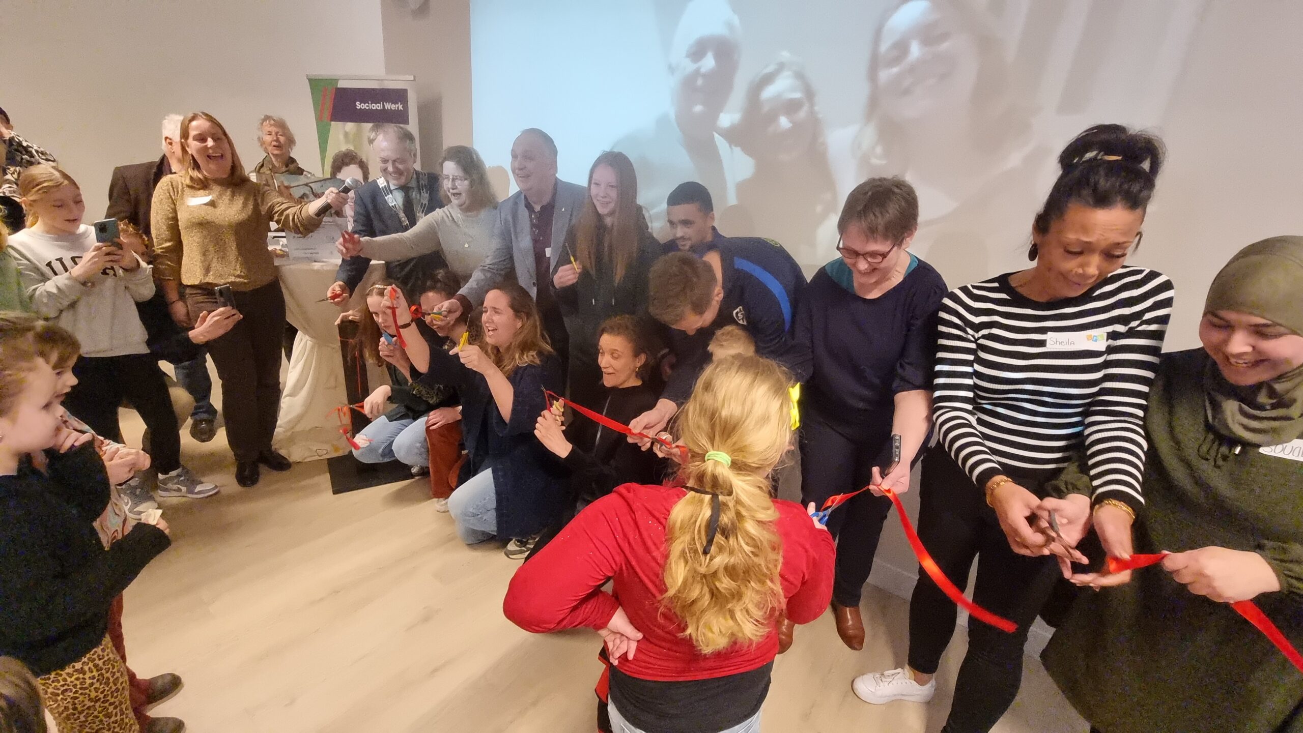 Medewerkers en vrijwilligers van alle betrokken organisaties knipten als openingshandeling gezamenlijk een lang lint door, nadat onder leiding van de burgemeester uitgebreid en steeds sneller was afgeteld… 25, 24, 23…