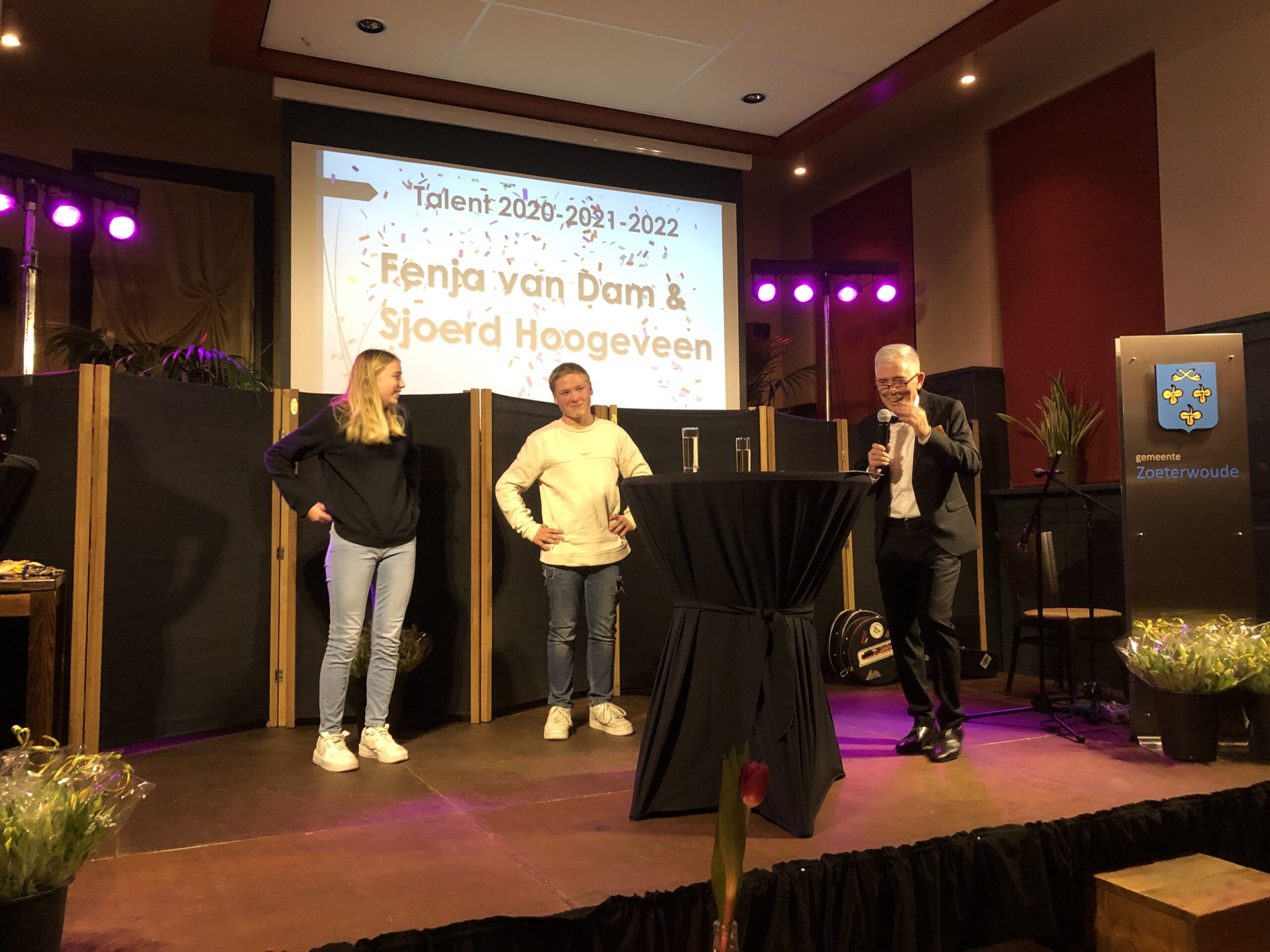 De eerste prijs van de avond is voor het sporttalent van Zoeterwoude. Medepresenator Tom van der Meer heeft direct een verrassing voor de twee genomineerden: voetballer Fenja van Dam en rugbyspeler Sjoerd Hoogeveen winnen gezamenlijk de prijs. De jury, bestaande uit Tessa de Wekker, Louk Sanders en Albert Bosman, kon niet kiezen en besloot dat de veertienjarige sporters allebei een beloning verdienen. Voetbaltalent Van Dam speelt sinds vorig jaar bij het MO16-team van Feyenoord. Hoogeveen is geselecteerd voor de U15-selectie en werd met DIOK tweede van Nederland.