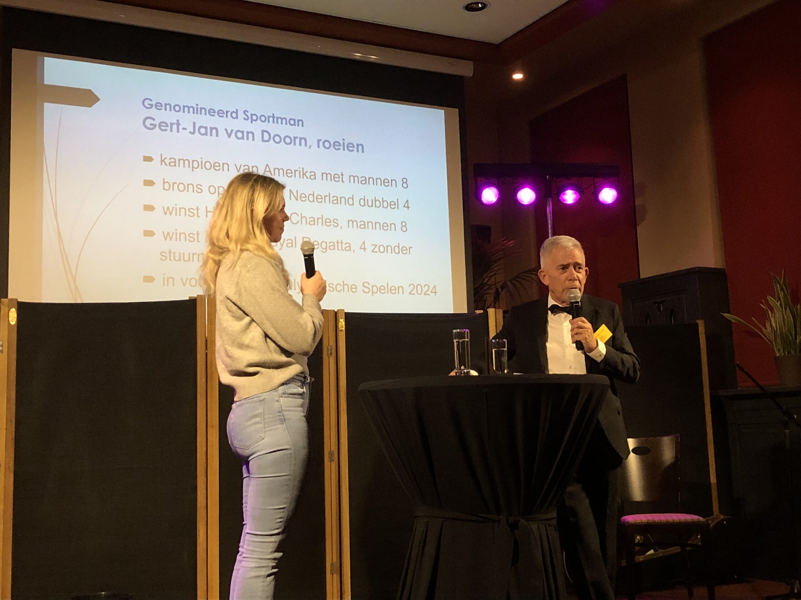 Verslaggevers Linda Mooijman en Robbert Beurse in gesprek met enkele winnaars van de sportverkiezingen.