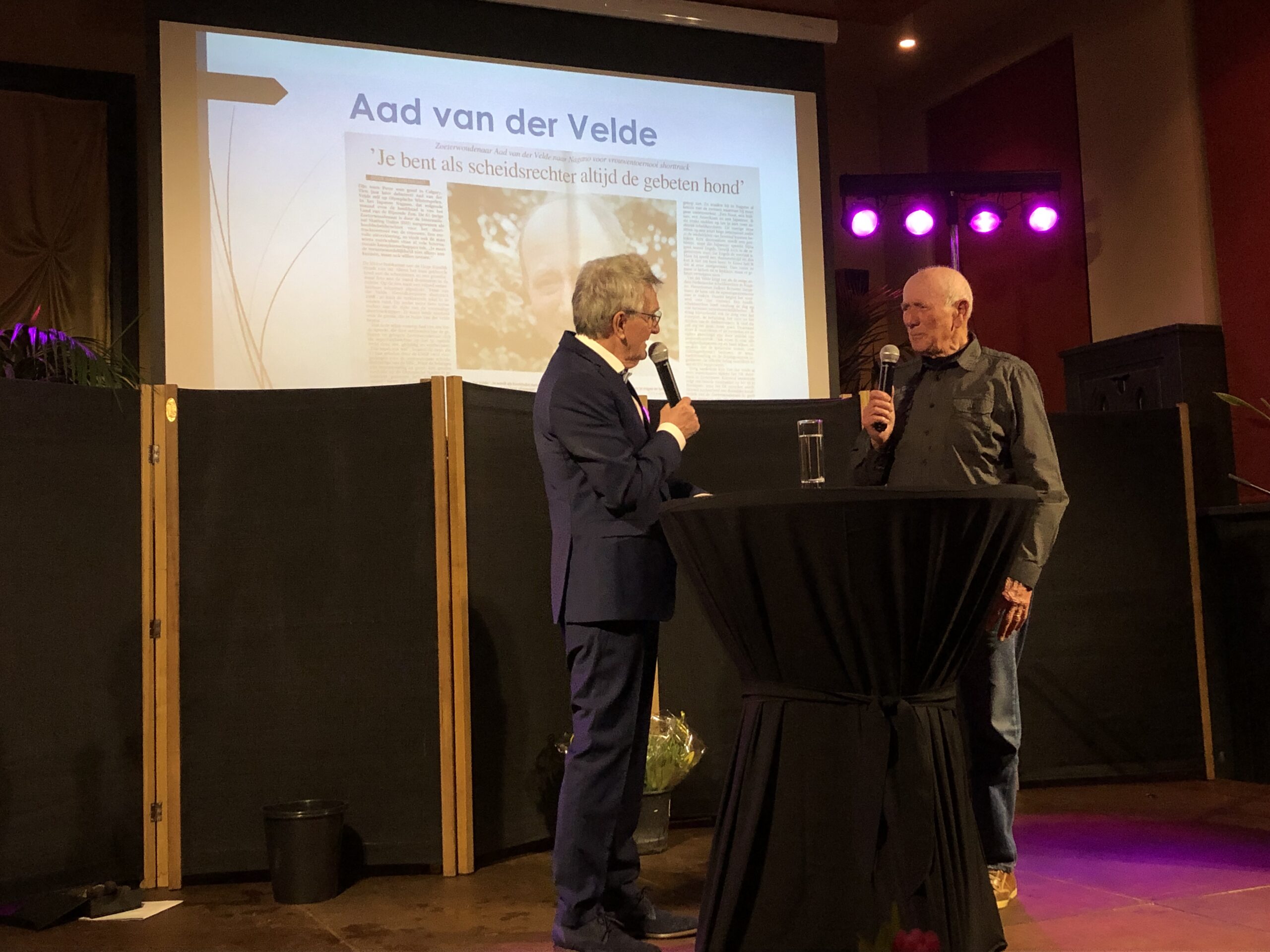 De 86-jarige Aad van der Velde kreeg een bijzondere prijs uitgereikt. “Deze man heeft als hoofdscheidsrechter van de grote internationale schaatswedstrijden veel betekent voor het shorttrack. En is ook nog eens als 60 jaar getrouwd met Ria”, grapt Van der Hoeven bij de uitreiking van de oeuvreprijs. In 1988 beleefde de oud scheidsrechter een bijzonder moment. “Mijn zoon Peter werd in 1988 als eerste Nederlander wereldkampioen shorttrack en won later dat jaar een gouden medaille op de Olympische Spelen”, deelt hij met het aanwezige publiek. Van der Hoeven voegt toe dat zoon Peter tijdens de eerste editie van de sportverkiezingen werd uitgeroepen tot sportman van het jaar. “En toen beloofde de jonge man al dat hij wereldkampioen zou worden.”