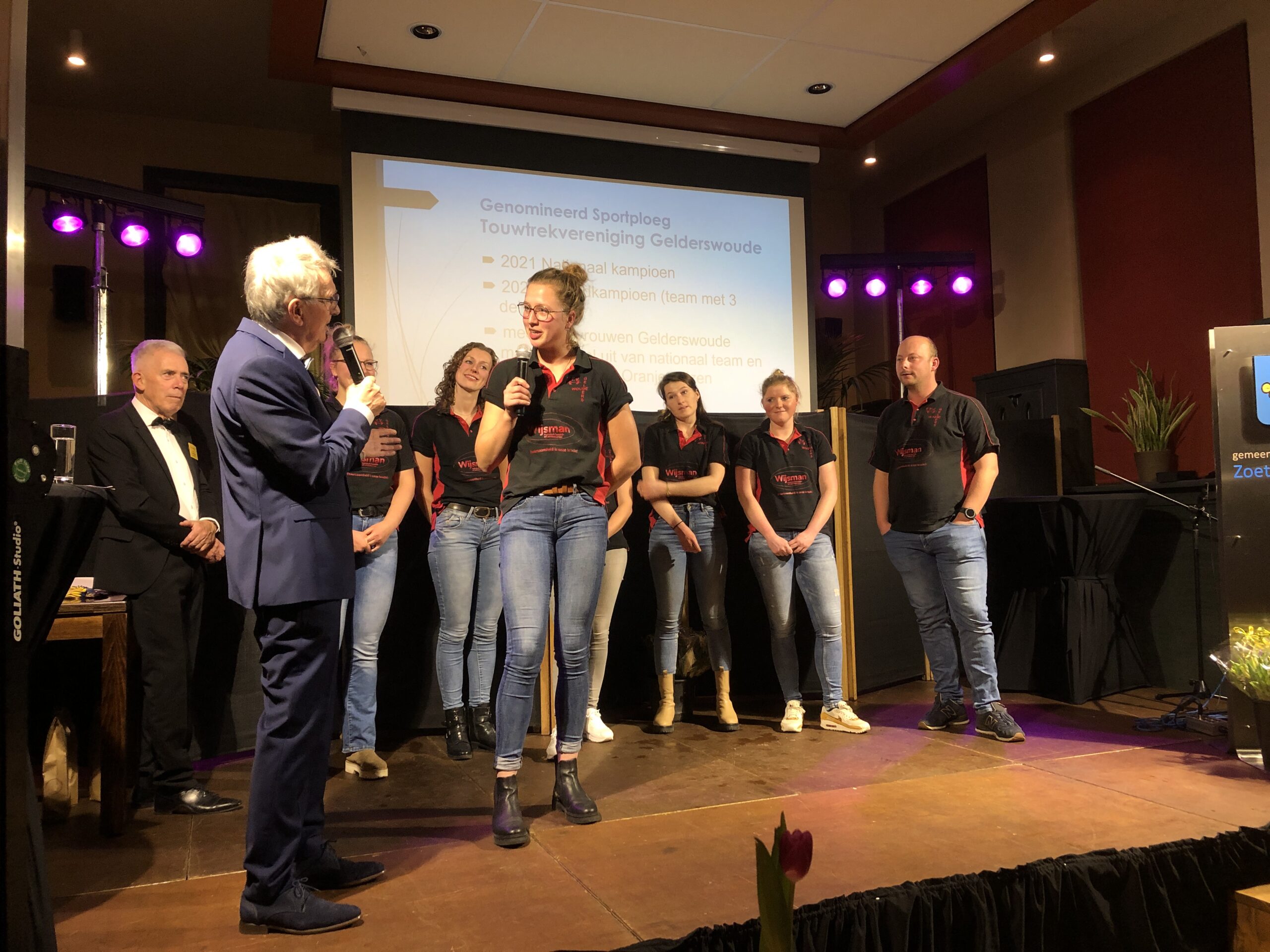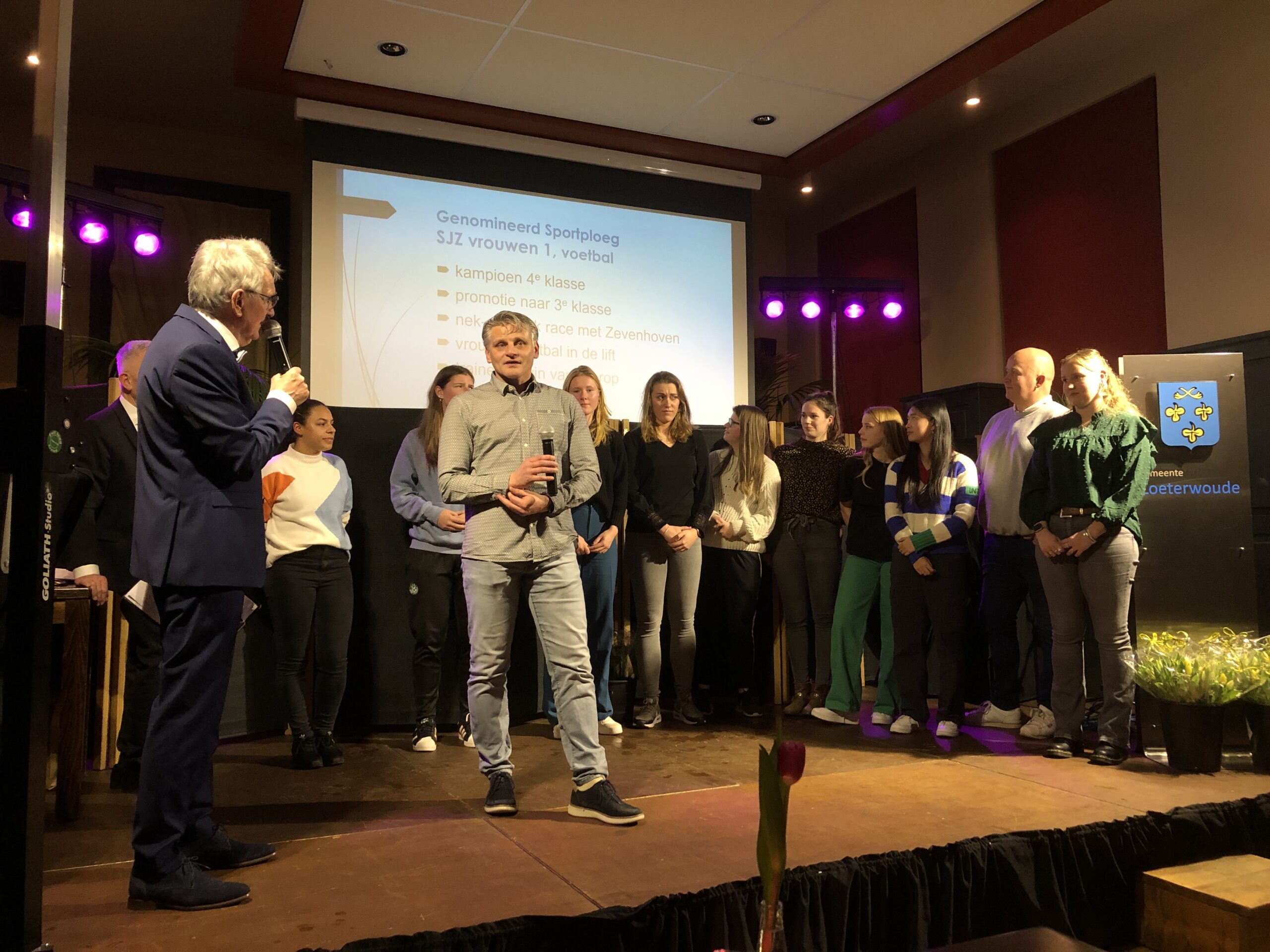 De laatste prijs van de avond was voor de beste sportploeg. Zowel het JO19-1 team als de VR1 van SJZ mochten het podium betreden. Toch waren het de touwtrekkende dames uit Gelderswoude die er met de prijs vandoor gingen. De touwtrekkers uit het 75 inwoners tellende dorp dat bij Zoeterwoude hoort, werden al eerder Nederlands en zelfs wereldkampioen. “En de touwtrekkers willen weer wereldkampioen worden”, vertelt de trotse trainer Fritz Brandstatter.