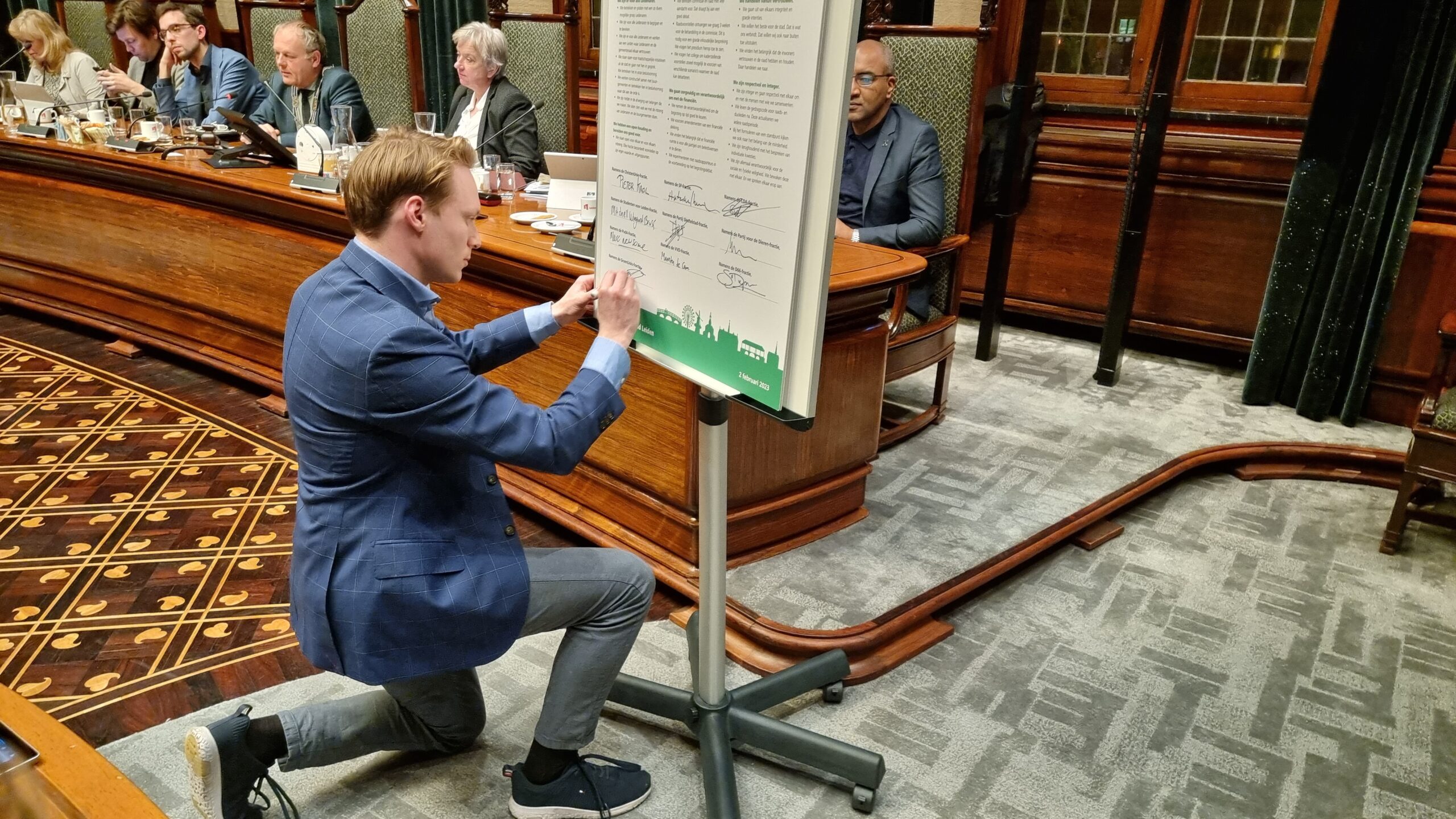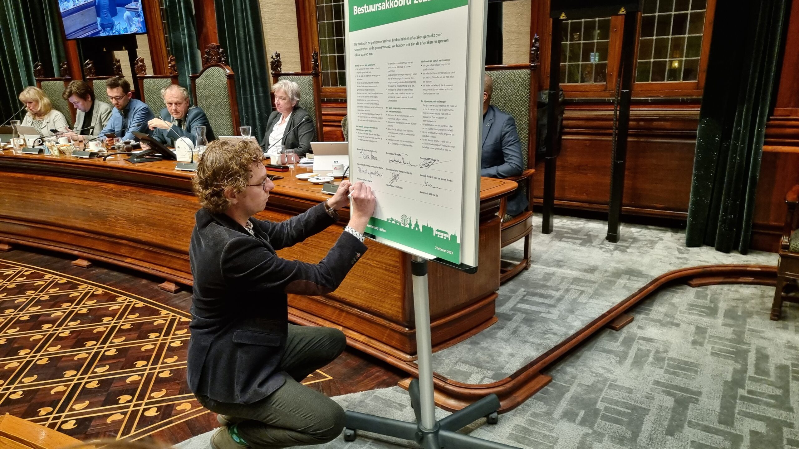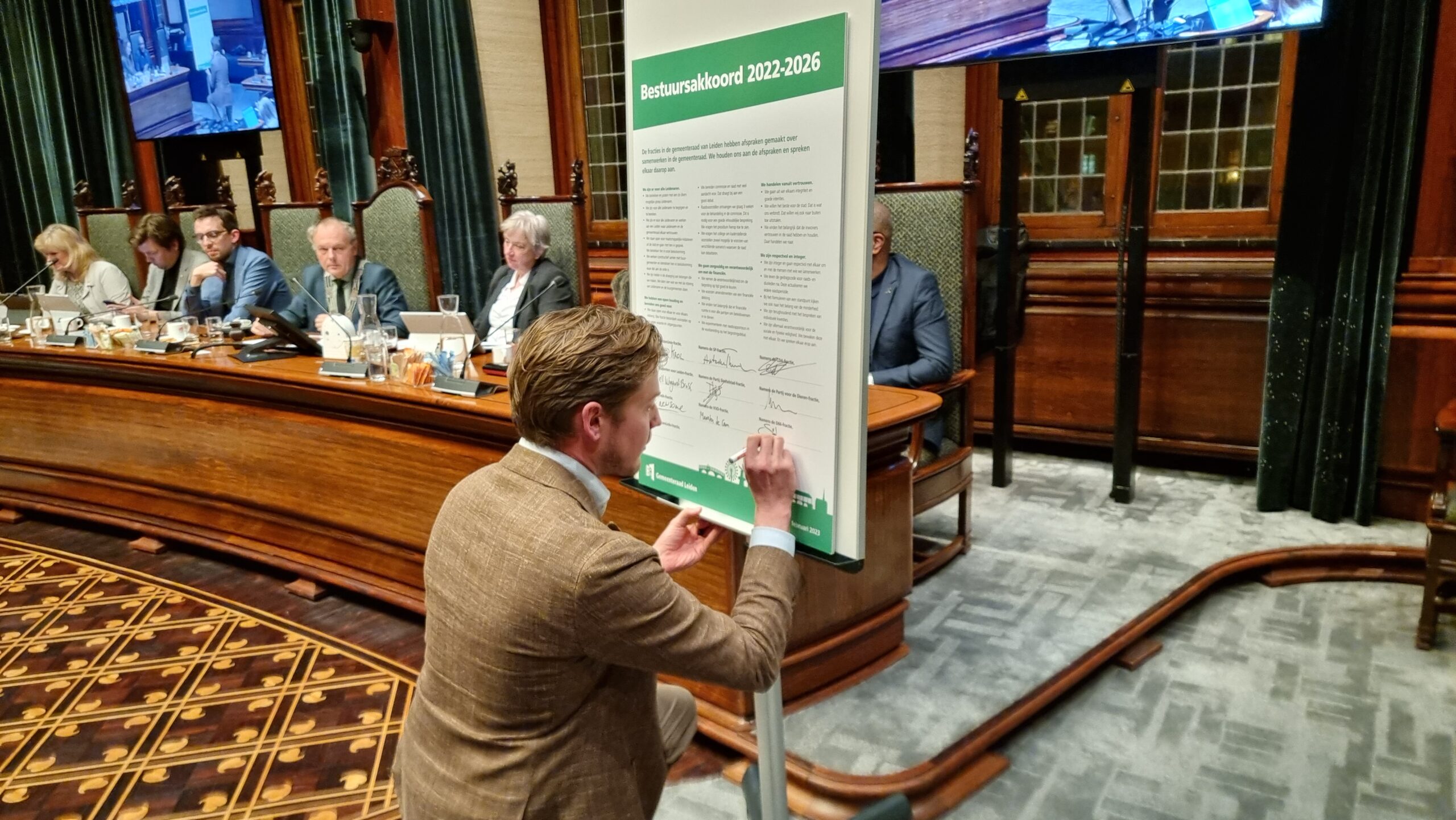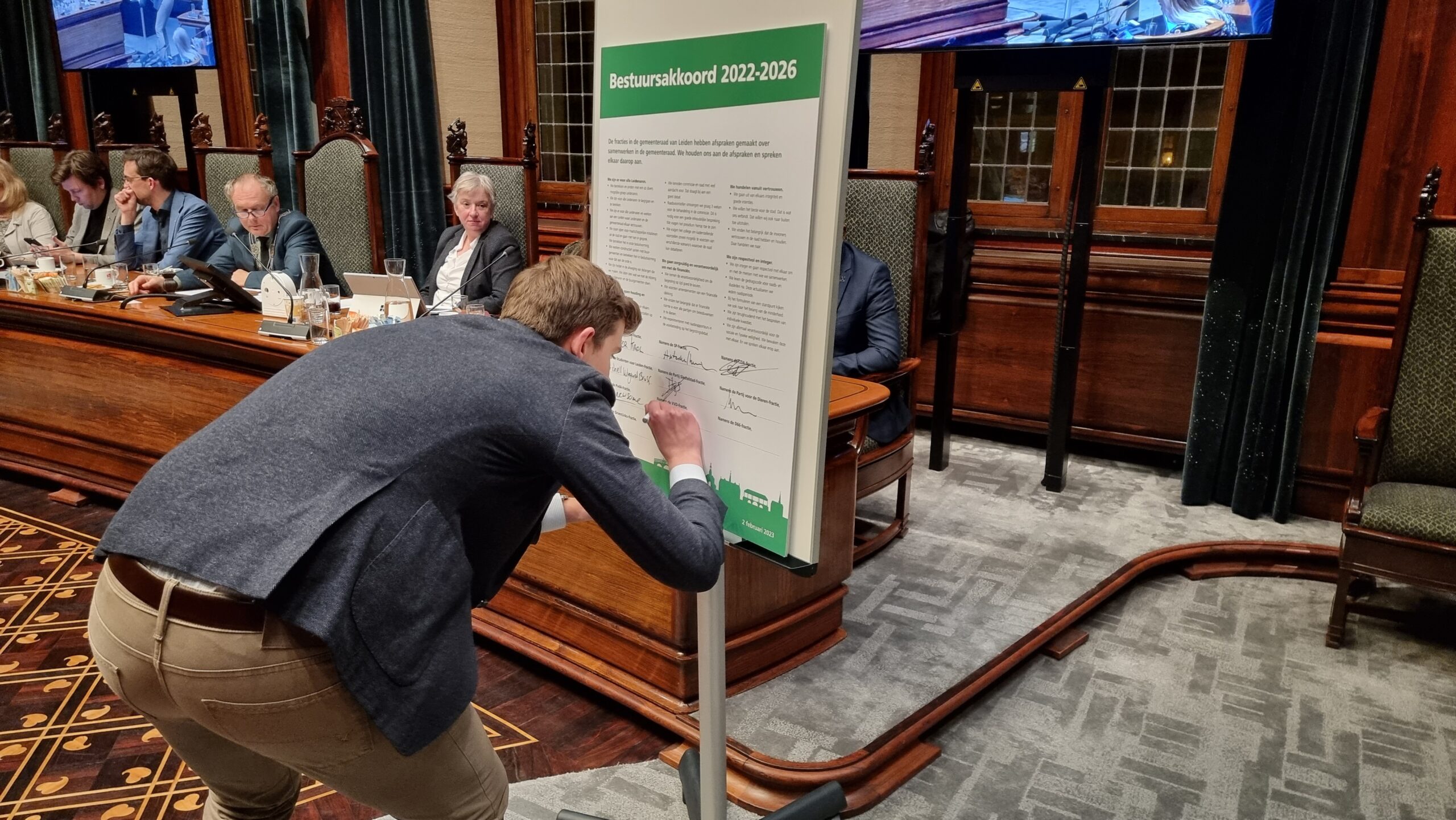 Rembrandt Rowaan tekende namens GroenLinks Leiden het bestuursakkoord 2022-2026.