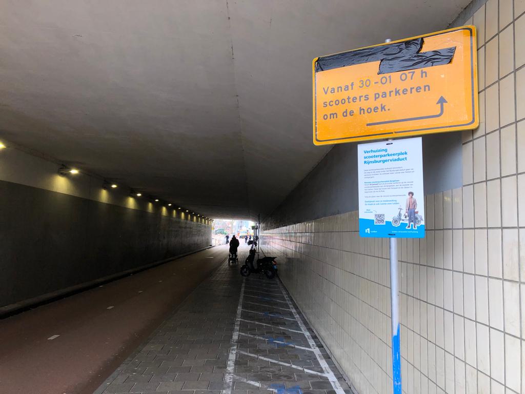 De scooterparkeerplek onder het Rijnsburgerviaduct verdwijnt binnenkort. De weg en de stoep worden opnieuw ingericht. Daardoor krijgen fietsers en voetgangers meer ruimte. Het fietspad onder het viaduct wordt verbreed tot vier meter. De stoep wordt versmald tot zo’n 2,65 meter. De gemeente verwacht dat de herinrichtingswerkzaamheden begin maart starten. Dan moeten alle geparkeerde scooters weg zijn.