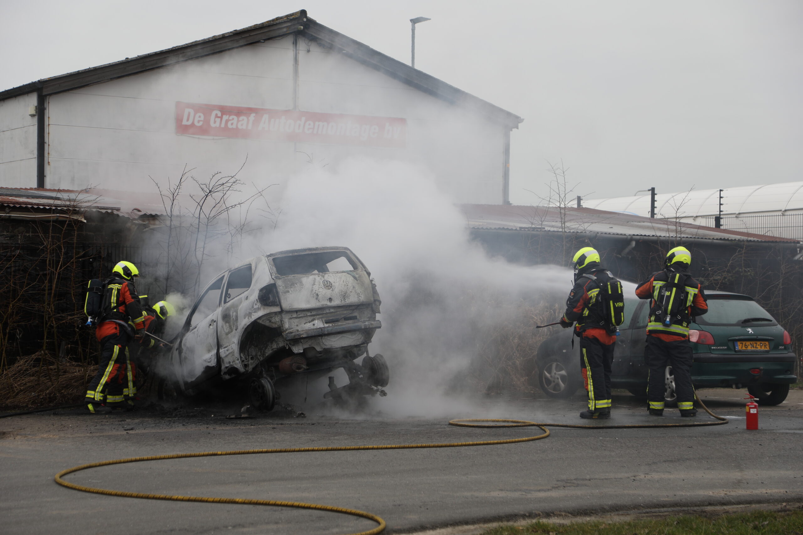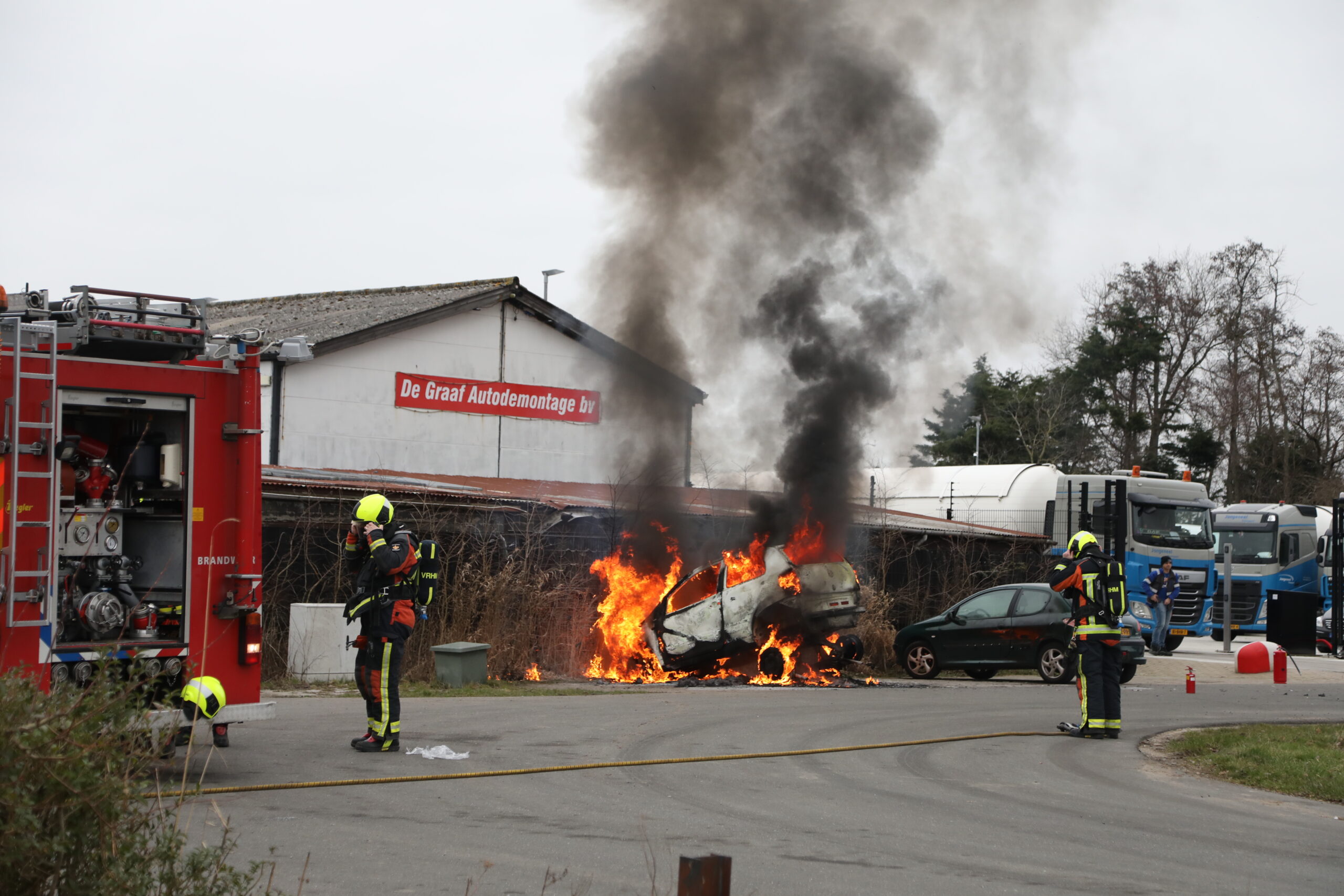 De auto stond vlak bij de sloperij geparkeerd. Om te voorkomen dat het vuur over zou slaan, heeft de brandweer opgeschaald. Daardoor was de brand snel onder controle.