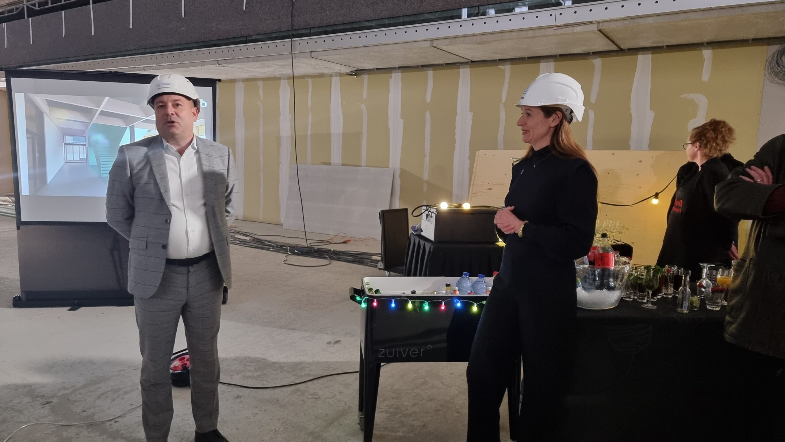 Projectleider Menno van der Heide van de gemeente Leiden en sportwethouder Fleur Spijker kunnen nauwelijks wachten tot het nieuwe sportcomplex in gebruik genomen kan worden.