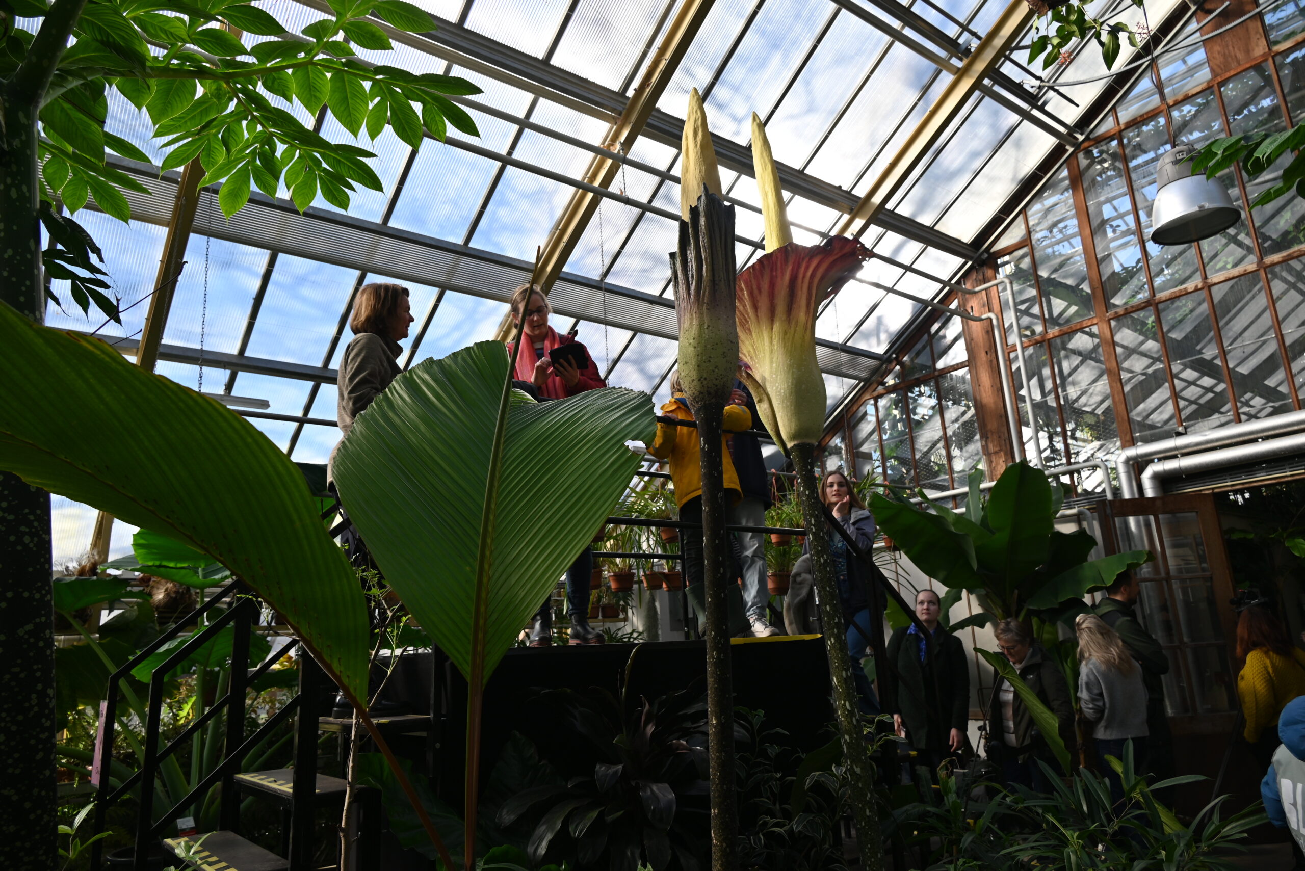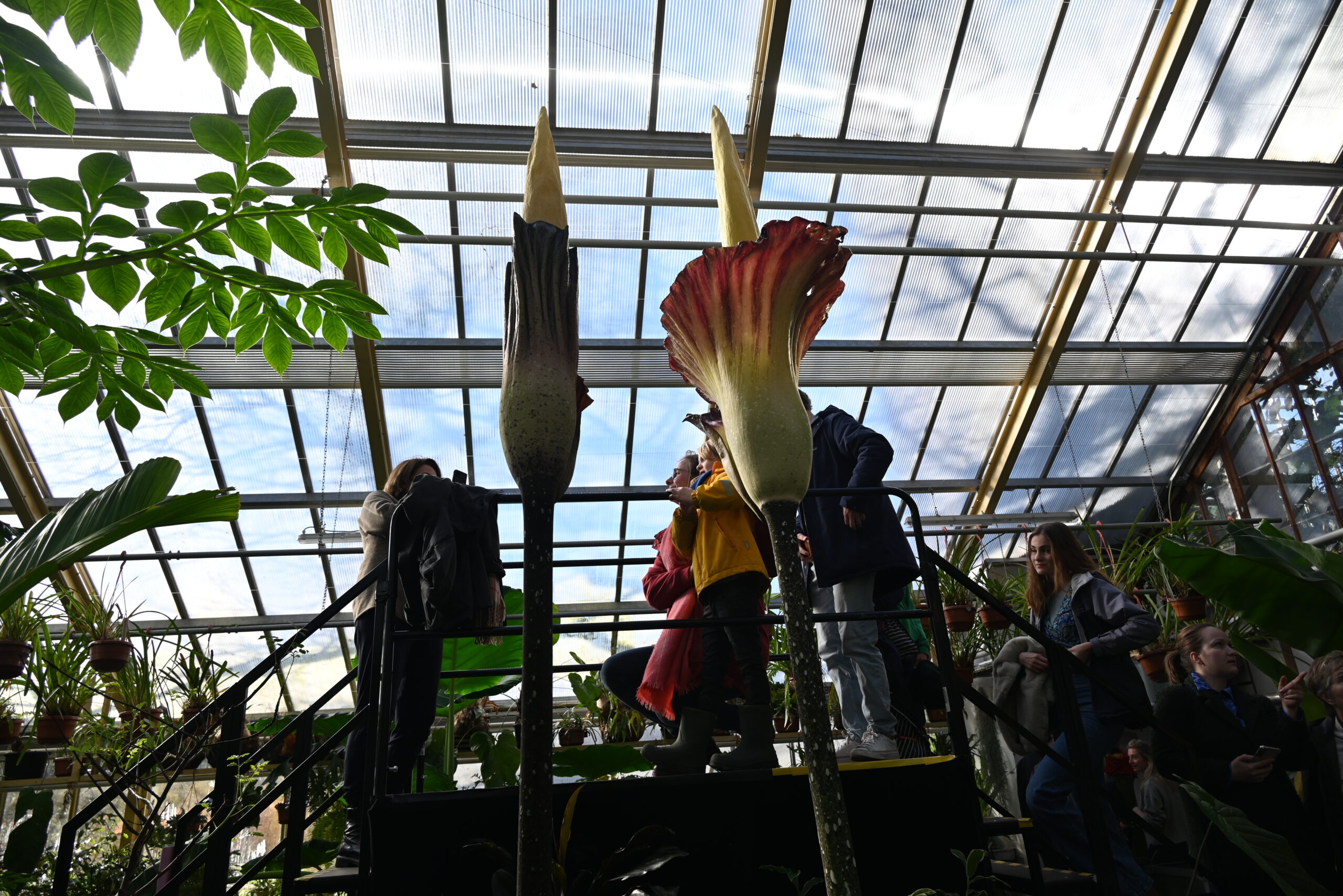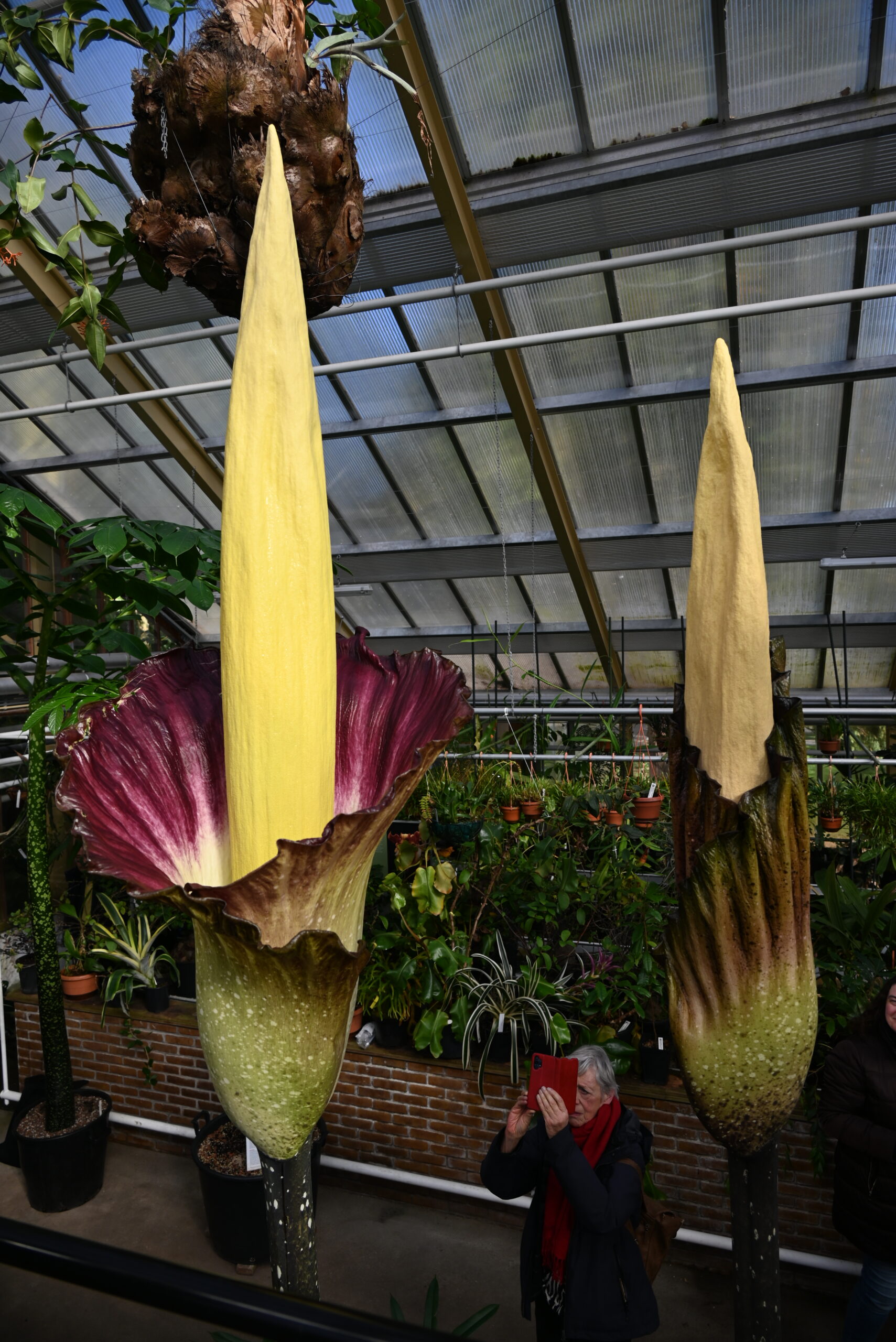 Er bloeien op dit moment niet één maar twee reuzepenisplanten in de Leidse Hortus. De Amorphophalli van het type ‘gigas’ zitten qua formaat tussen de titanum (de grootste) en de decus-silvae (de kleinste) in. Het is voor het eerst dat de Amorphophallus gigas in Nederland in bloei staat.