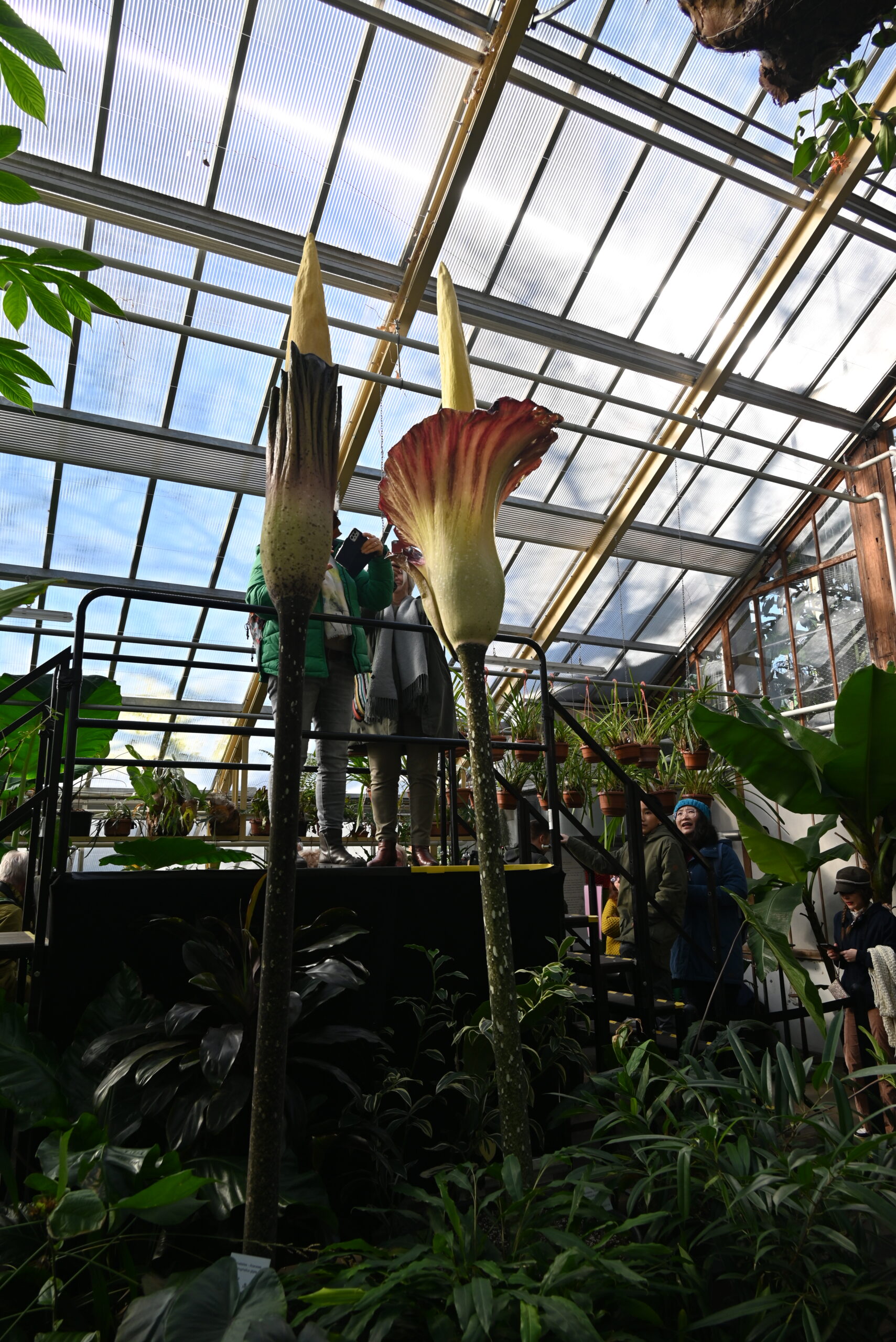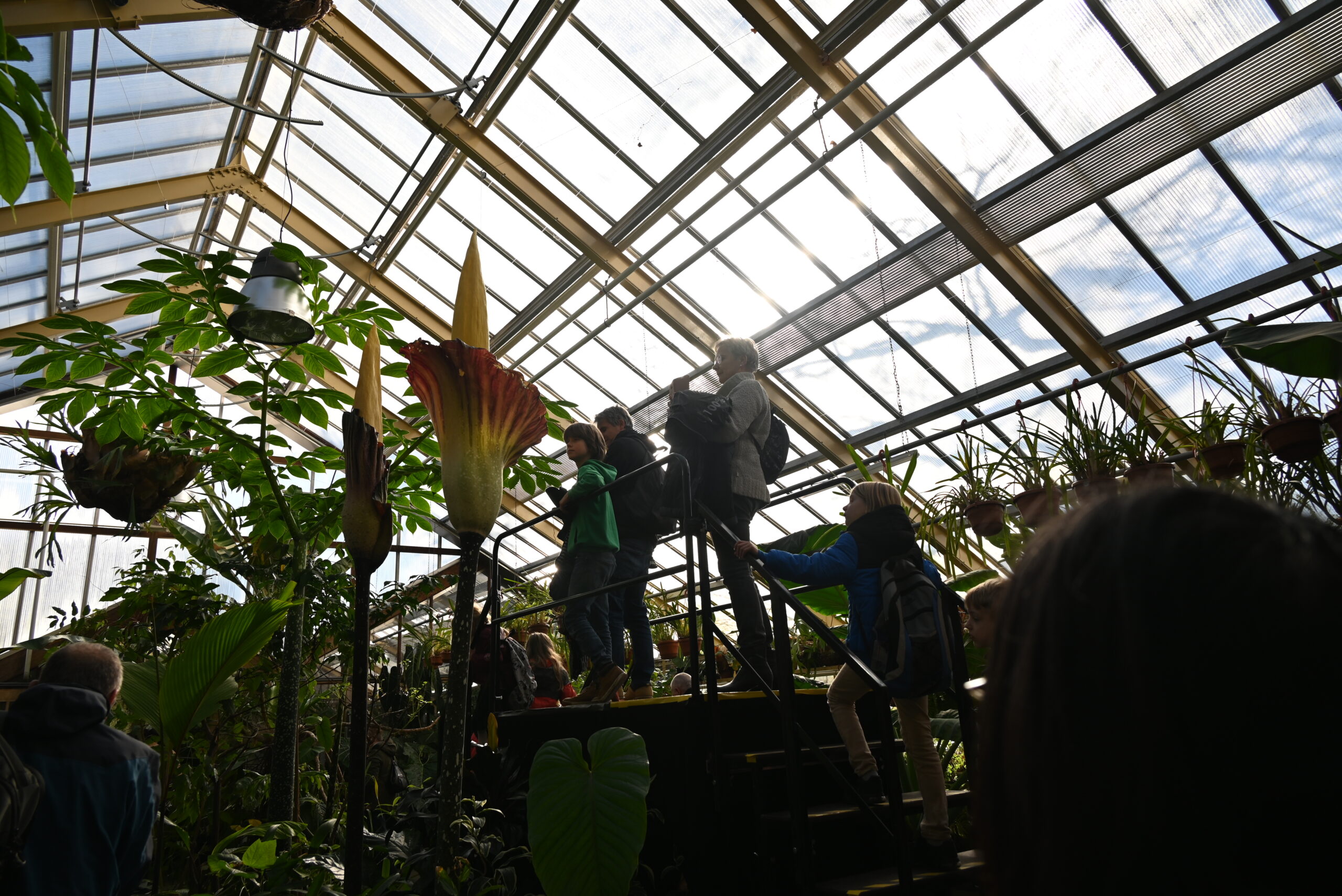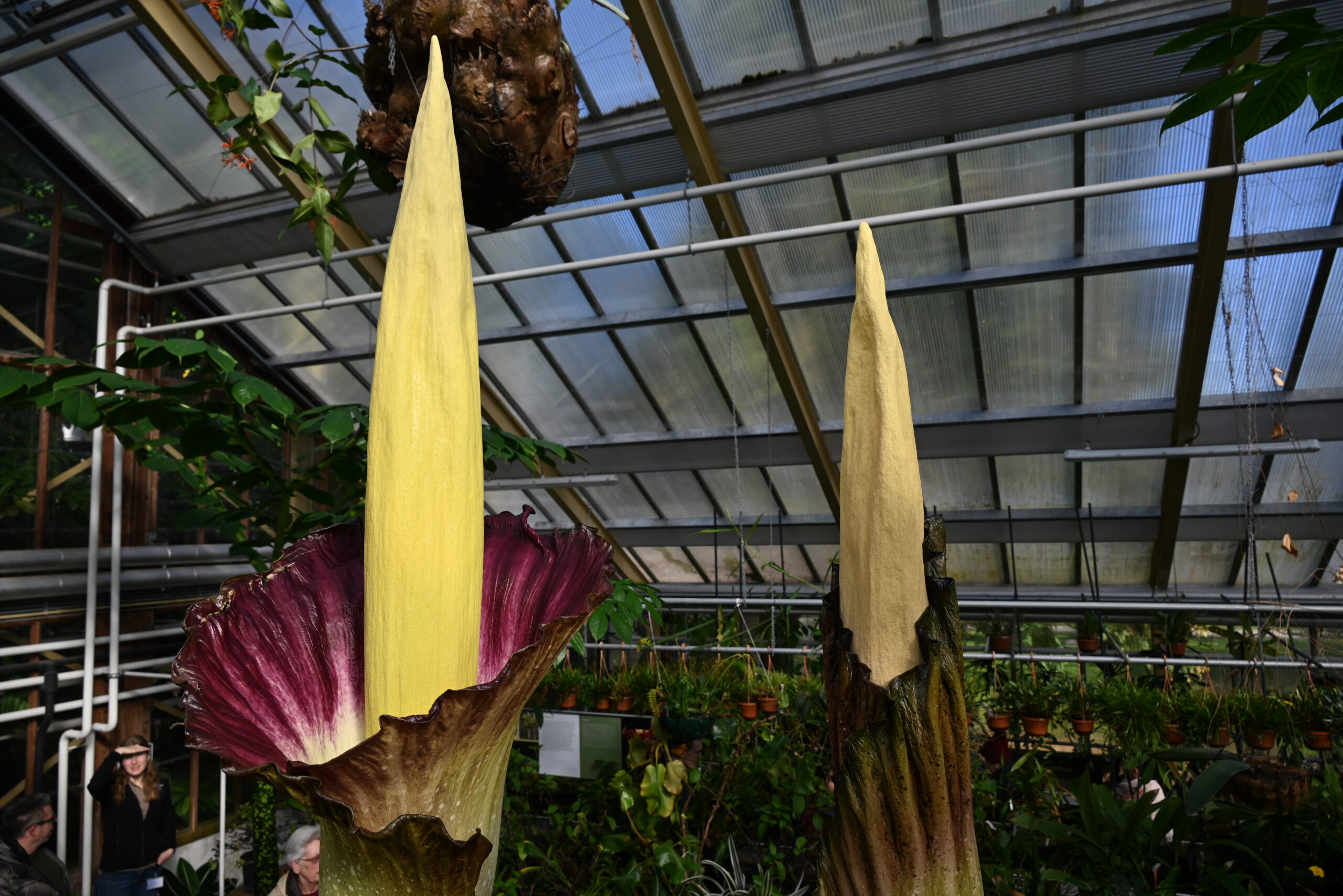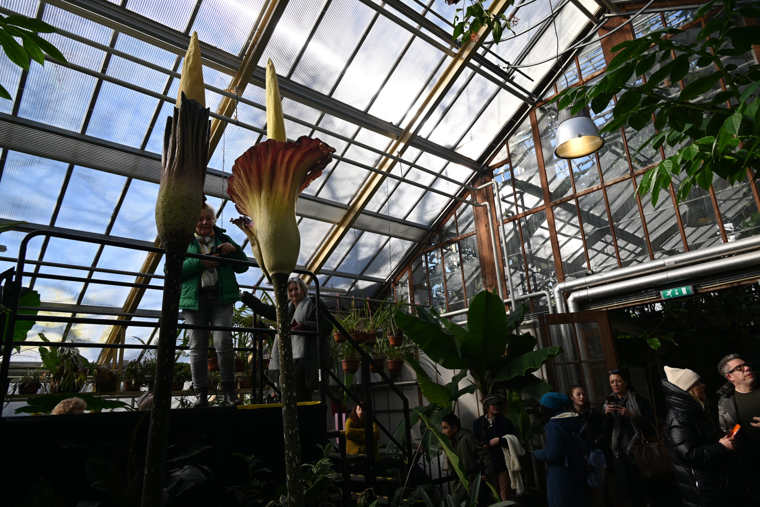 Er bloeien op dit moment niet één maar twee reuzepenisplanten in de Leidse Hortus. De Amorphophalli van het type ‘gigas’ zitten qua formaat tussen de titanum (de grootste) en de decus-silvae (de kleinste) in. Het is voor het eerst dat de Amorphophallus gigas in Nederland in bloei staat.