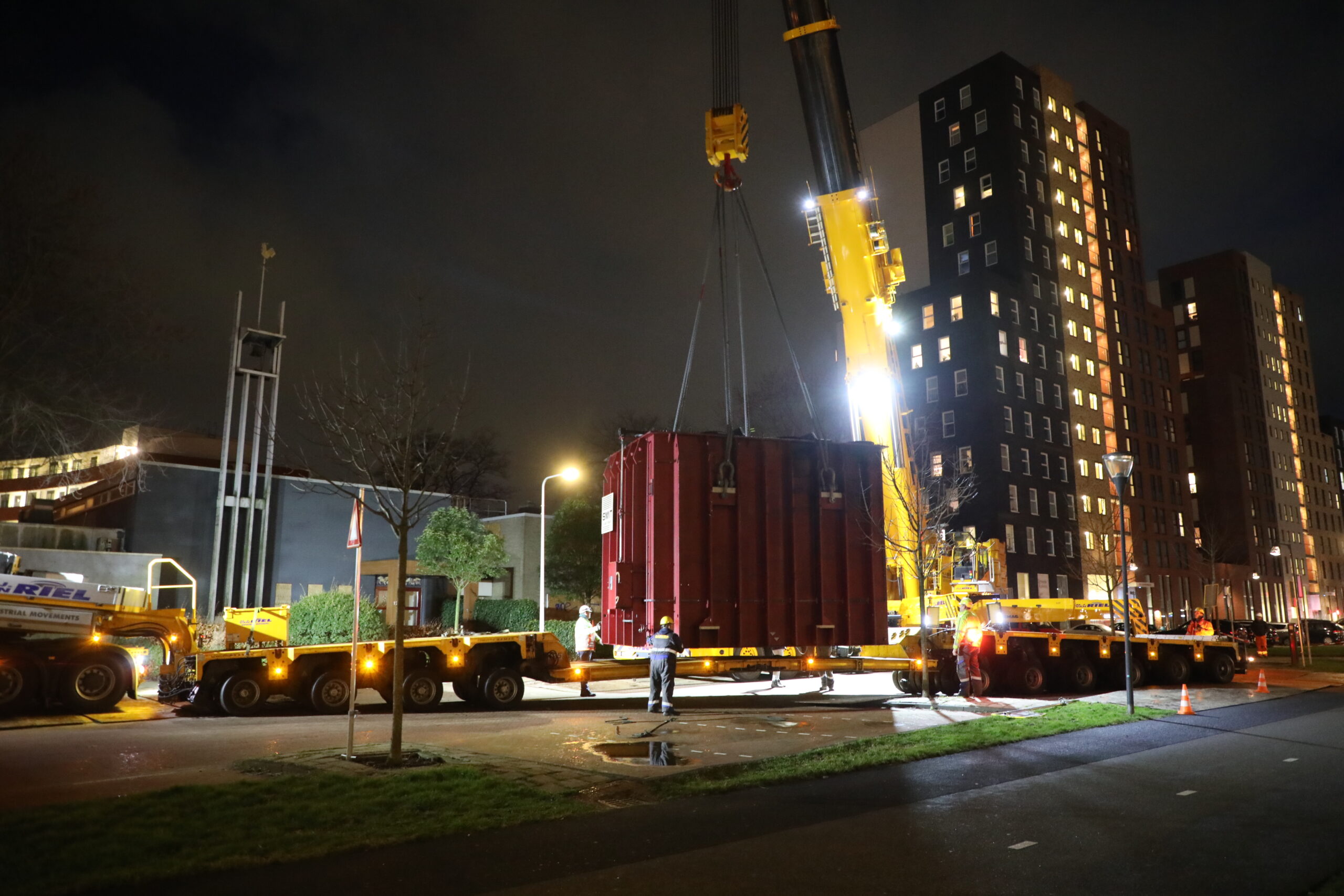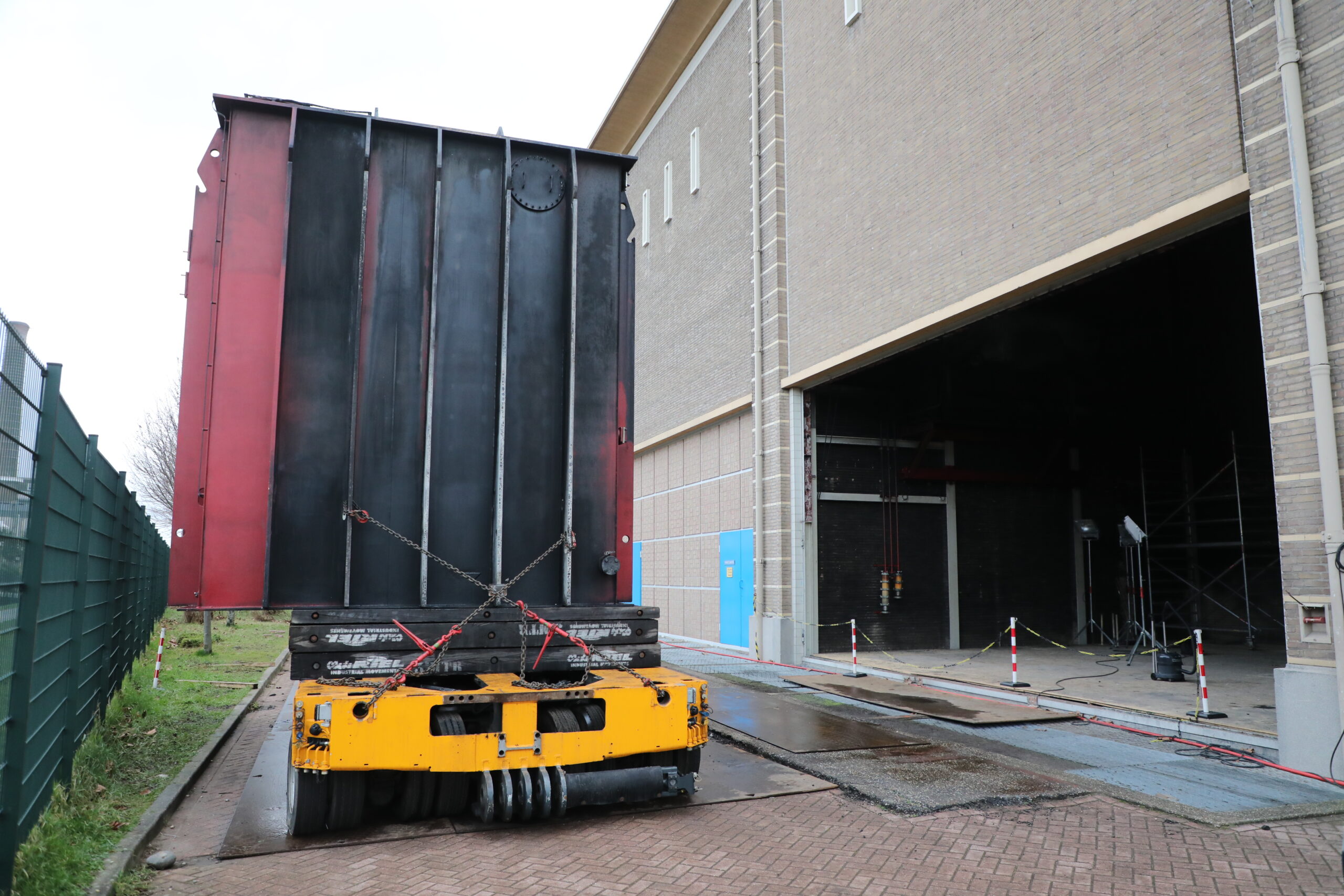 De reusachtige transformator van circa 130 ton die bij de brand in november vorig jaar in het TenneT hoogspanningsstation zwaar beschadigd is geraakt, is dinsdagavond uit het gebouw getakeld en op transport gezet naar Nijmegen.