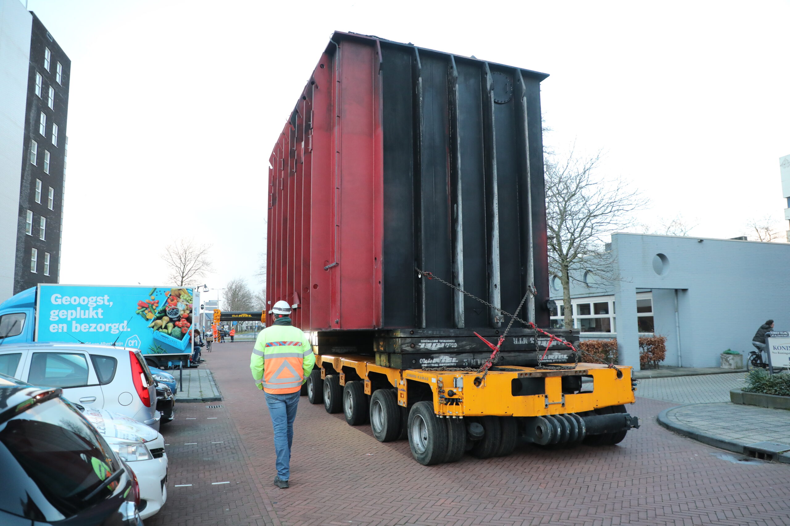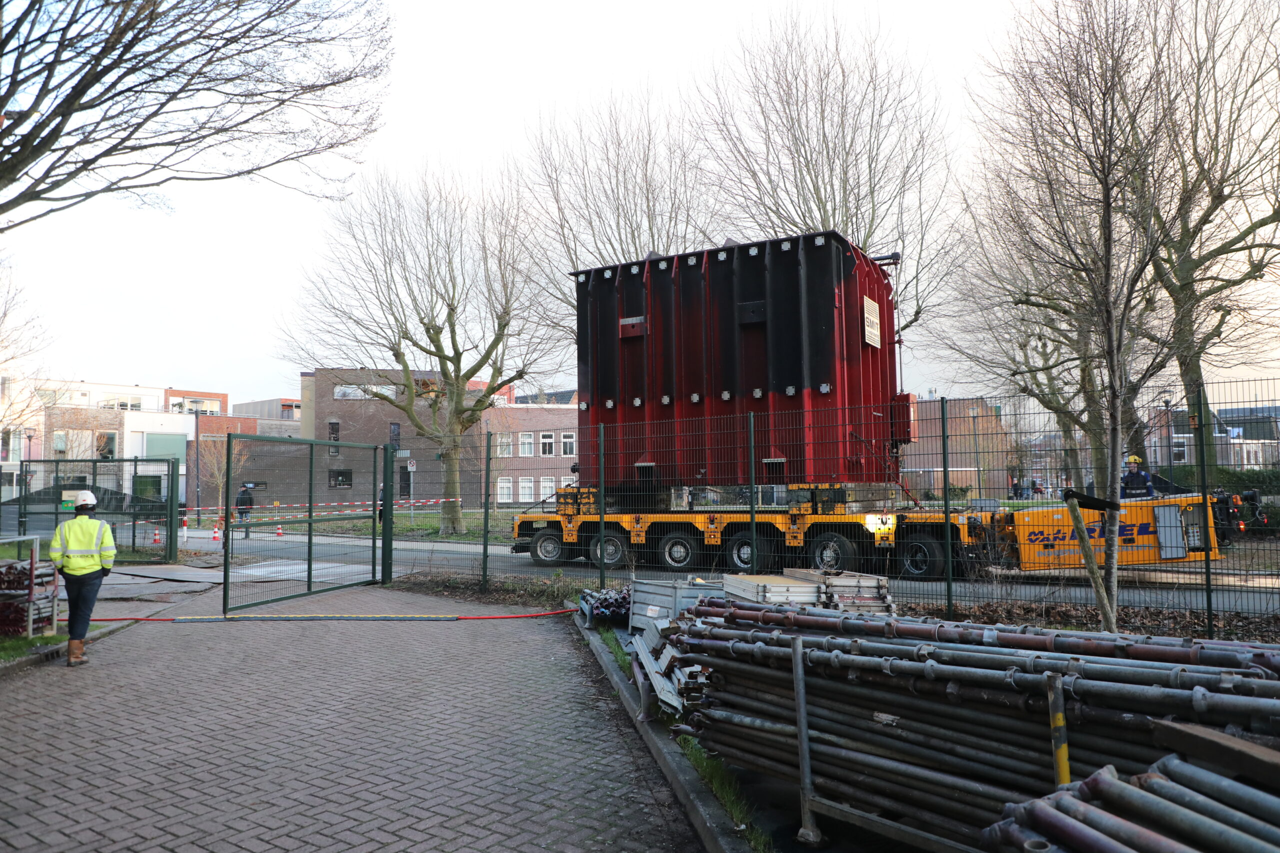 Om de transformator uit de ruimte te kunnen halen, moest een deel van de gevel van het hoogspanningsstation worden verwijderd. Daarna ging het per dieplader naar de Willem de Zwijgerlaan waar de transformator met behulp van een 700-tons mobiele telescoopkraan op een dieplader werd gezet.