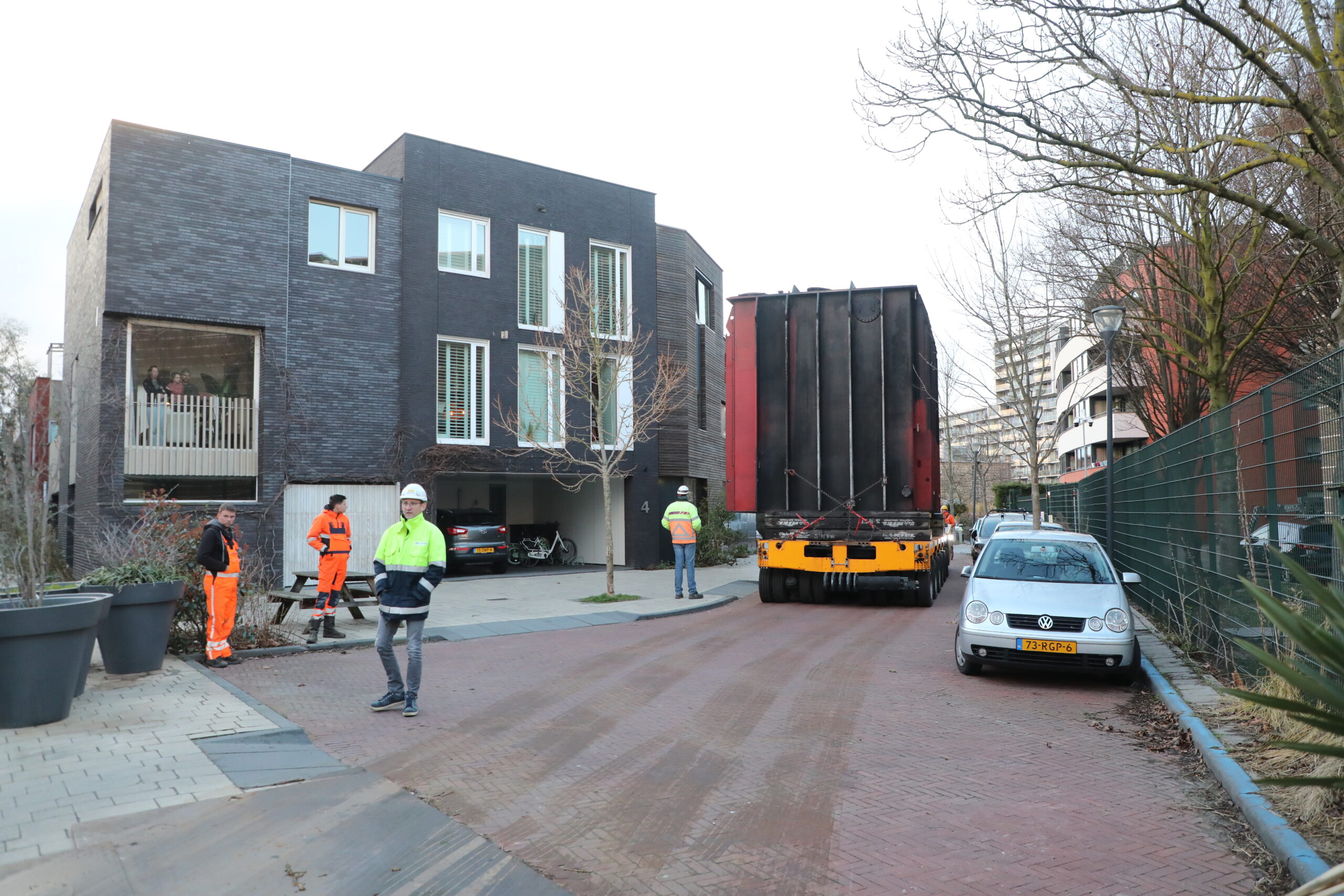 Omdat de dieplader met de transformator te hoog is voor de tunnel moest deze via de Merenwijk omrijden naar Leiderdorp. Daar gaat de transformator per binnenvaartschip verder op transport.