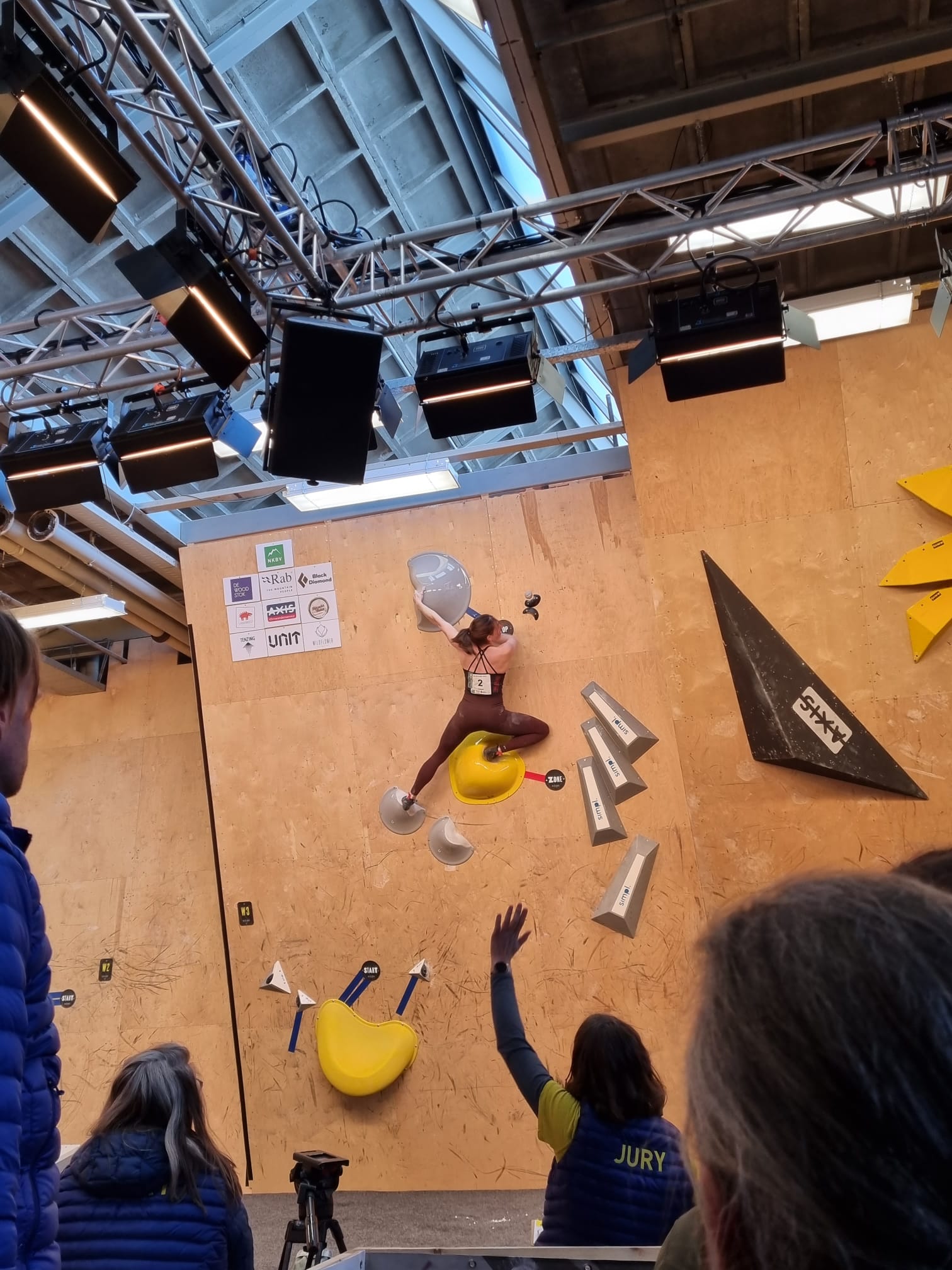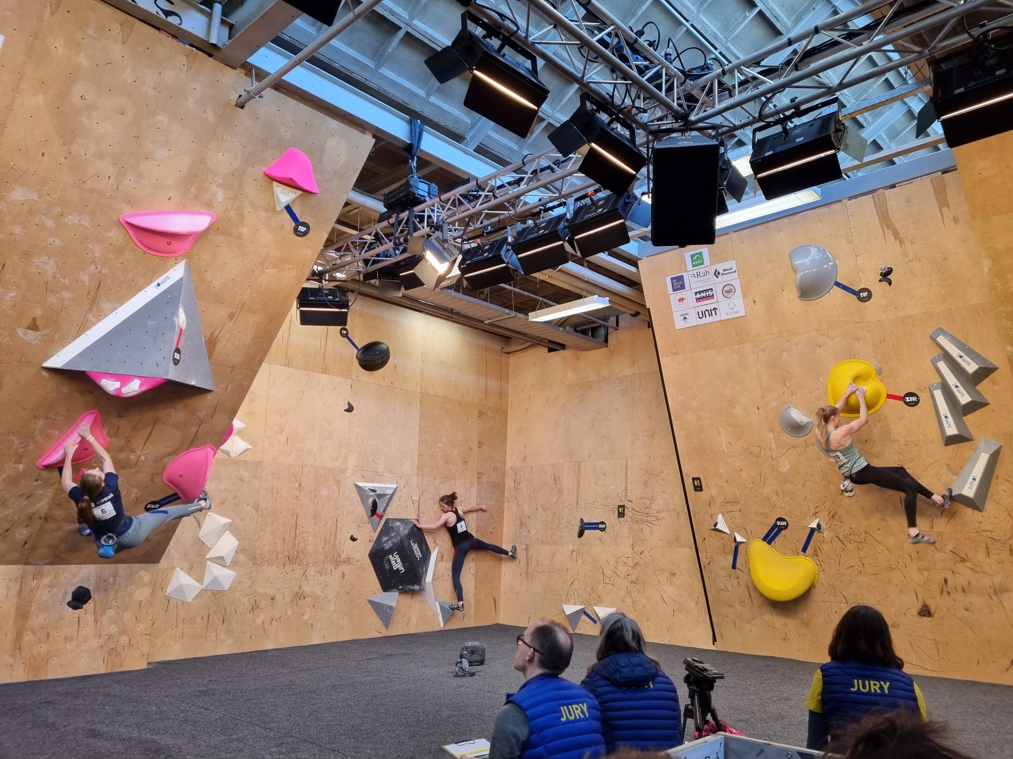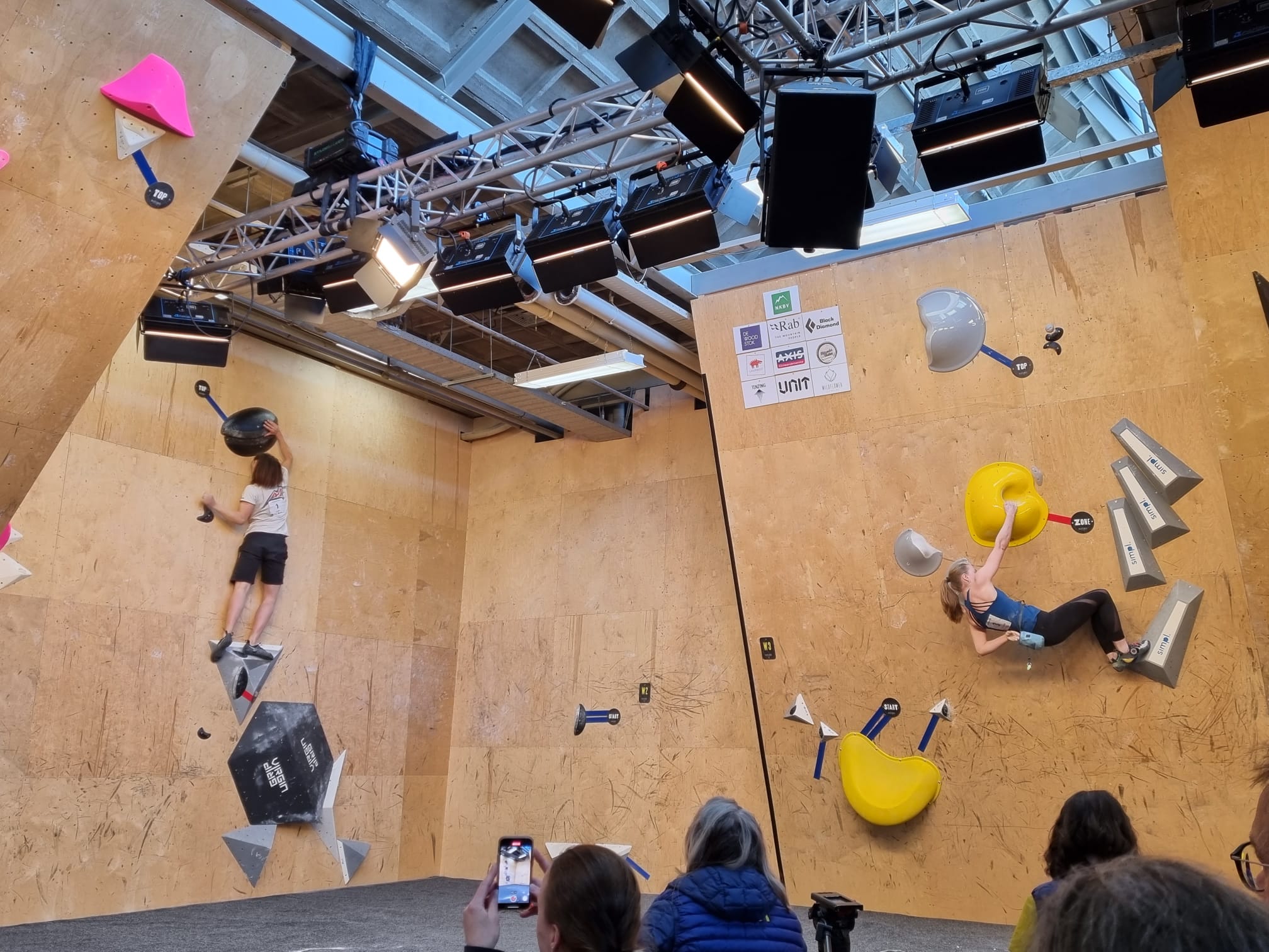Vroom, eigenaar van de hal en zelf een van de beste klimmers van Nederland, mocht meebouwen aan de routes. Een grote kans voor de Leidse, want voor het routebouwen wordt een gespecialiseerd internationaal team samengesteld. “Het is dan altijd spannend als de klimmers van start gaan, ook voor de routebouwers”, vertelt Vroom. “Want de routes bepalen de wedstrijd. We willen onderscheidende boulders bouwen.” Spannend werd de wedstrijd zeker. De twee favorieten lieten onder de druk steekjes vallen. Bij de vrouwen werd reserve Lynn van der Meer Nederlands kampioen en bij de mannen Paul Brand.