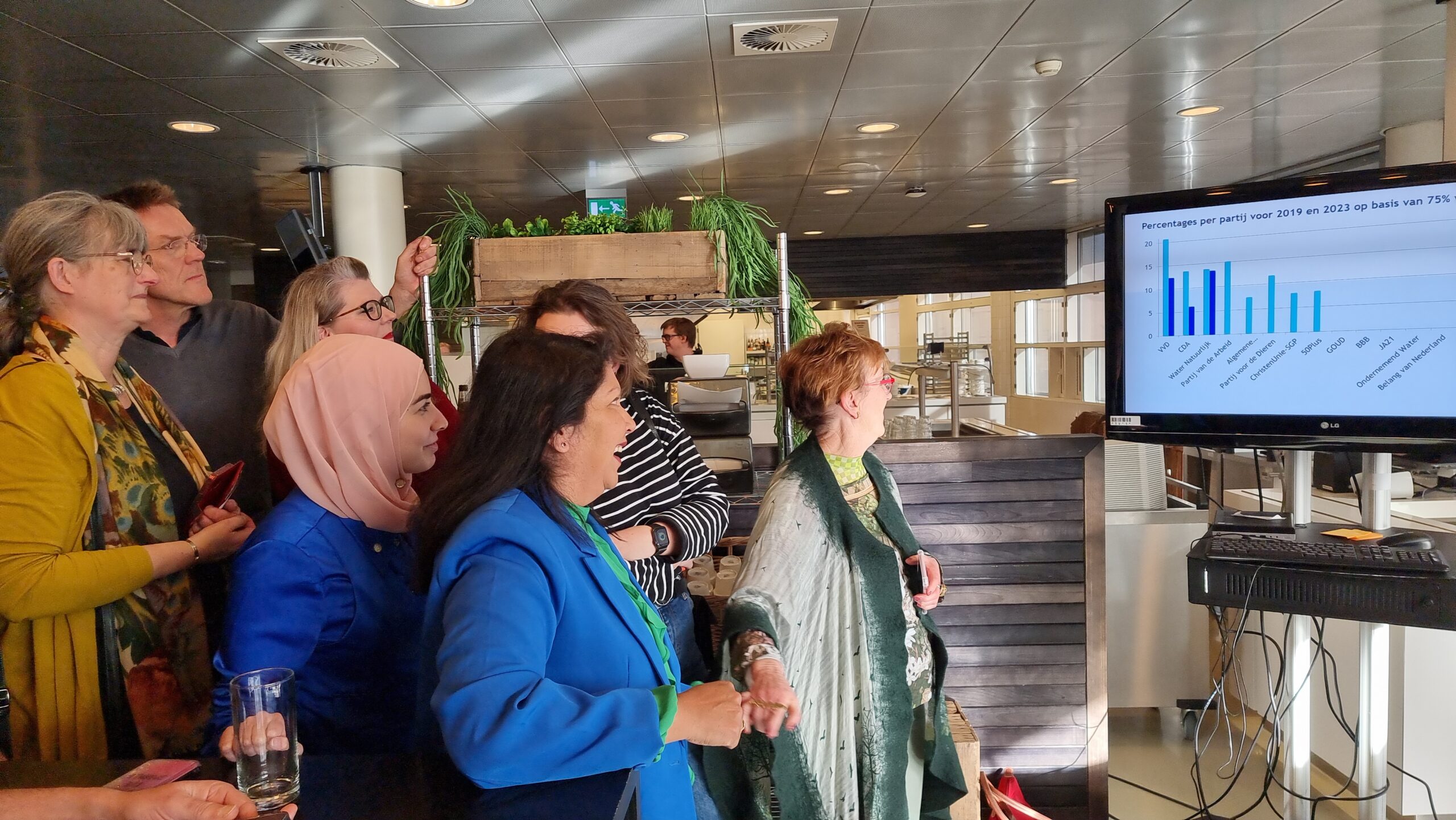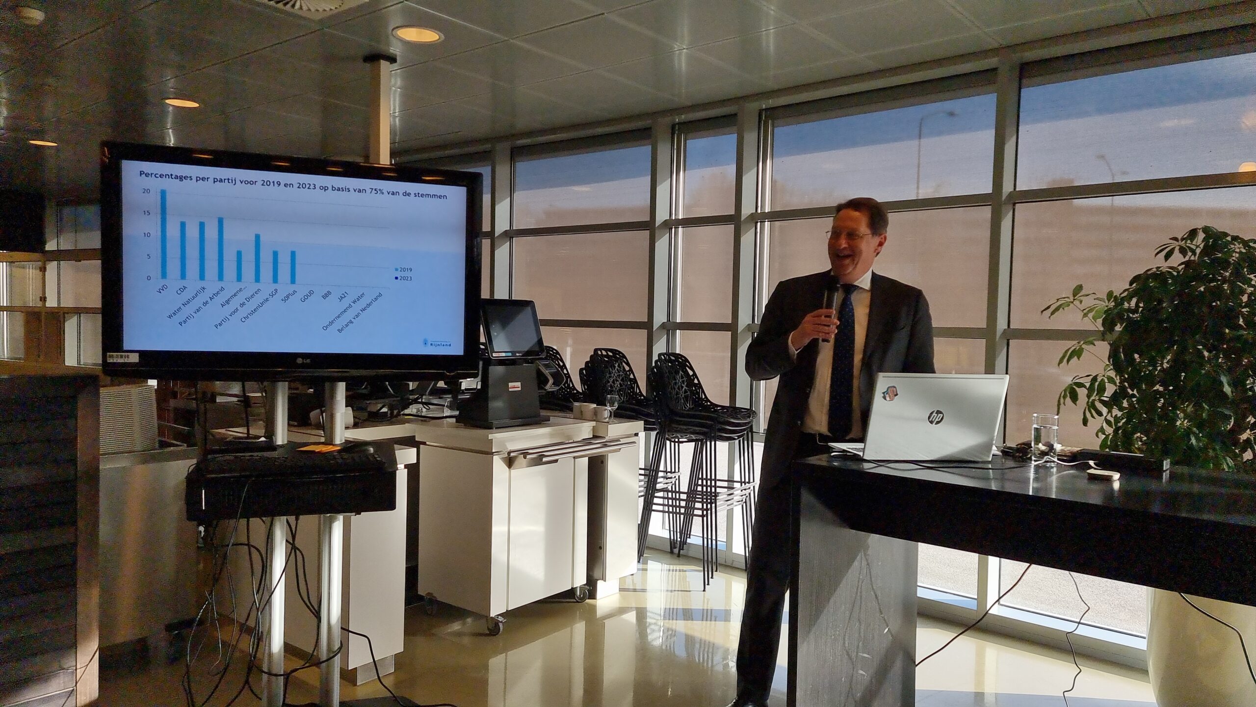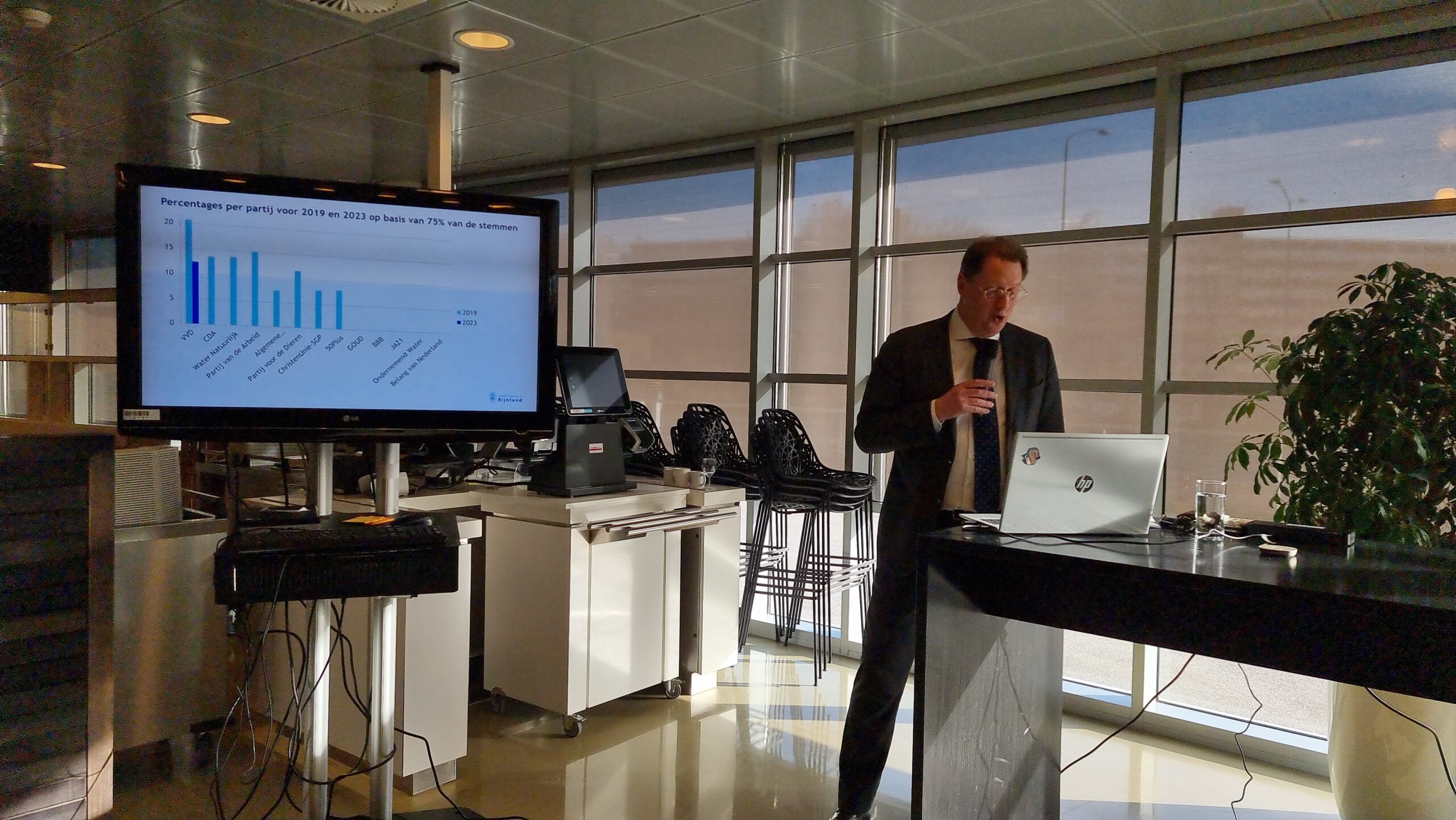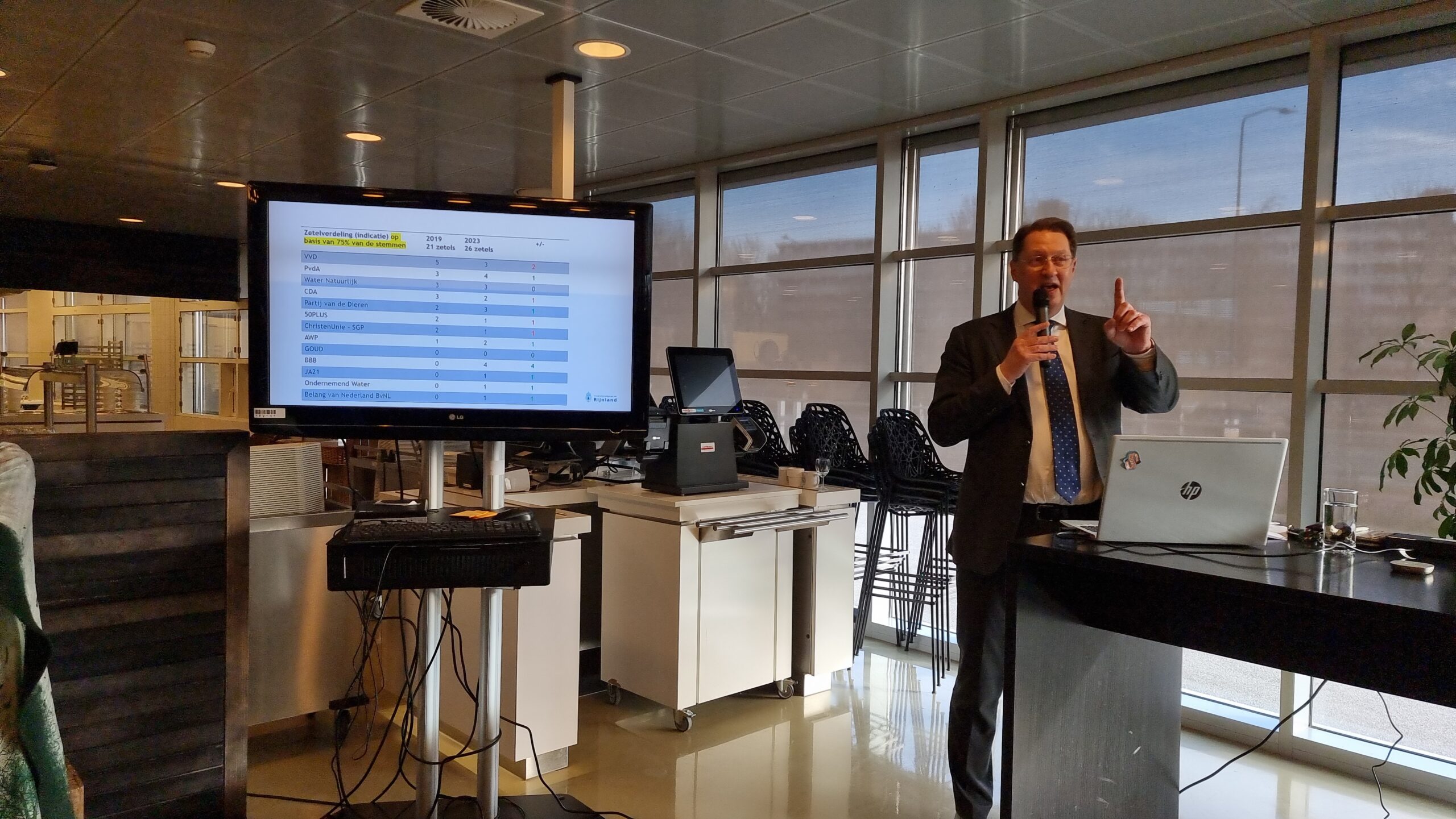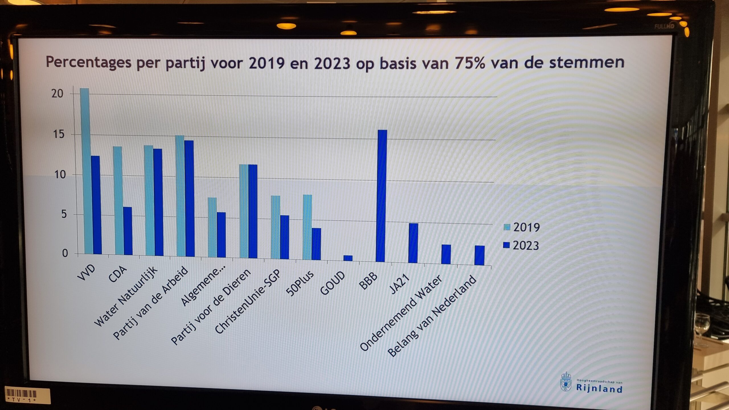 Op basis van 77 procent van die voorlopige uitslagen heeft dijkgraaf Rogier van der Sande van het Hoogheemraadschap van Rijnland die eerste cijfers donderdag aan het eind van de middag bekendgemaakt. Tweede werd de PvdA met 14,3 procent, gevolgd door Water Natuurlijk die 13,3 procent van de stemmen binnensleepte. De VVD werd vierde met 12,5 procent en de Partij voor de Dieren kreeg 11,6 procent.