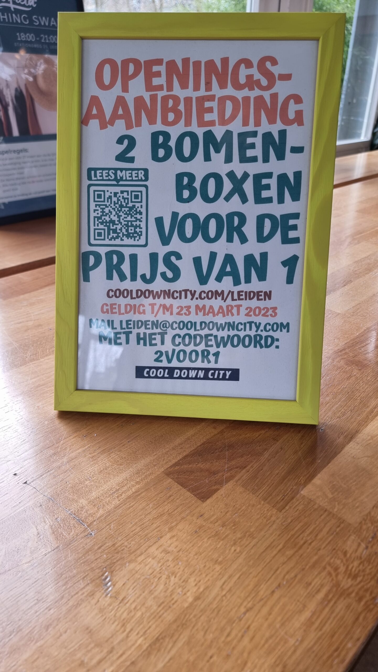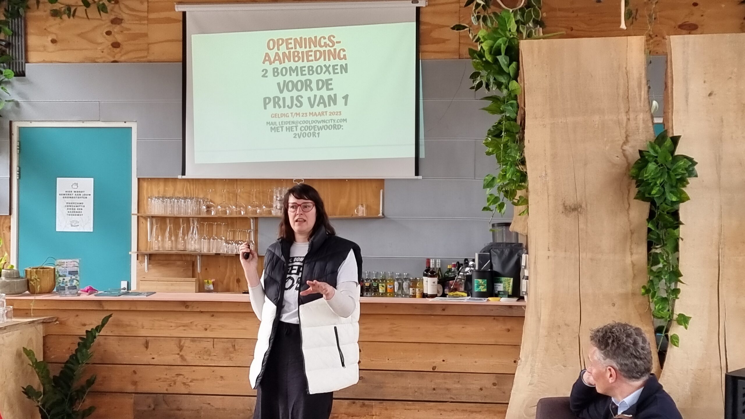 Het is voor bedrijven en organisaties ook mogelijk om een bomenbox te adopteren. Het is de bedoeling van Cool Down City dat in elke Leidse wijk zo’n box komt te staan waar iedereen boomzaailingen uit de eigen tuin kan achterlaten en babyboompjes kan meenemen. Die ‘bomenparkeerplaatsen’ worden tussen april en november wekelijks gevuld met nieuwe aanwas. De achtergelaten boomzaailingen worden meegenomen door de organisatie om ze op te kweken tot babyboompjes die een goede kans op overleven hebben.