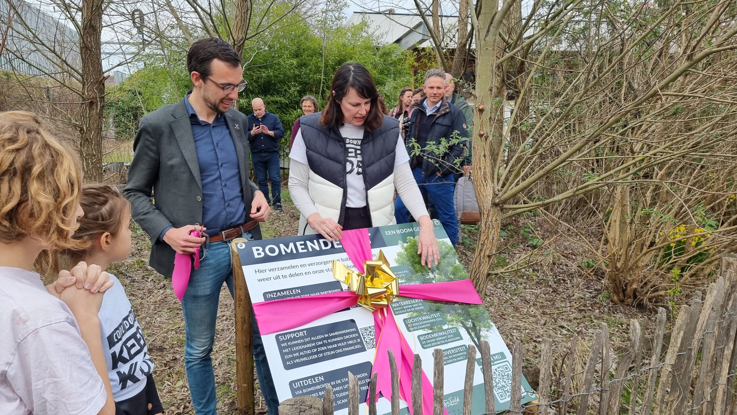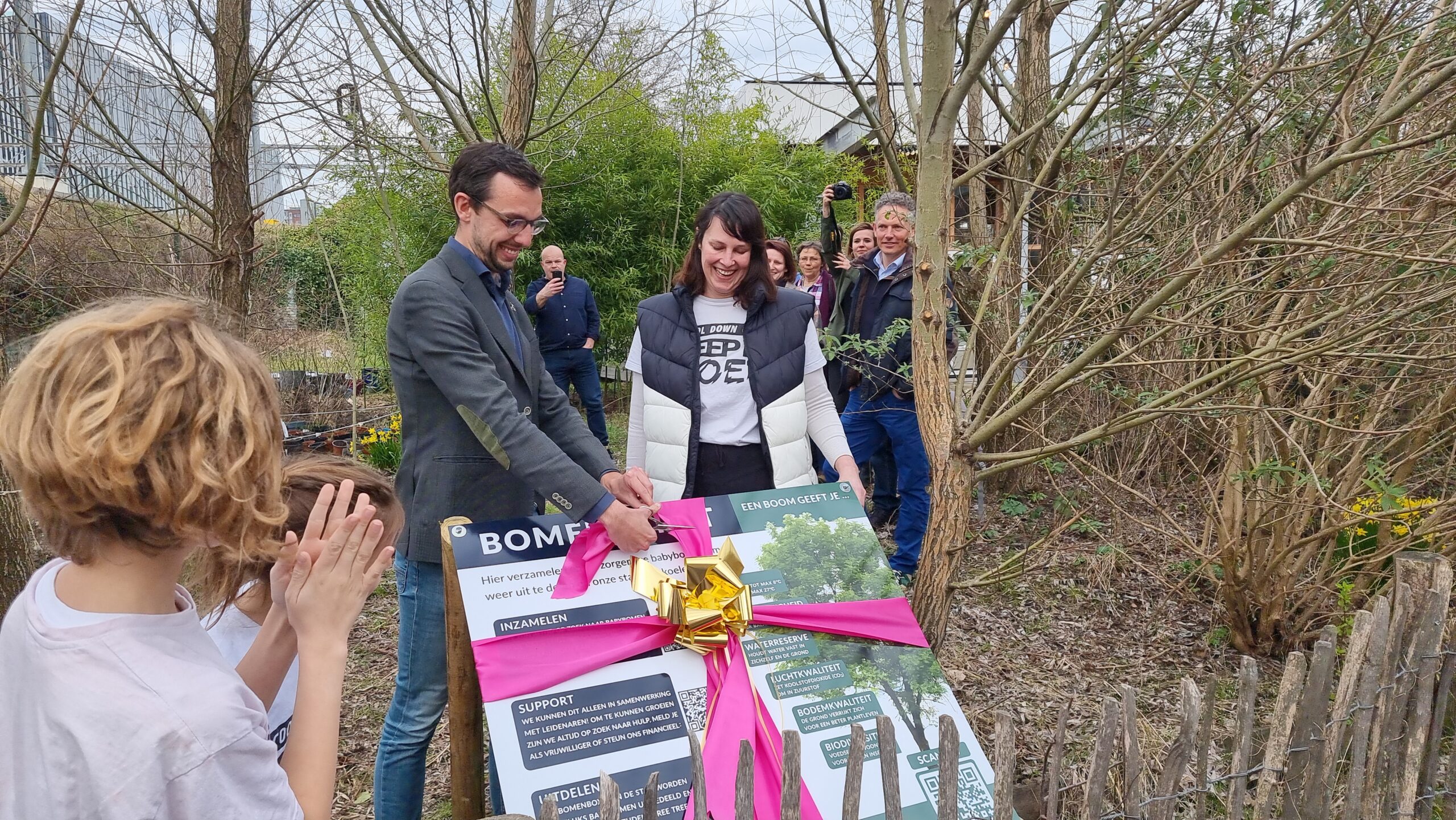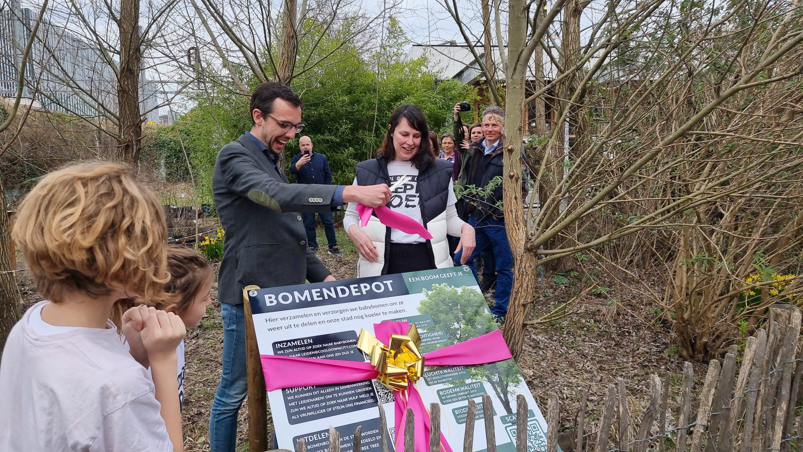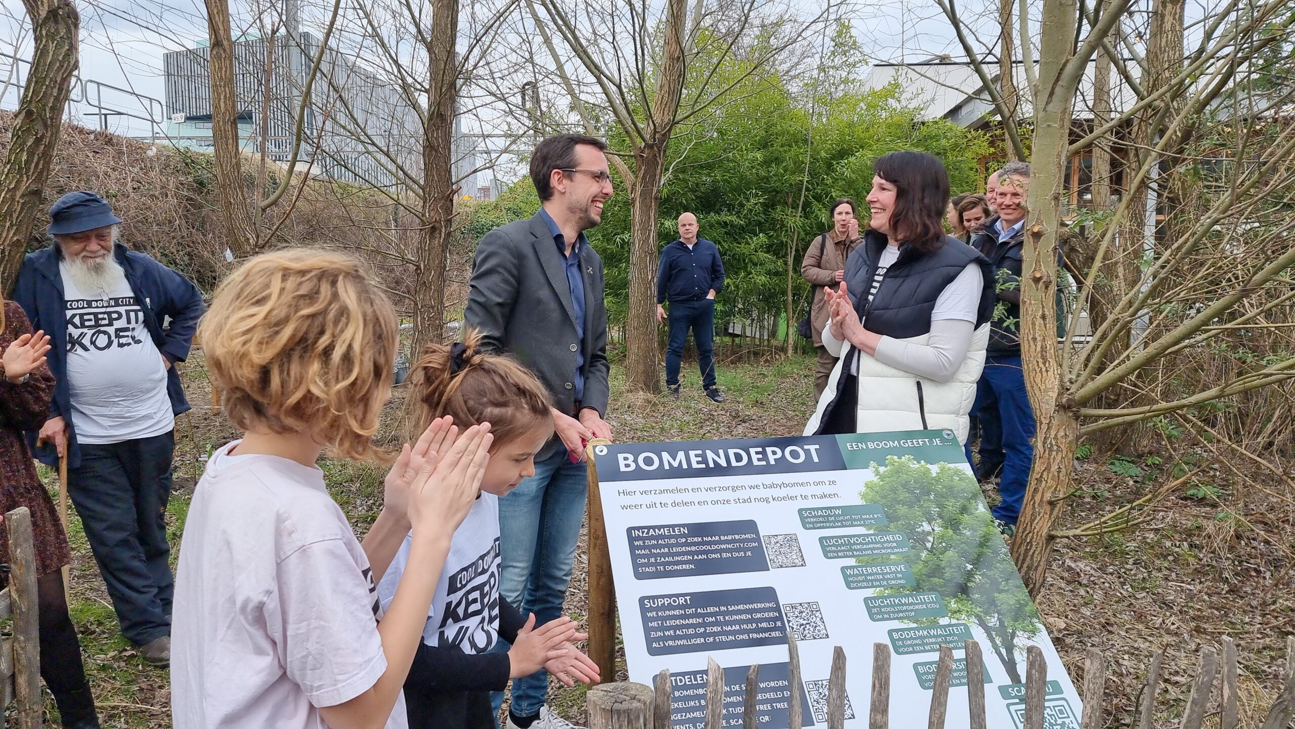 Bij circulair paviljoen The Field aan het Stationsplein in Leiden is vrijdagmiddag het bomendepot geopend van Cool Down City Leiden. Na een praatje van oprichtster Charlotte van der Heiden knipte wethouder Ashley North het een lintje door bij het bord met uitleg.