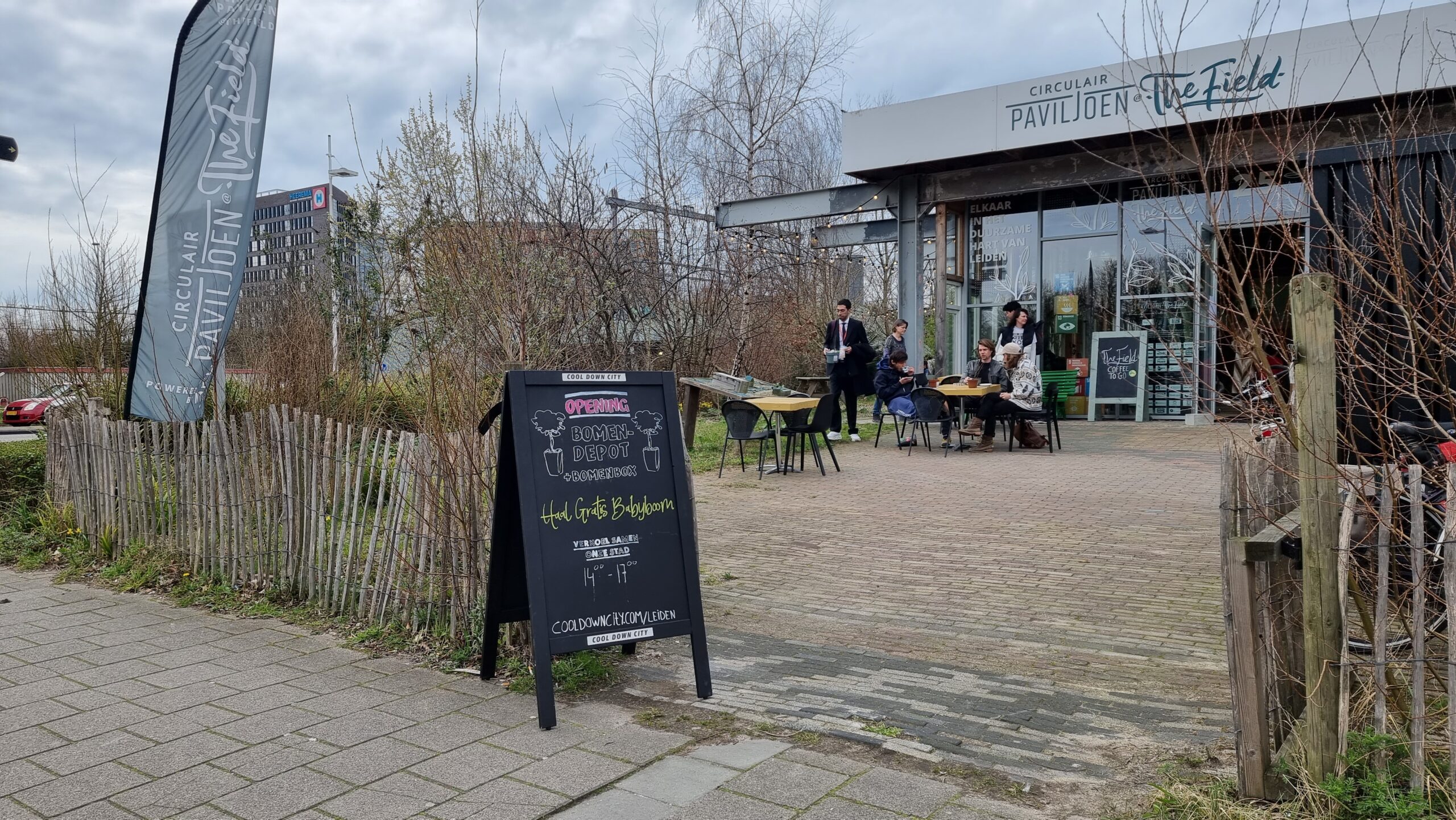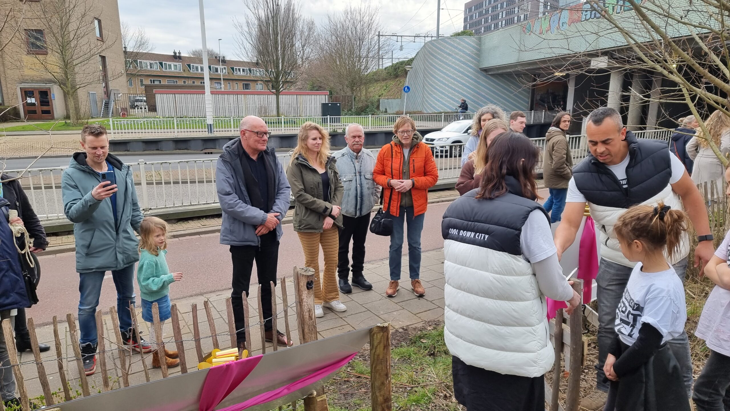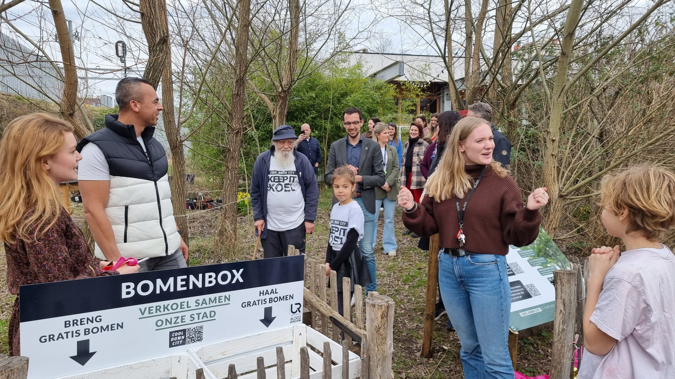 Bij circulair paviljoen The Field aan het Stationsplein in Leiden is vrijdagmiddag het bomendepot geopend van Cool Down City Leiden. Na een praatje van oprichtster Charlotte van der Heiden knipte wethouder Ashley North het een lintje door bij het bord met uitleg.