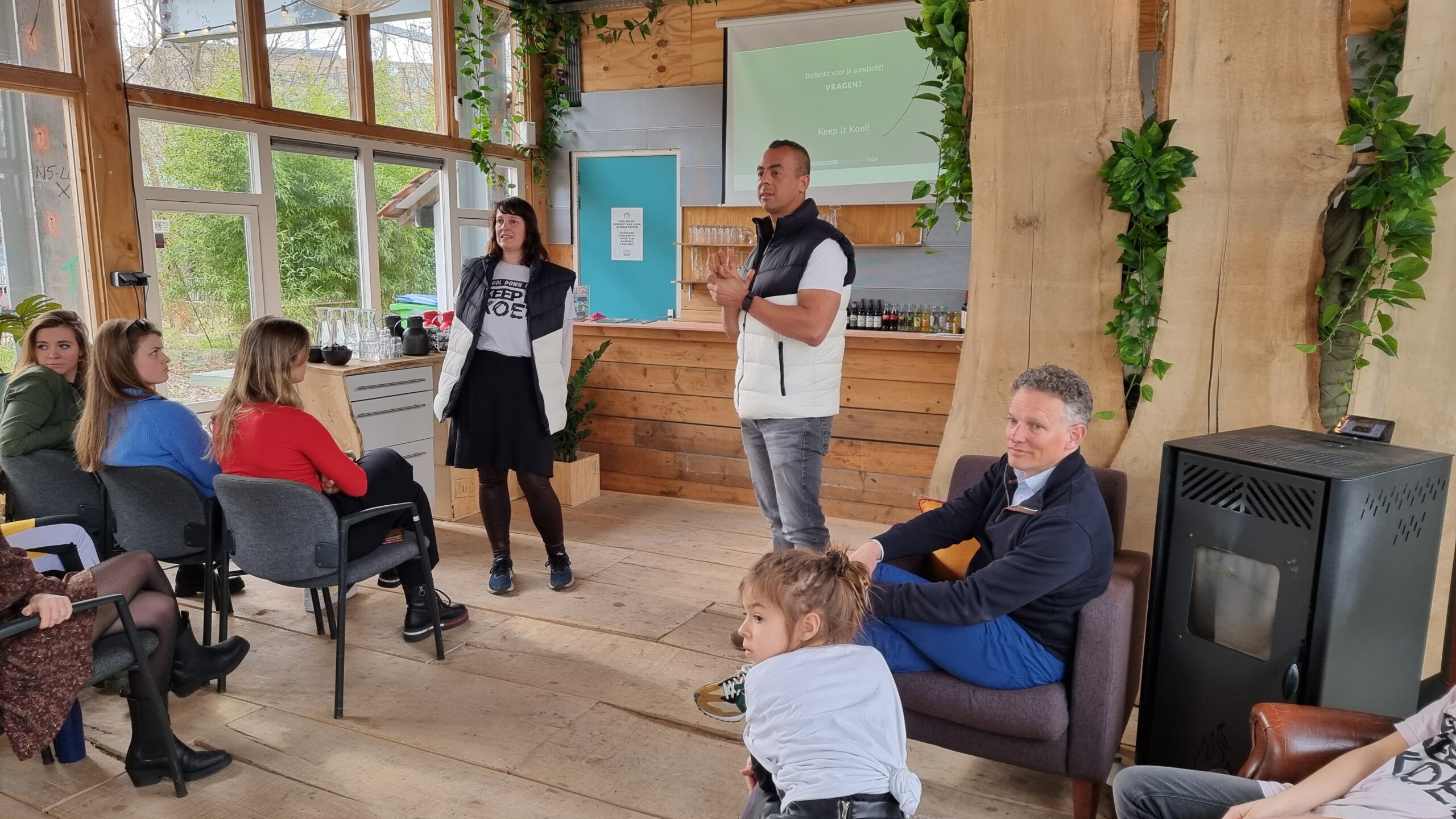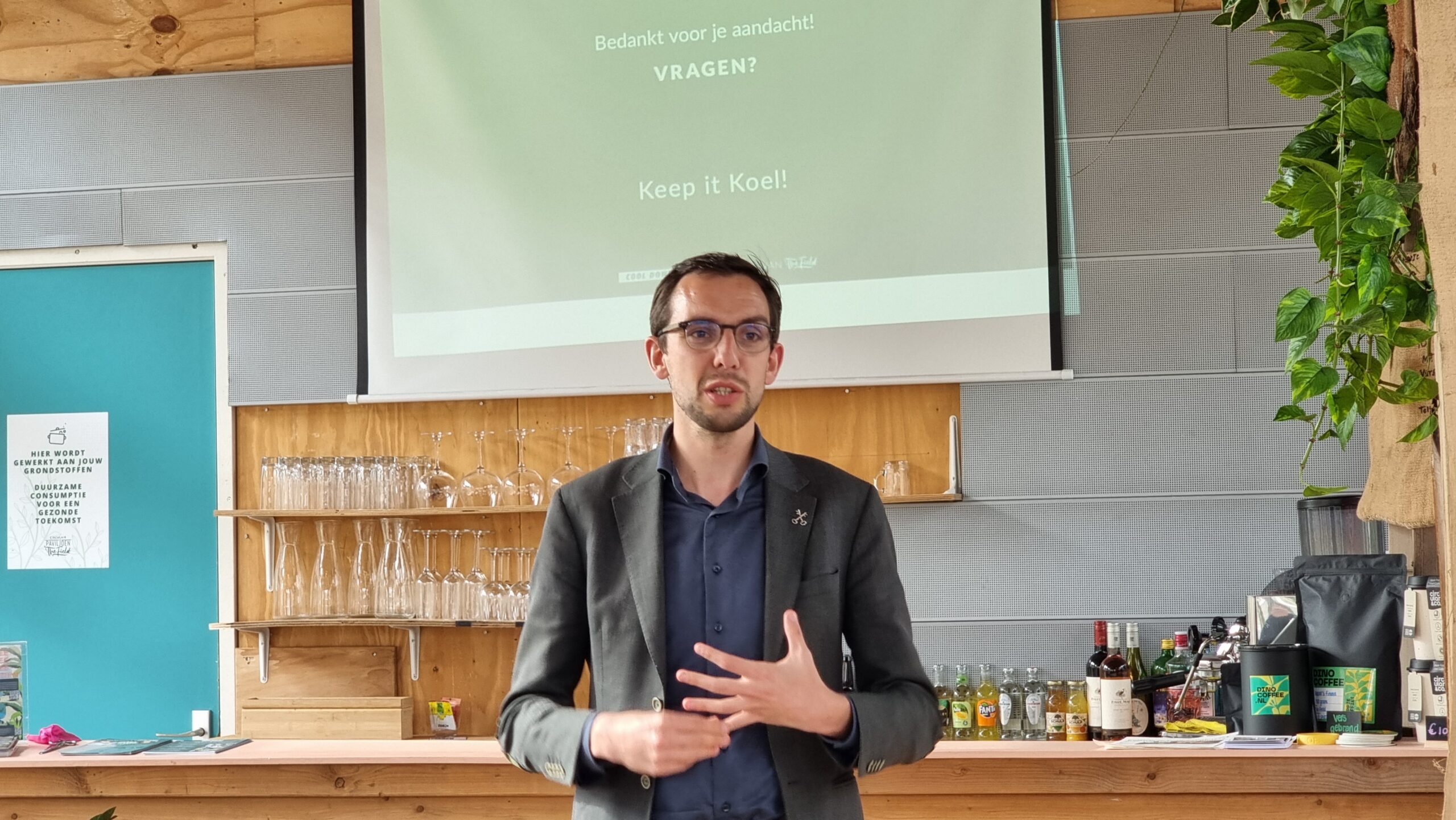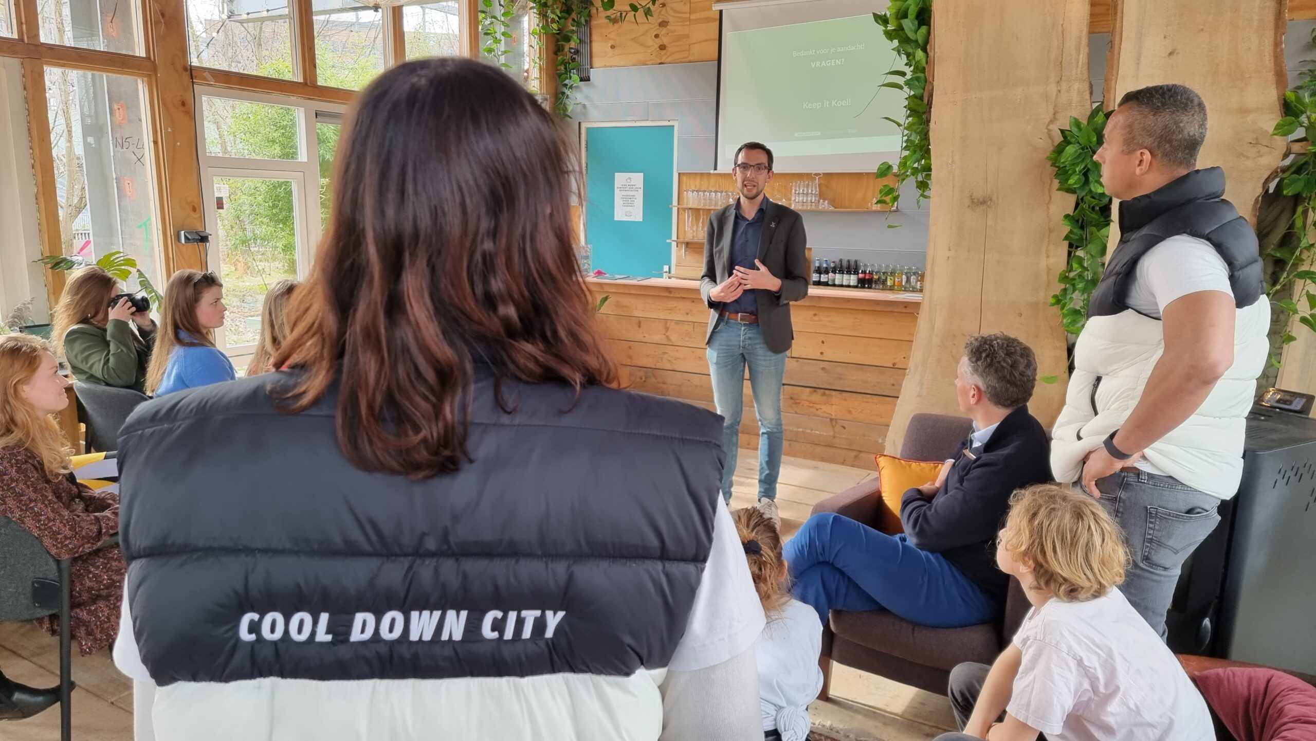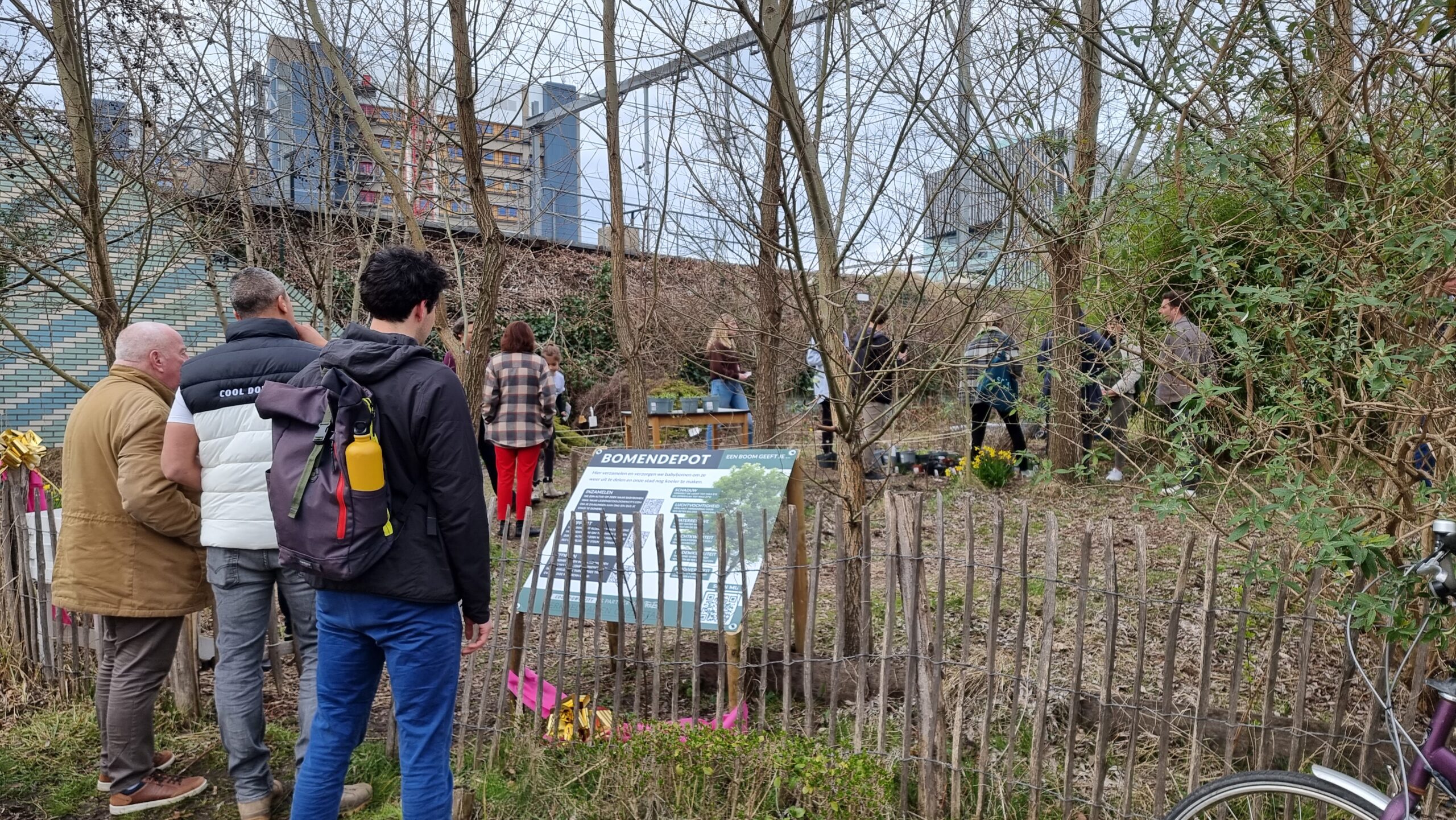 Bij circulair paviljoen The Field aan het Stationsplein in Leiden is vrijdagmiddag het bomendepot geopend van Cool Down City Leiden. Na een praatje van oprichtster Charlotte van der Heiden knipte wethouder Ashley North het een lintje door bij het bord met uitleg.