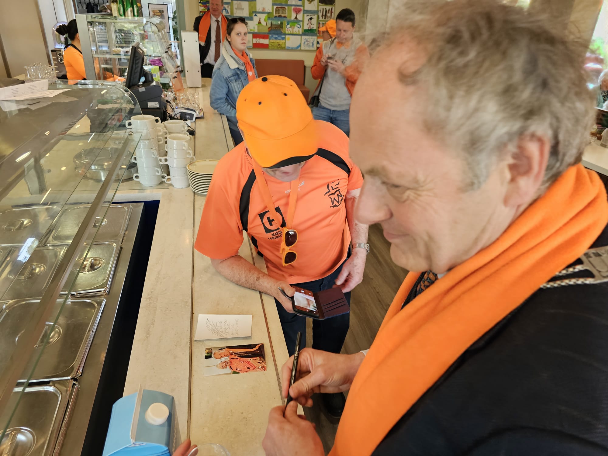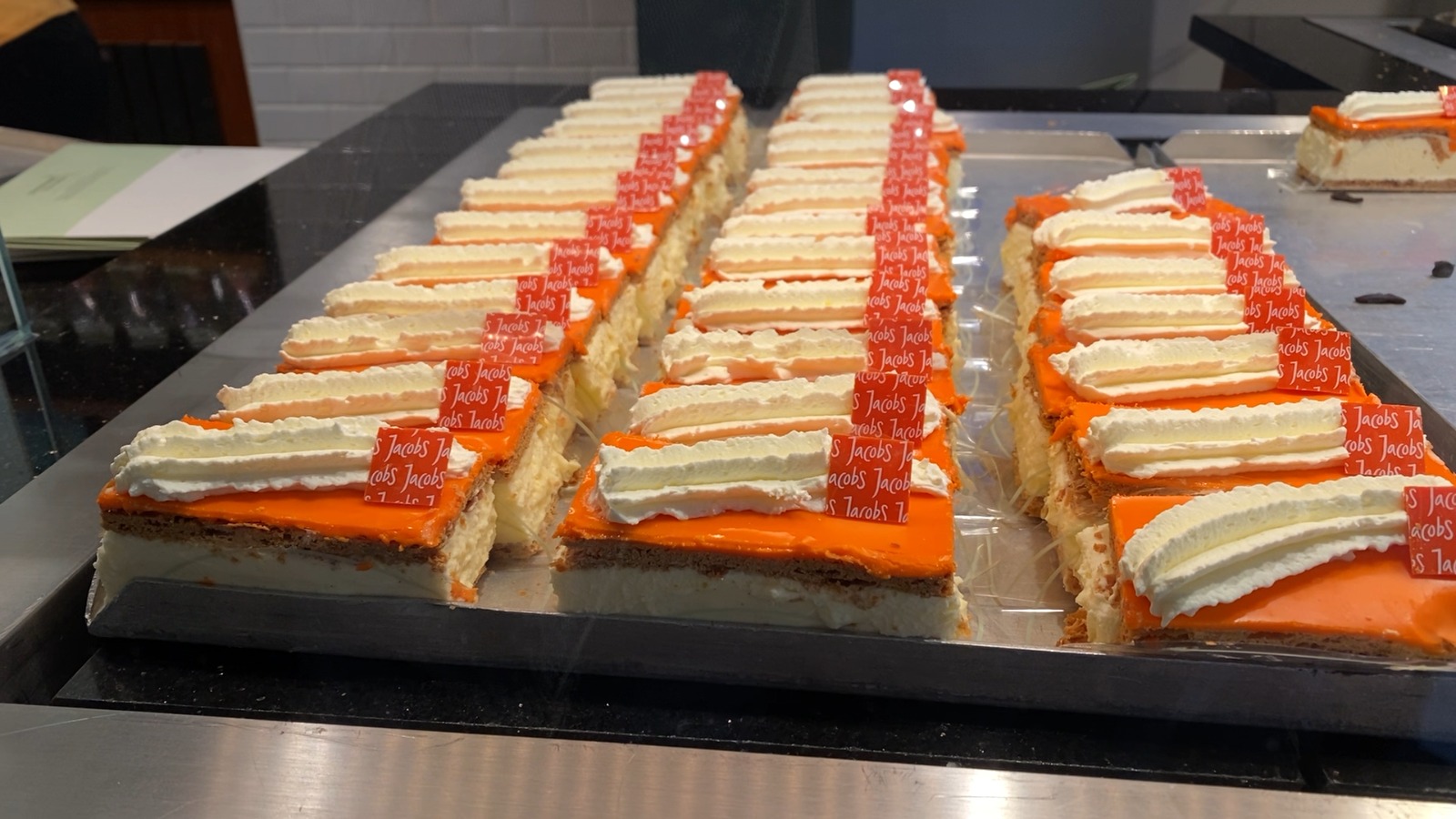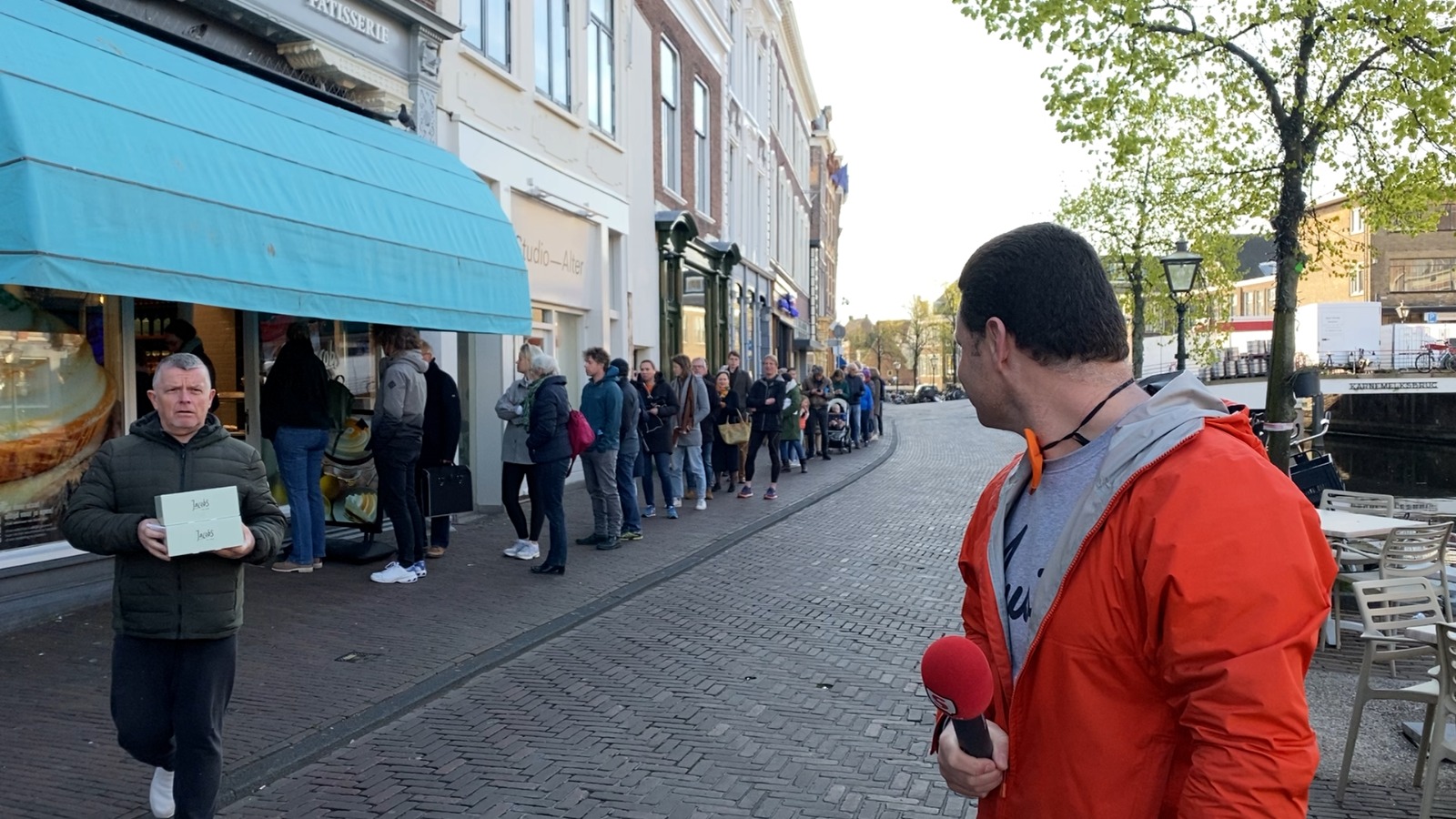 8.30 uur: Lange rijen bij Banketbakkerij Jacobs op de nieuwe Rijn voor Oranje tompoucen.