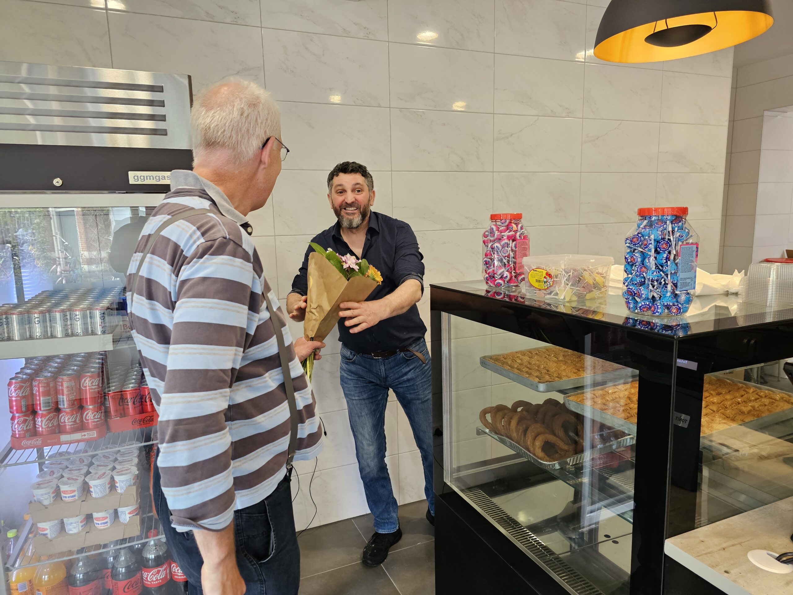 Bloemen en felicitaties van buurtbewoners vallen hem deze zaterdagmorgen ten deel. Omwonenden hebben hem en zijn broodjes gemist. De eerste klanten komen meteen om 10.00 uur al binnen. Voor een broodje, maar vooral ook voor een praatje met ‘Mo’ die nog druk bezig in om de laatste dingen in orde te maken. “We zijn vannacht ook weer tot 2.30 uur bezig geweest, maar het is gelukt.”