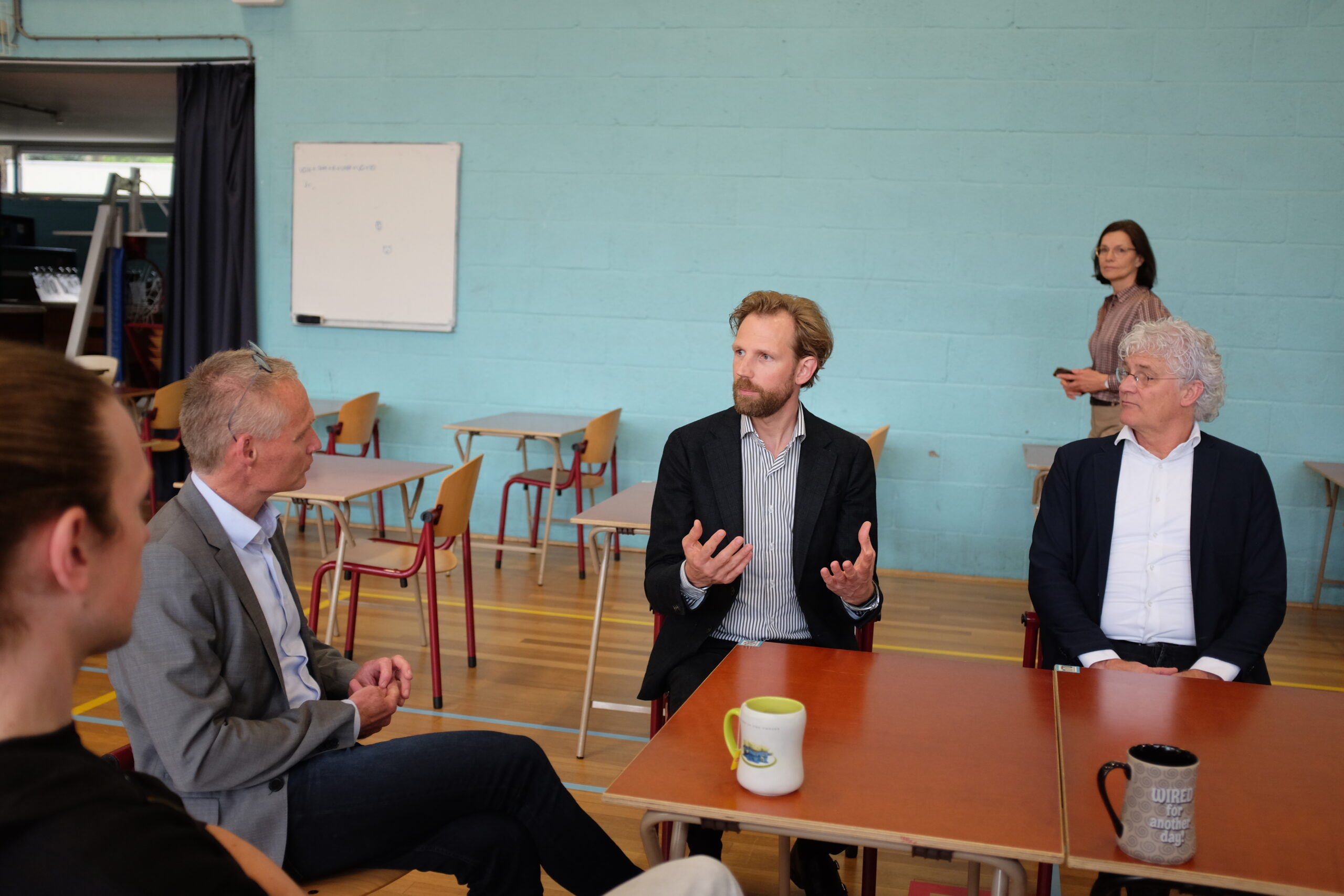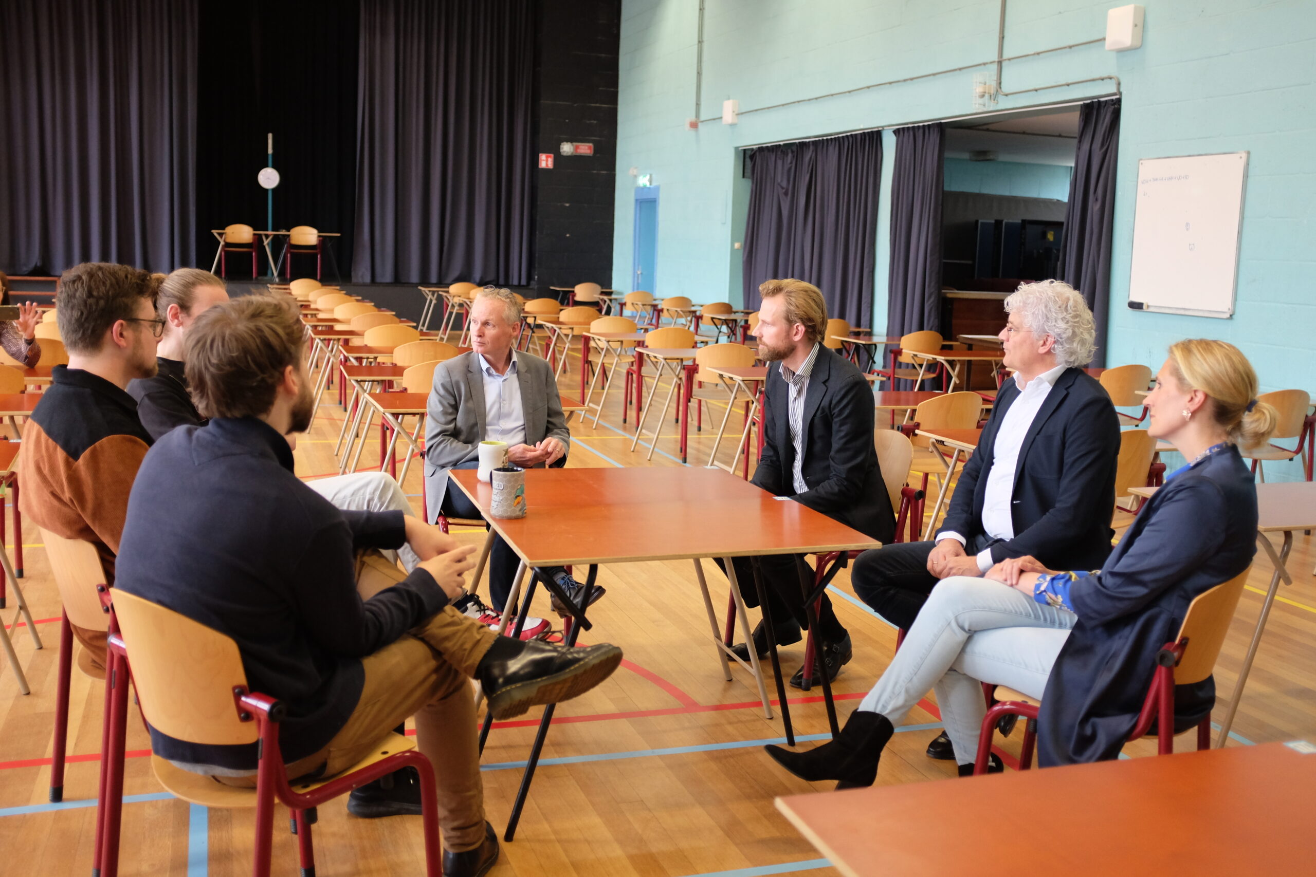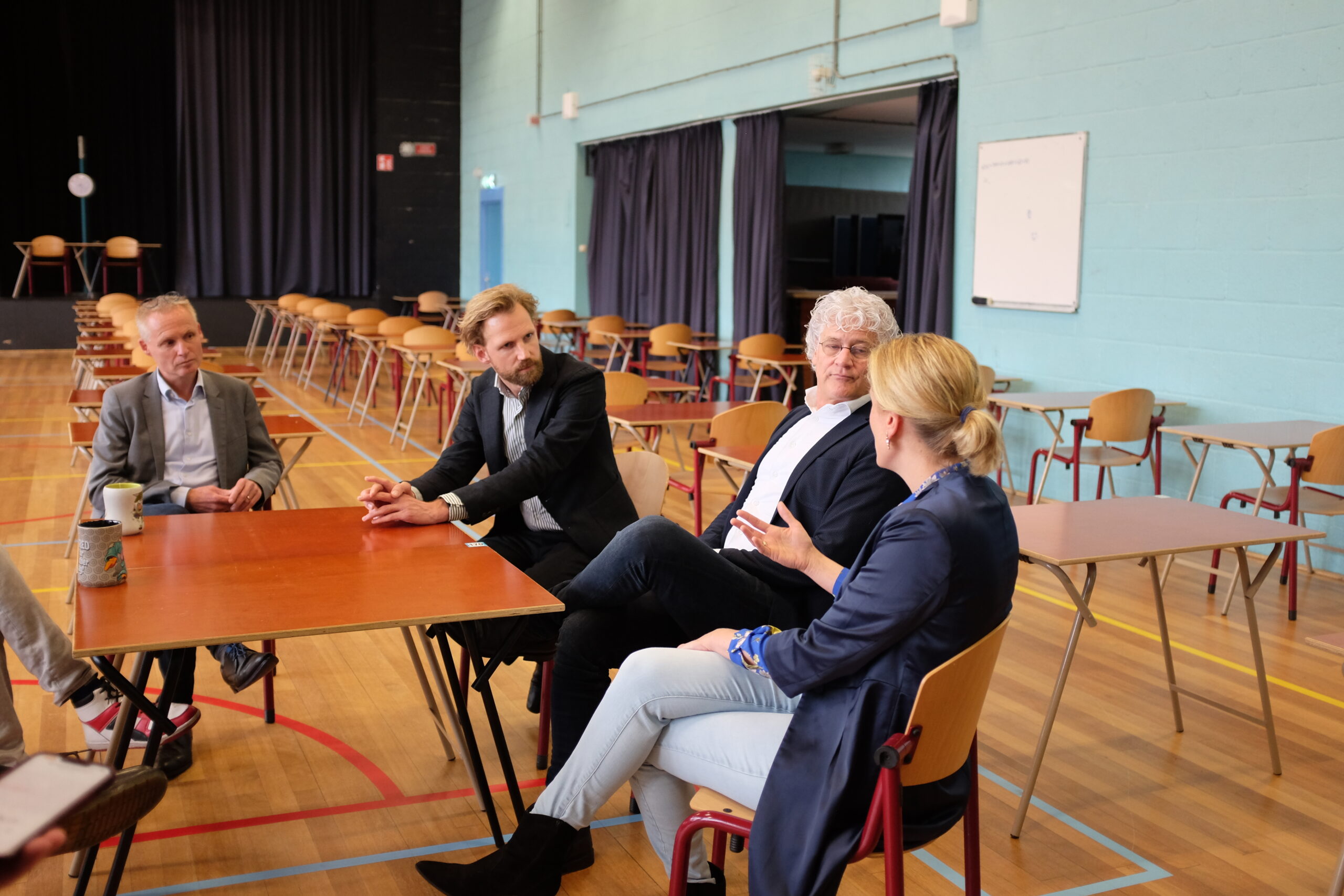 Het gesprek vond plaats in de gymzaal waar de examens een kwartier later zouden beginnen. De minister had het met de docenten over hoe ze de voorbereidingen hebben ervaren en waar ze zich zorgen over maken.