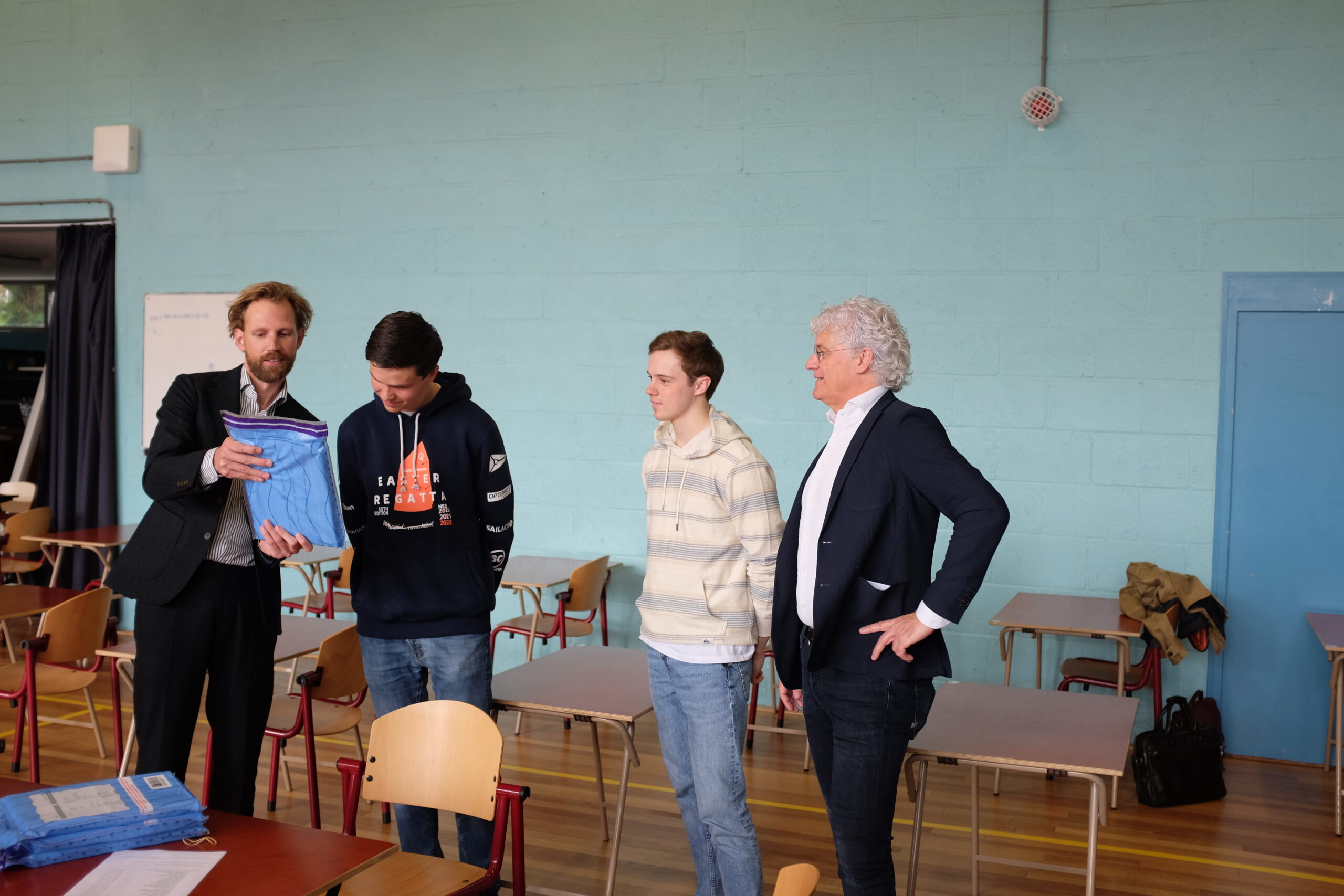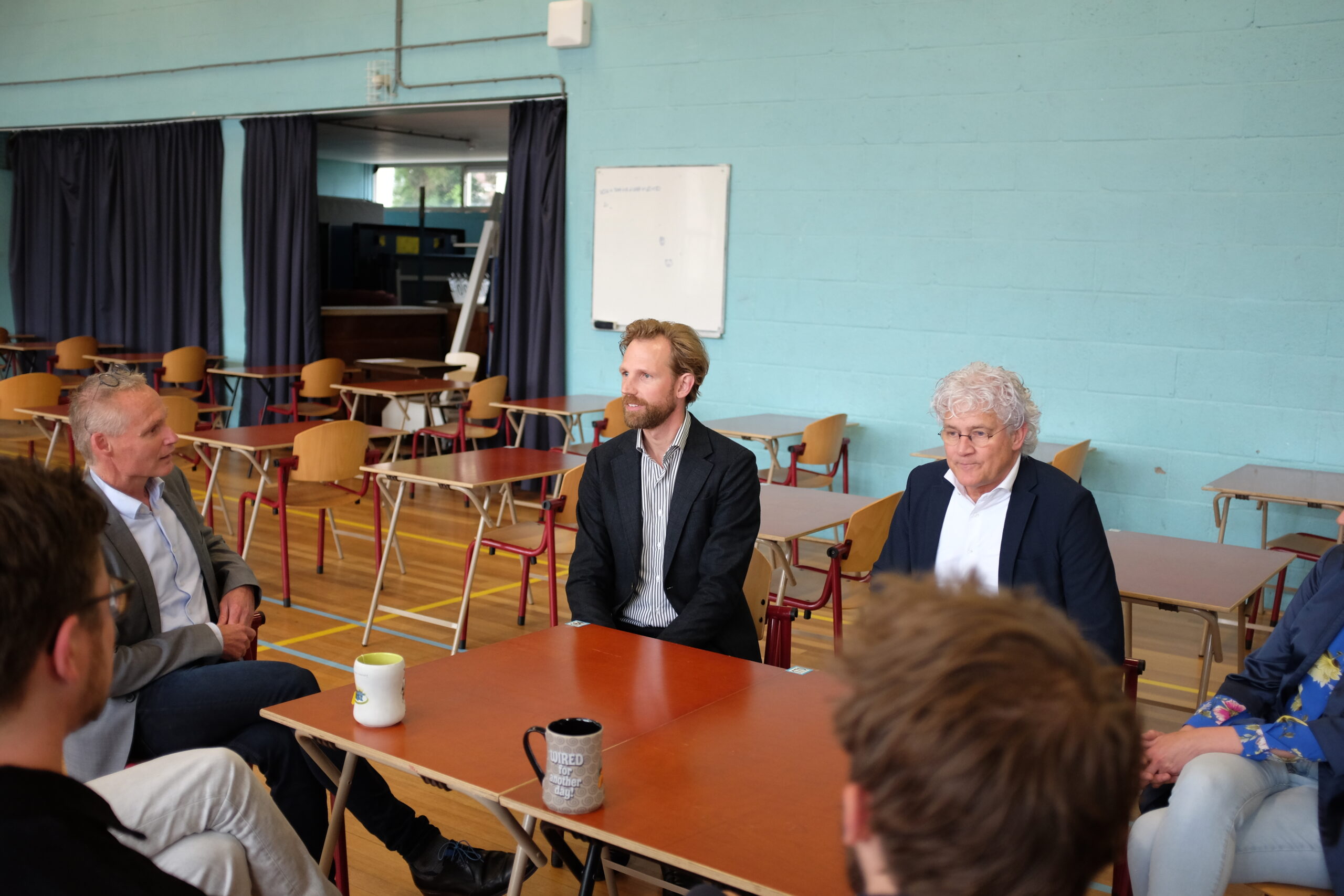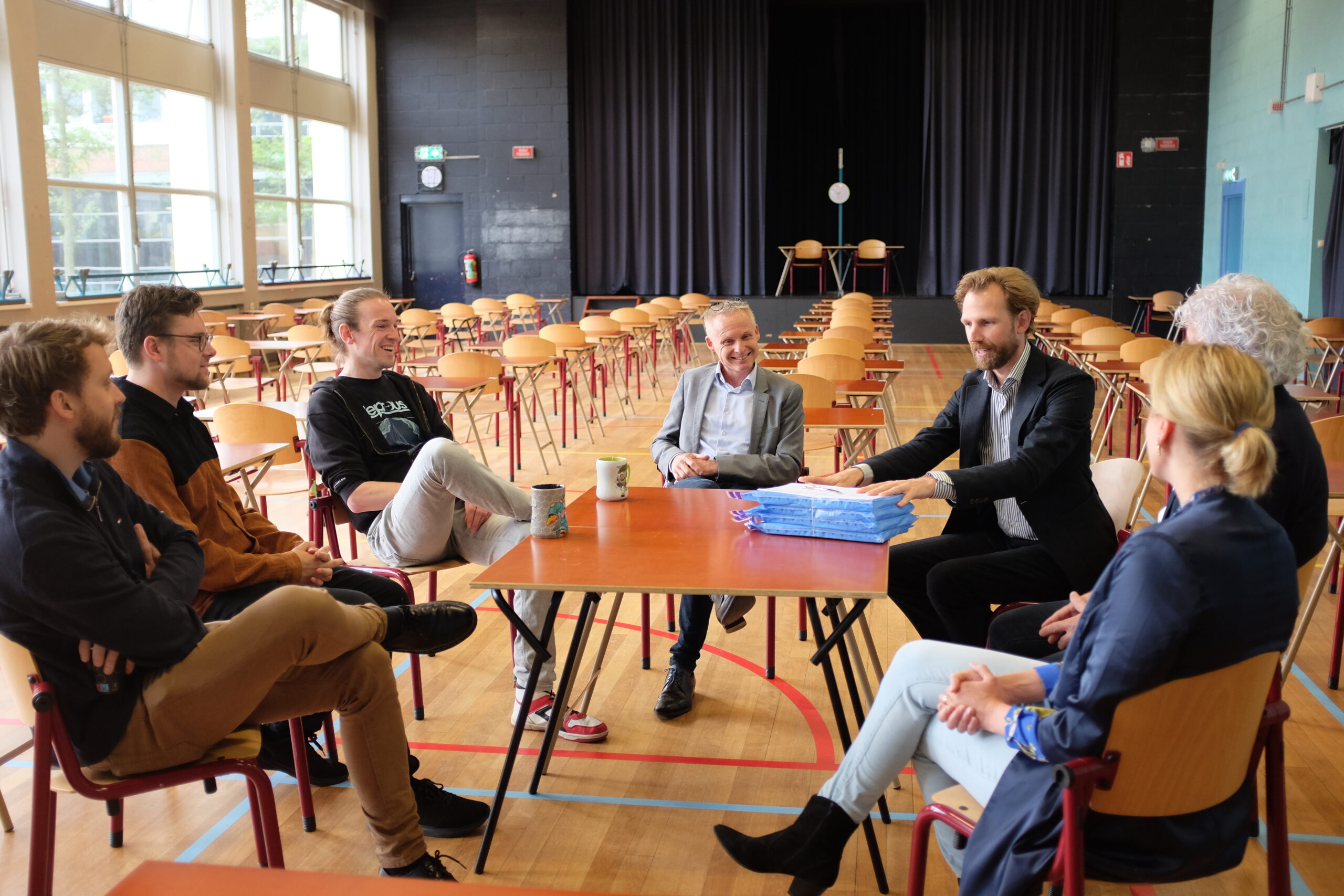 Het gesprek vond plaats in de gymzaal waar de examens een kwartier later zouden beginnen. De minister had het met de docenten over hoe ze de voorbereidingen hebben ervaren en waar ze zich zorgen over maken.