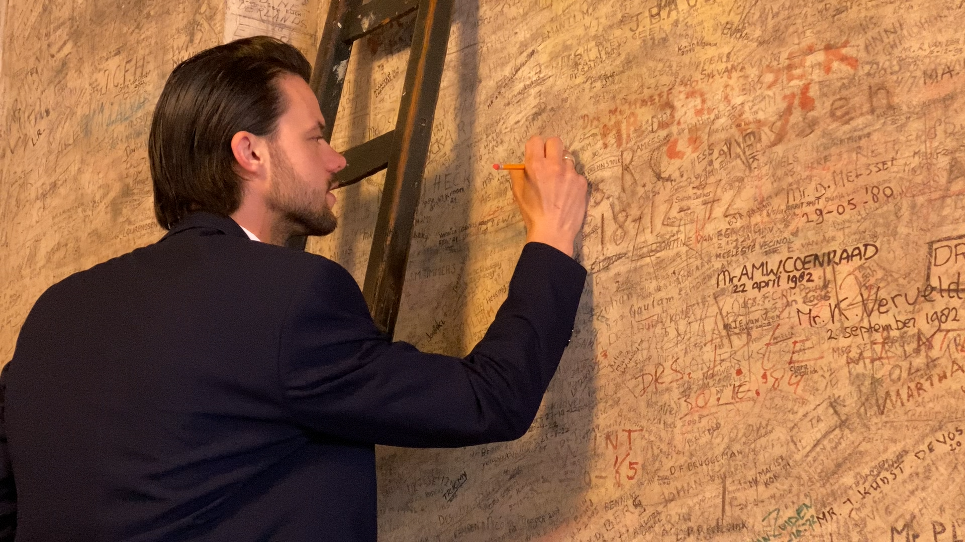 Studenten die in coronatijd, zonder ceremonie, afstudeerden krijgen de komende weken de kans om toch nog mee te doen aan een beroemde Leidse traditie. Om te vieren dat ze hun ‘bul’ hebben gehaald, mogen enkele honderden alumni alsnog hun handtekening op de muur van het Zweetkamertje in het Academiegebouw van de Universiteit Leiden zetten.