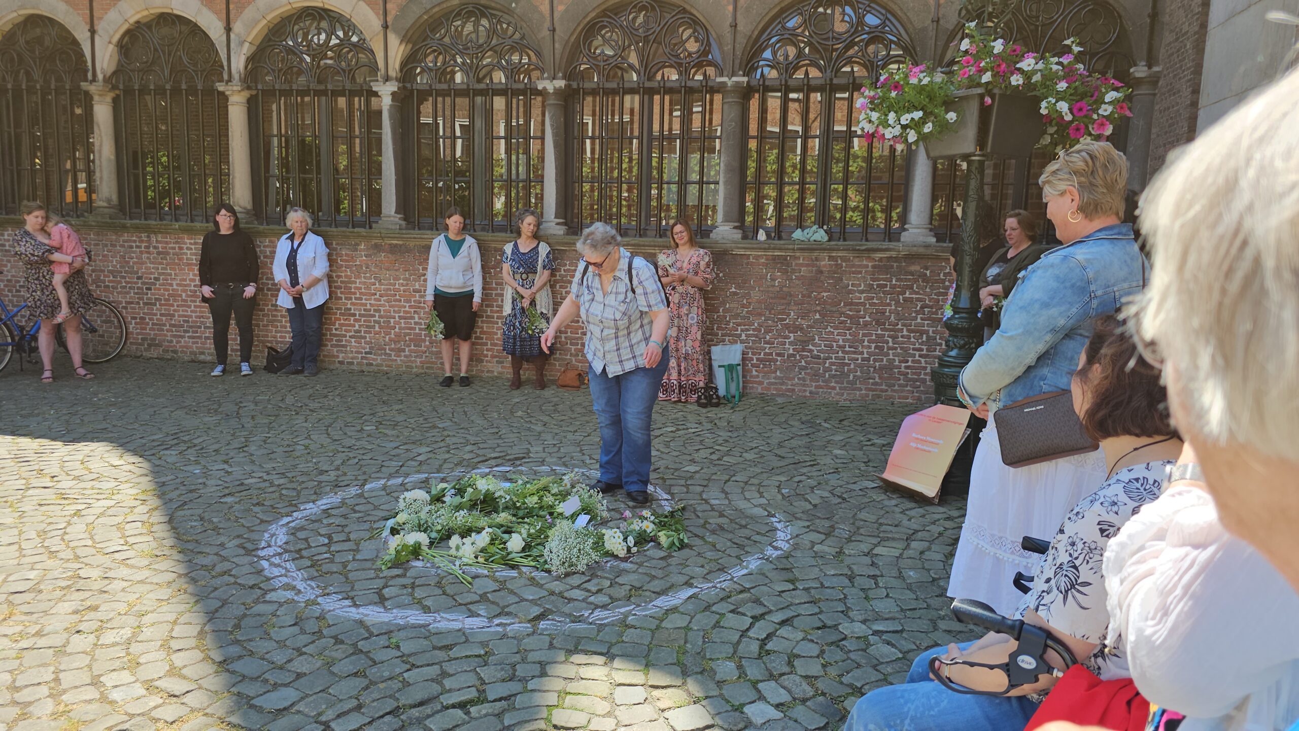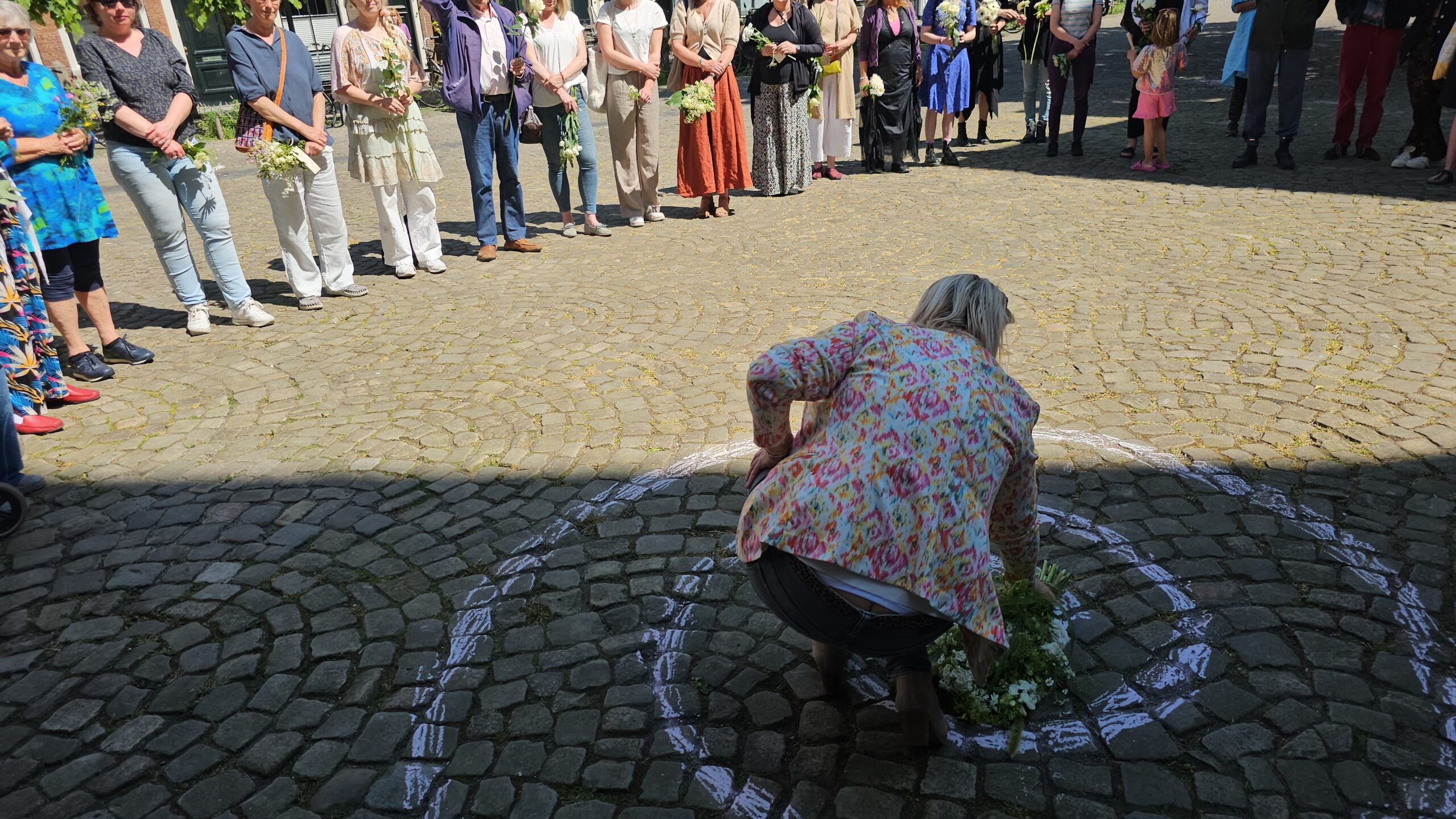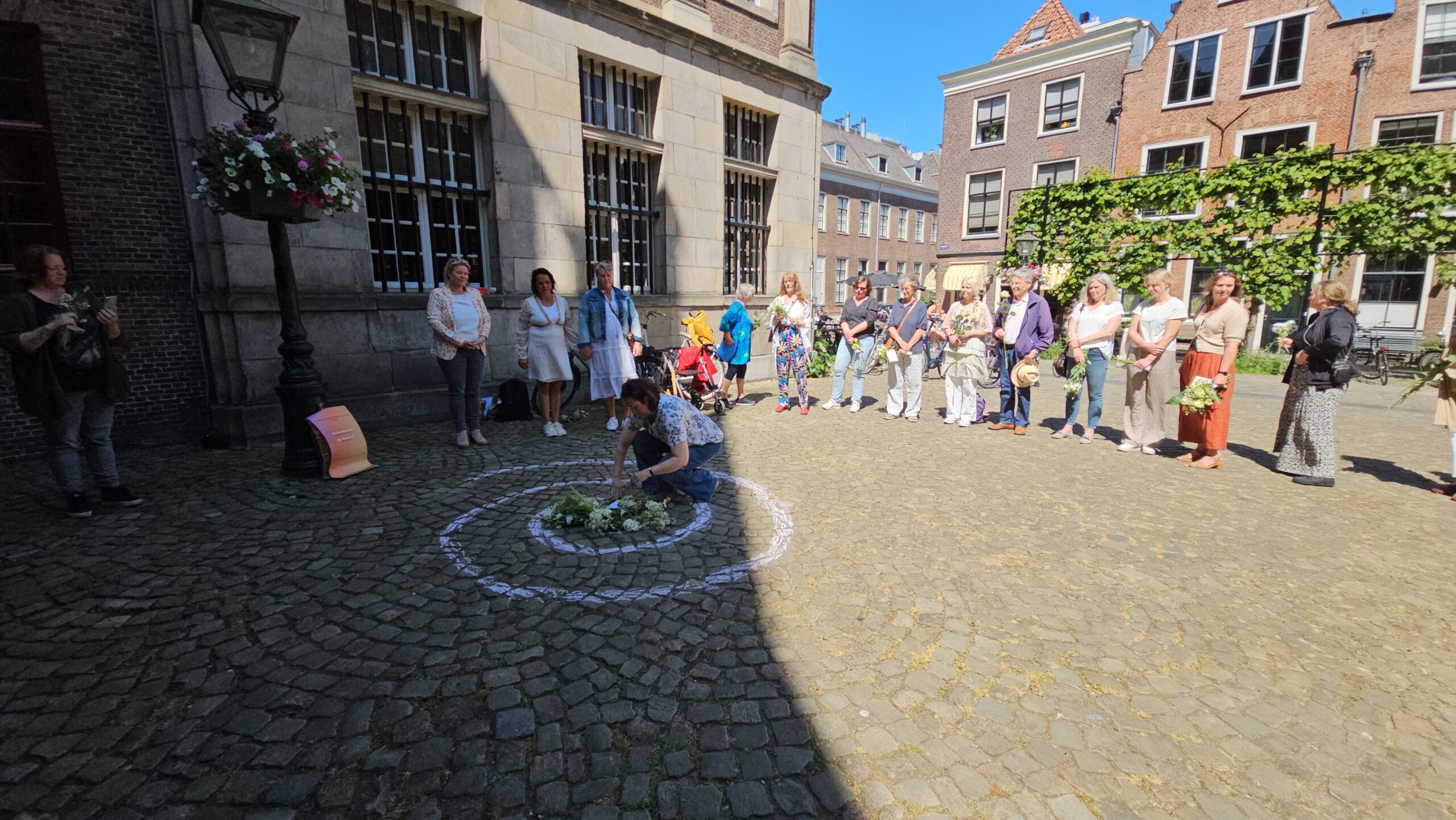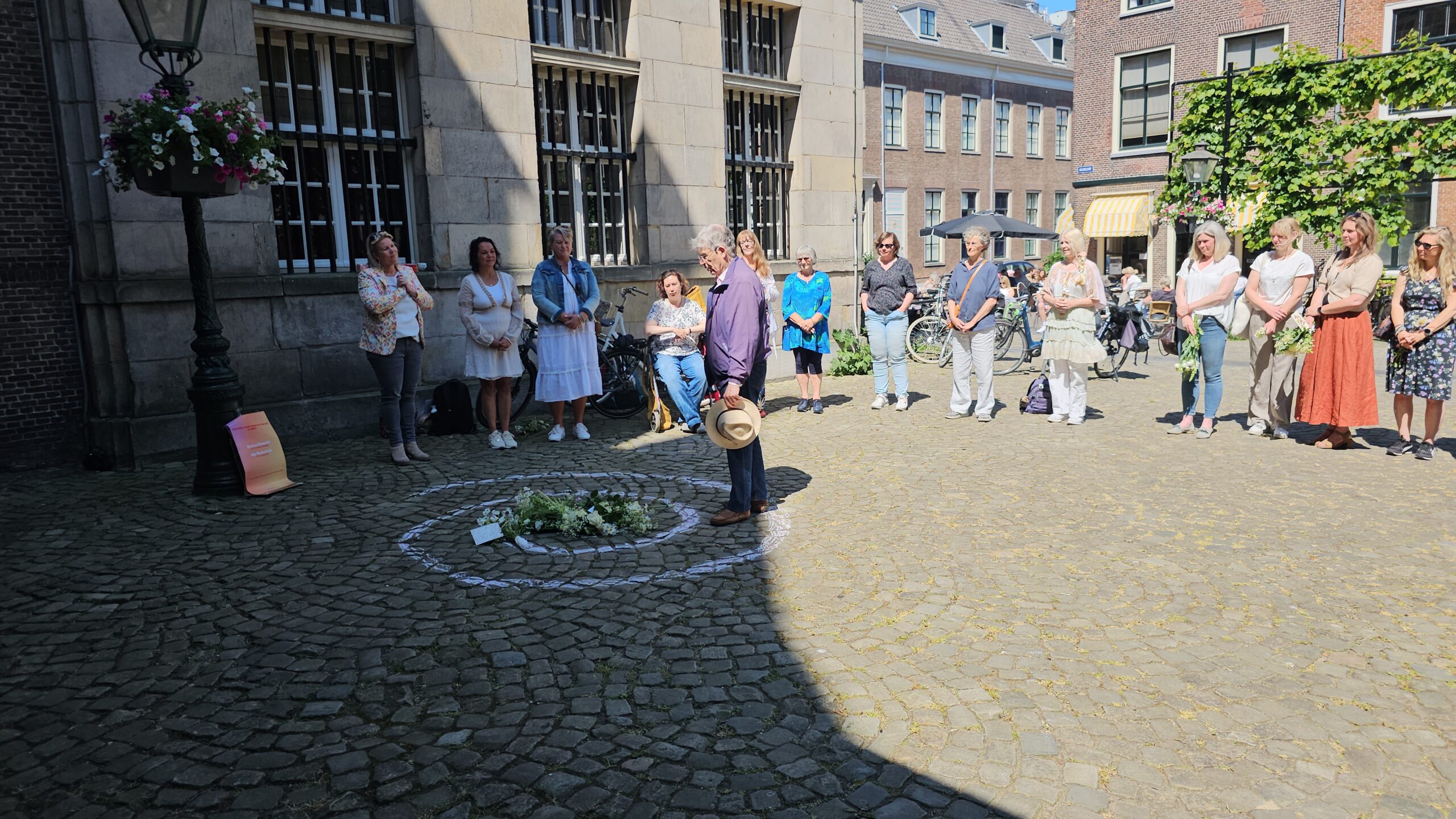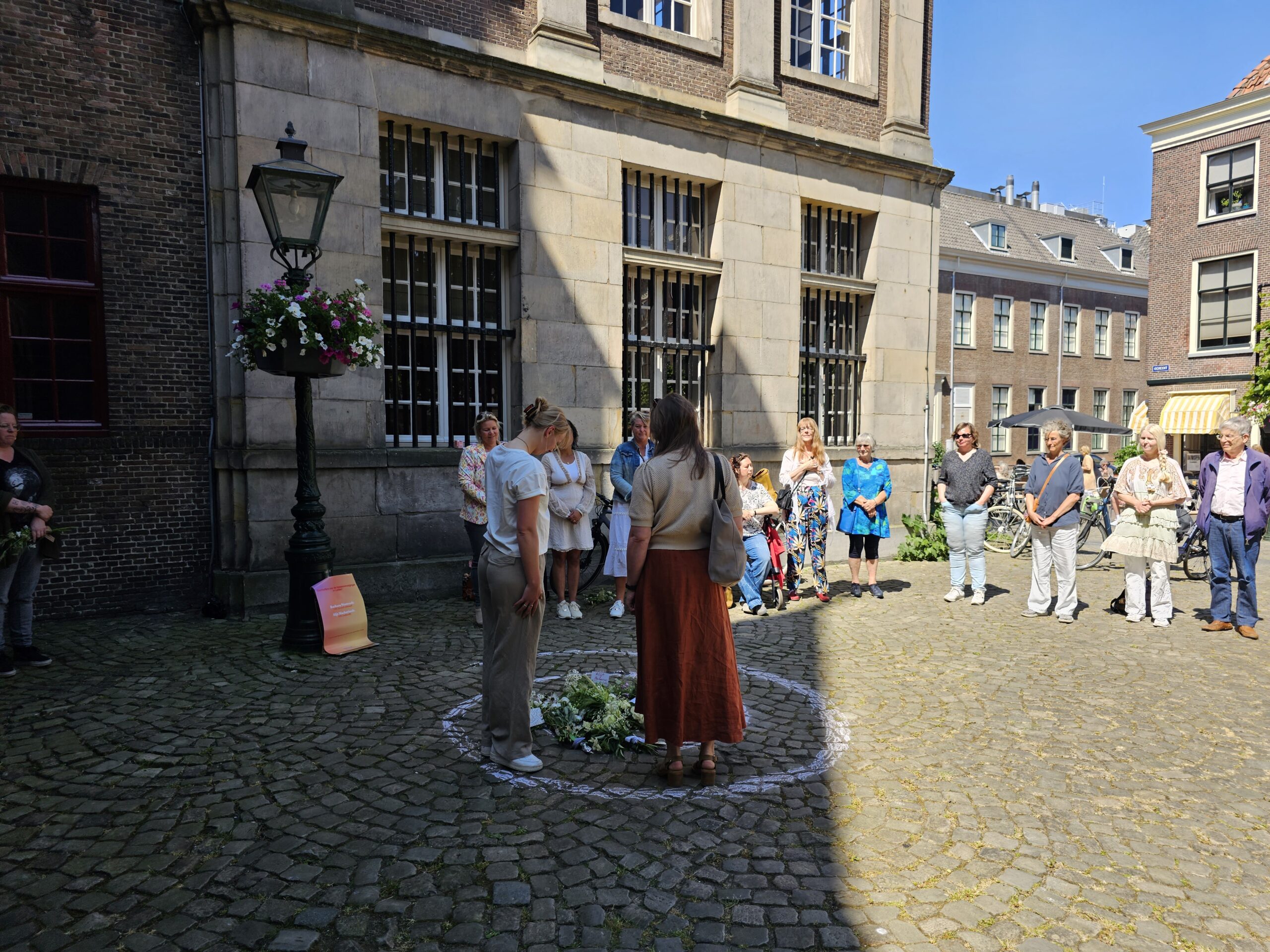 Ook in Leiden vond, voor het eerst, zo’n herdenking plaats. Daar bleek veel behoefte aan. Tientallen vrouwen en een enkele man waren naar het Gerecht gekomen waar de Leidse kunstenaar Roos Tulen met stoepkrijt een heksencirkel had getekend. In die kring werden door de aanwezigen witte bloemen gelegd.