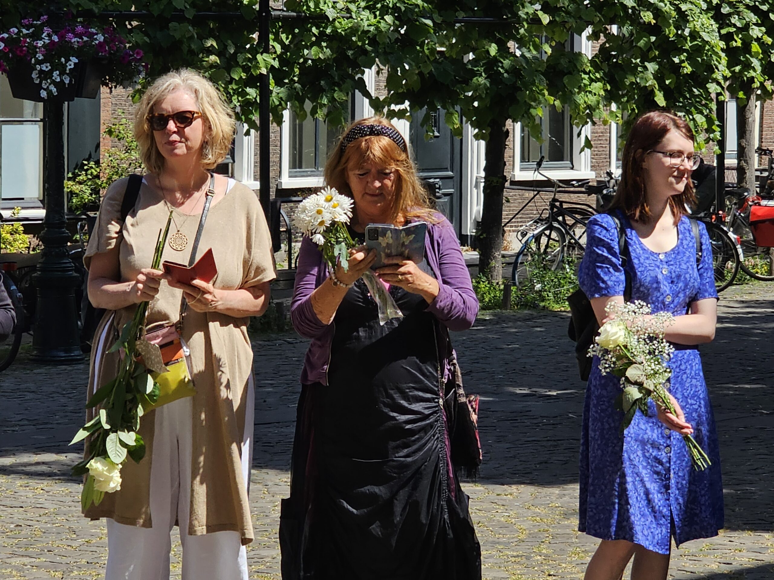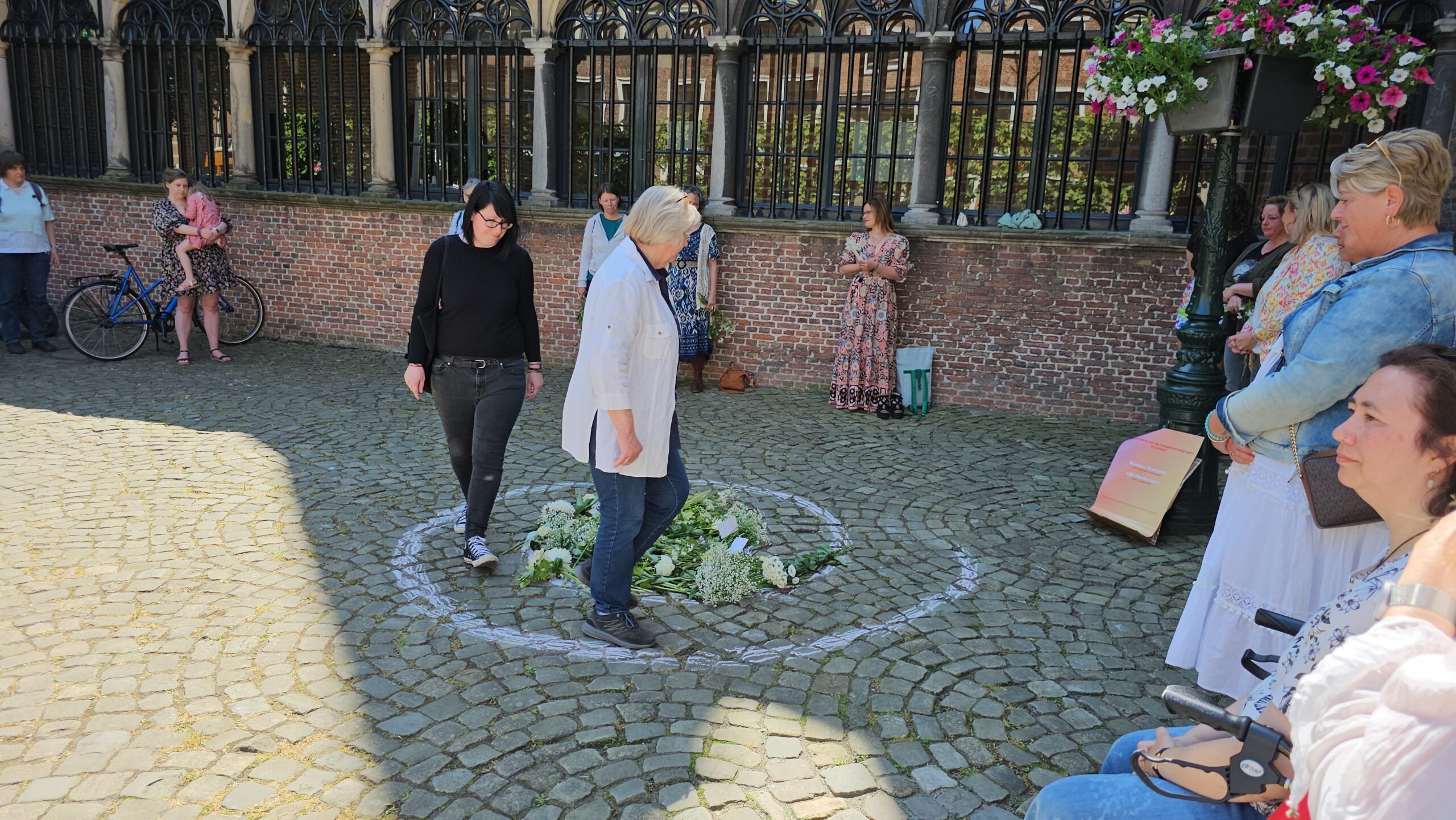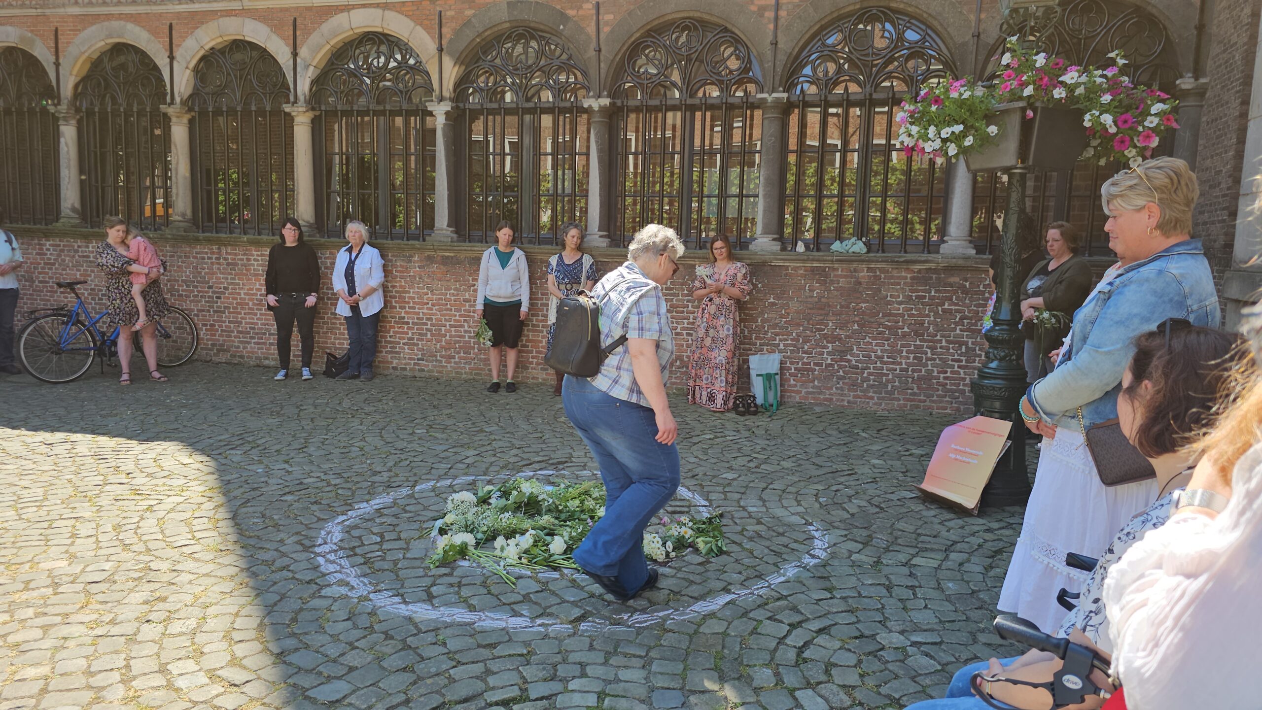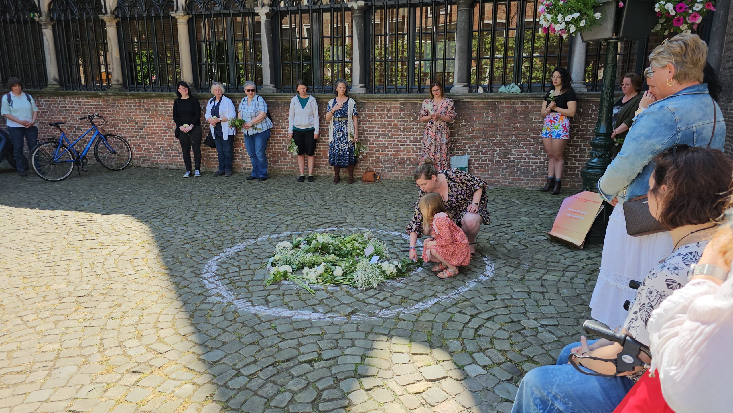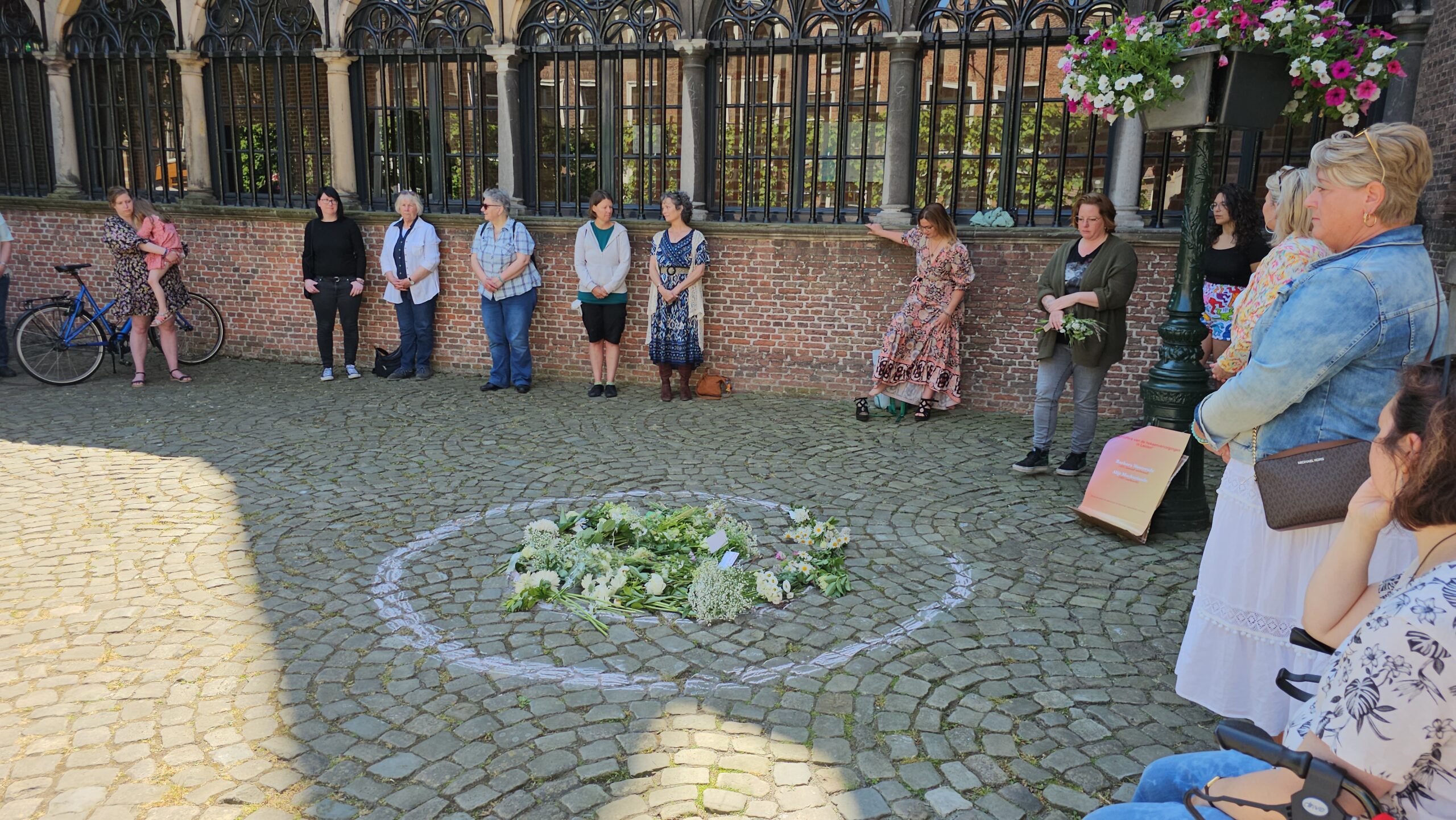 Ook in Leiden vond, voor het eerst, zo’n herdenking plaats. Daar bleek veel behoefte aan. Tientallen vrouwen en een enkele man waren naar het Gerecht gekomen waar de Leidse kunstenaar Roos Tulen met stoepkrijt een heksencirkel had getekend. In die kring werden door de aanwezigen witte bloemen gelegd.