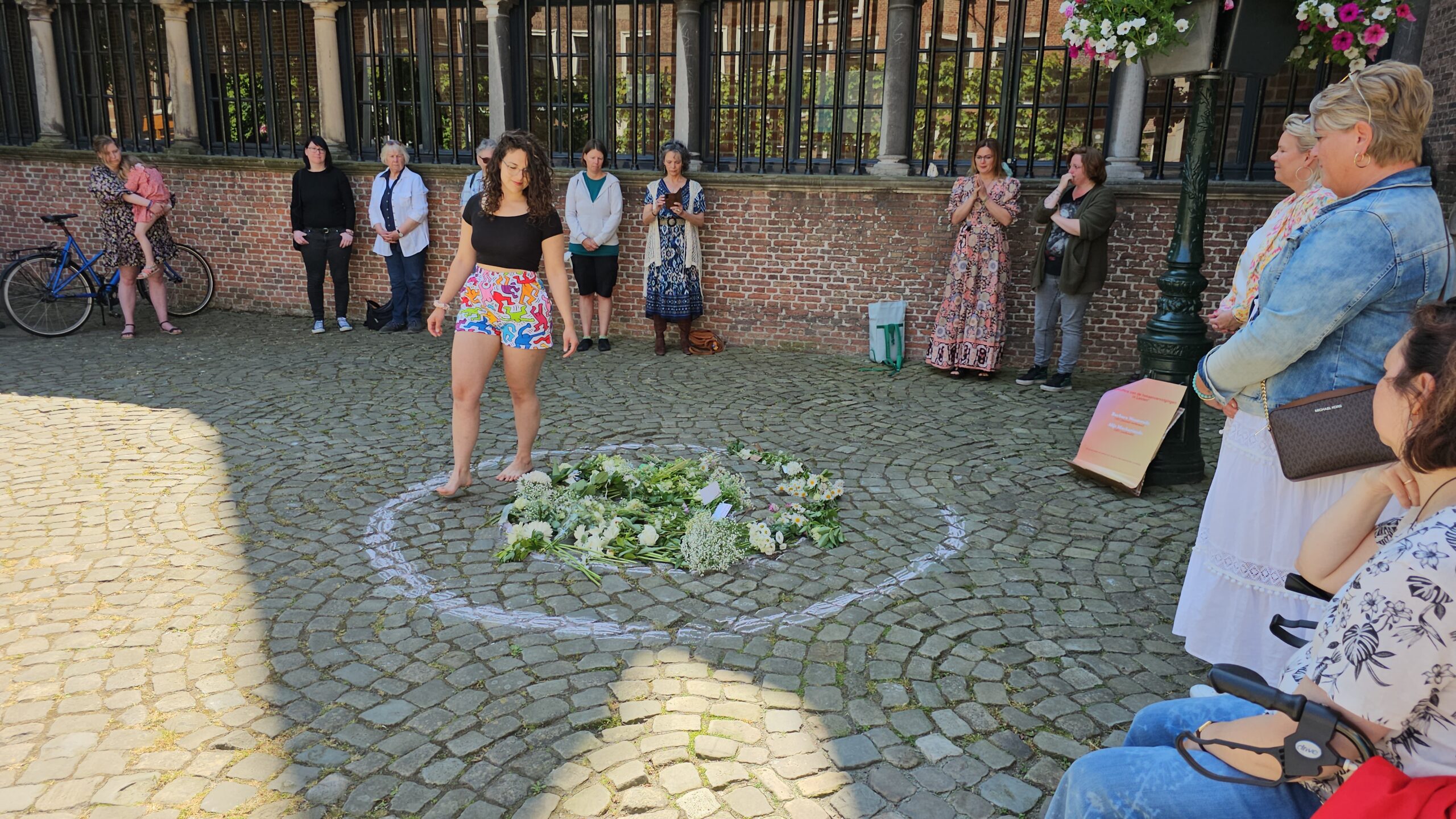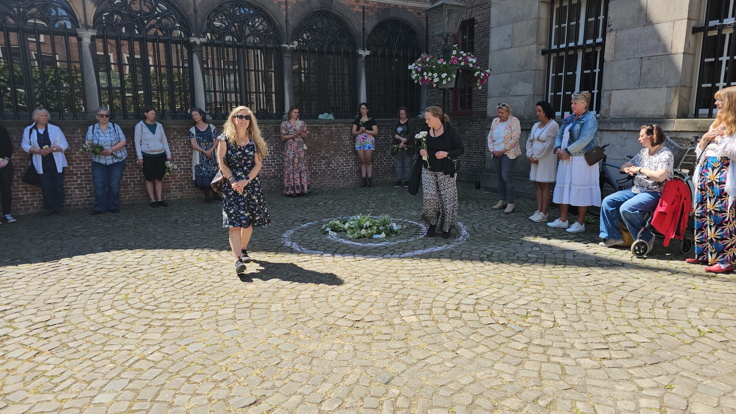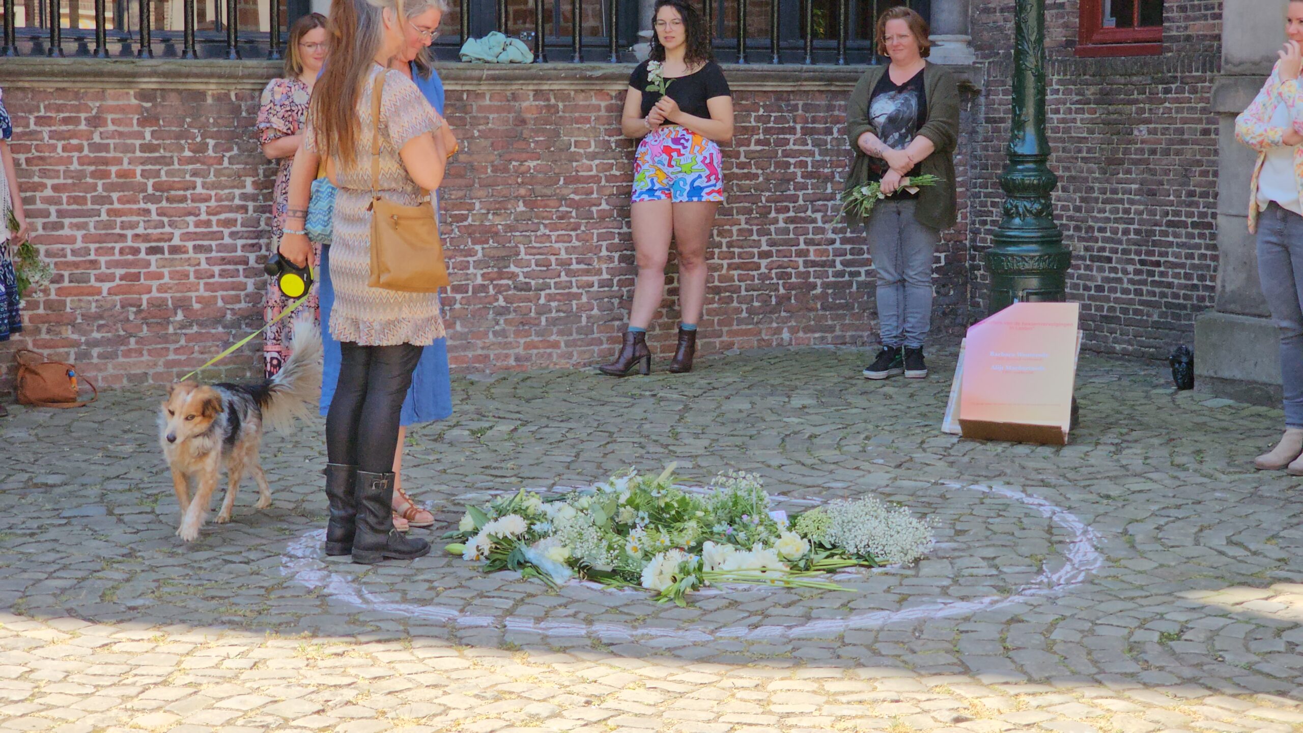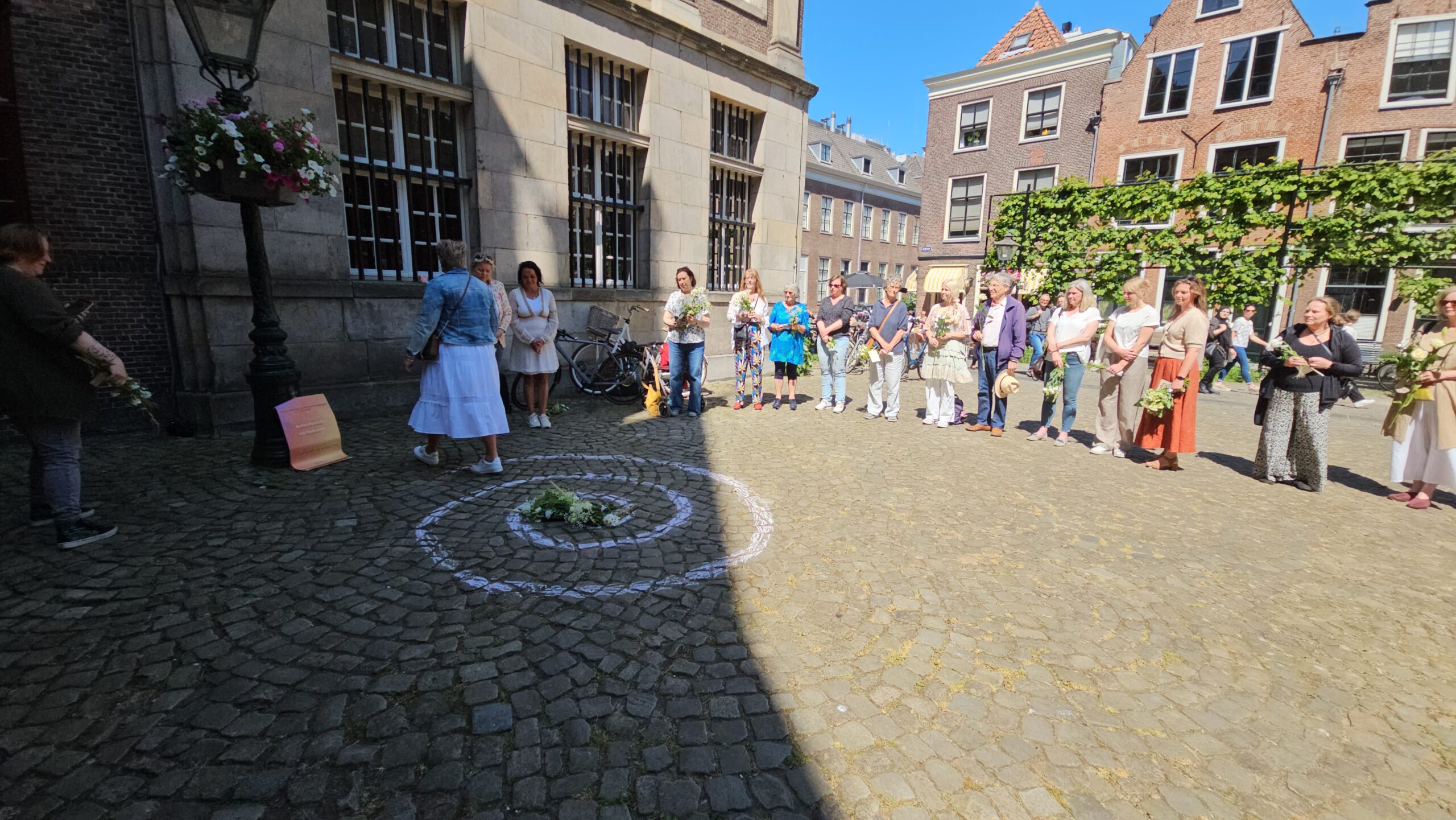 Ook in Leiden vond, voor het eerst, zo’n herdenking plaats. Daar bleek veel behoefte aan. Tientallen vrouwen en een enkele man waren naar het Gerecht gekomen waar de Leidse kunstenaar Roos Tulen met stoepkrijt een heksencirkel had getekend. In die kring werden door de aanwezigen witte bloemen gelegd.