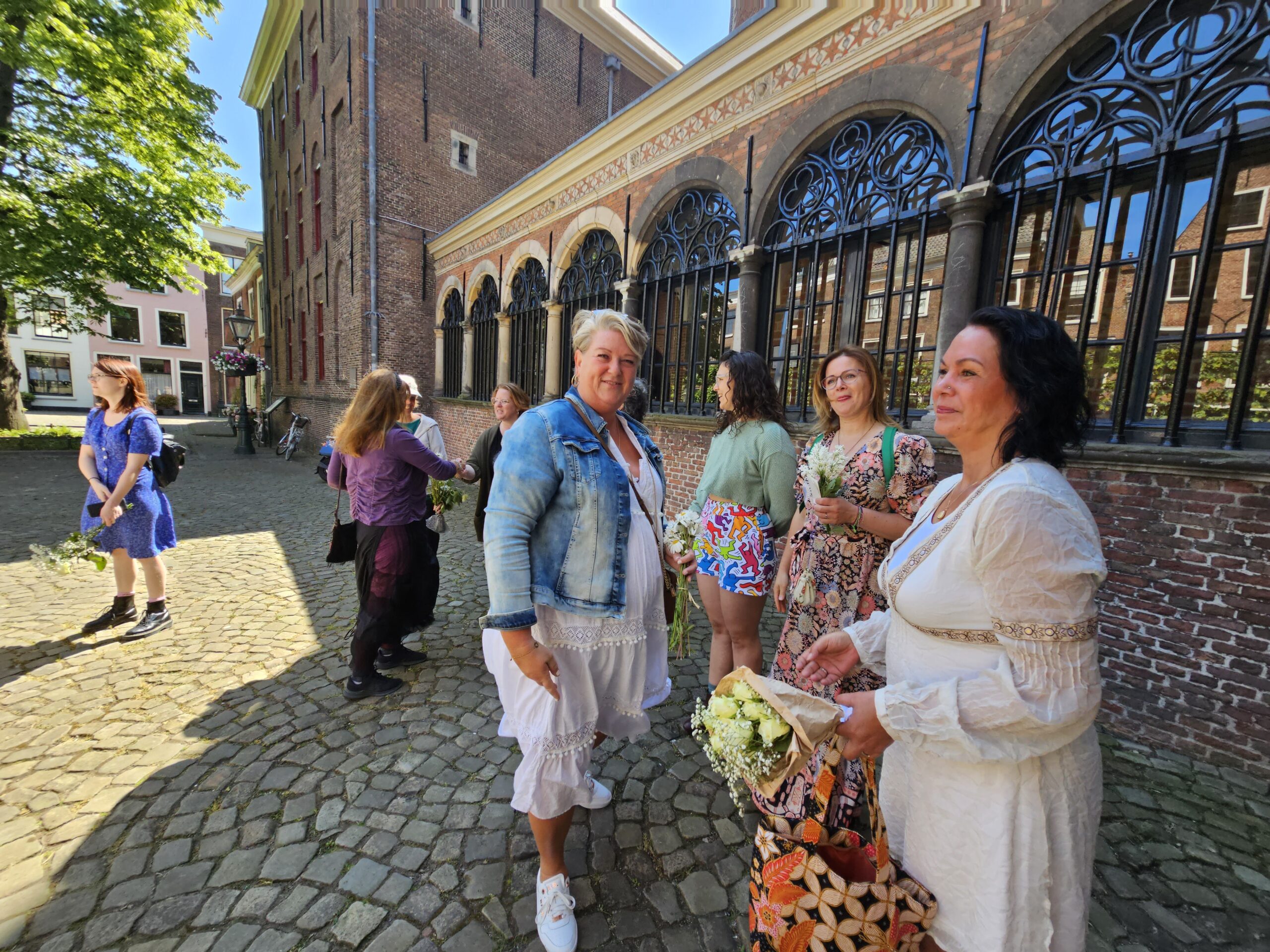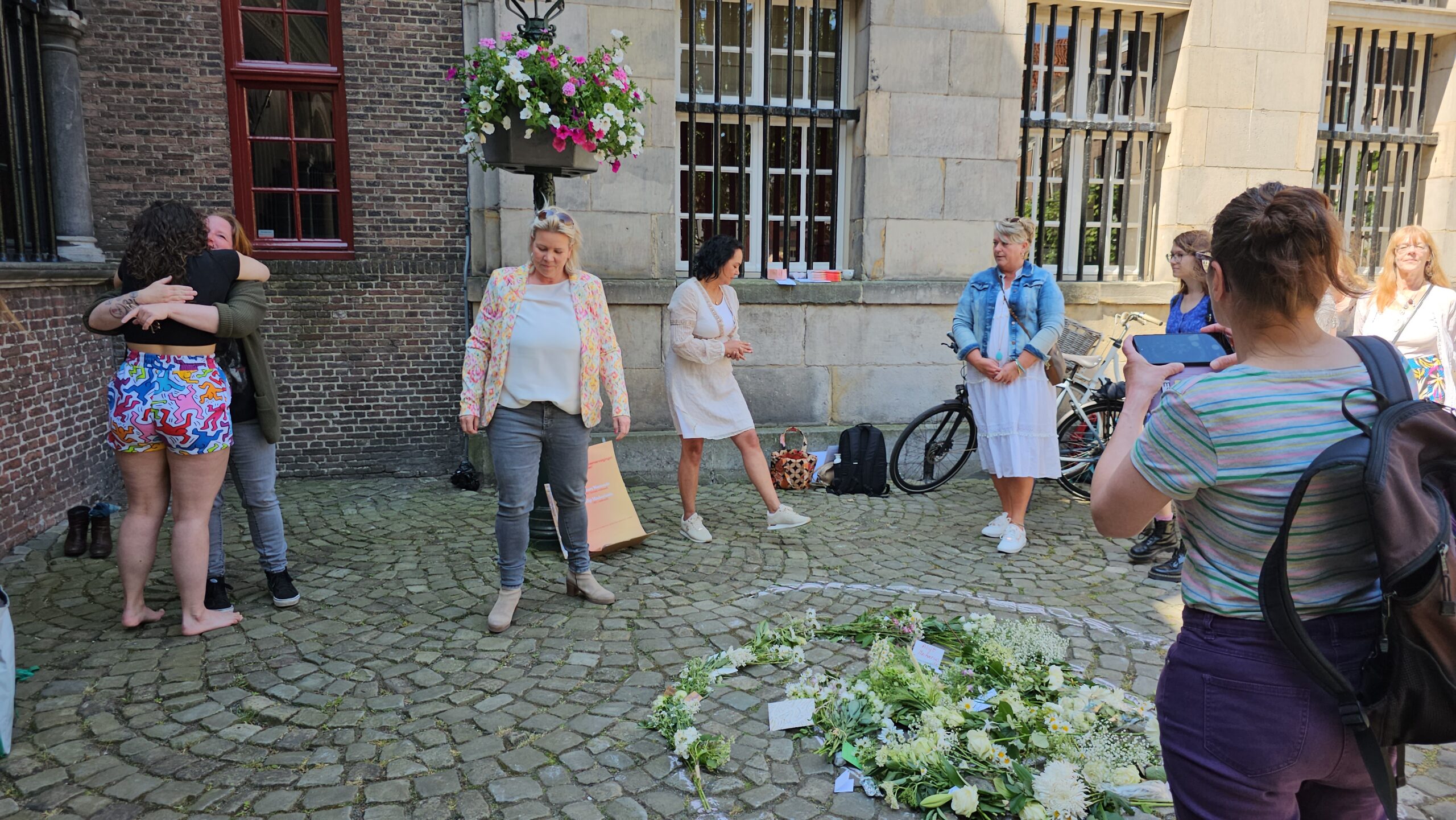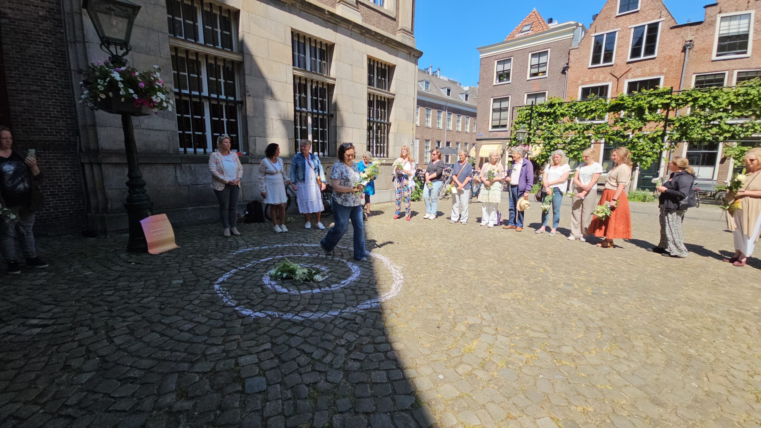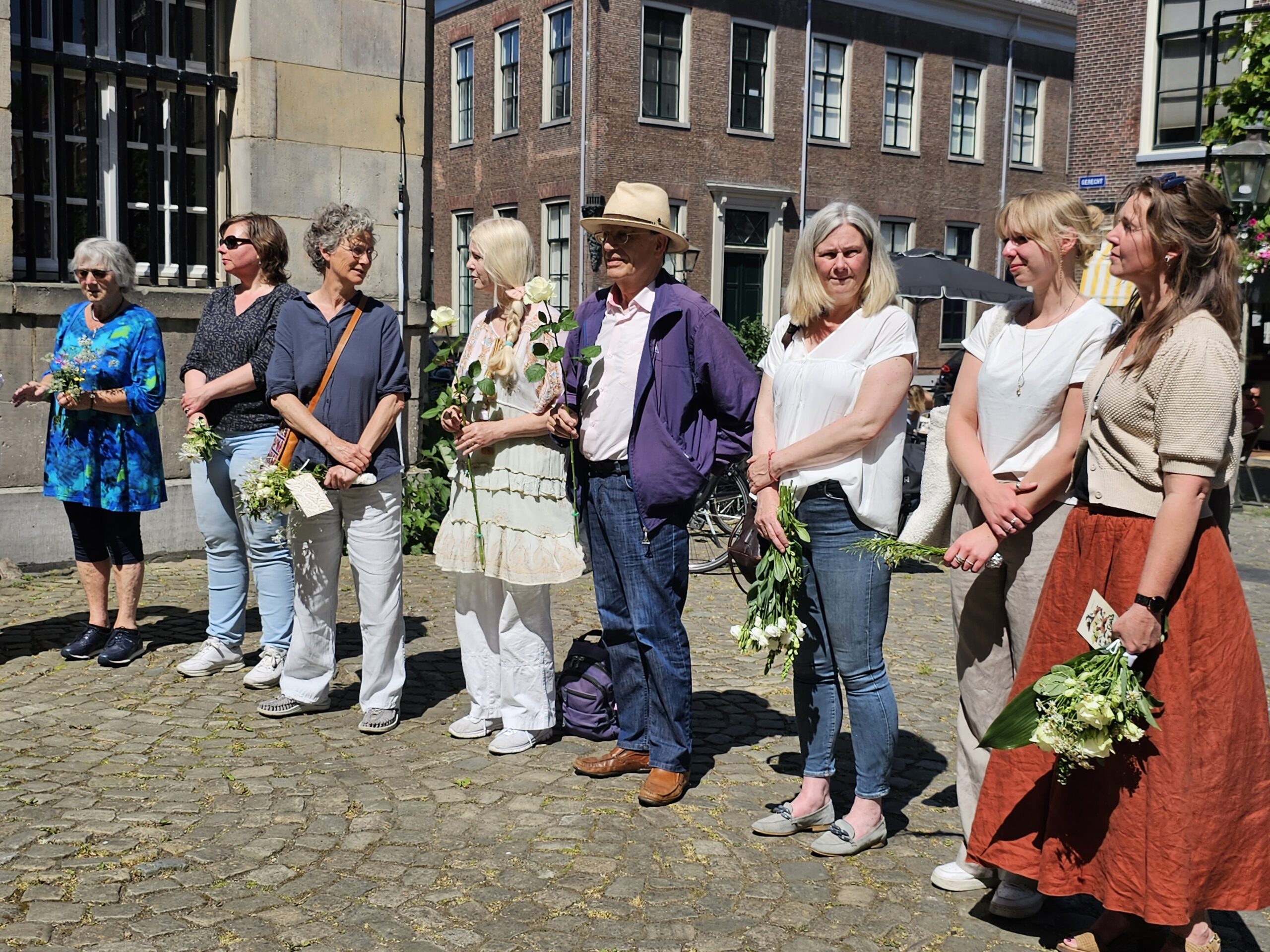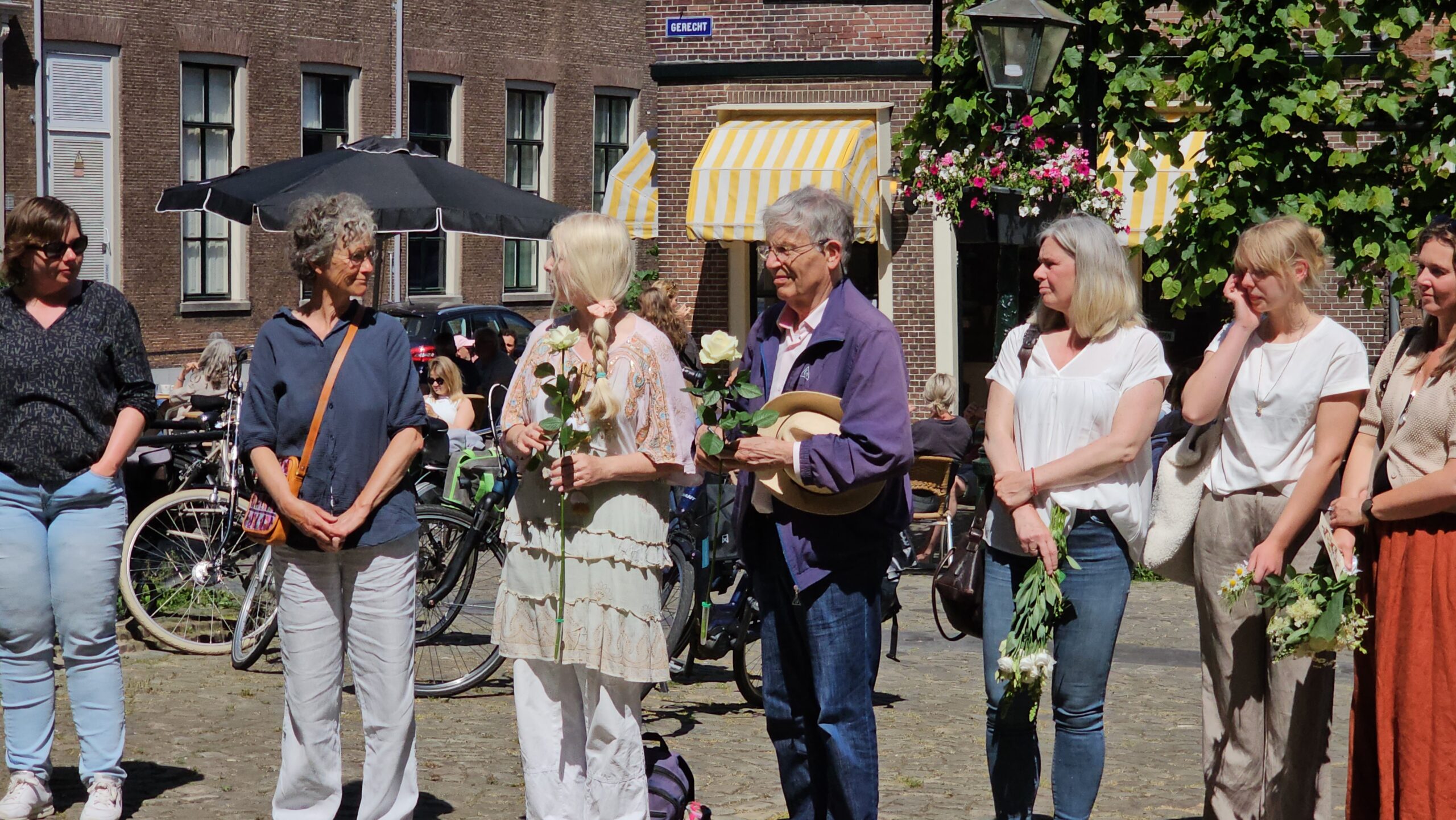 Ook in Leiden vond, voor het eerst, zo’n herdenking plaats. Daar bleek veel behoefte aan. Tientallen vrouwen en een enkele man waren naar het Gerecht gekomen waar de Leidse kunstenaar Roos Tulen met stoepkrijt een heksencirkel had getekend. In die kring werden door de aanwezigen witte bloemen gelegd.