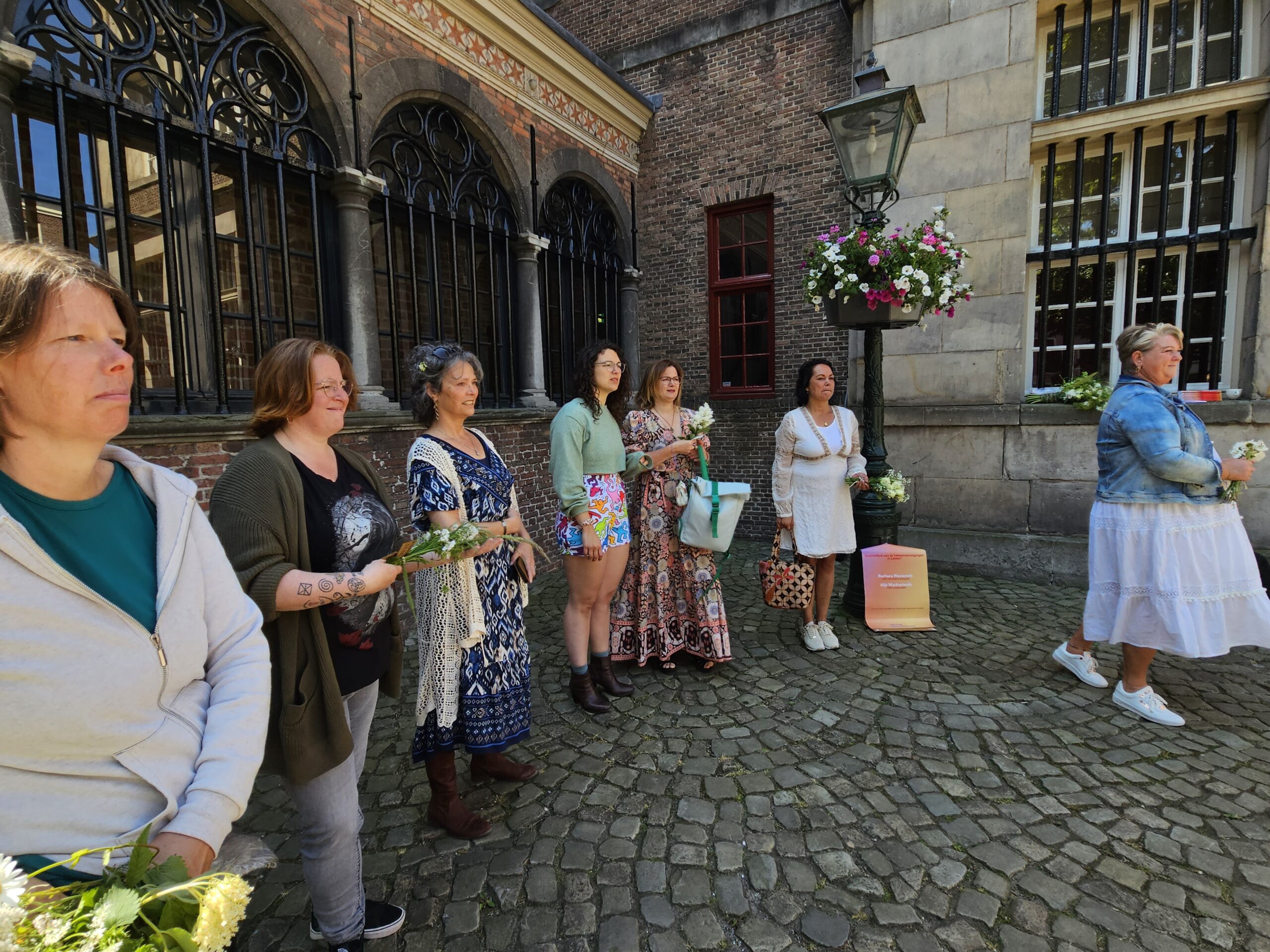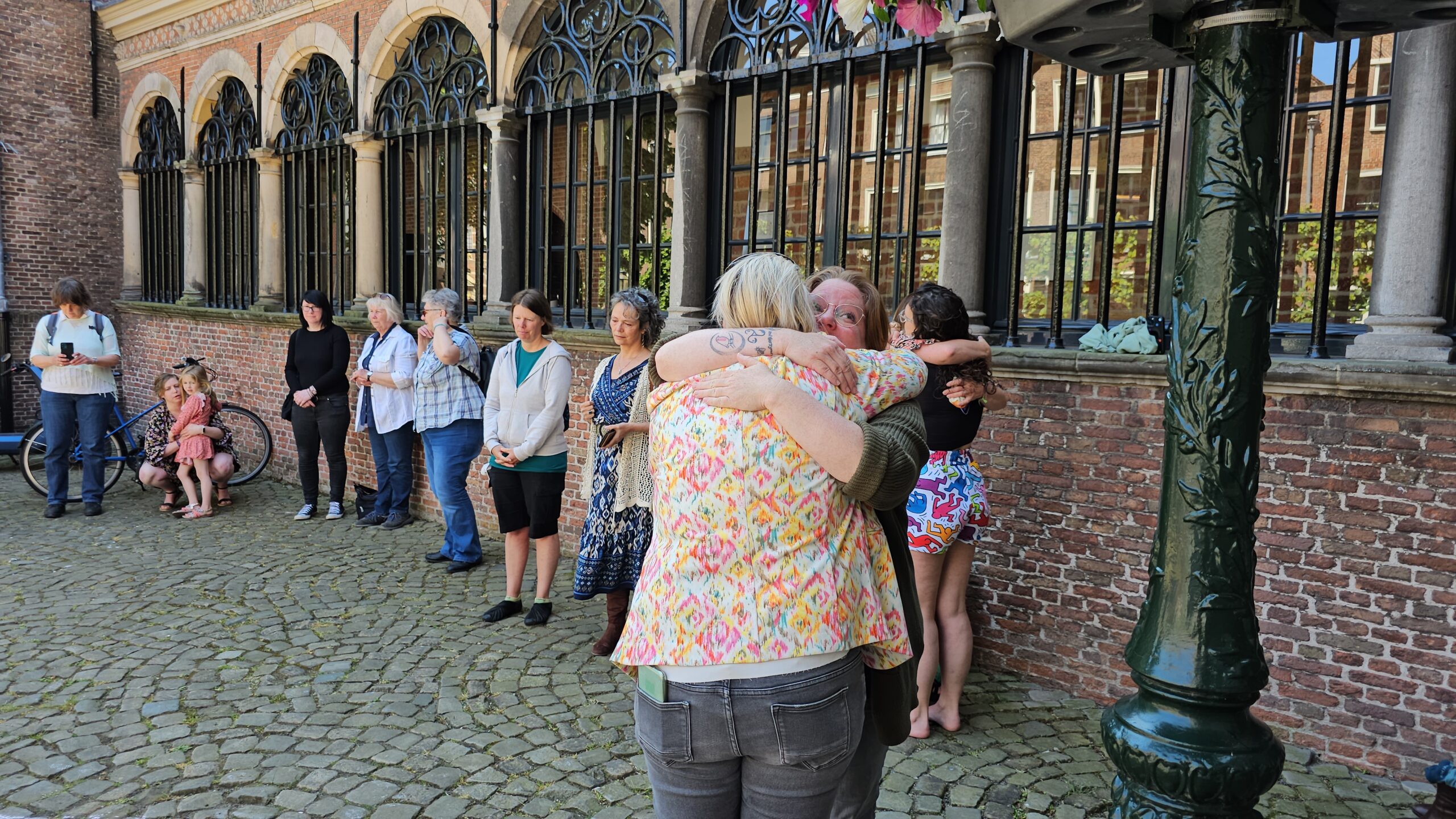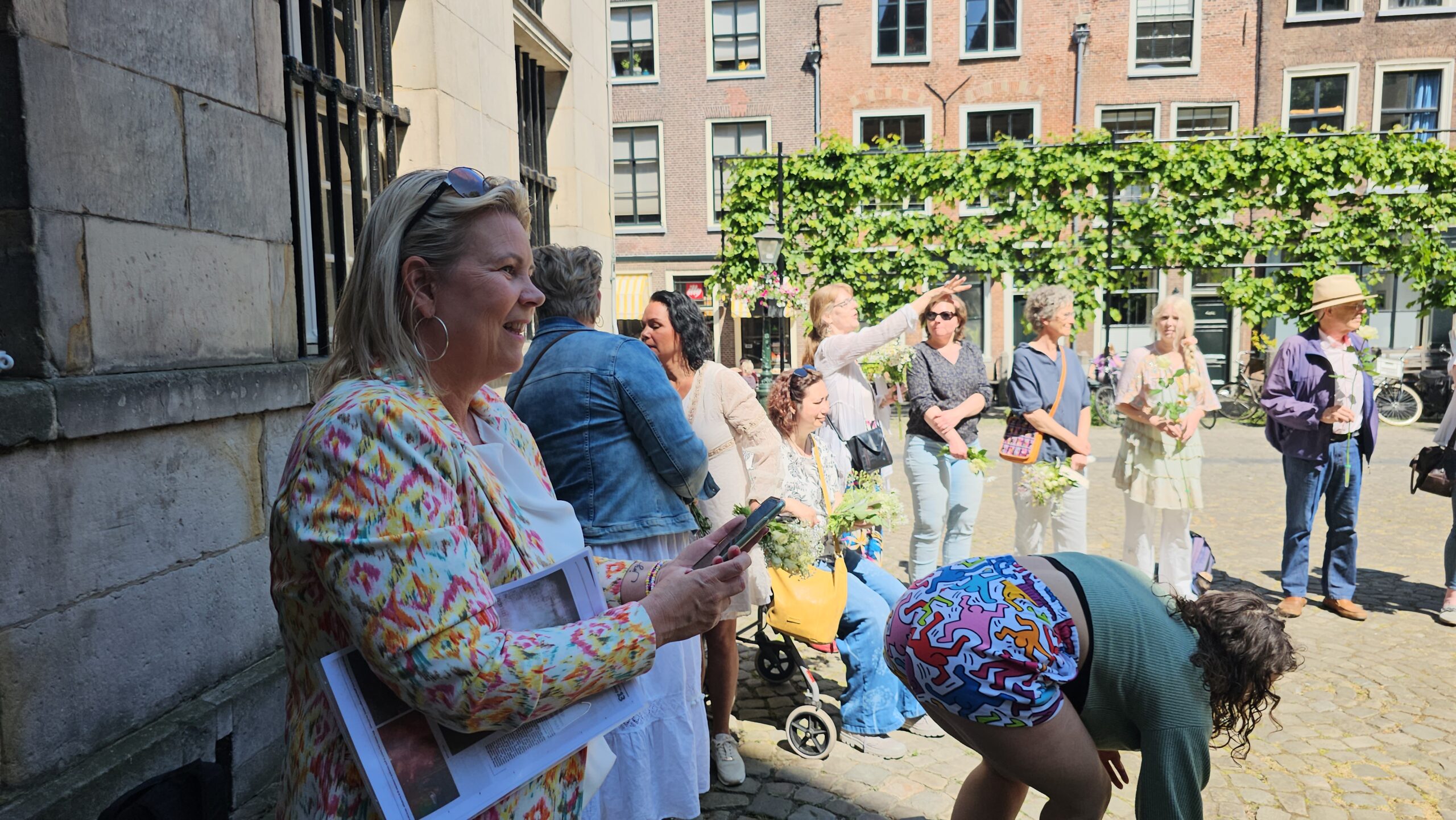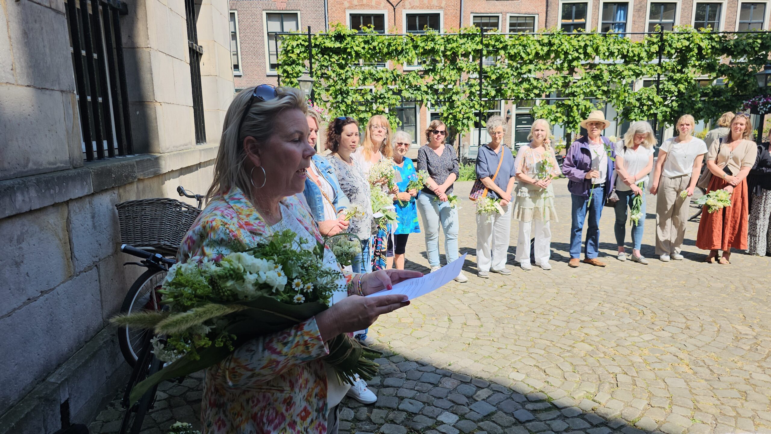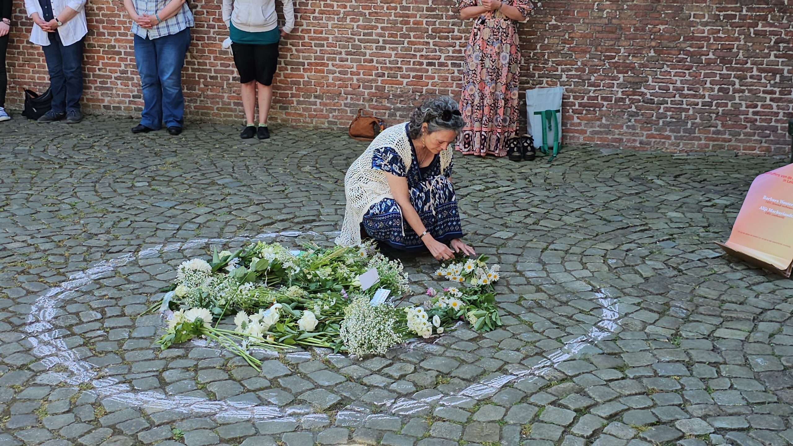 Ook in Leiden vond, voor het eerst, zo’n herdenking plaats. Daar bleek veel behoefte aan. Tientallen vrouwen en een enkele man waren naar het Gerecht gekomen waar de Leidse kunstenaar Roos Tulen met stoepkrijt een heksencirkel had getekend. In die kring werden door de aanwezigen witte bloemen gelegd.