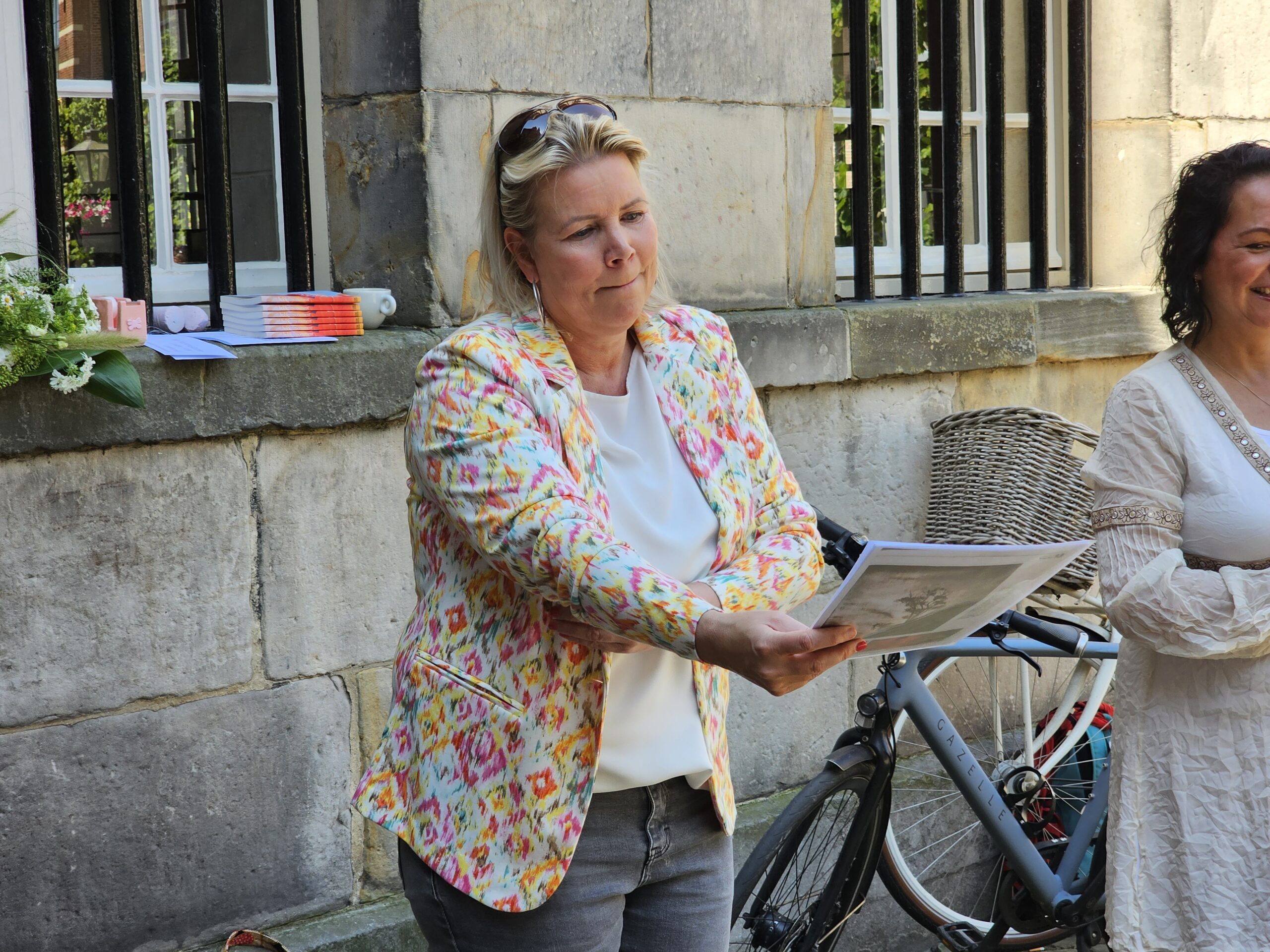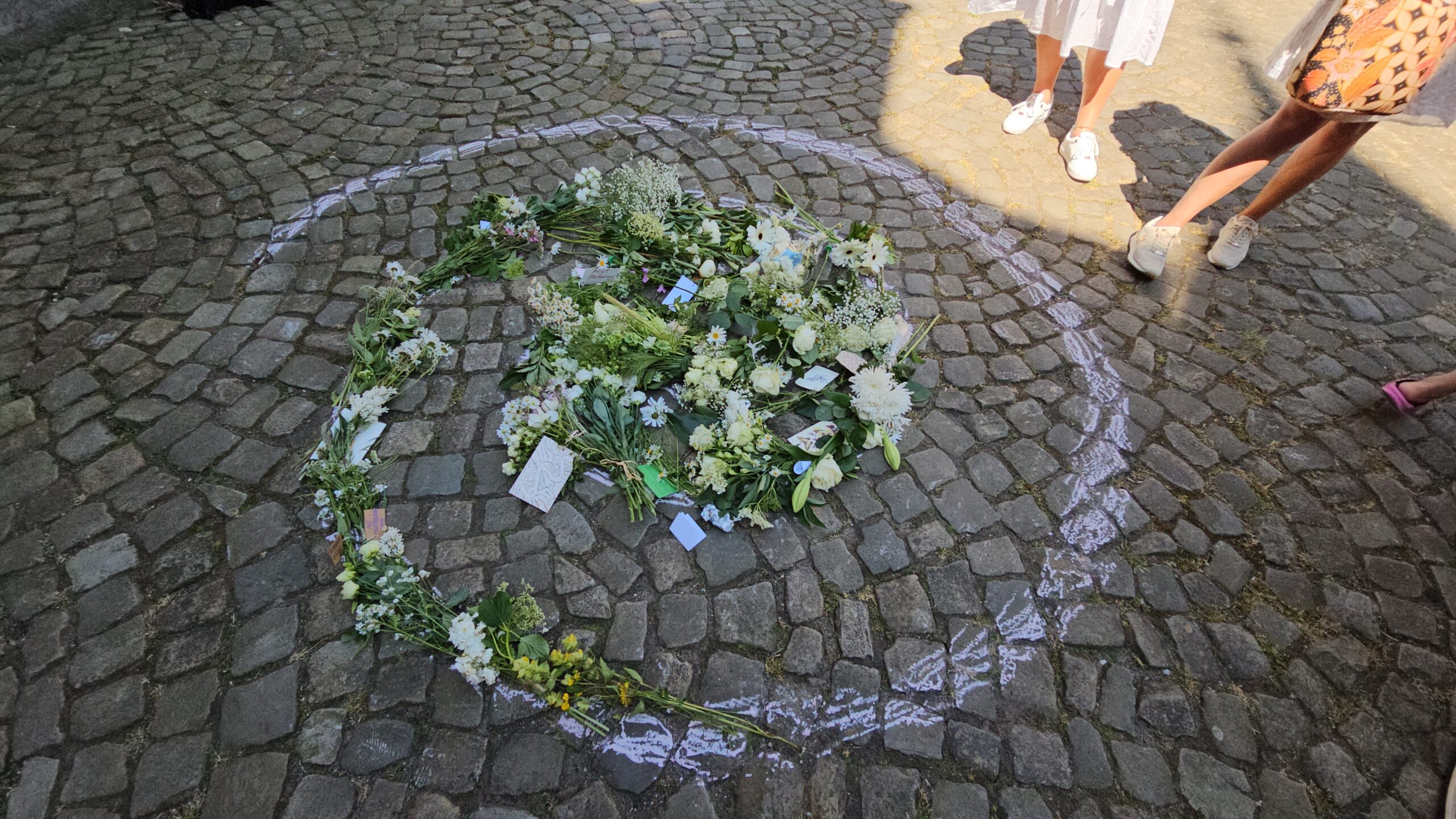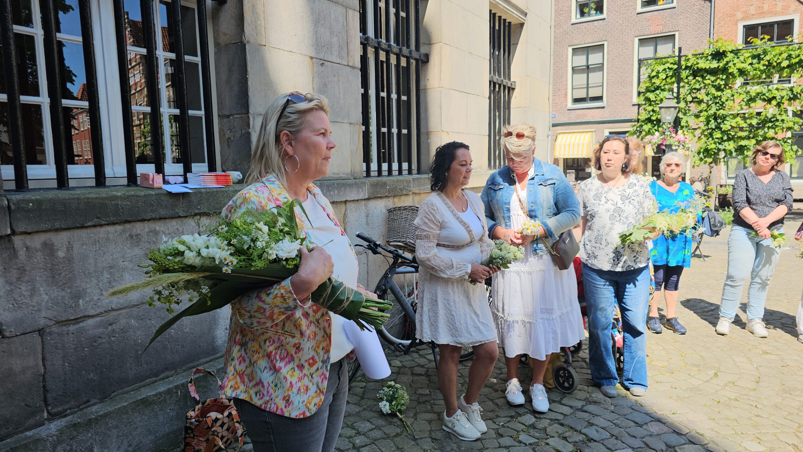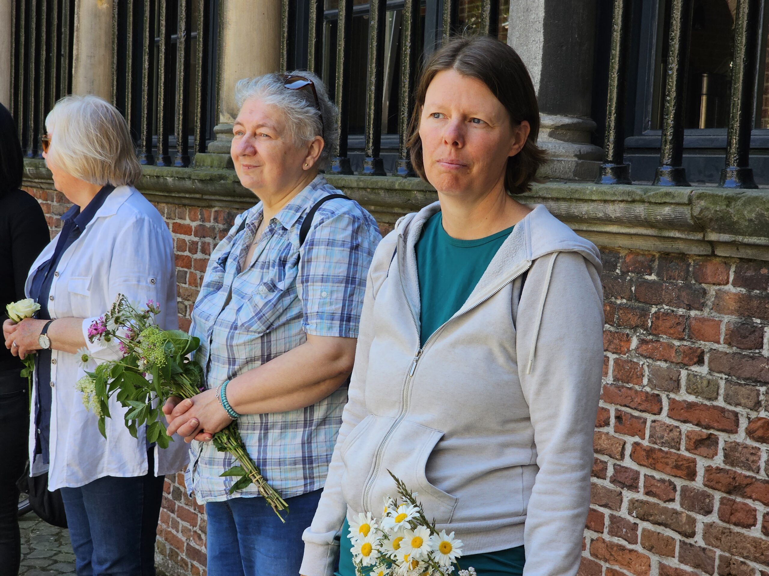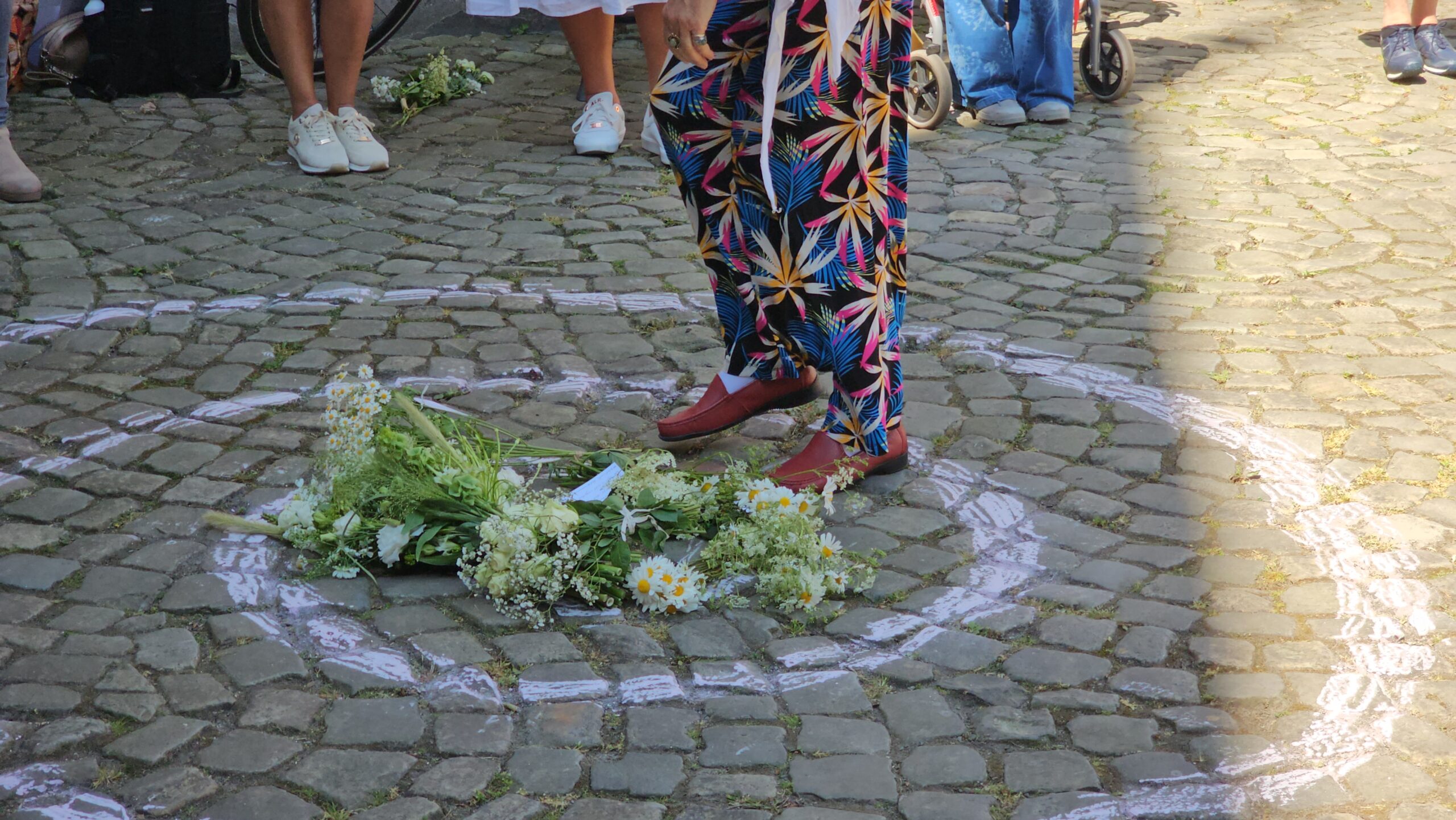 Ook in Leiden vond, voor het eerst, zo’n herdenking plaats. Daar bleek veel behoefte aan. Tientallen vrouwen en een enkele man waren naar het Gerecht gekomen waar de Leidse kunstenaar Roos Tulen met stoepkrijt een heksencirkel had getekend. In die kring werden door de aanwezigen witte bloemen gelegd.