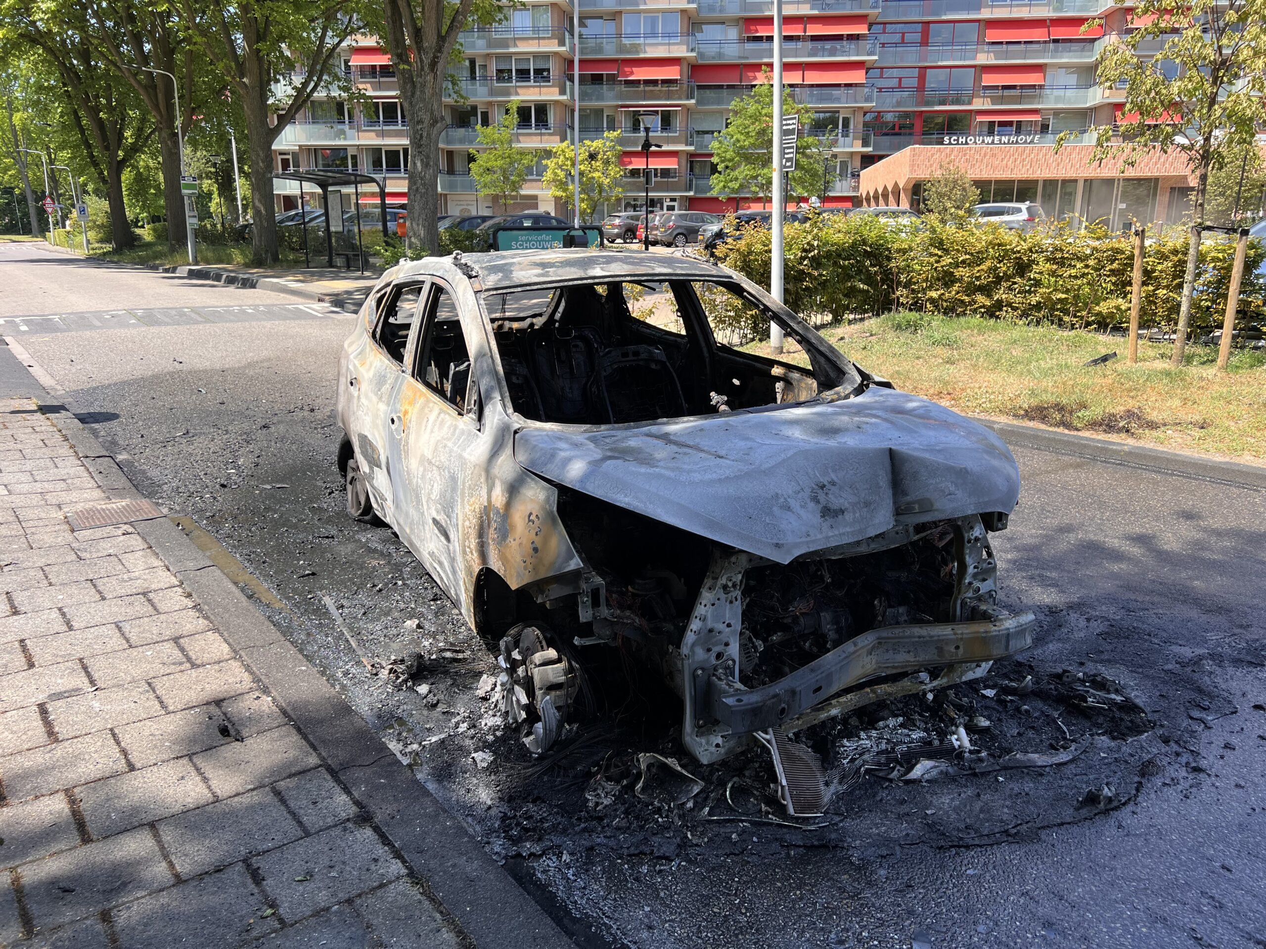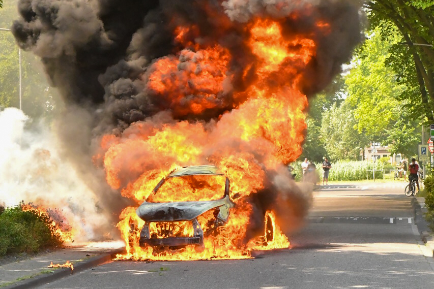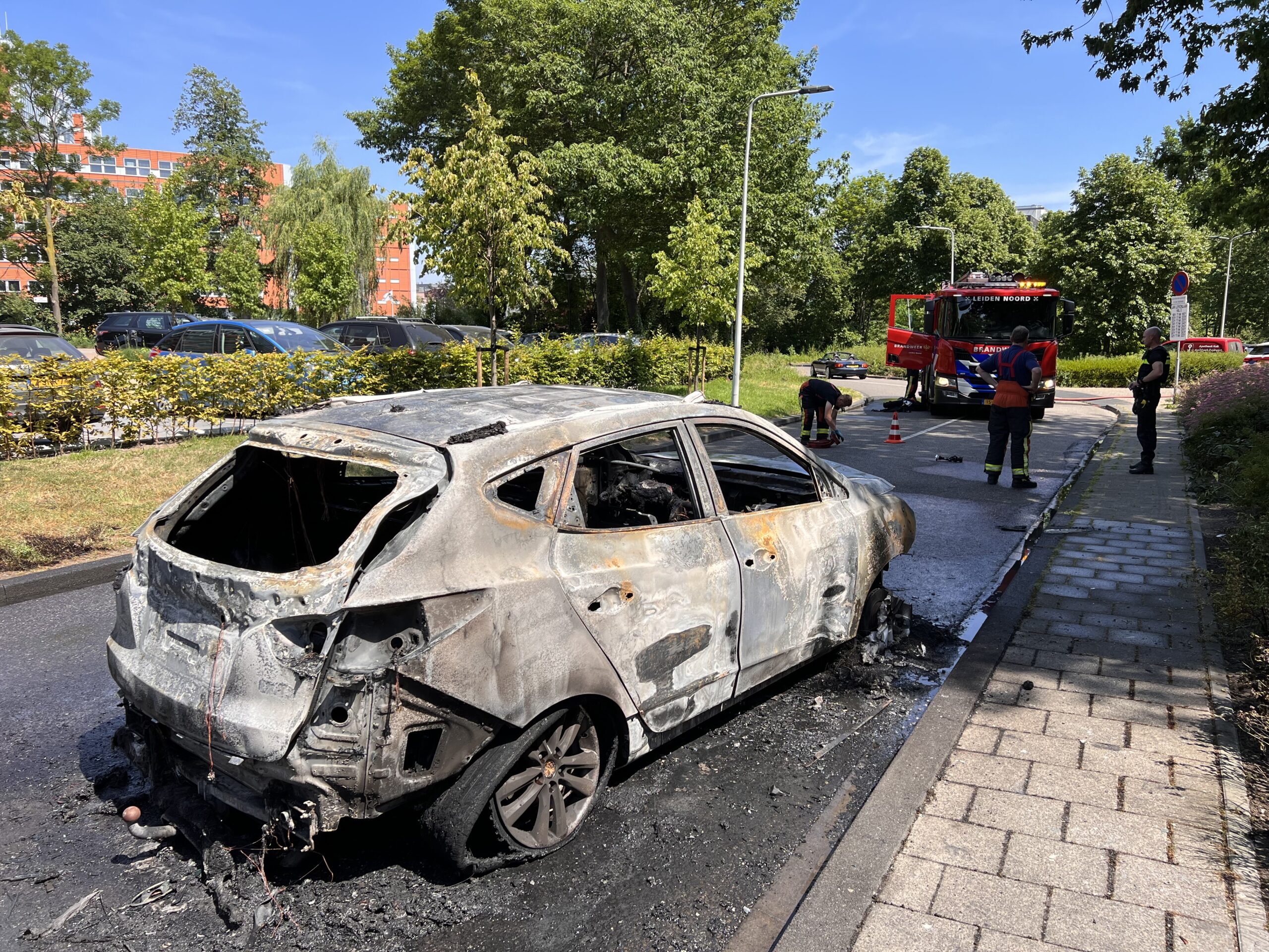 Aan de Jan Luykenlaan in Leiden is even na twaalf uur maandagmiddag een auto helemaal uitgebrand. De brandweer was er snel bij, maar er viel niets meer te redden.