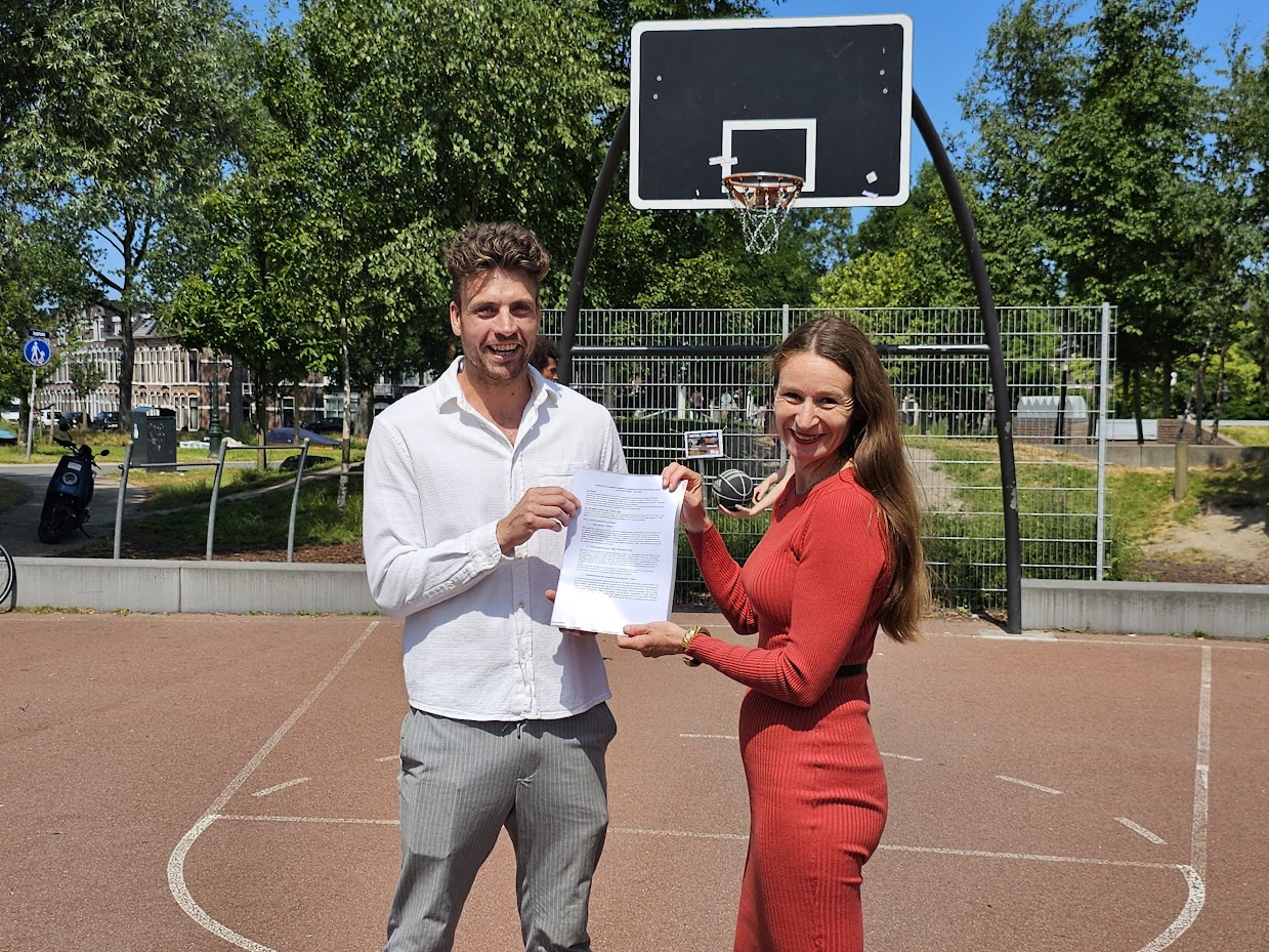 Sportwethouder Fleur Spijker en Tim van der Meer van de Commissie Sportstimulering over het advies voor het toekennen van subsidies.