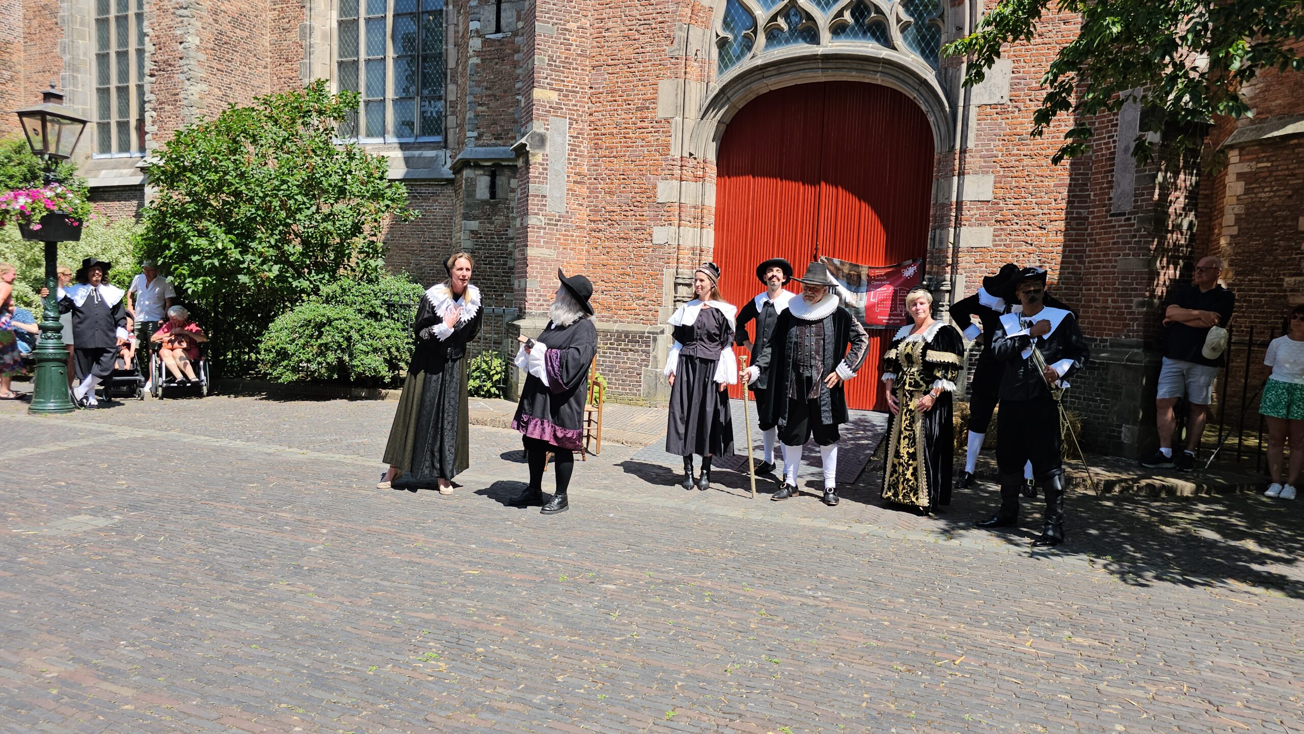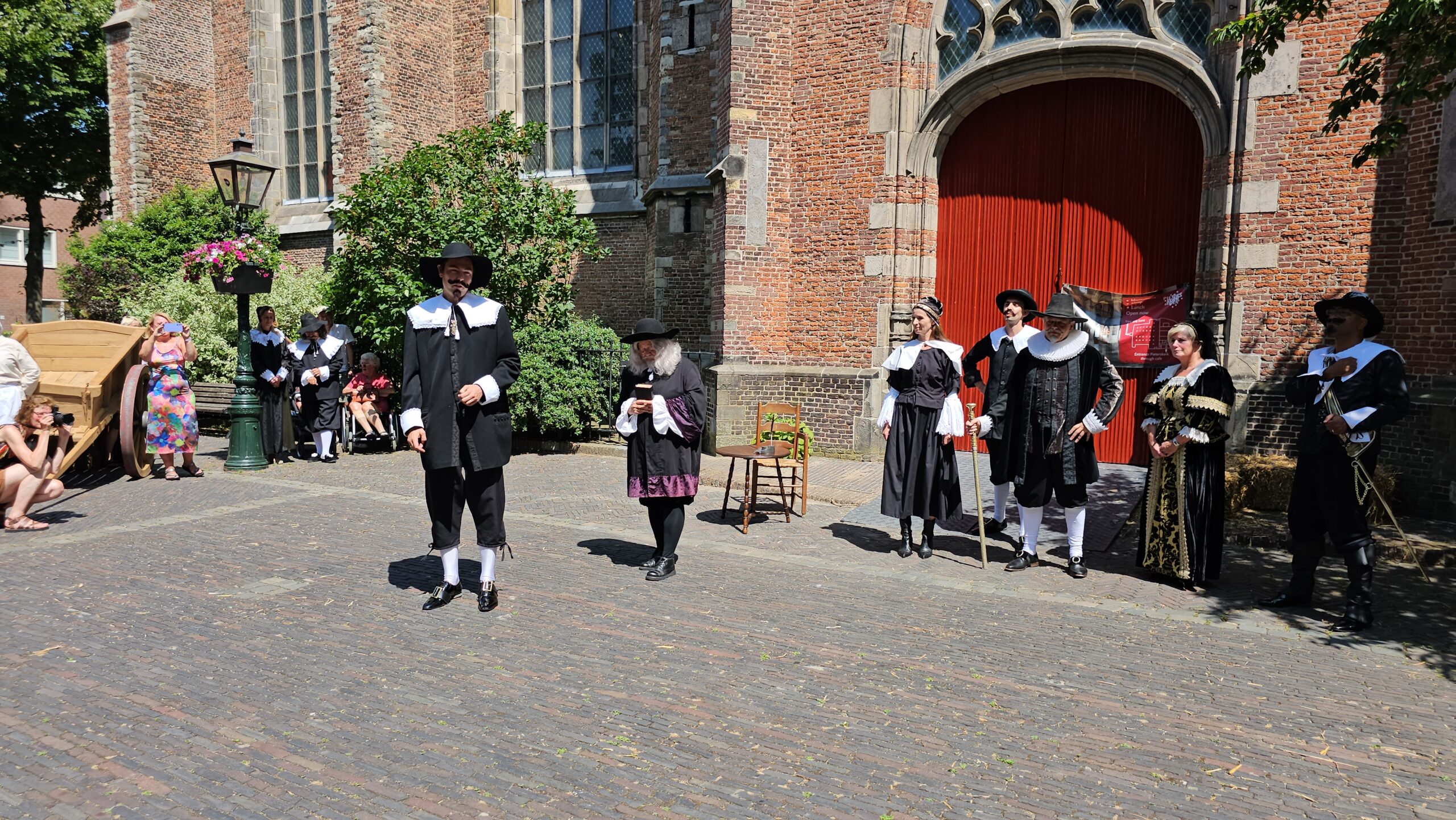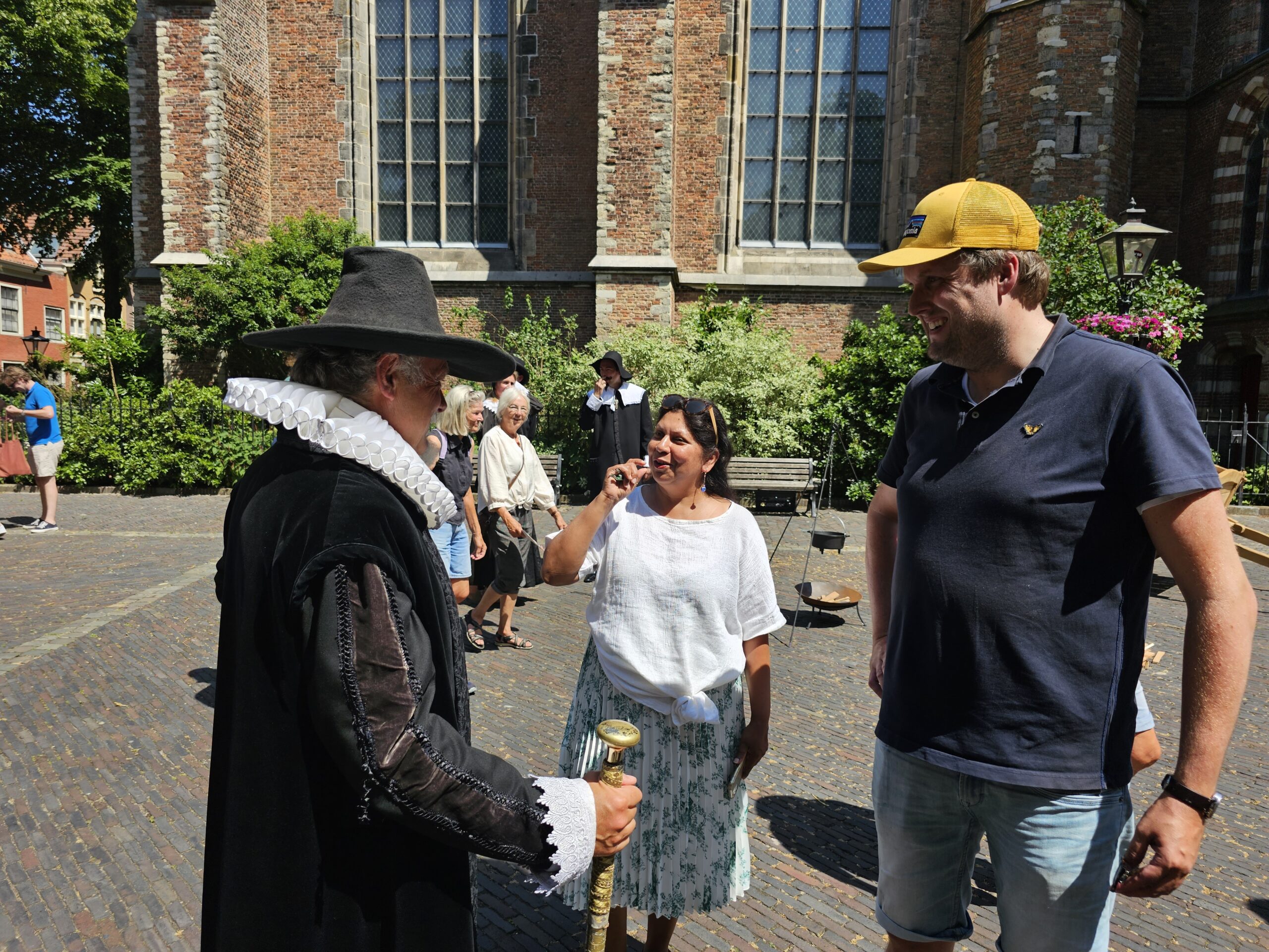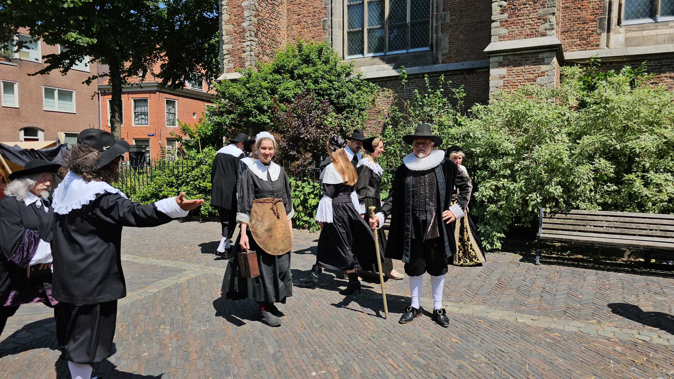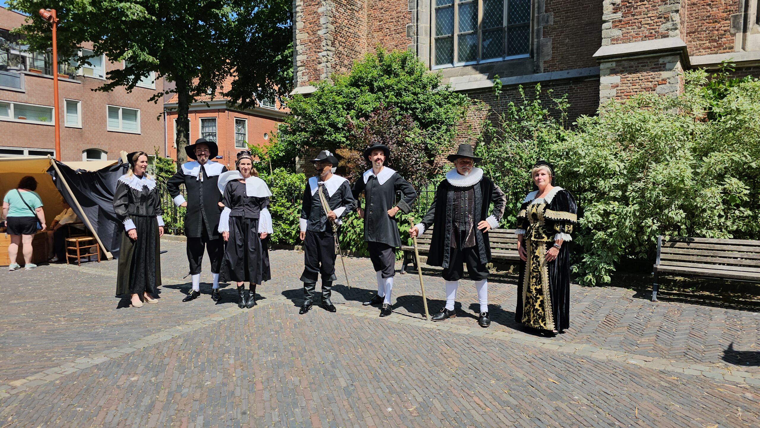 Een bijzonder tafereel speelde zich zaterdagmiddag af op het Pieterskerkhof. Daar trad het voltallige 17e eeuwse stadsbestuur aan om zich te laten portretteren. Als dank van de pelgrims die zo gastvrij in Leiden werden opgenomen.