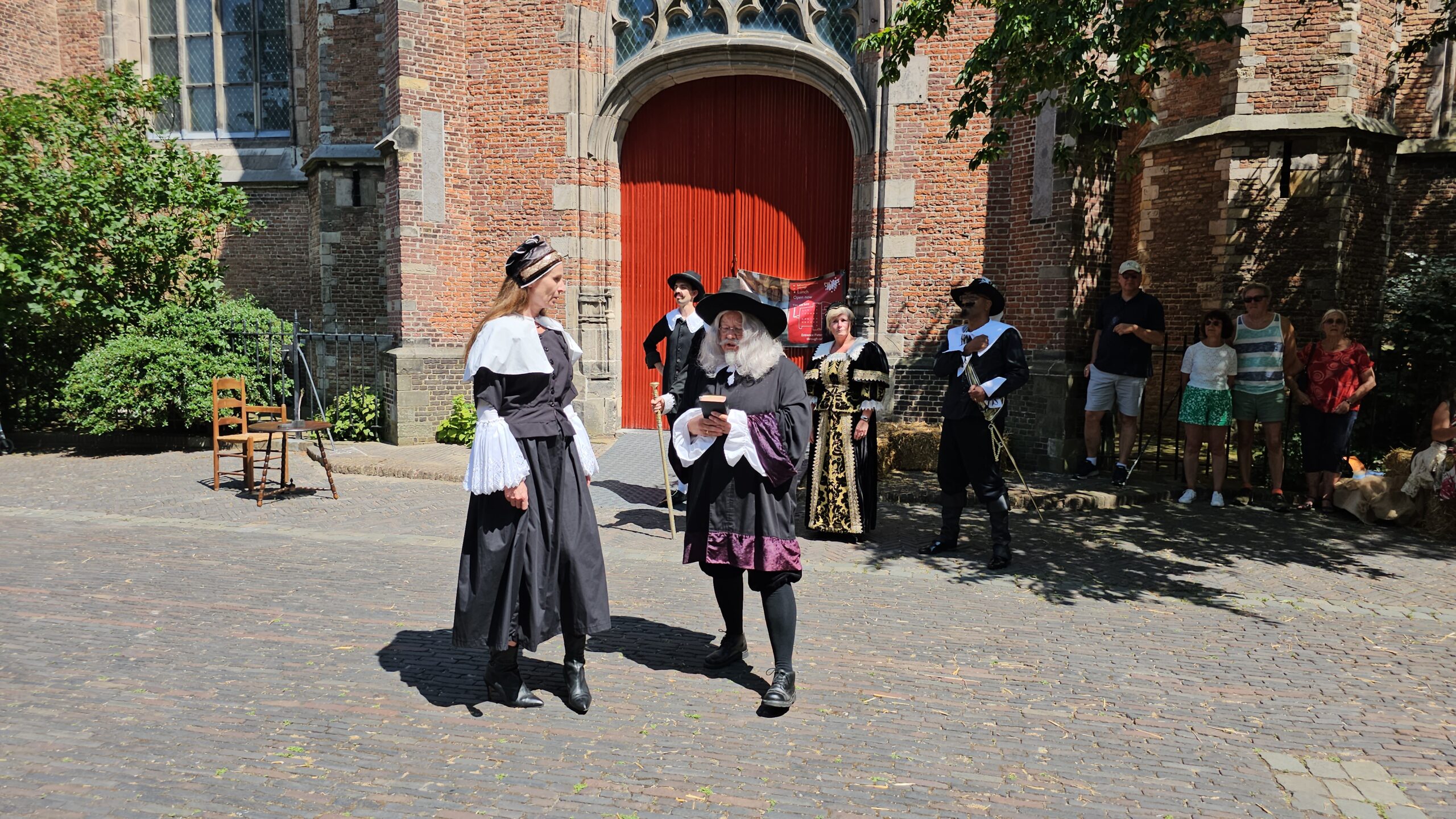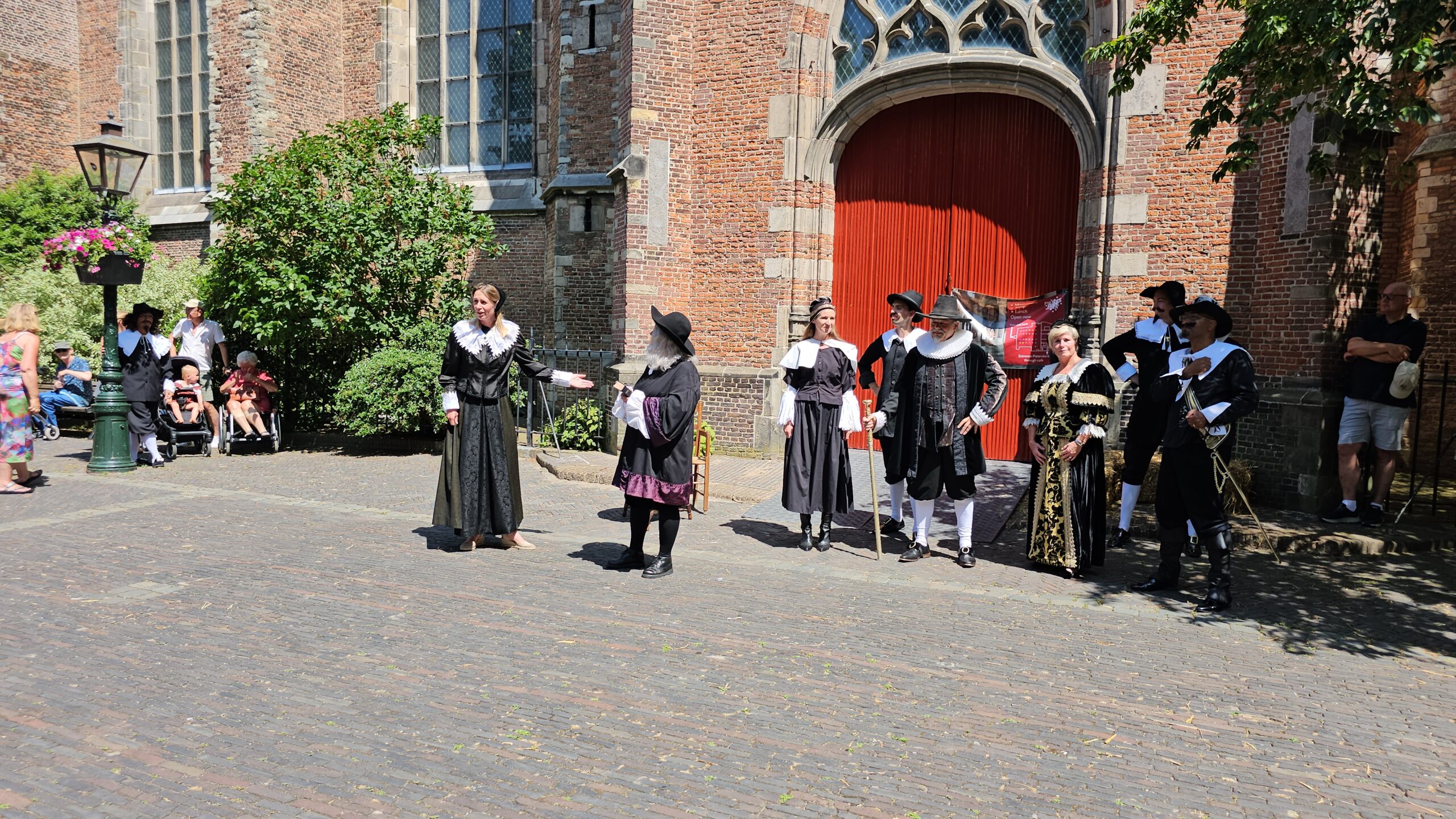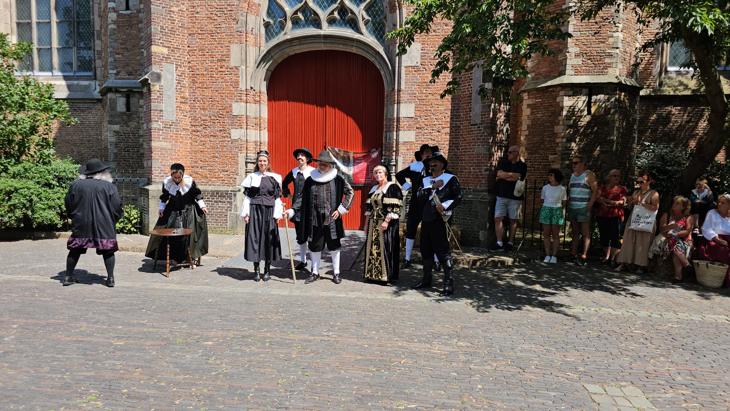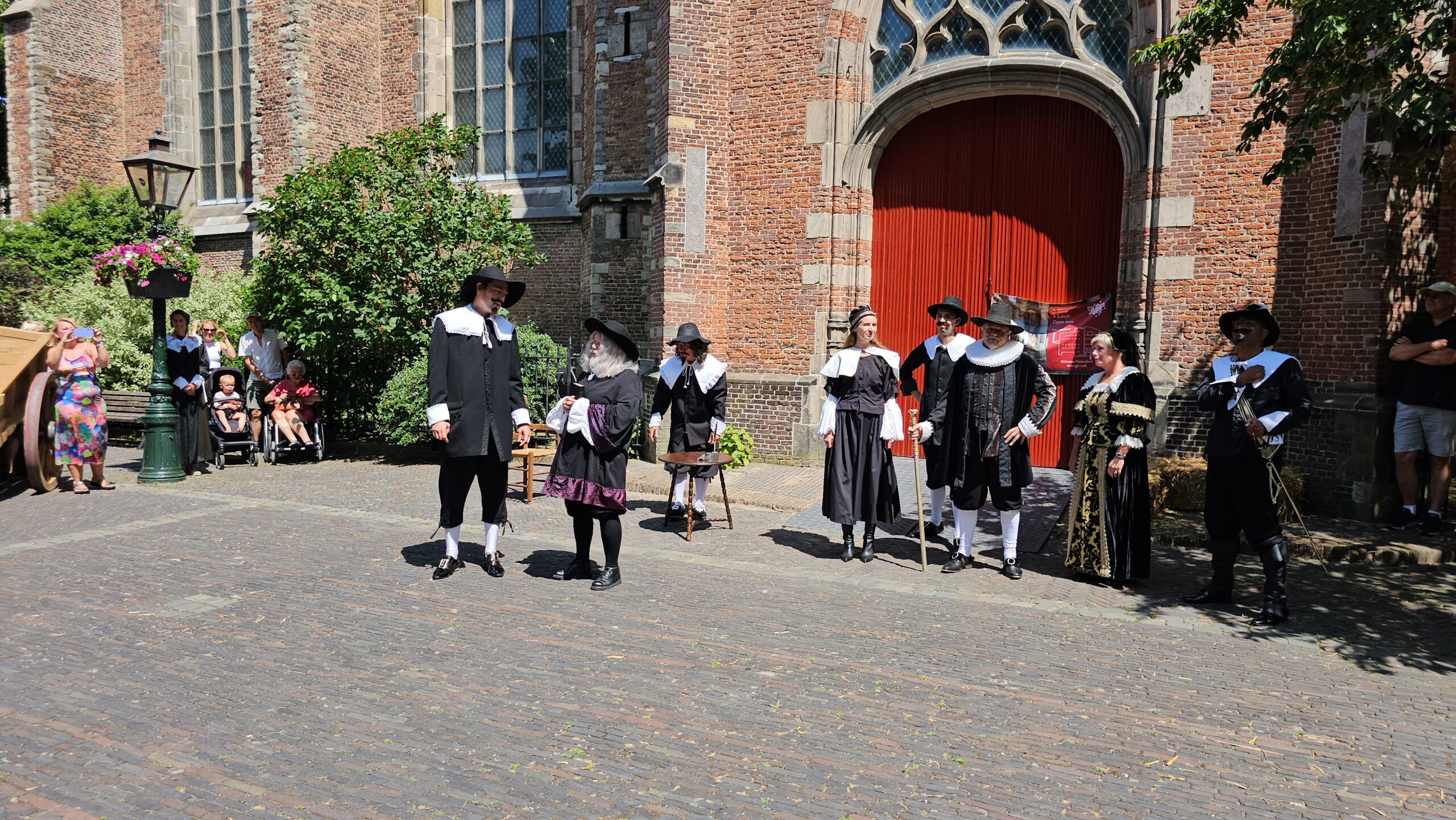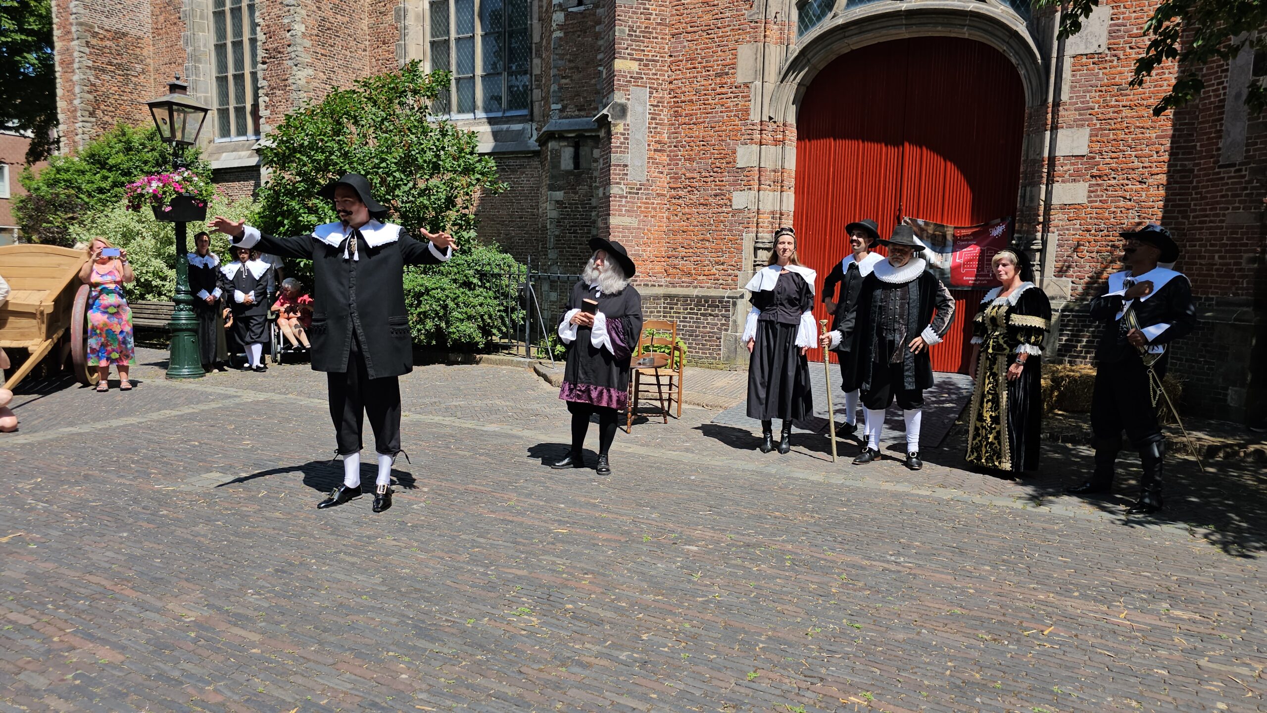 Een bijzonder tafereel speelde zich zaterdagmiddag af op het Pieterskerkhof. Daar trad het voltallige 17e eeuwse stadsbestuur aan om zich te laten portretteren. Als dank van de pelgrims die zo gastvrij in Leiden werden opgenomen.