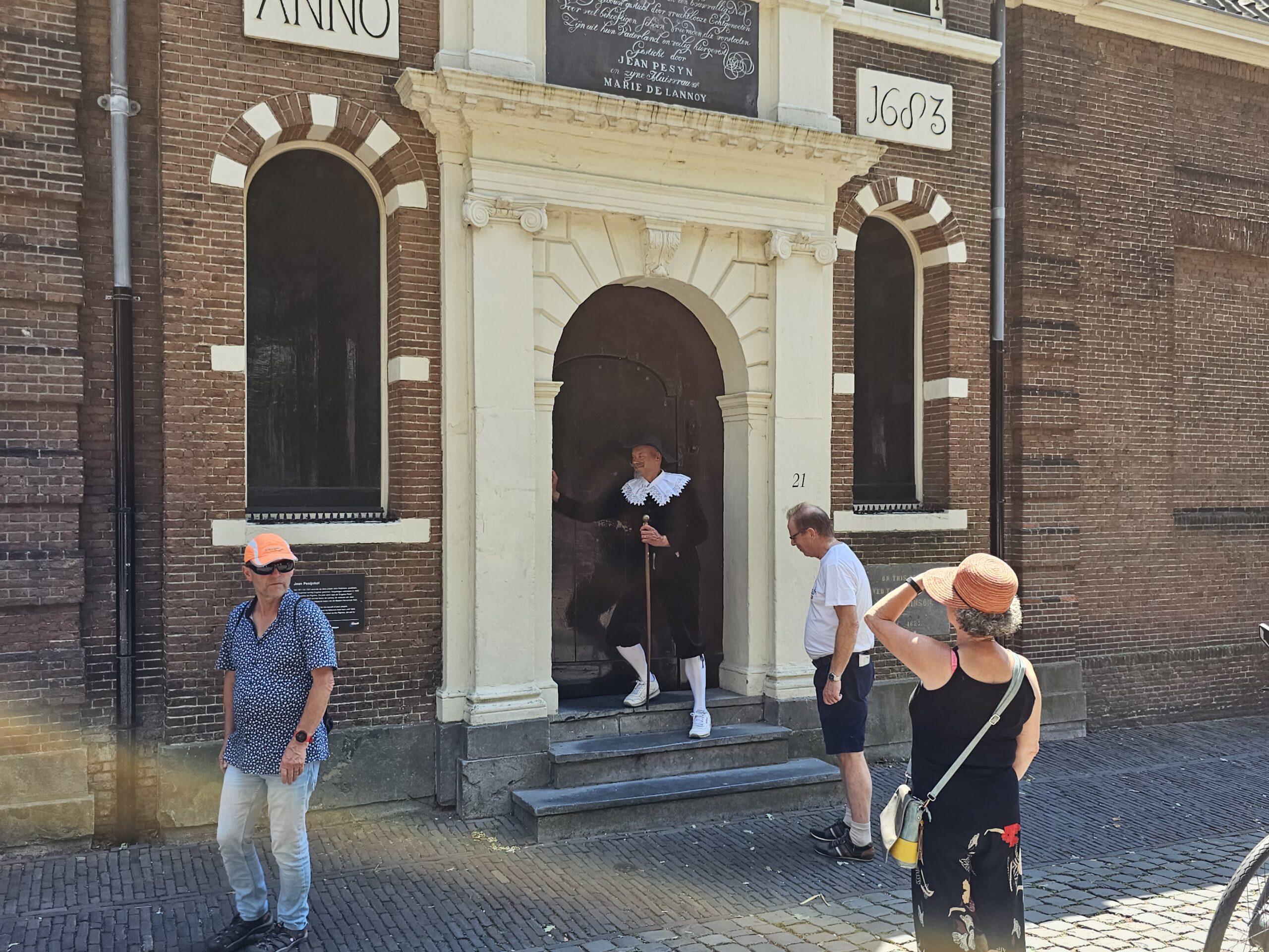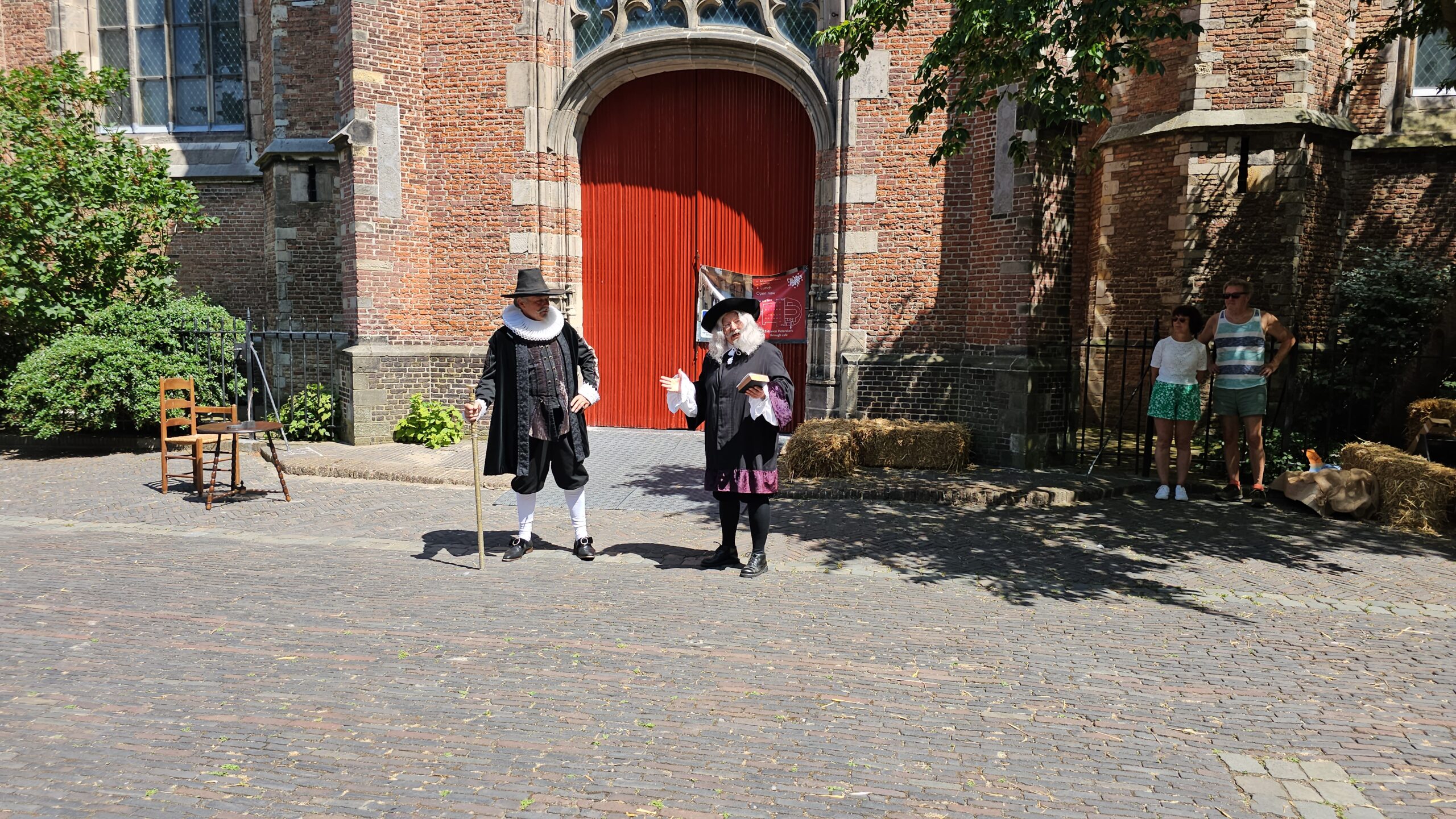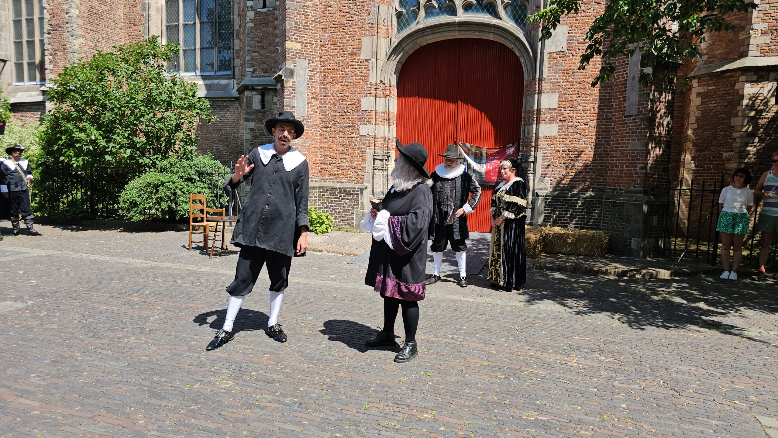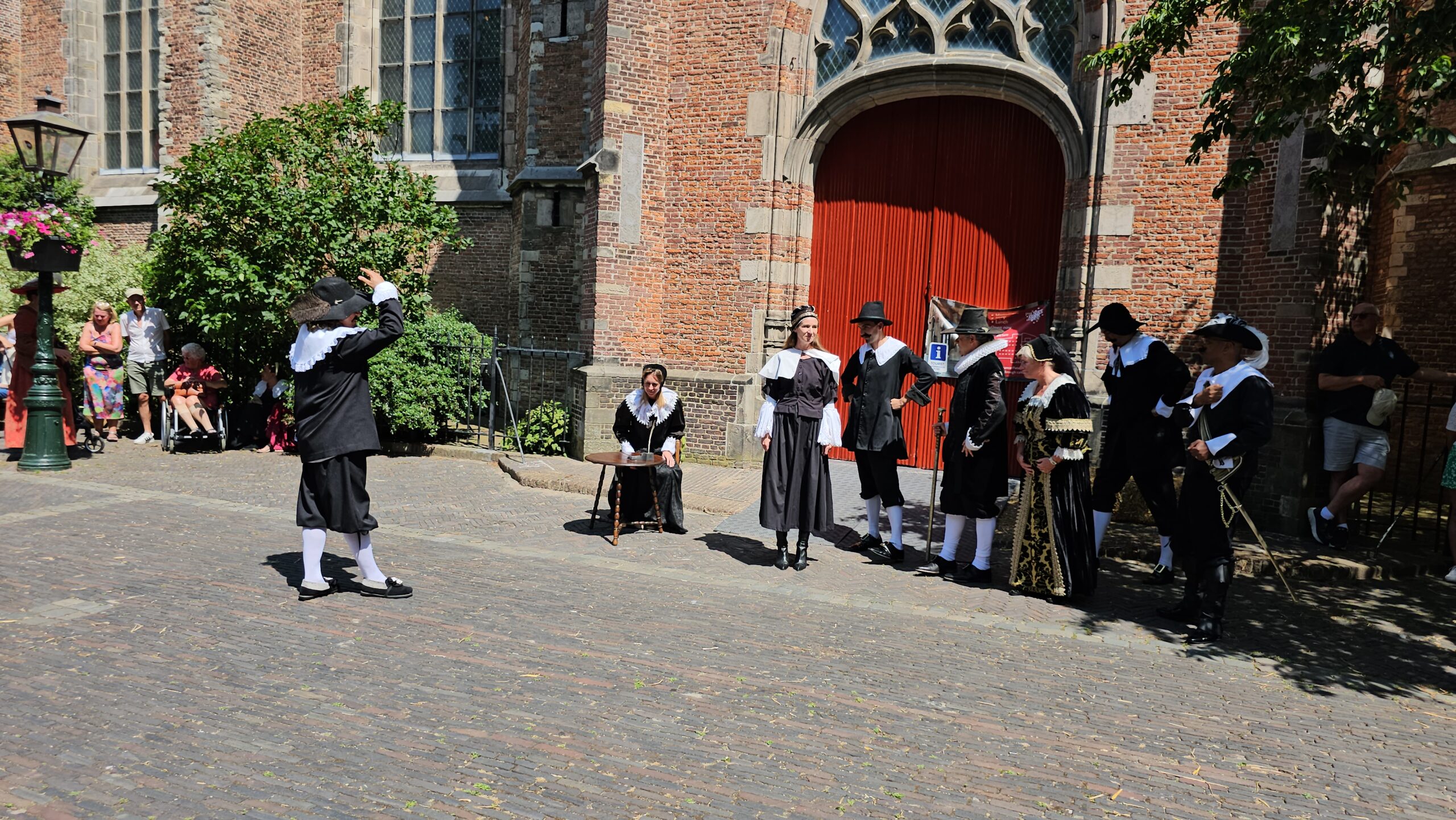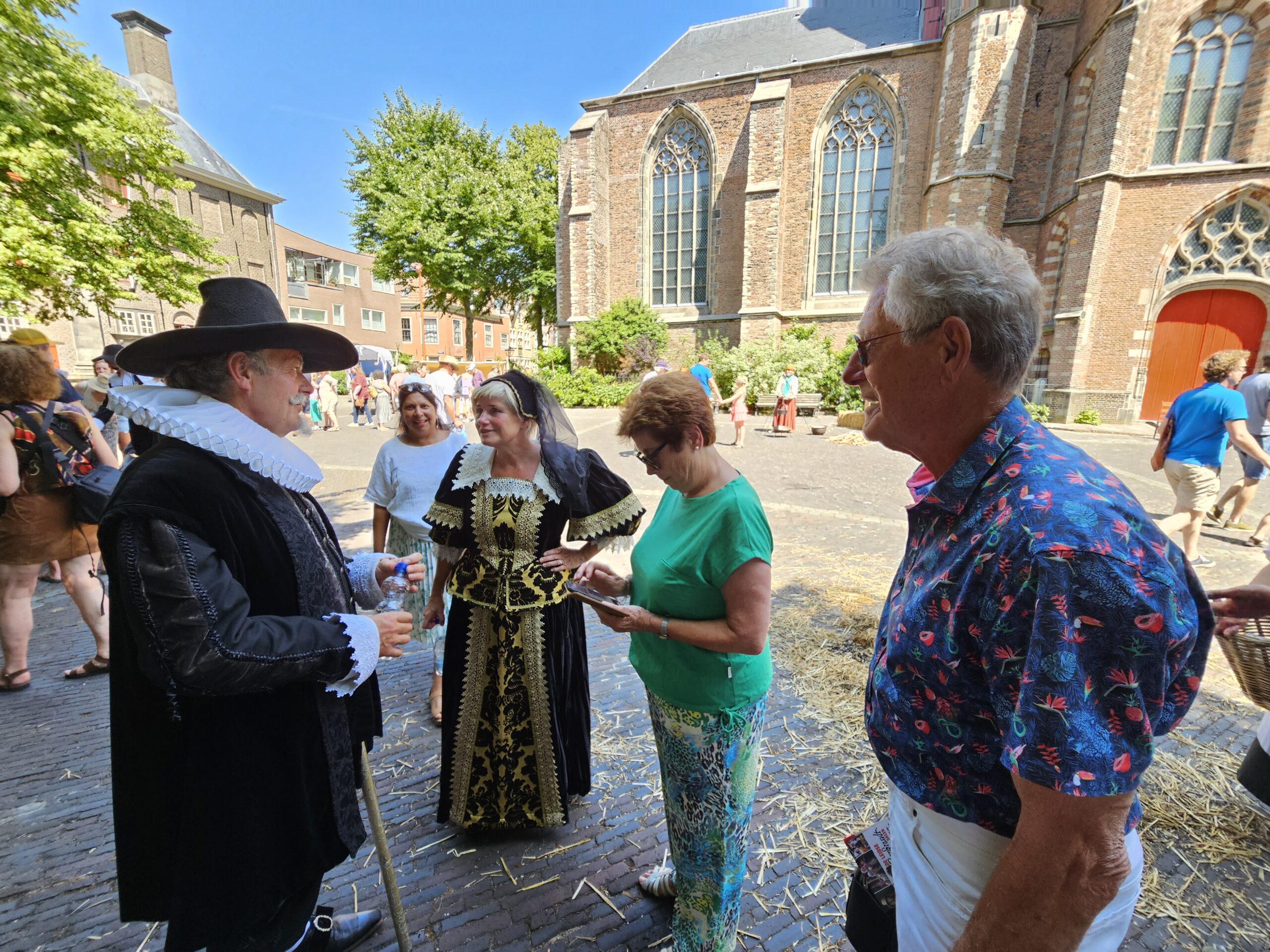 Een bijzonder tafereel speelde zich zaterdagmiddag af op het Pieterskerkhof. Daar trad het voltallige 17e eeuwse stadsbestuur aan om zich te laten portretteren. Als dank van de pelgrims die zo gastvrij in Leiden werden opgenomen.