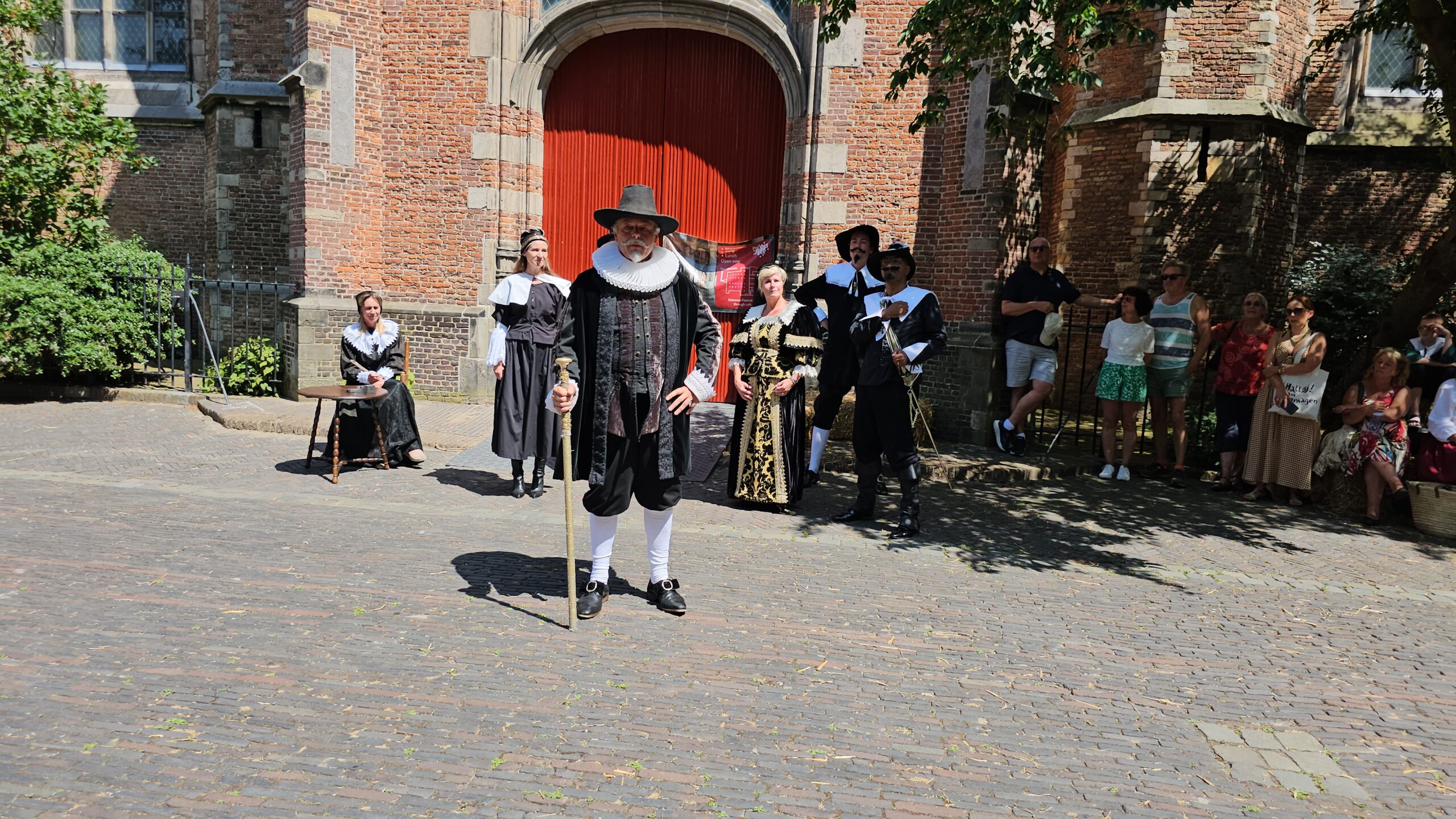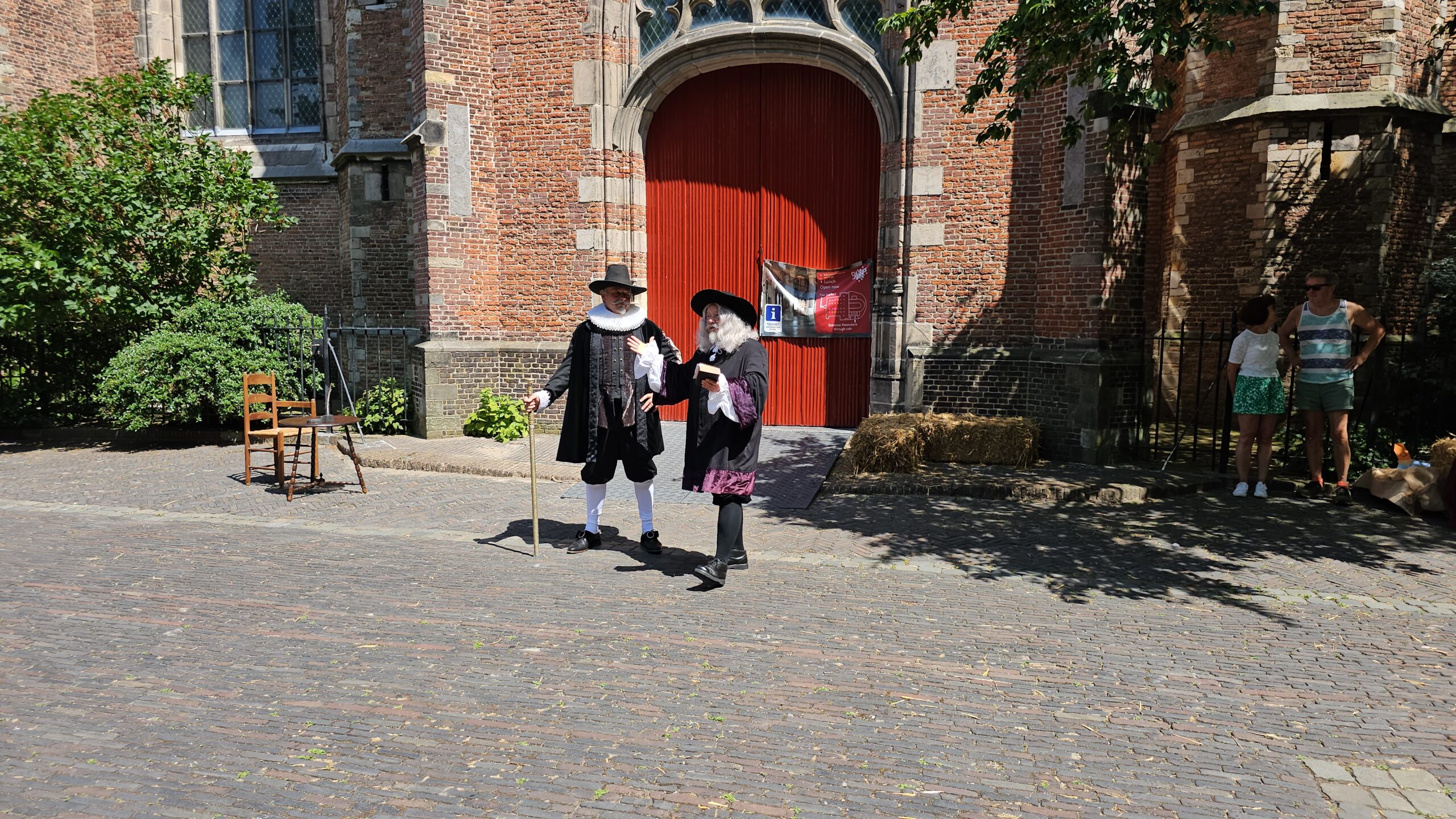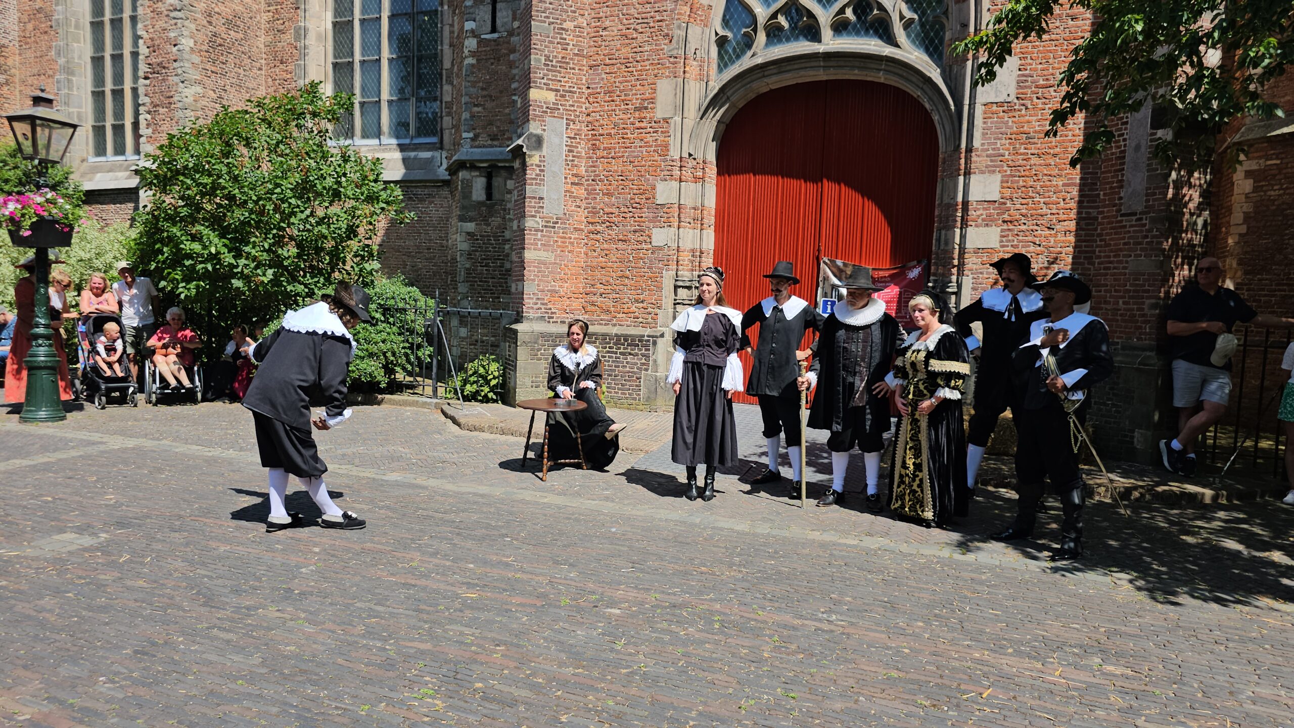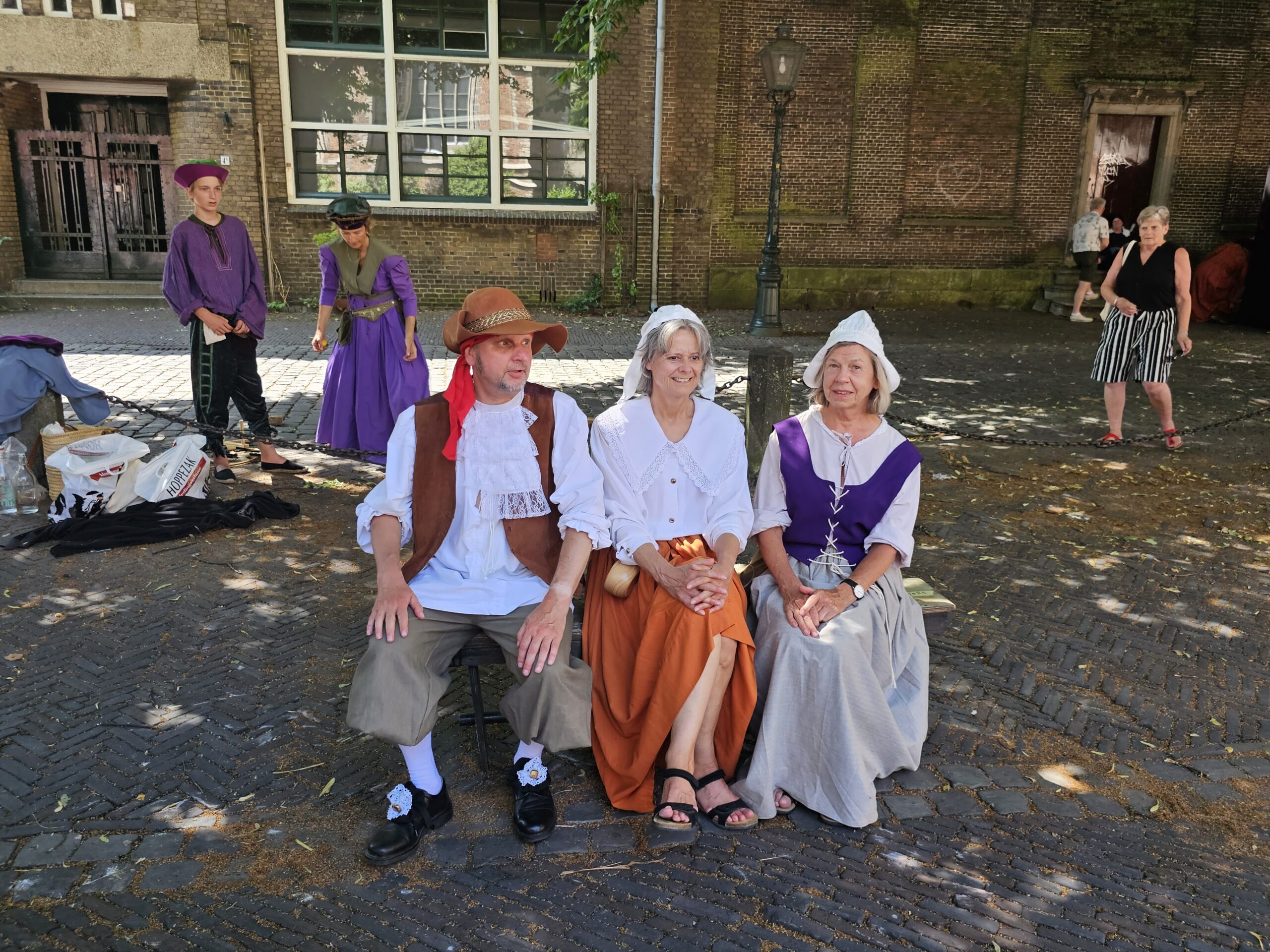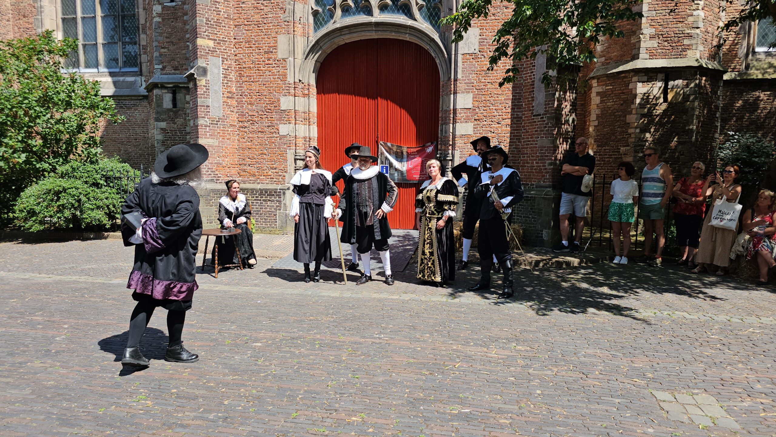Een bijzonder tafereel speelde zich zaterdagmiddag af op het Pieterskerkhof. Daar trad het voltallige 17e eeuwse stadsbestuur aan om zich te laten portretteren. Als dank van de pelgrims die zo gastvrij in Leiden werden opgenomen.