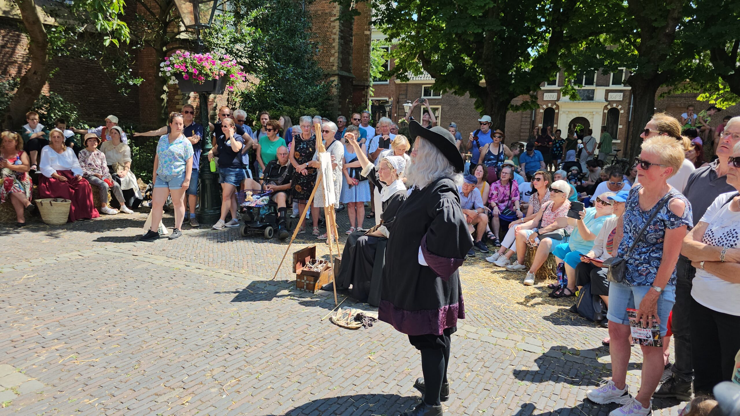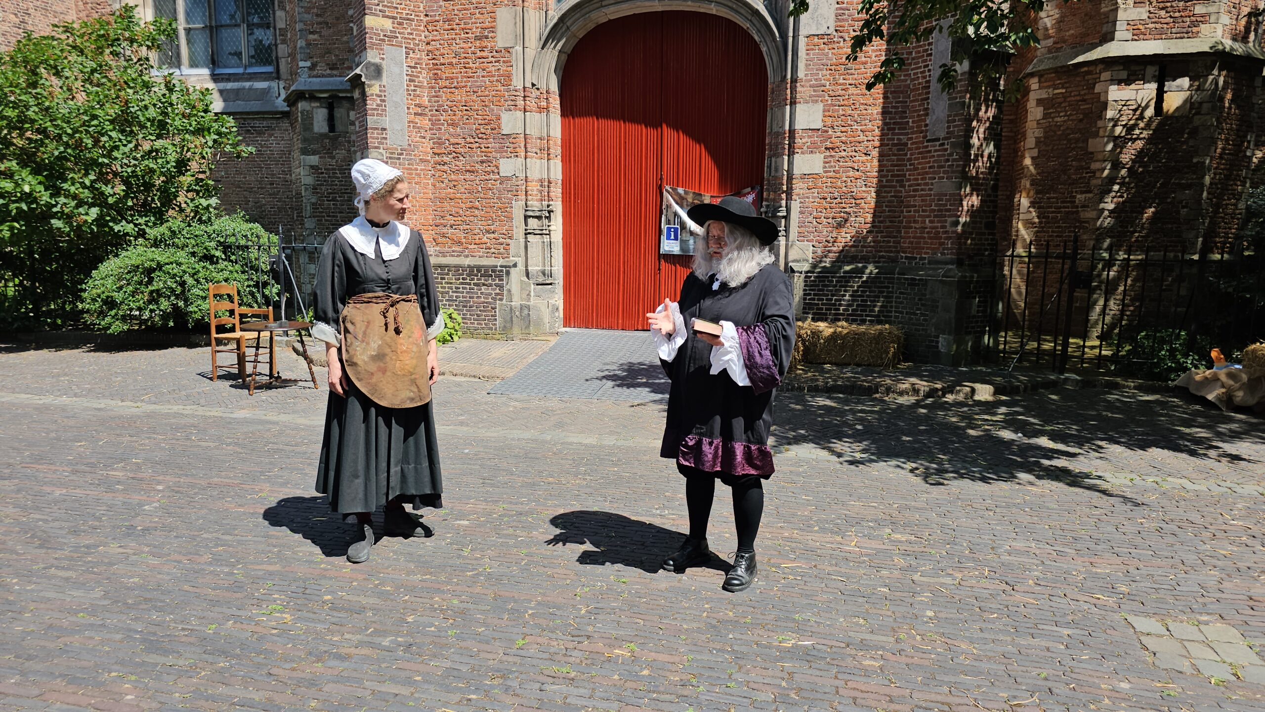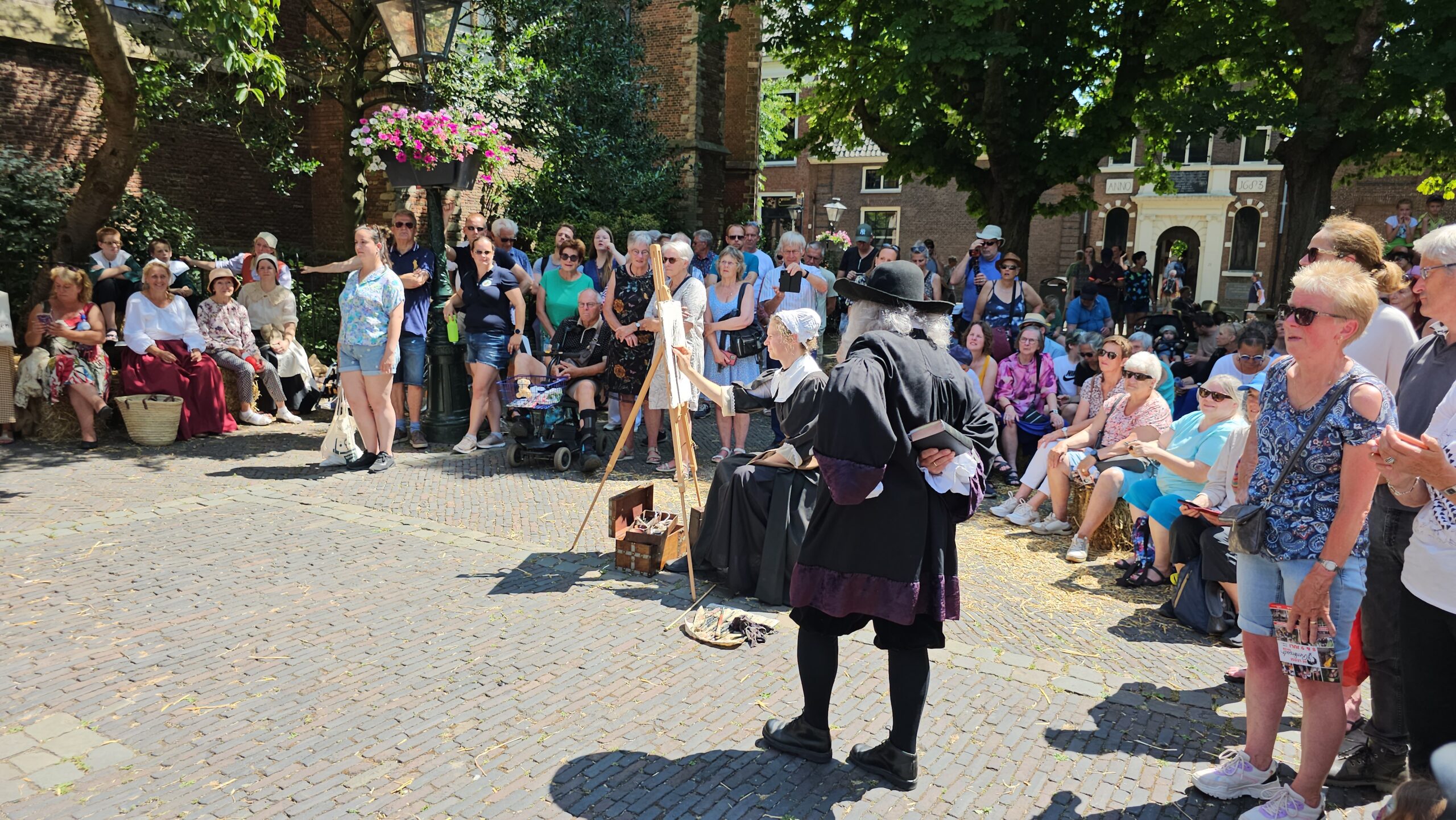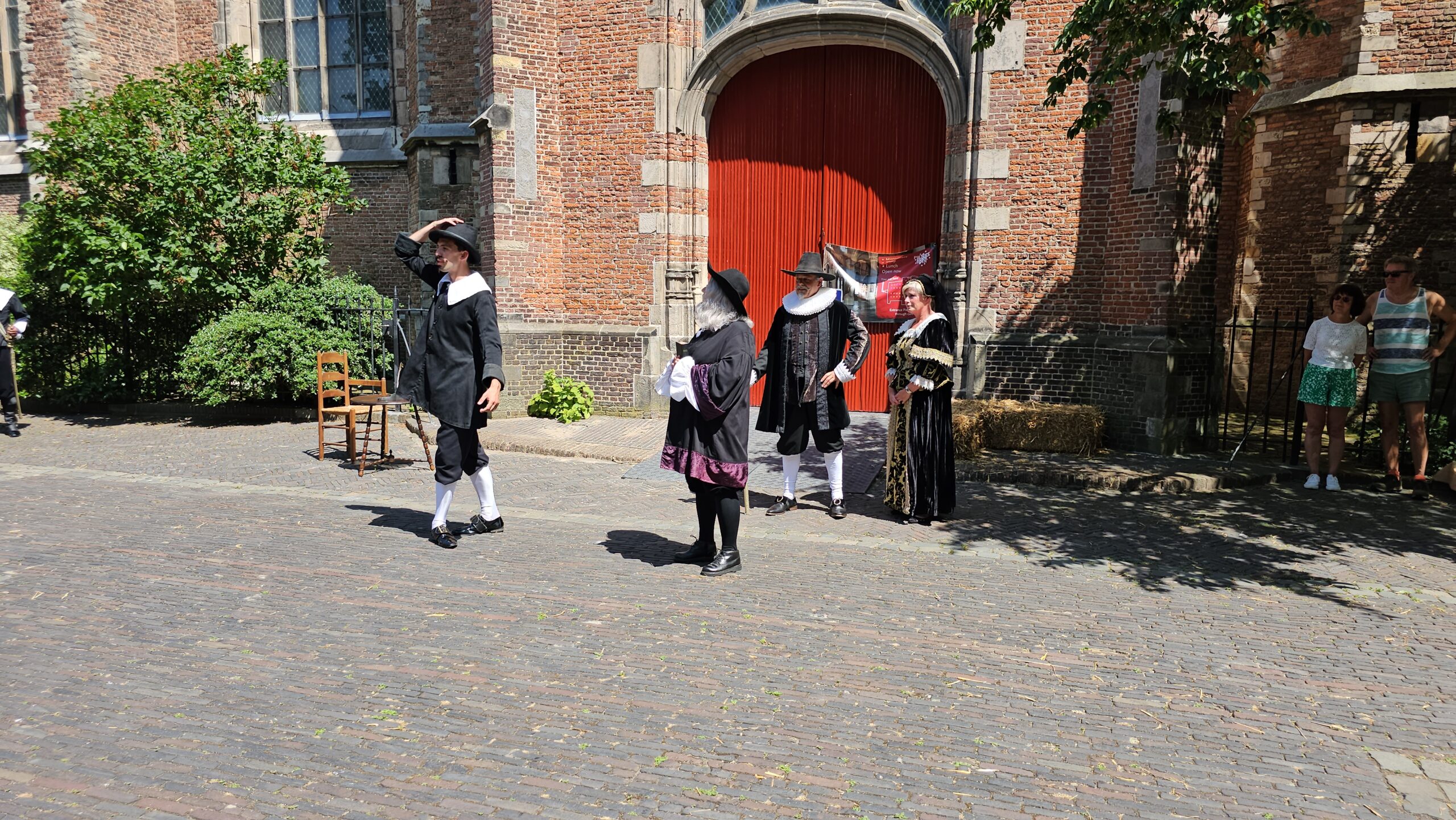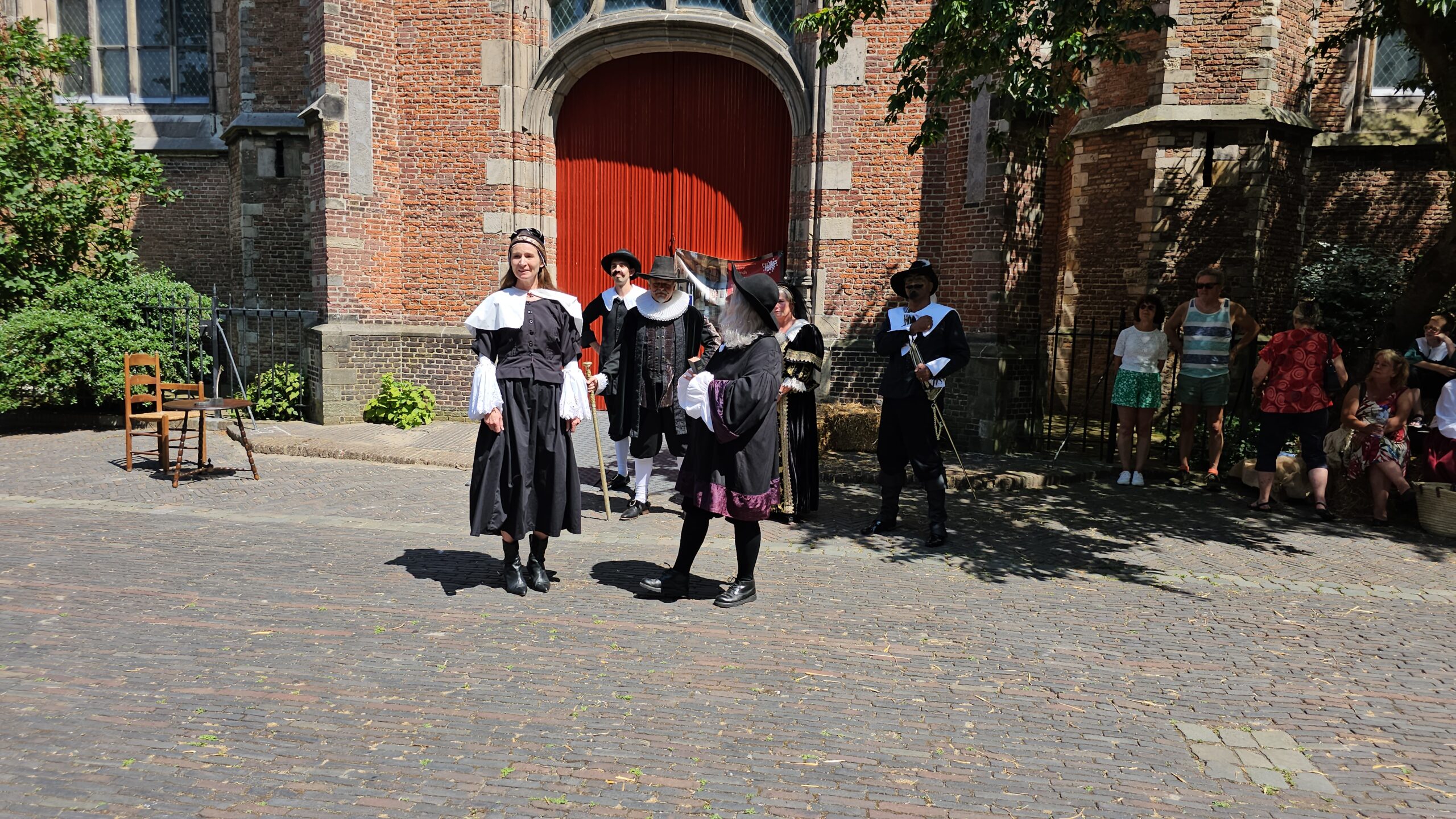 Een bijzonder tafereel speelde zich zaterdagmiddag af op het Pieterskerkhof. Daar trad het voltallige 17e eeuwse stadsbestuur aan om zich te laten portretteren. Als dank van de pelgrims die zo gastvrij in Leiden werden opgenomen.