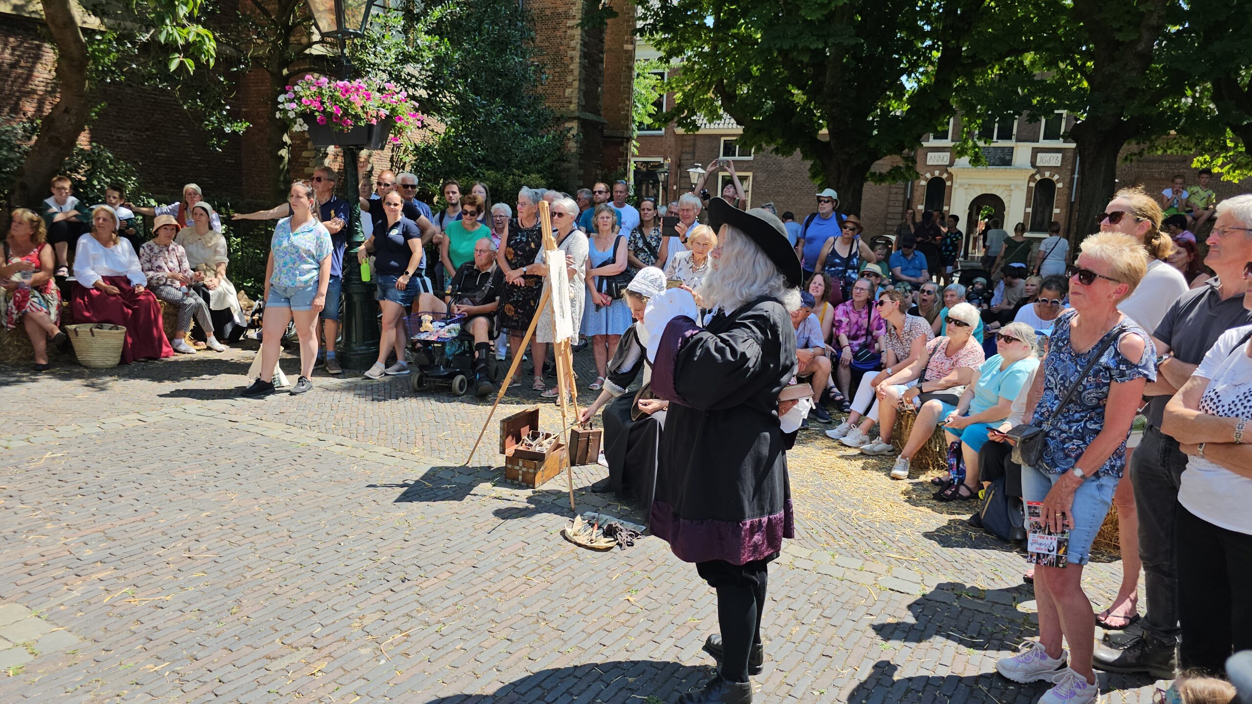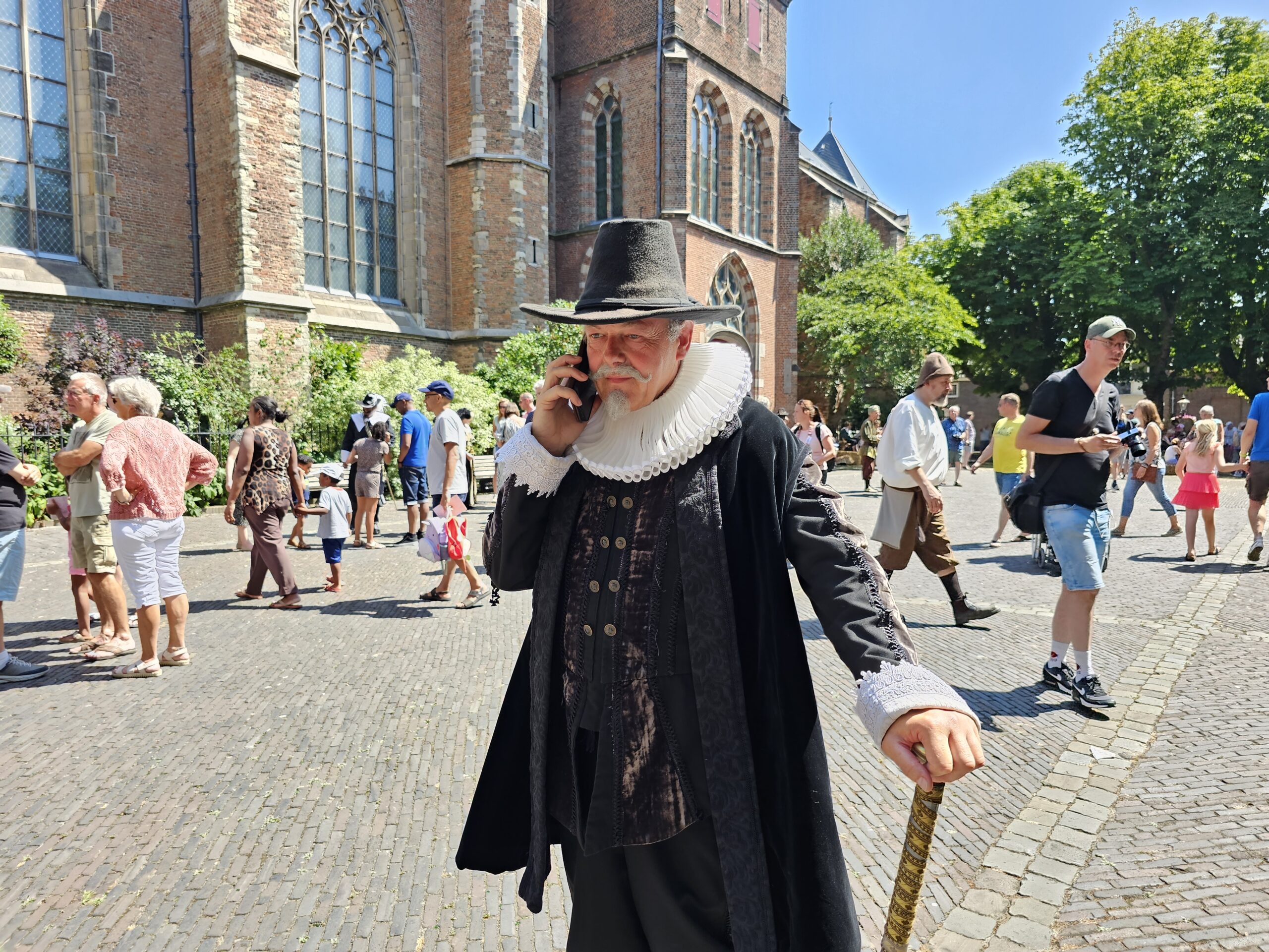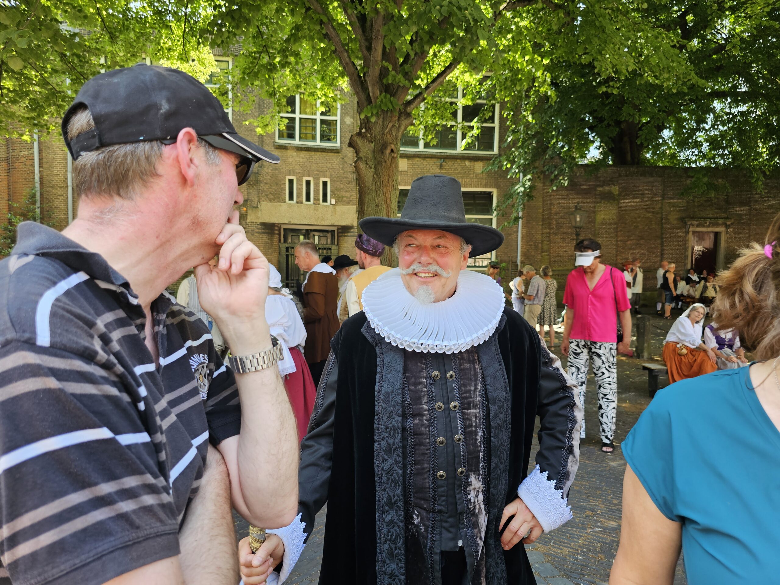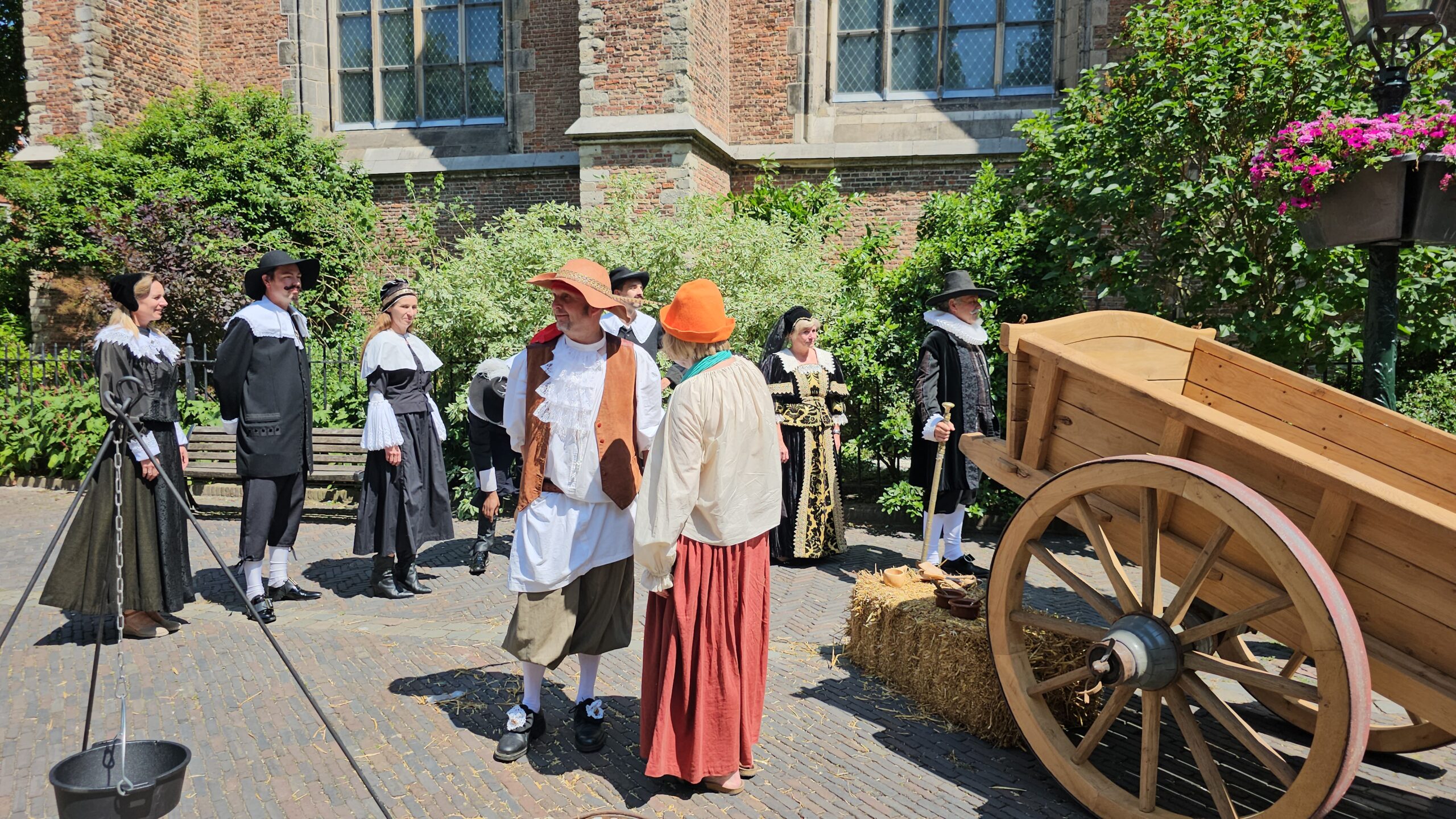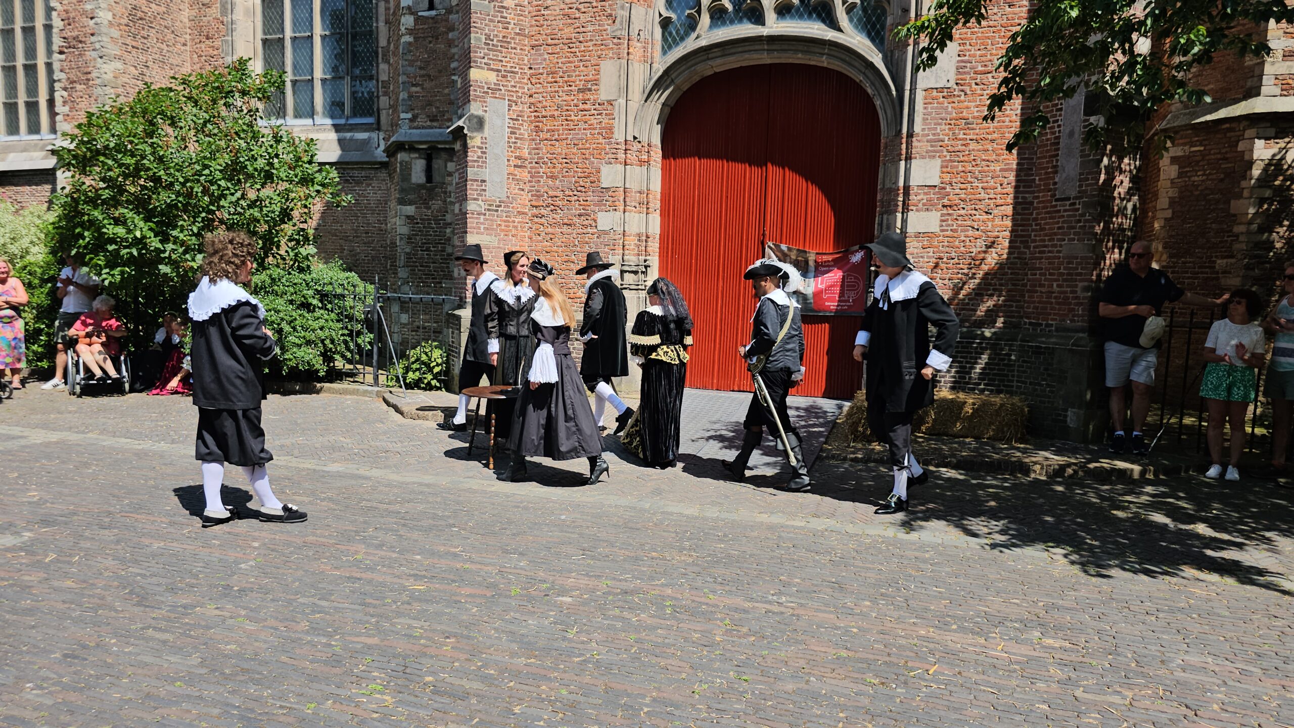Een bijzonder tafereel speelde zich zaterdagmiddag af op het Pieterskerkhof. Daar trad het voltallige 17e eeuwse stadsbestuur aan om zich te laten portretteren. Als dank van de pelgrims die zo gastvrij in Leiden werden opgenomen.