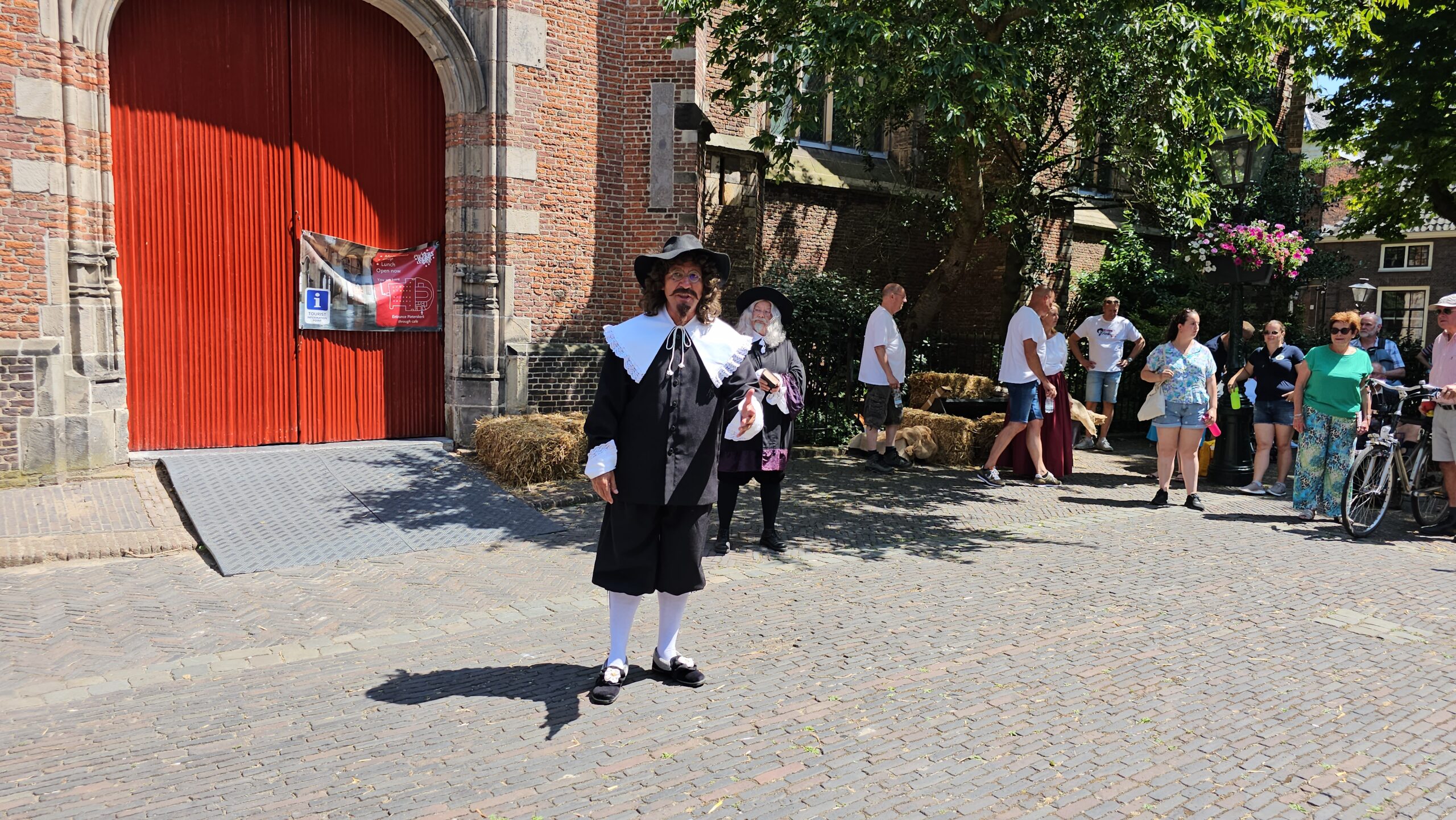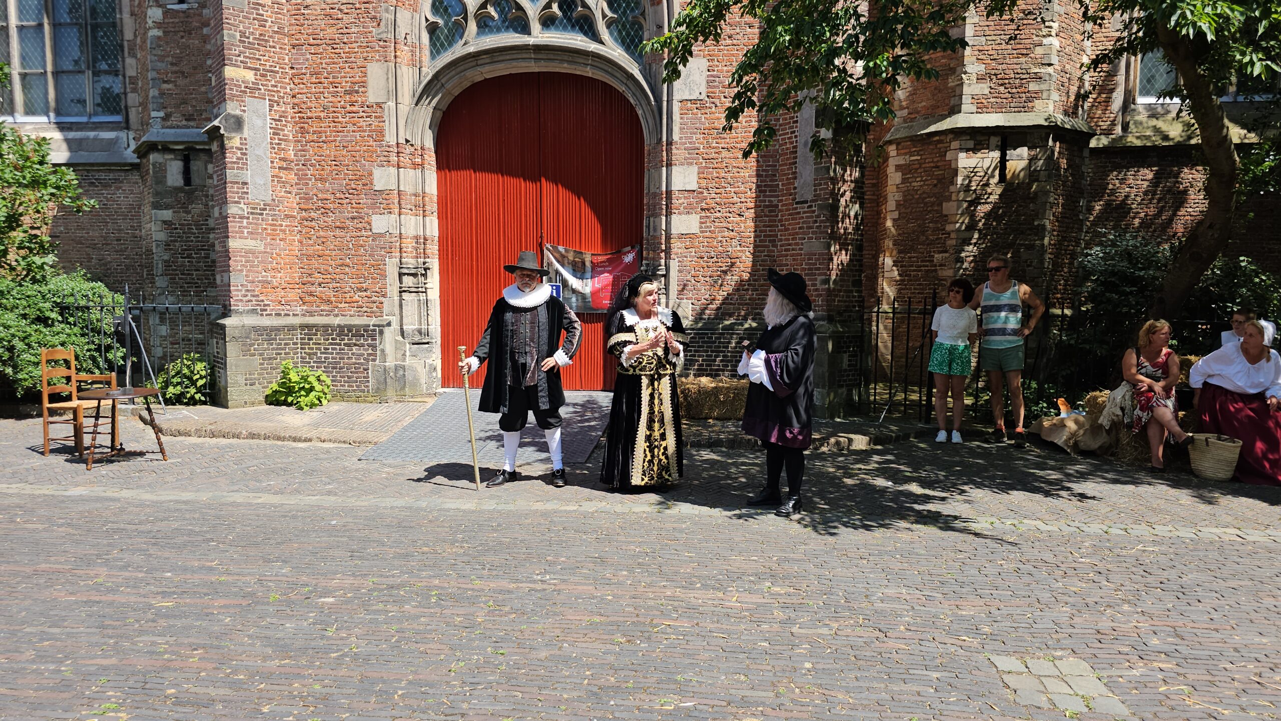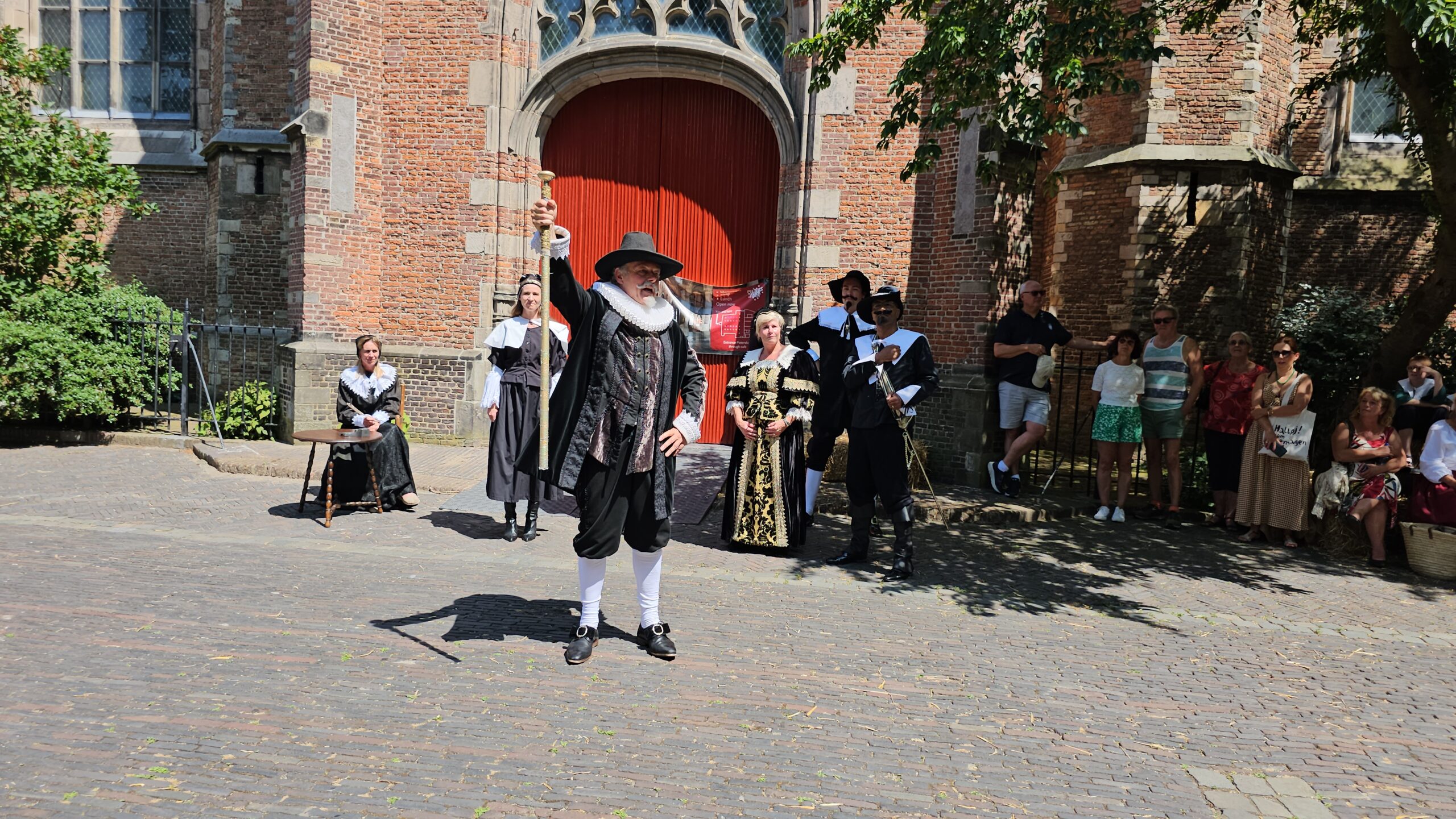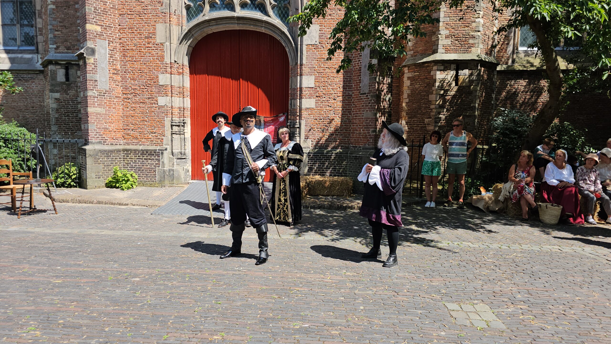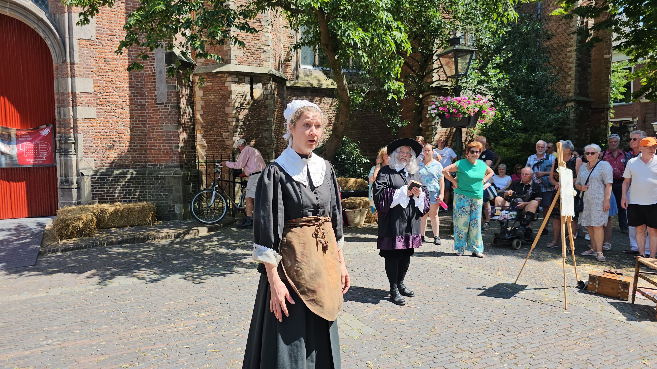 Een bijzonder tafereel speelde zich zaterdagmiddag af op het Pieterskerkhof. Daar trad het voltallige 17e eeuwse stadsbestuur aan om zich te laten portretteren. Als dank van de pelgrims die zo gastvrij in Leiden werden opgenomen.