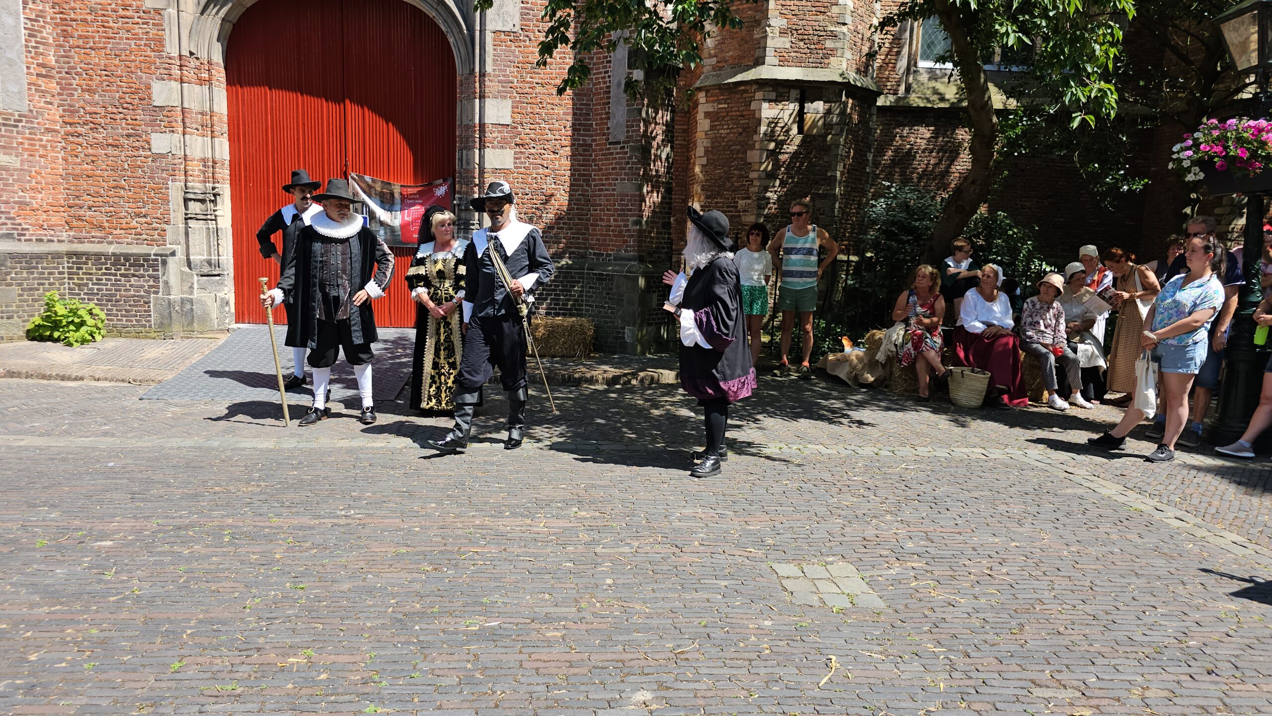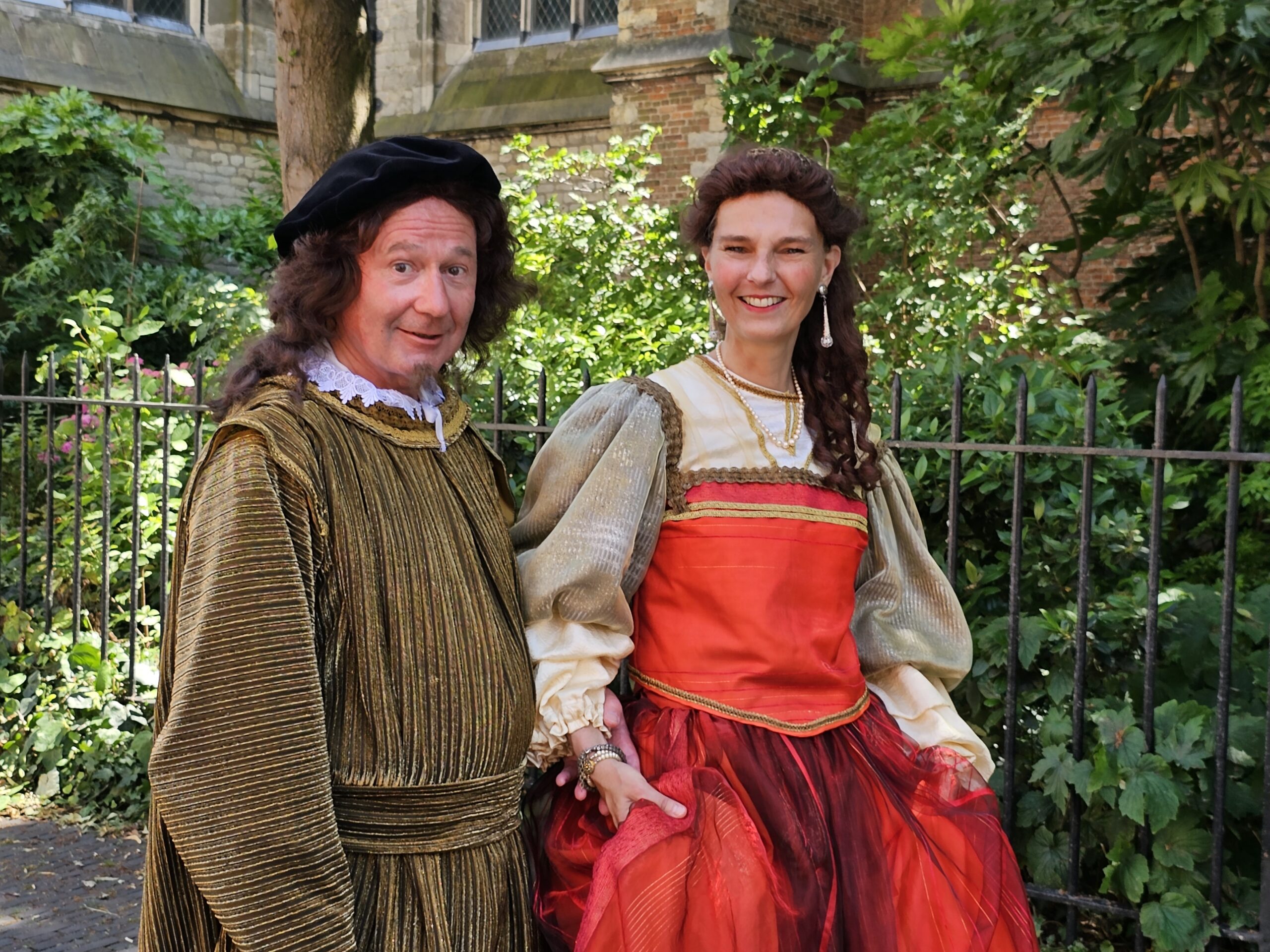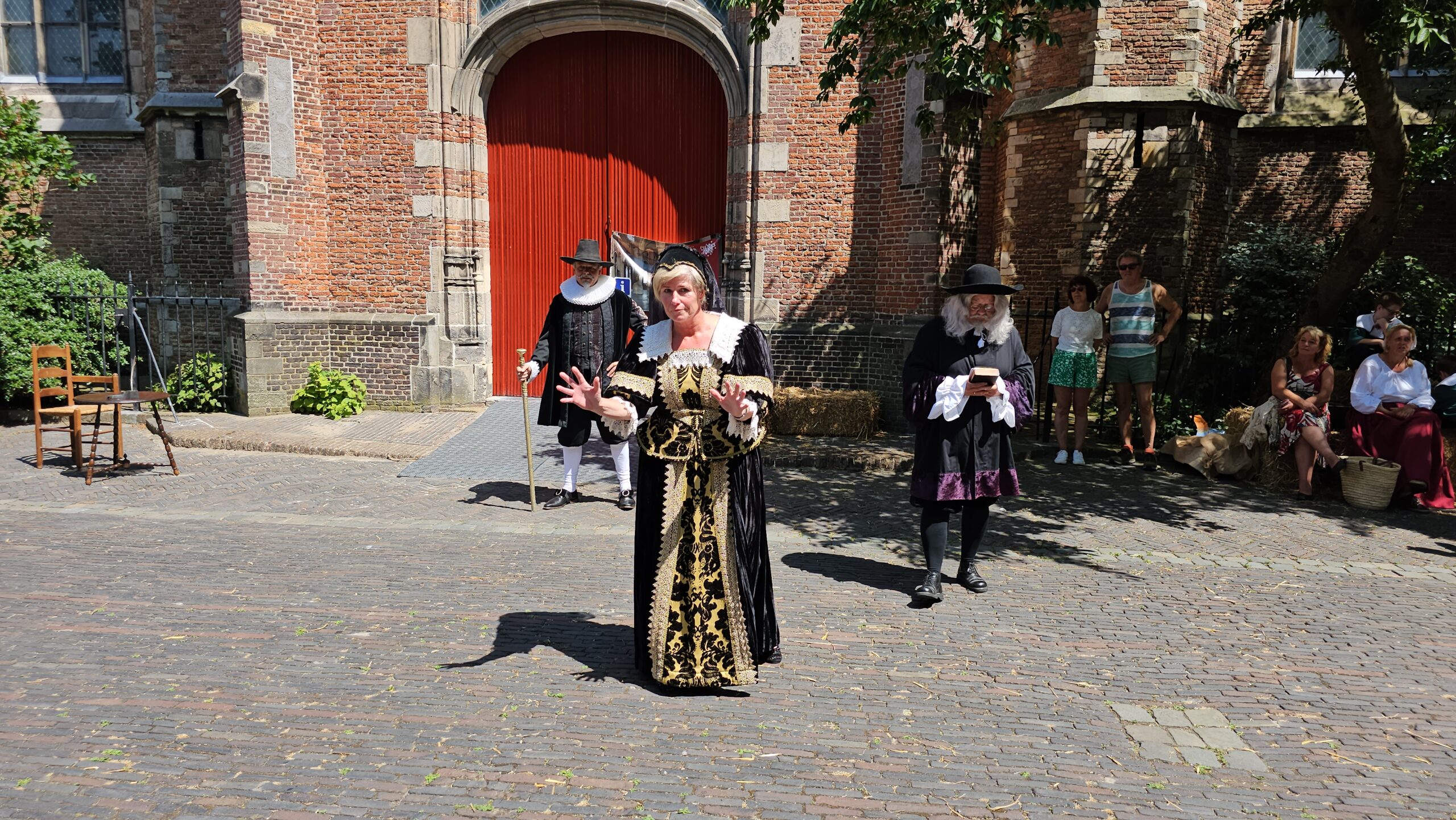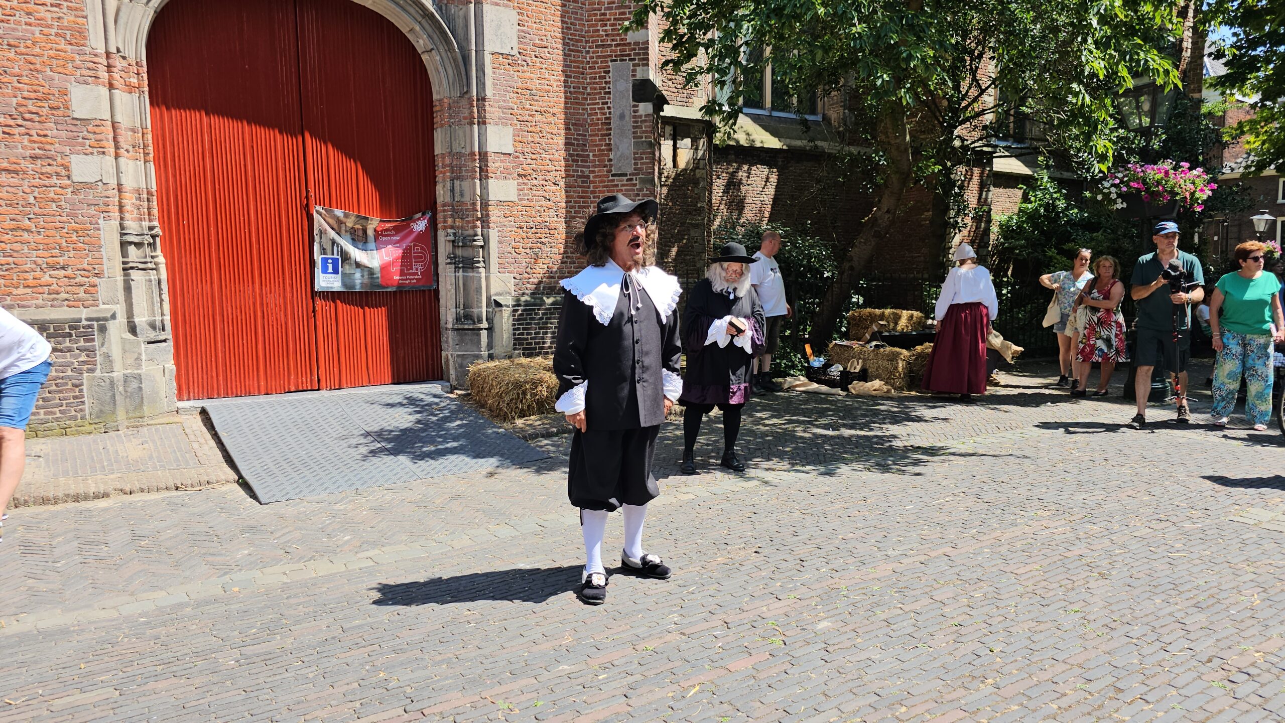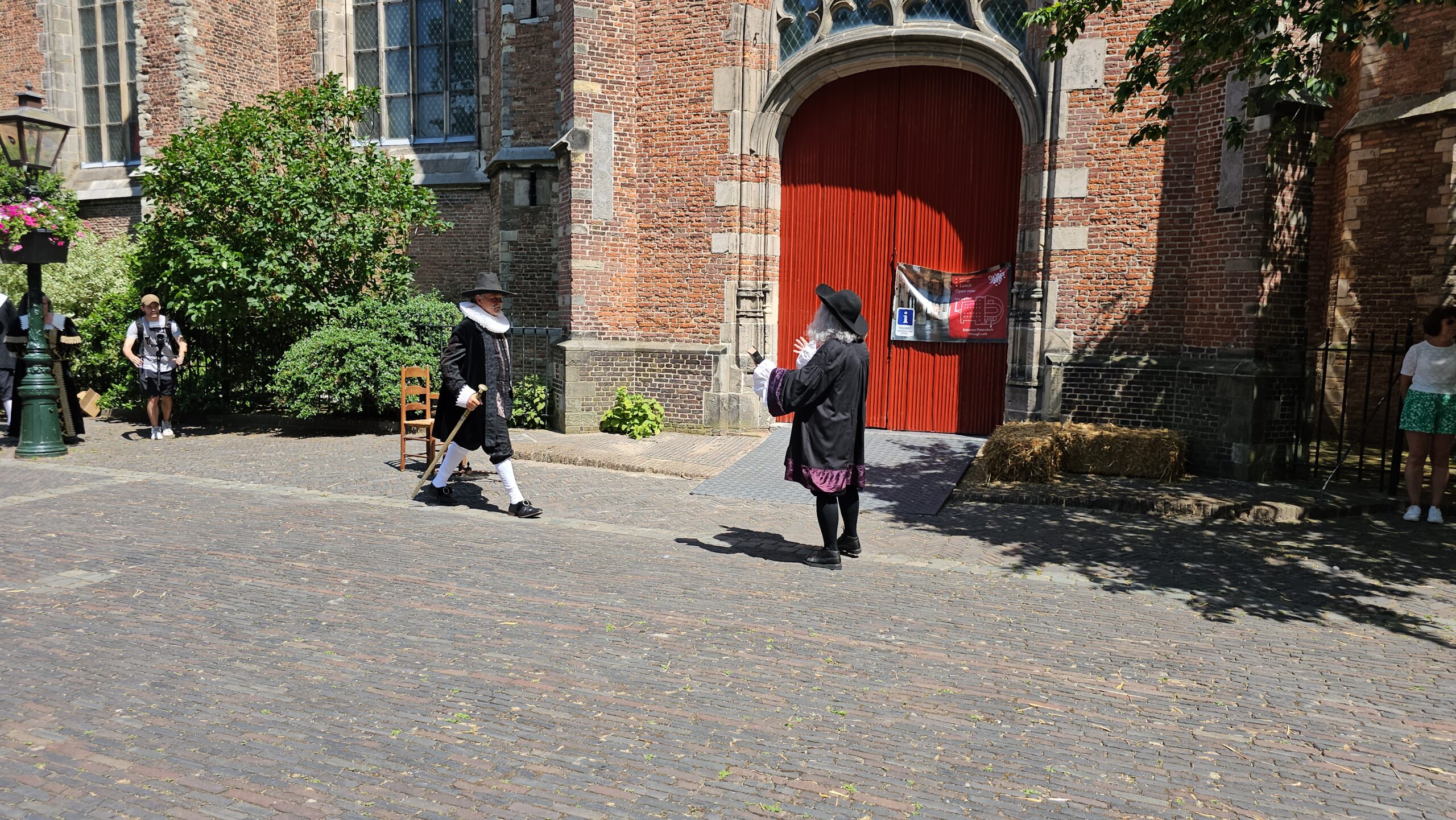 Een bijzonder tafereel speelde zich zaterdagmiddag af op het Pieterskerkhof. Daar trad het voltallige 17e eeuwse stadsbestuur aan om zich te laten portretteren. Als dank van de pelgrims die zo gastvrij in Leiden werden opgenomen.