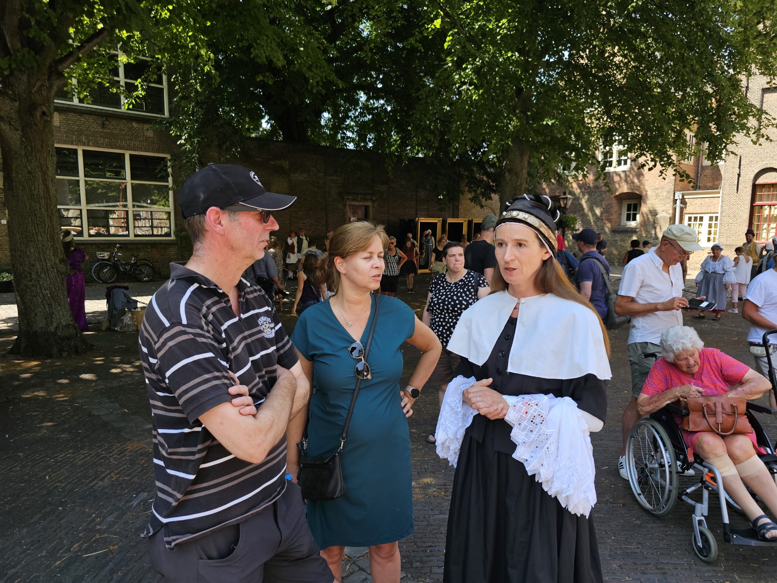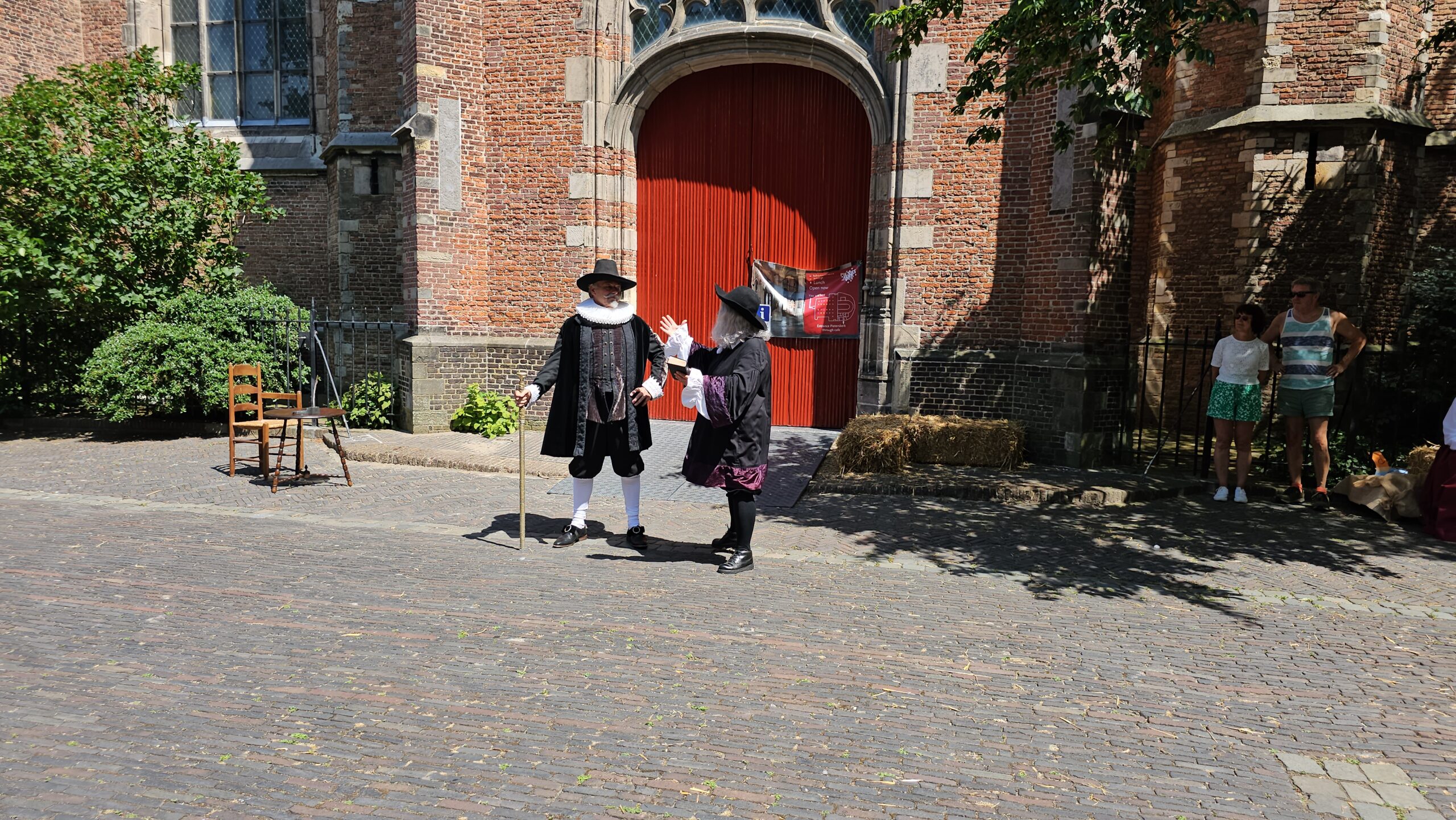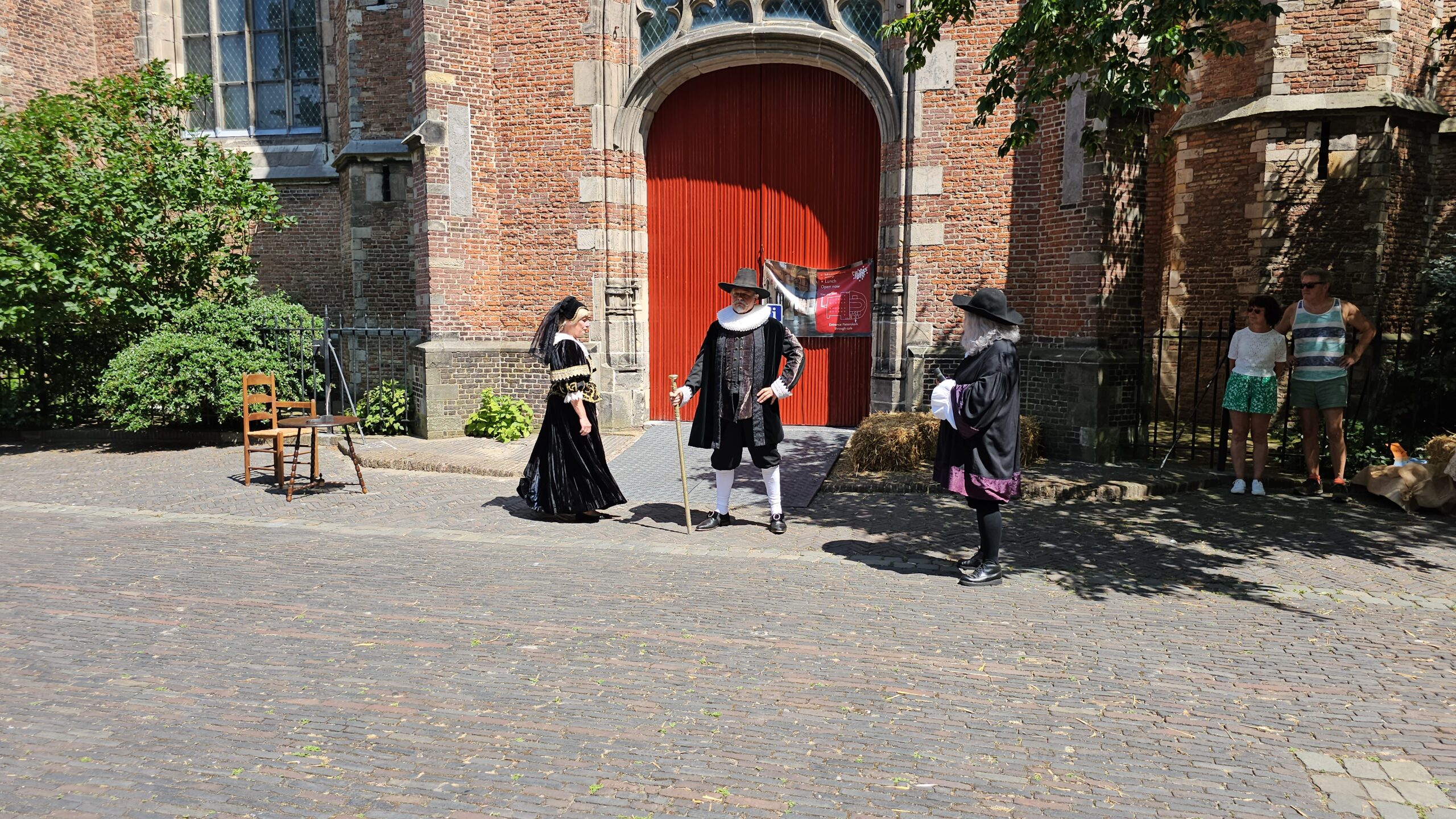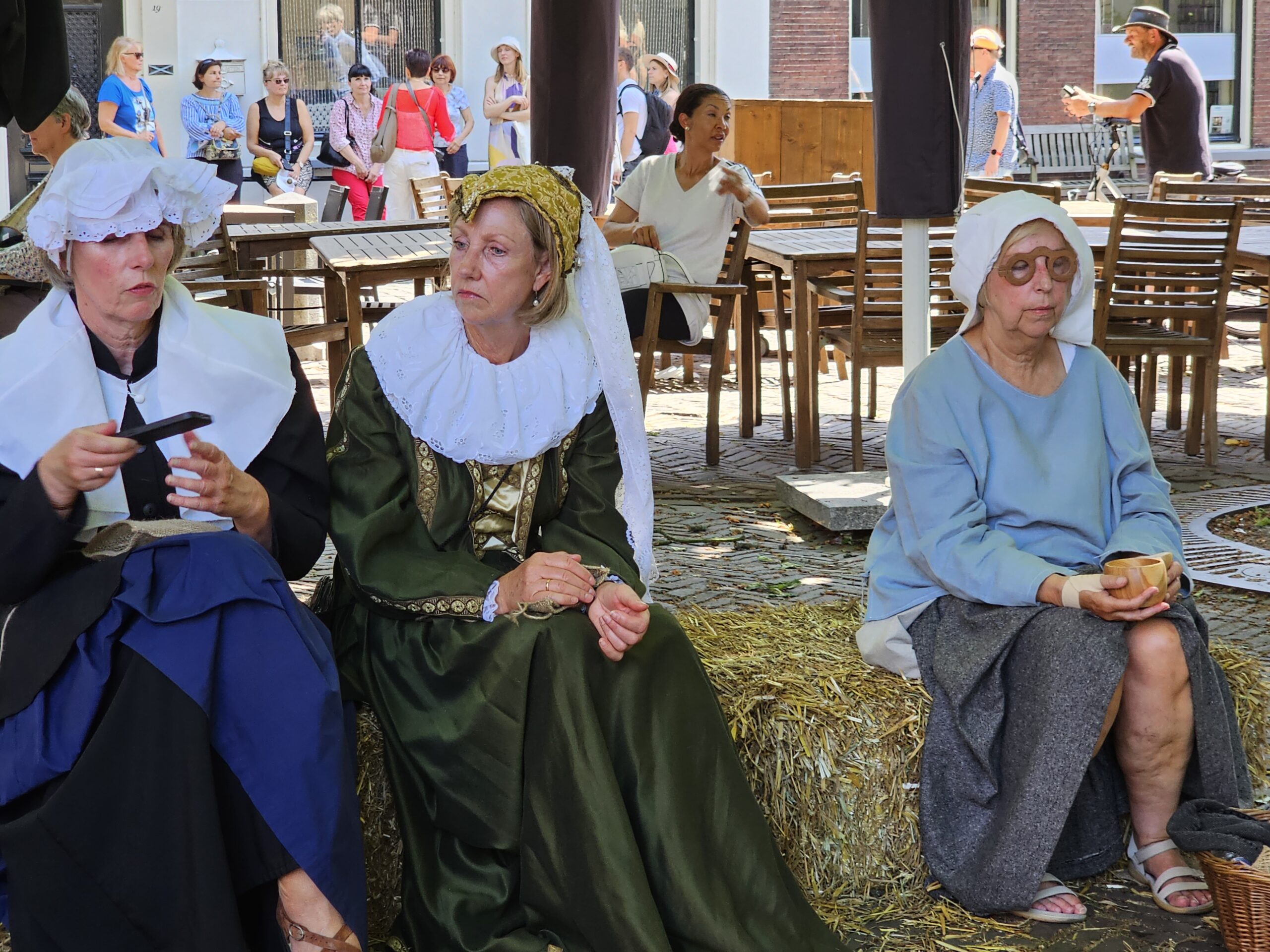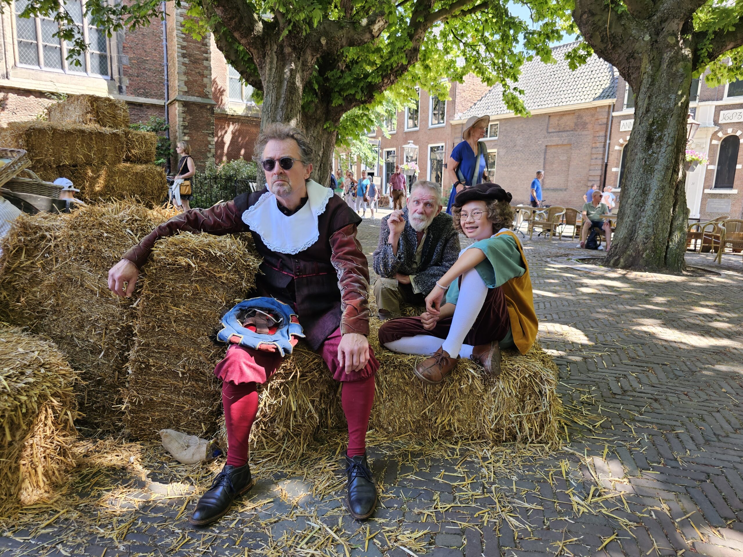 Een bijzonder tafereel speelde zich zaterdagmiddag af op het Pieterskerkhof. Daar trad het voltallige 17e eeuwse stadsbestuur aan om zich te laten portretteren. Als dank van de pelgrims die zo gastvrij in Leiden werden opgenomen.