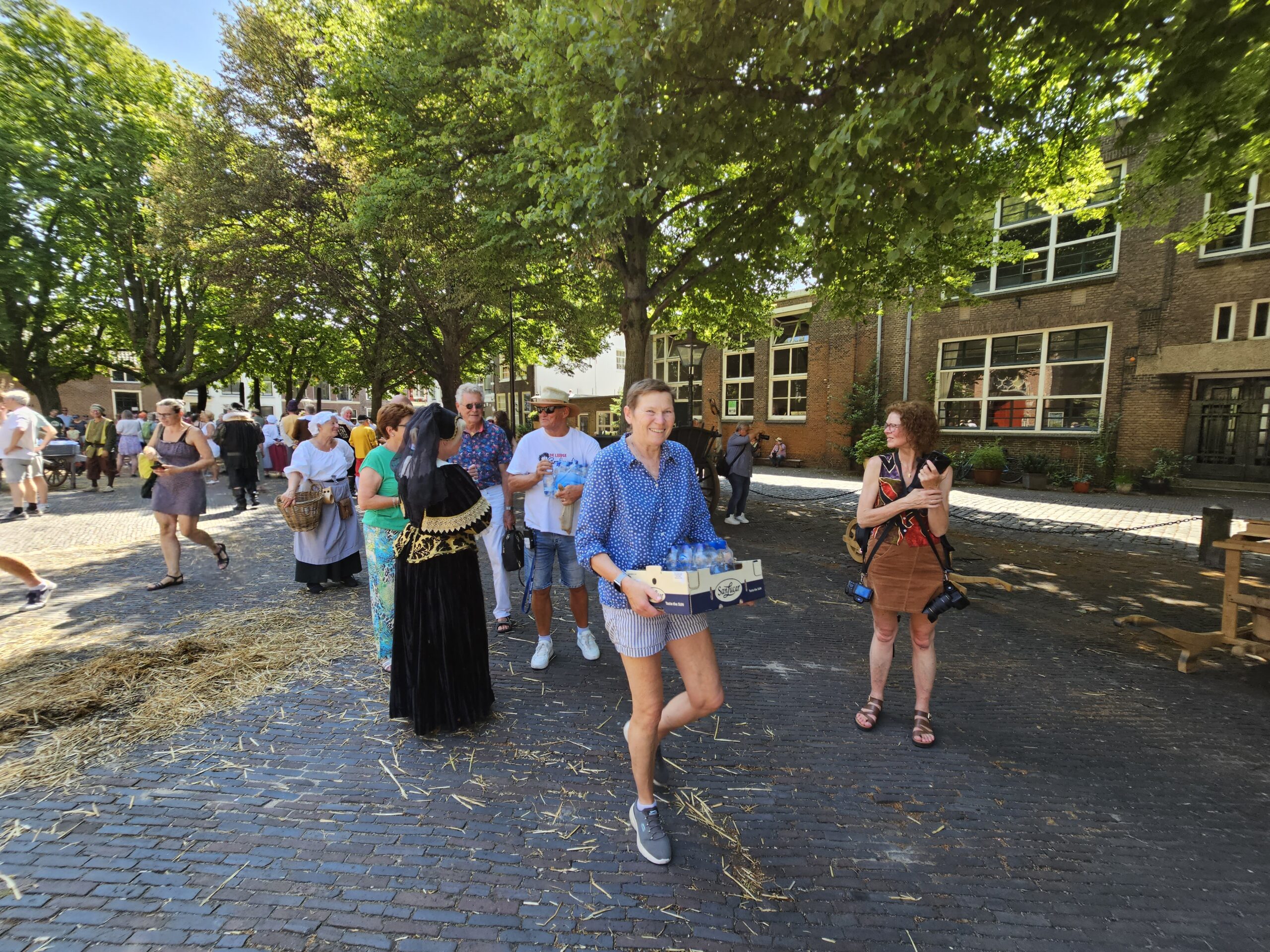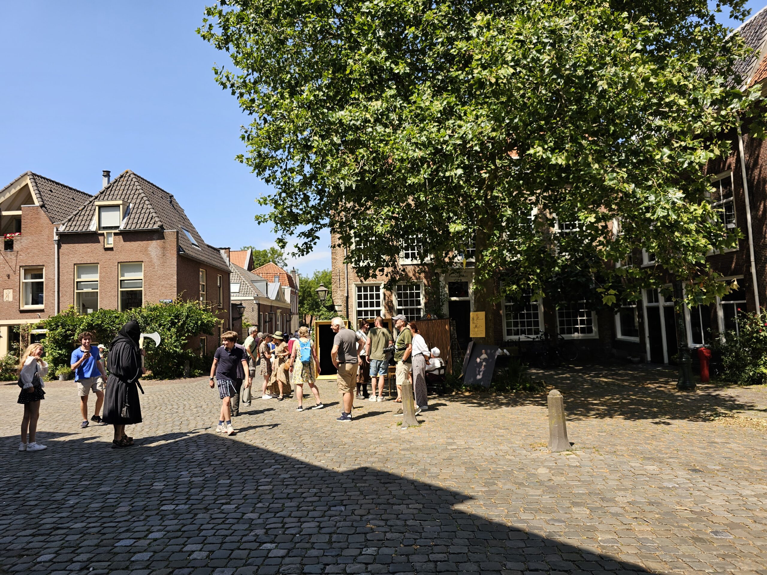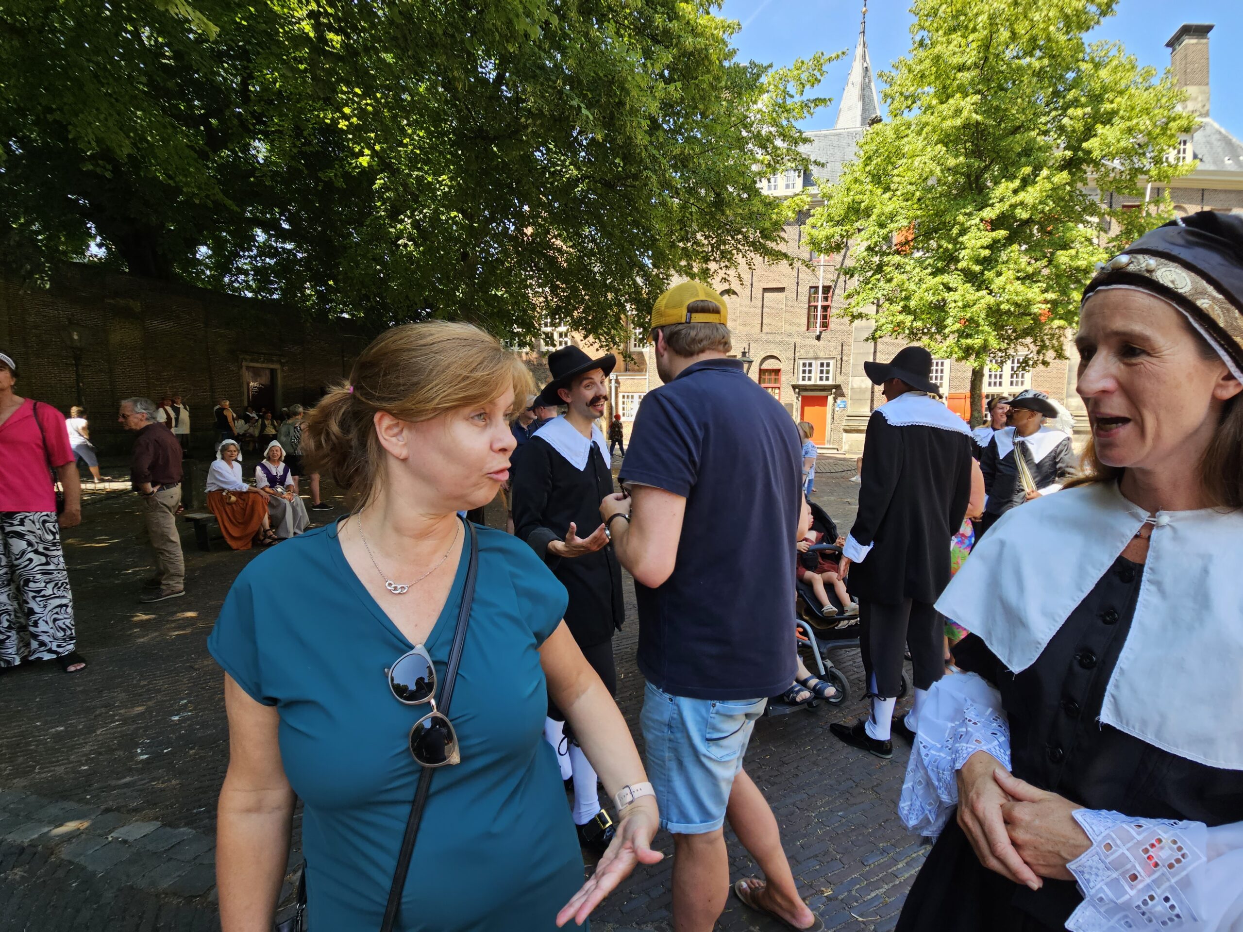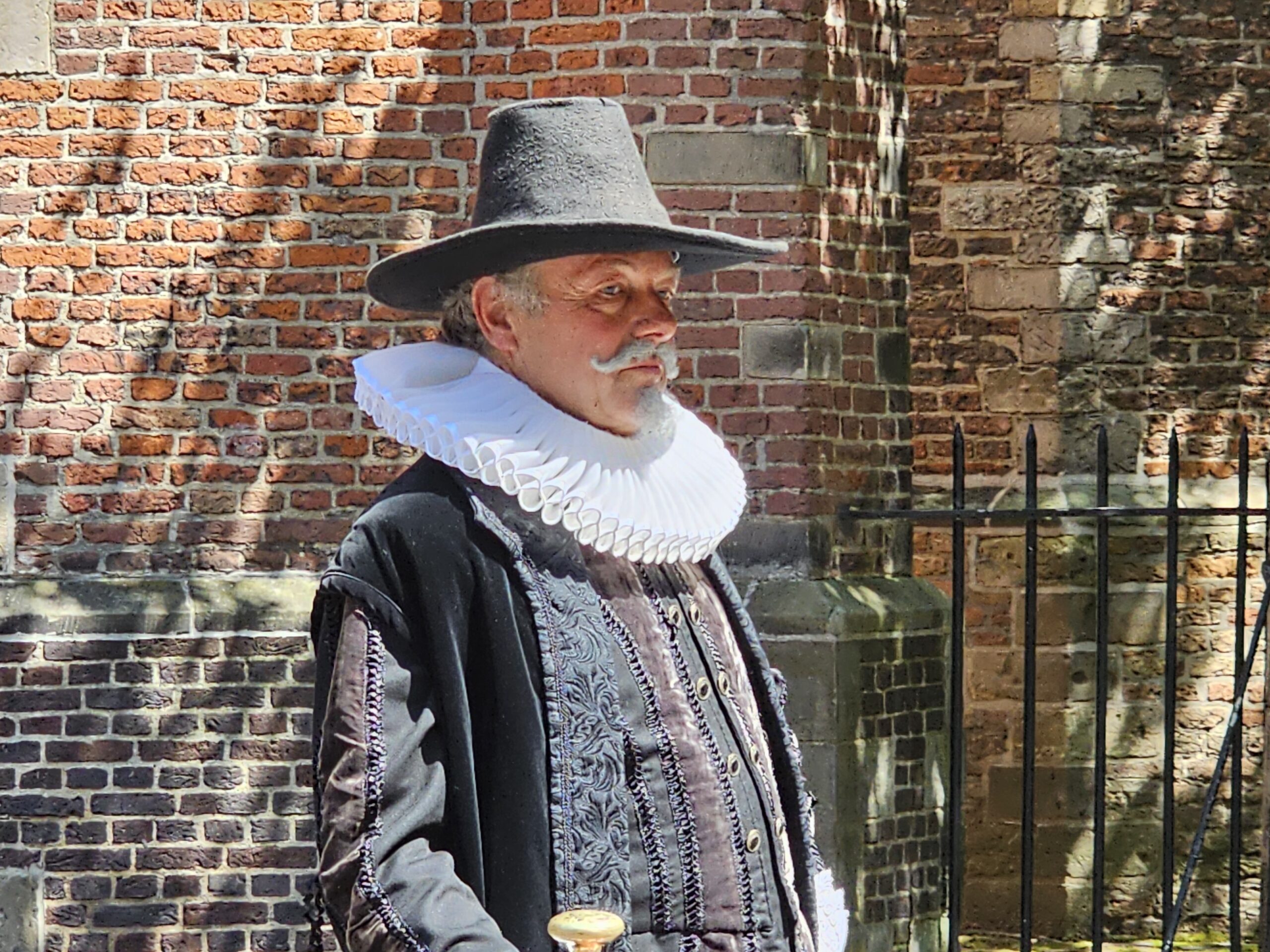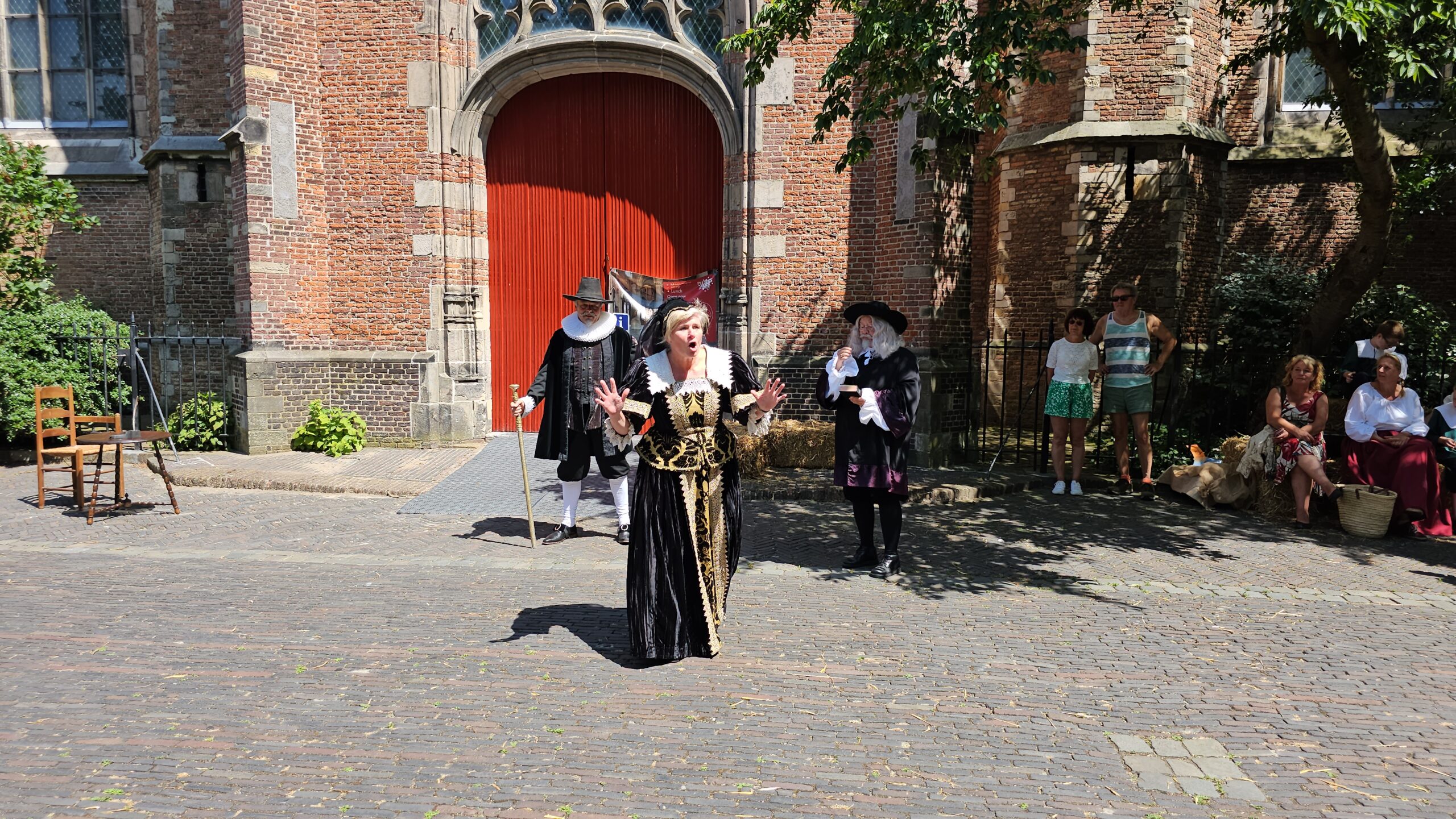 Een bijzonder tafereel speelde zich zaterdagmiddag af op het Pieterskerkhof. Daar trad het voltallige 17e eeuwse stadsbestuur aan om zich te laten portretteren. Als dank van de pelgrims die zo gastvrij in Leiden werden opgenomen.